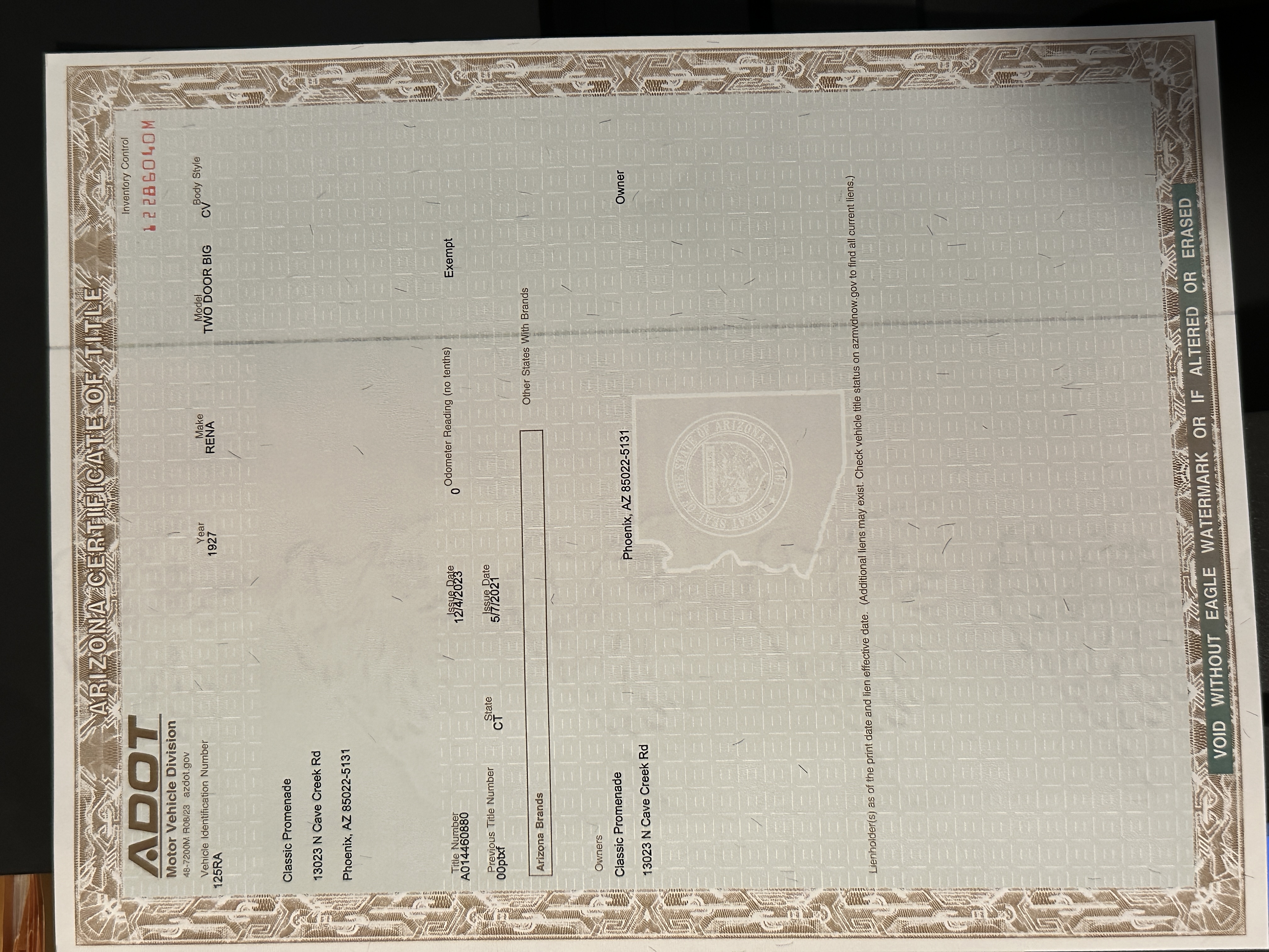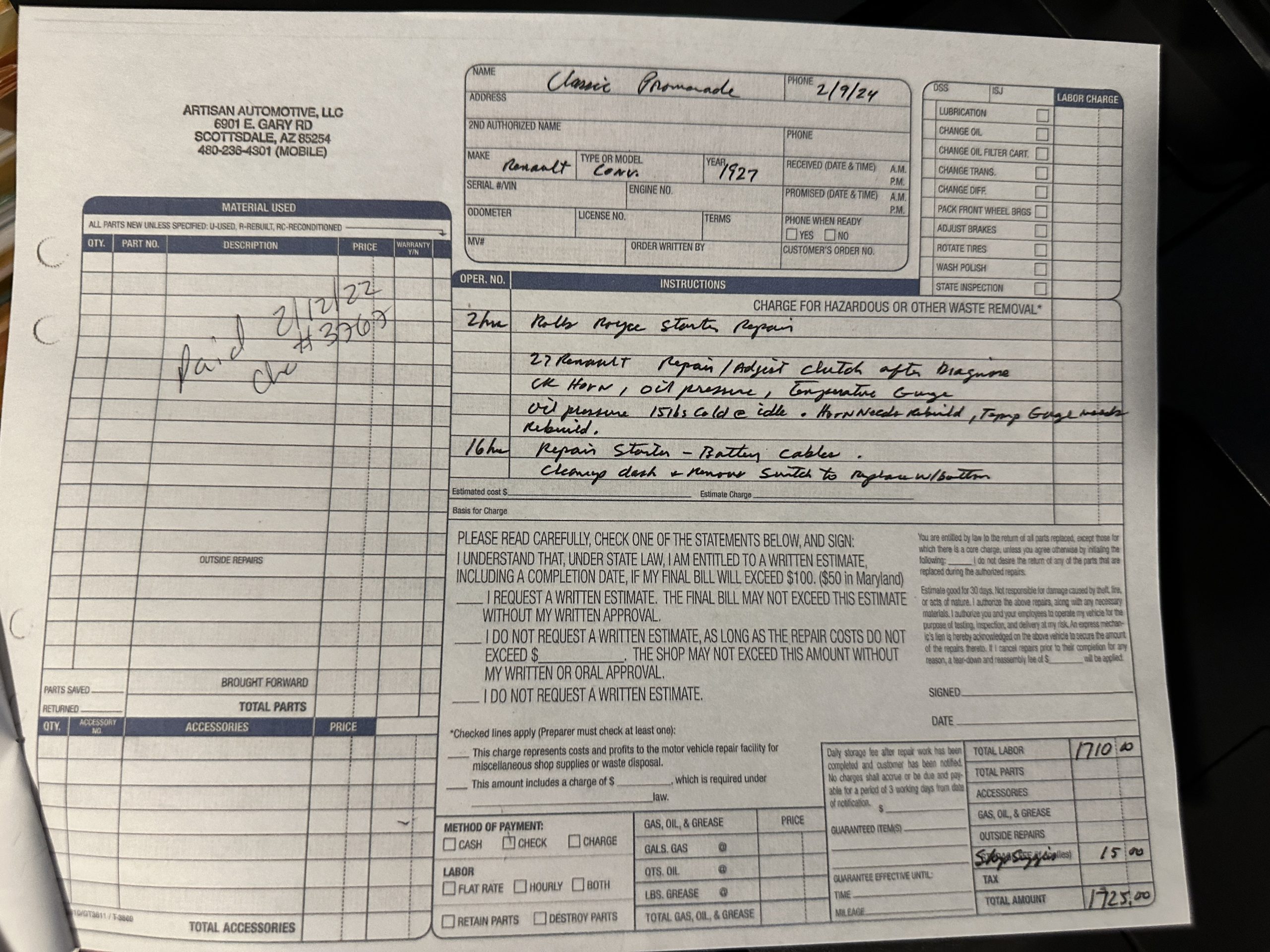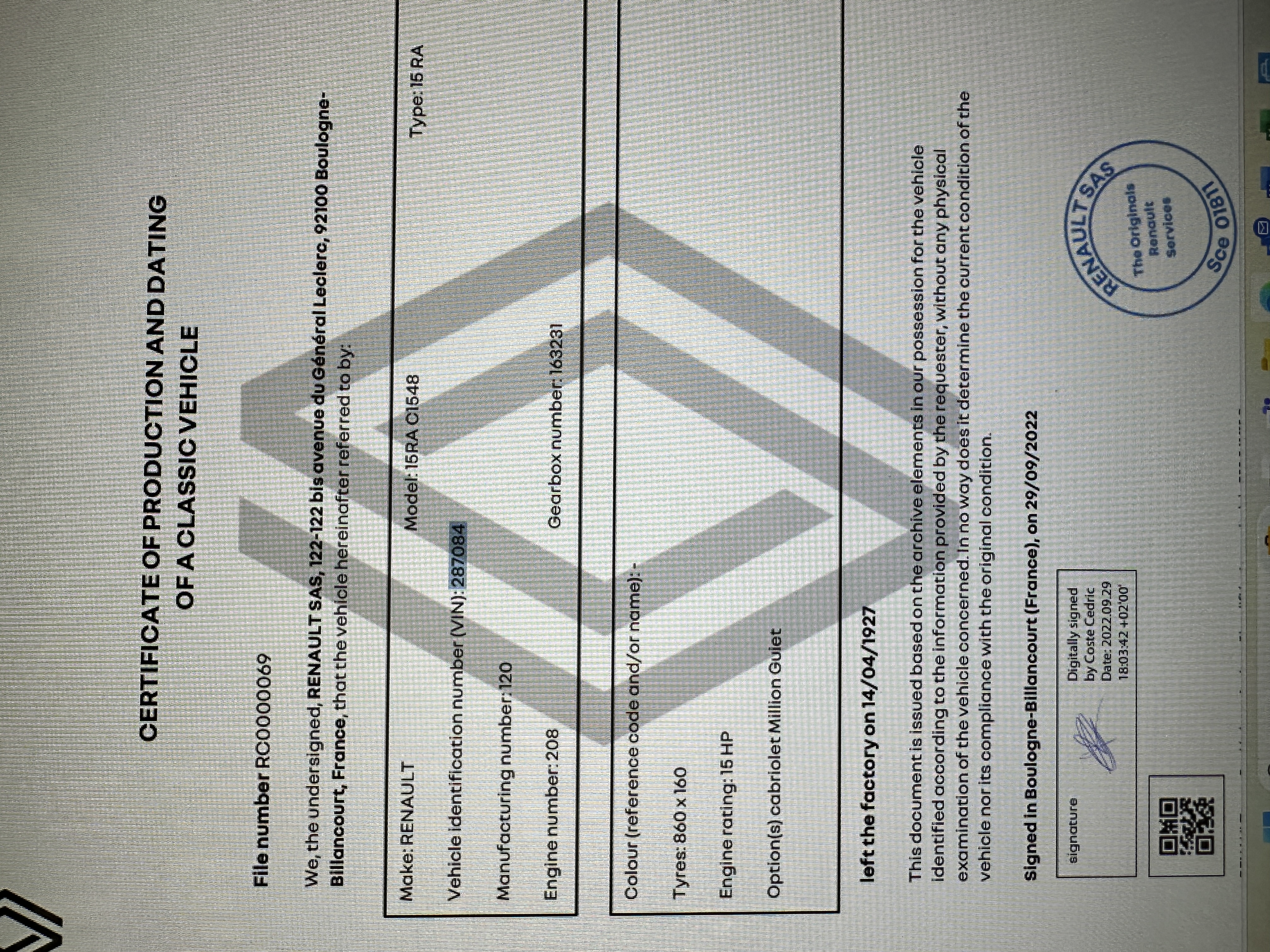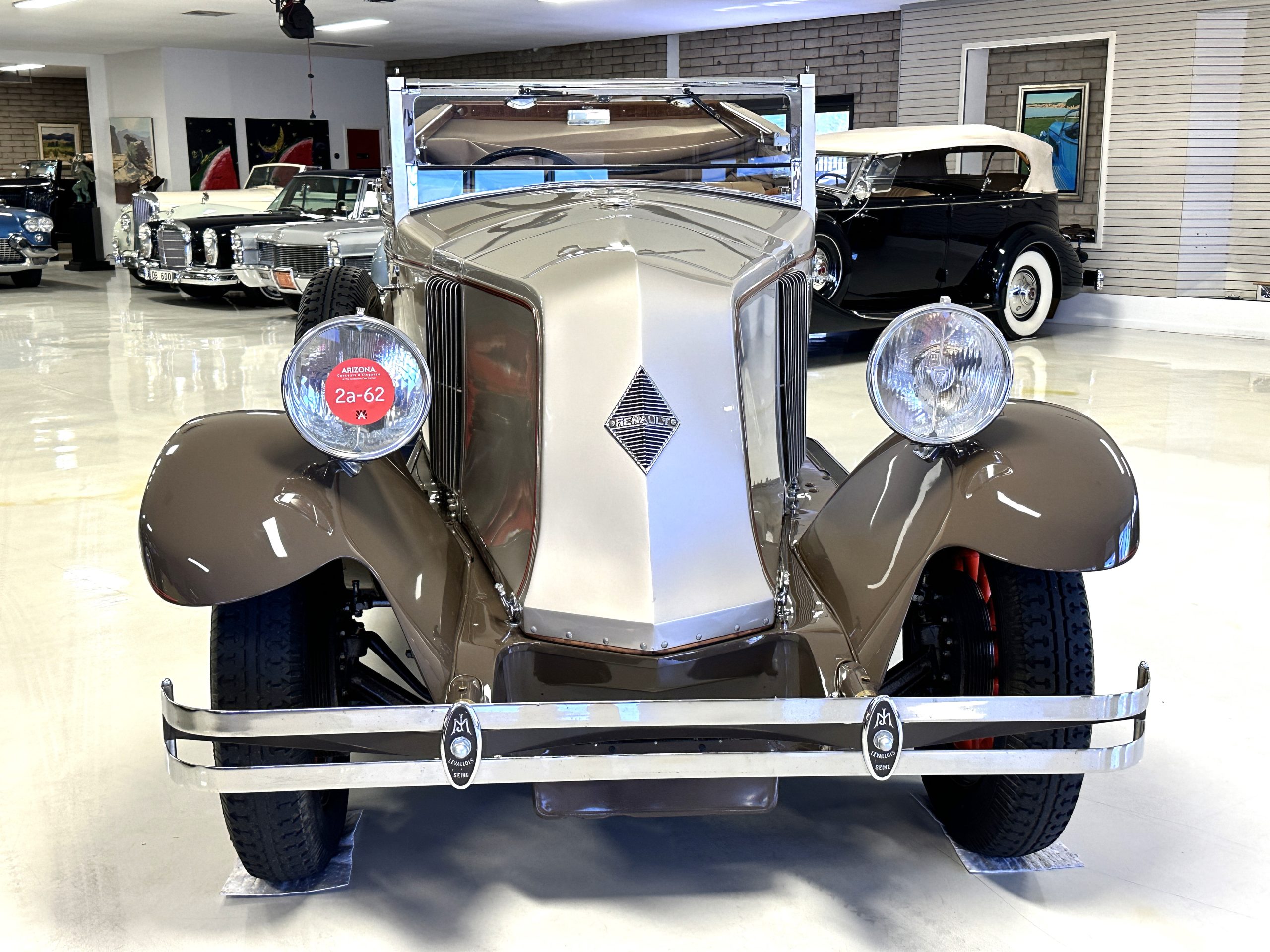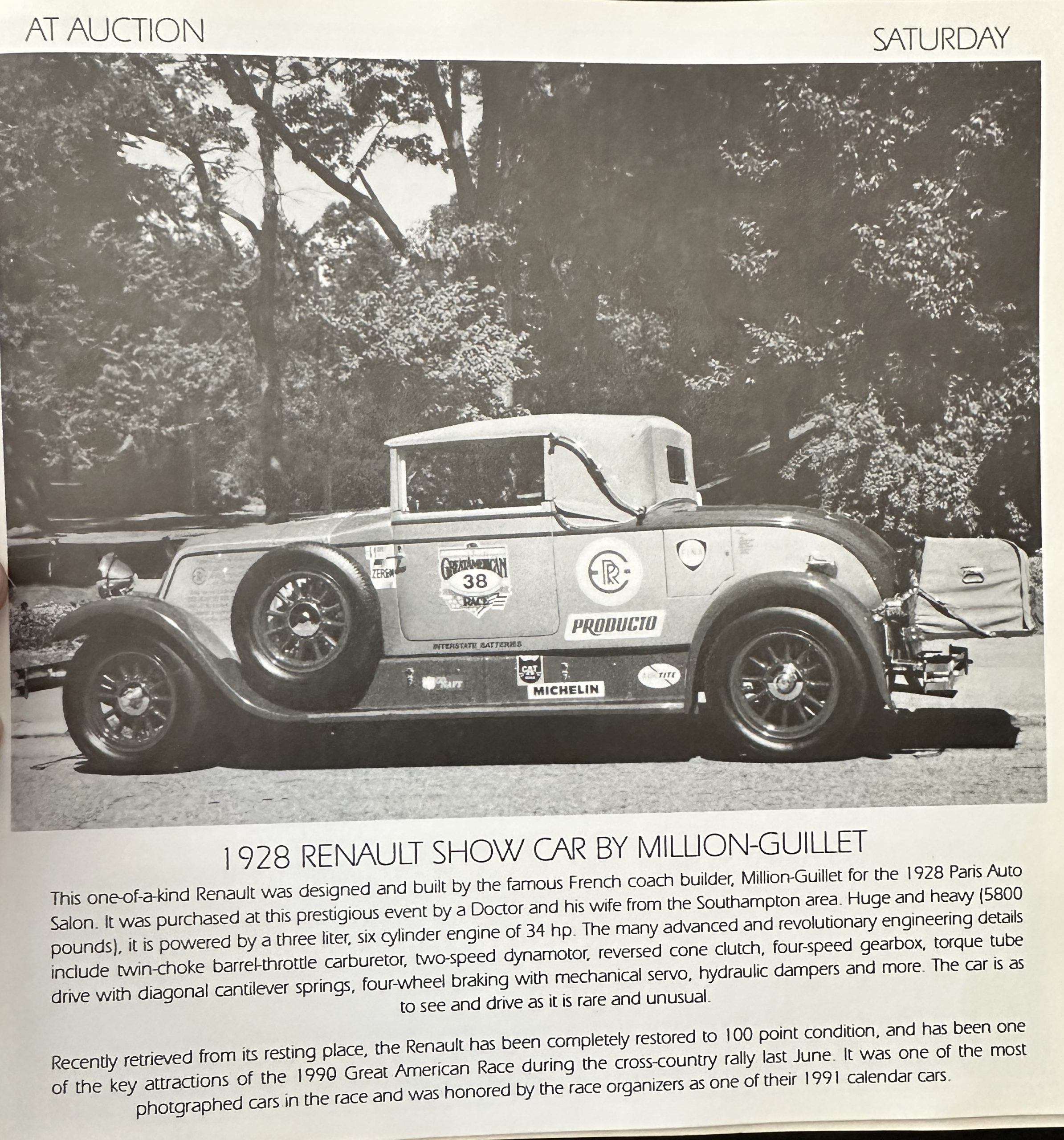 Photos of the car before and during the 1989-1990 refurbishment are included in the sale. Renault production records and the Renault Certificate of Production list Million-Guiet cabriolet coachwork as well manufacturing number 120 and engine number 208, both shown in the photo gallery below. The identification number listed on the title is the car’s radiator number, 125 RA, which is shown stamped on the radiator in the gallery. The Renault comes complete with decades of photos, memorabilia, brochures, service receipts and more.