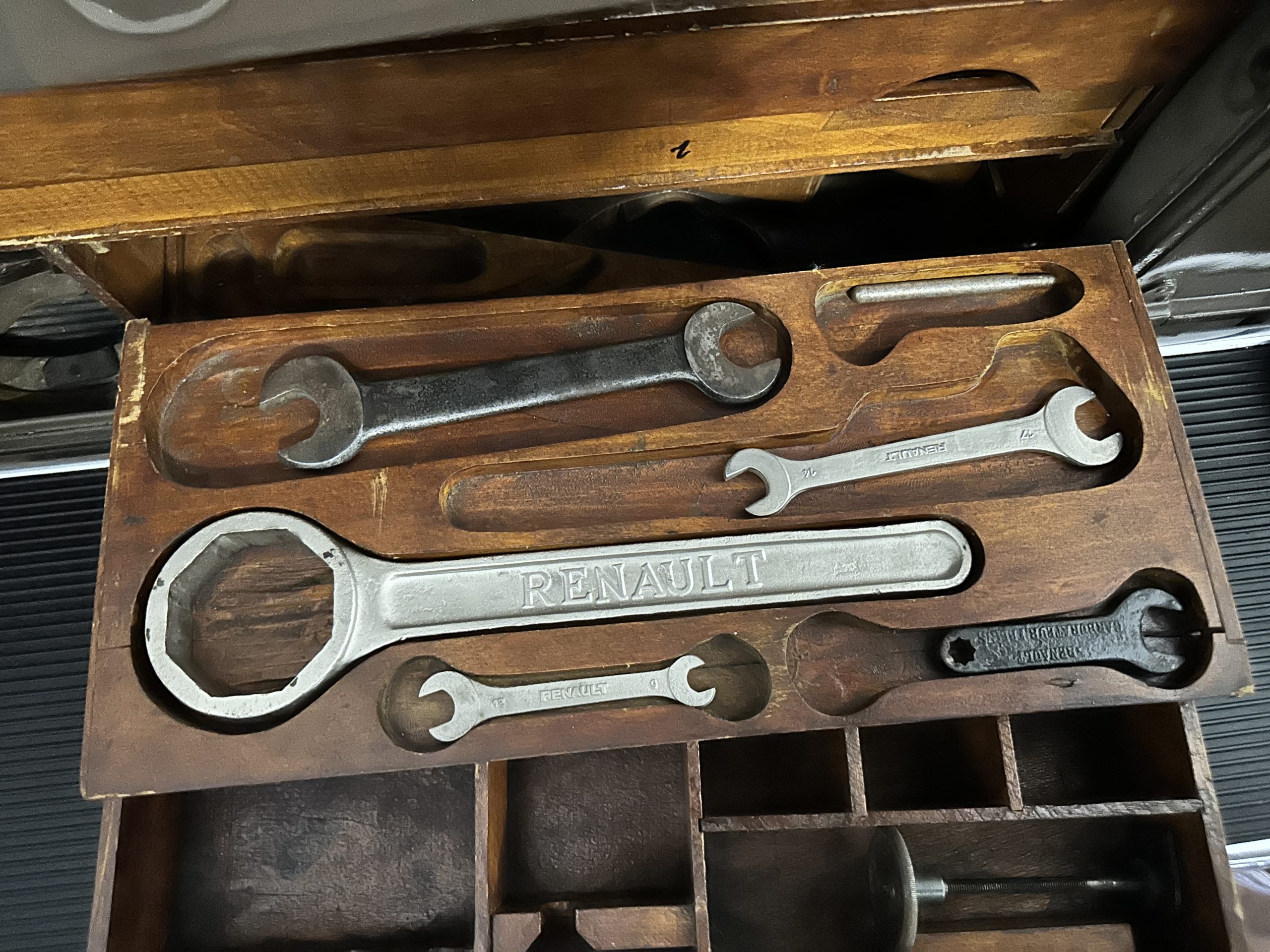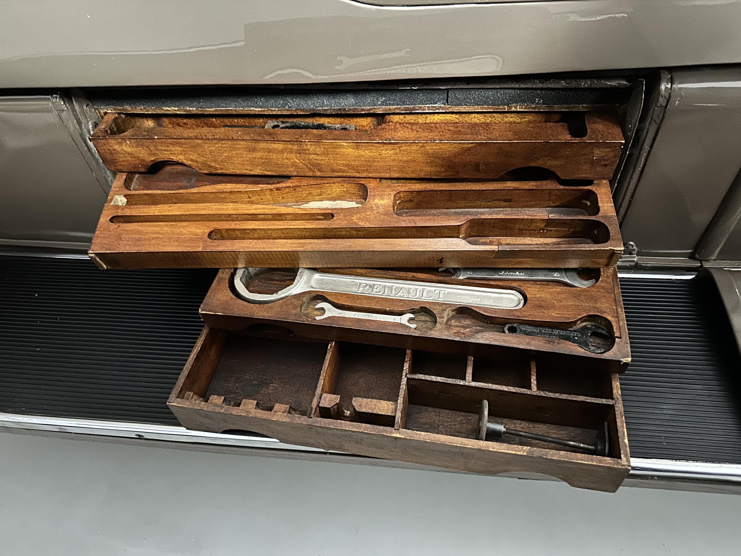 Power is sent to the rear wheels via a four-speed manual transmission. Suspension incorporates solid axles and hydraulic shock absorbers with semi-elliptical leaf springs up front and a rear setup comprising a transverse upper spring and angled cantilever springs. The Renault features four wood drawers built into a side cabinet for Renault branded tools and spares.