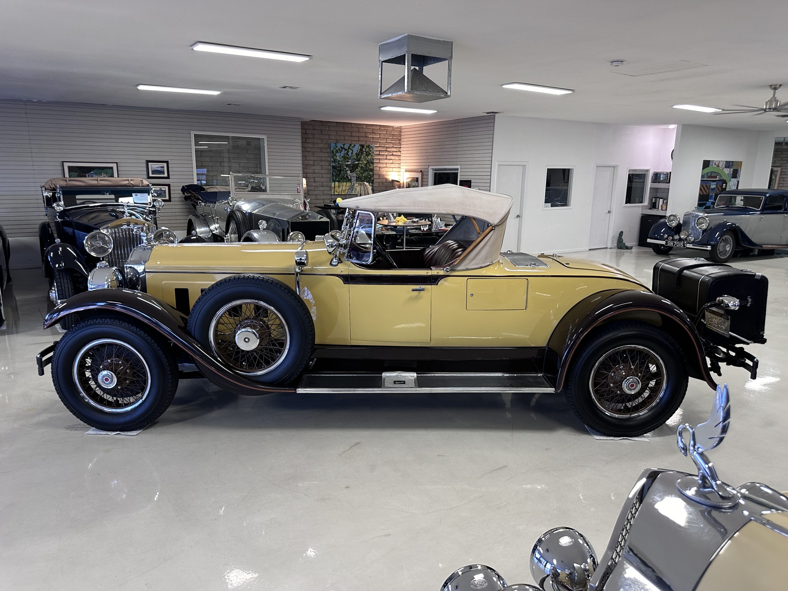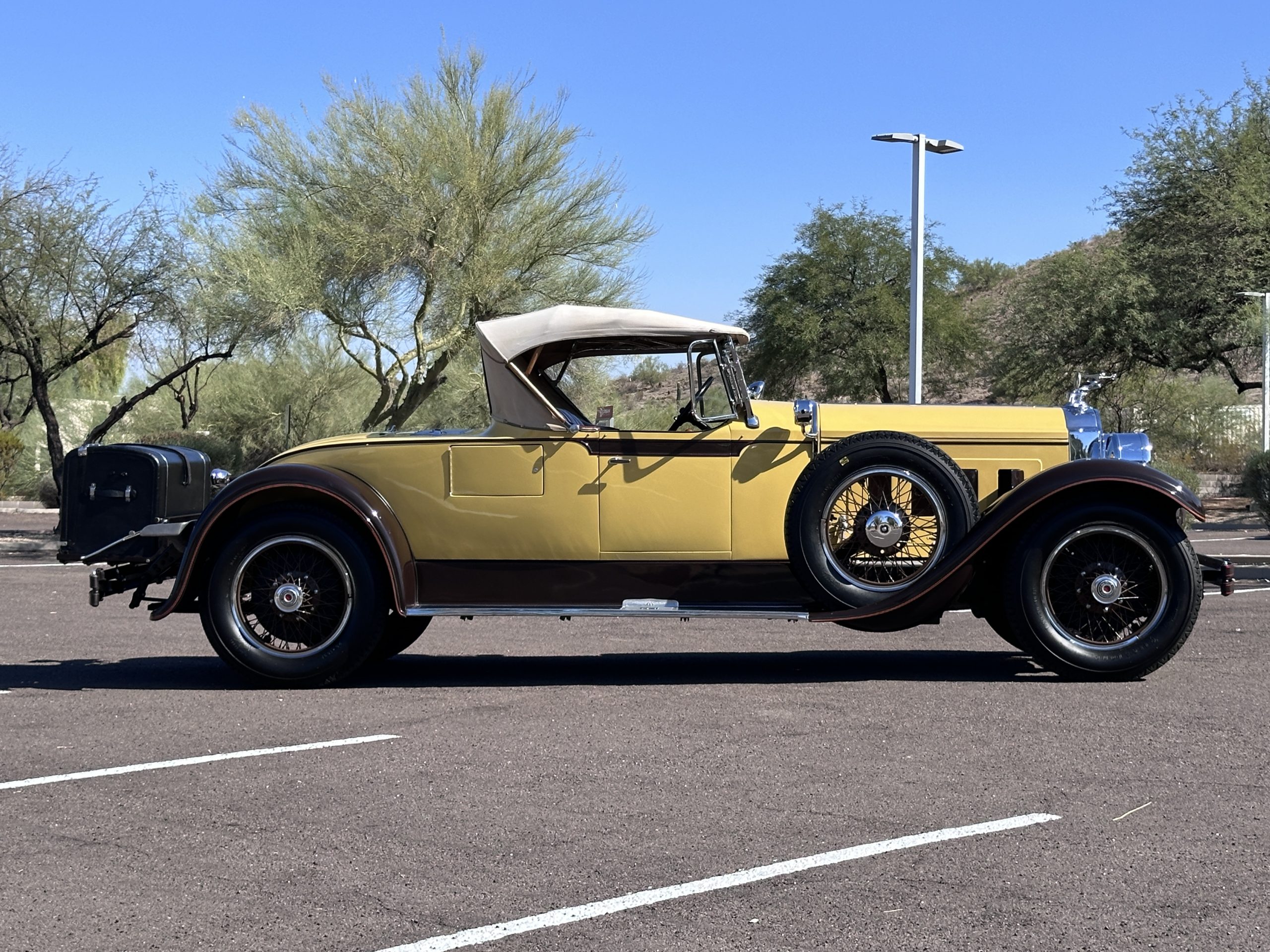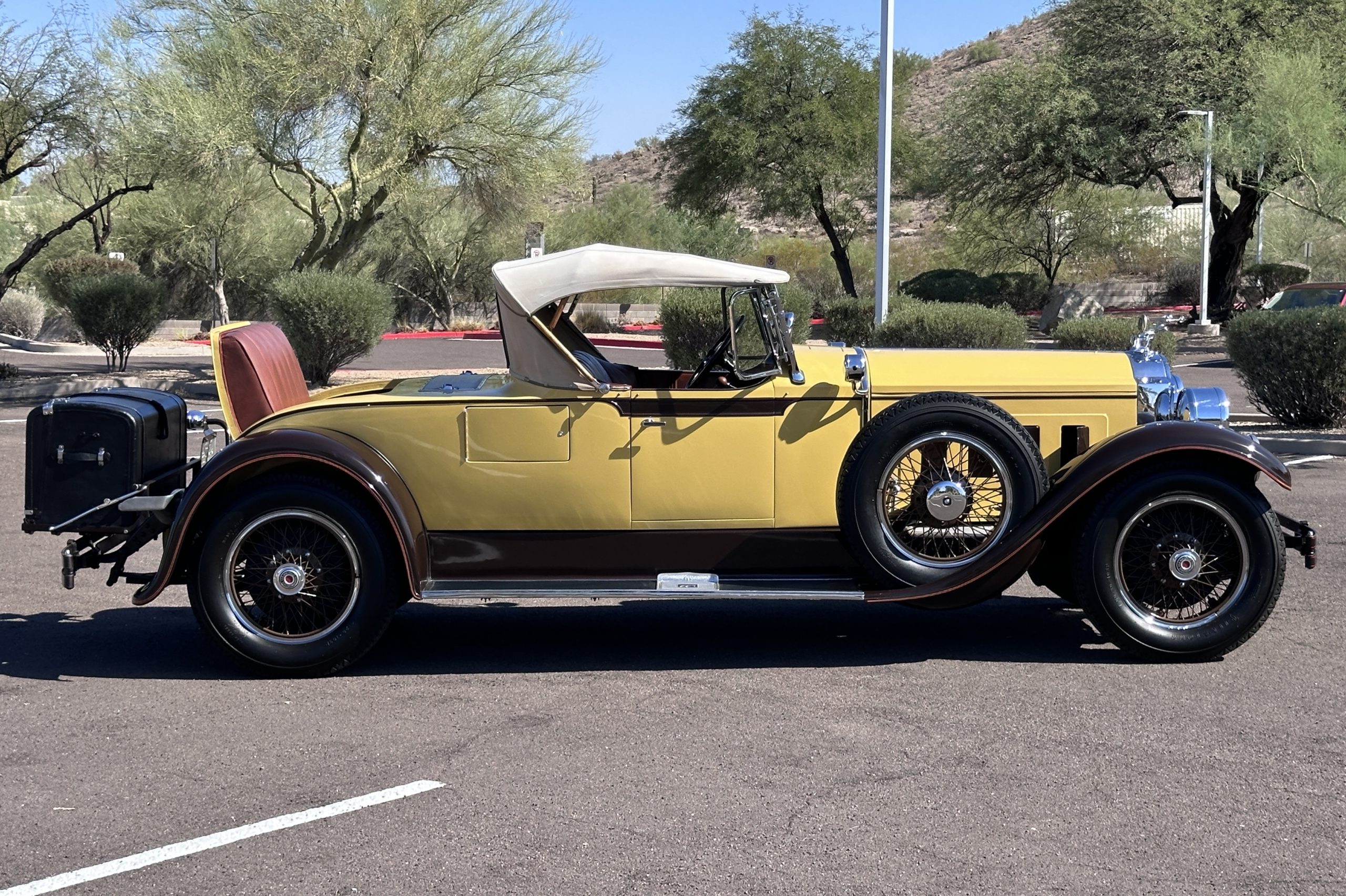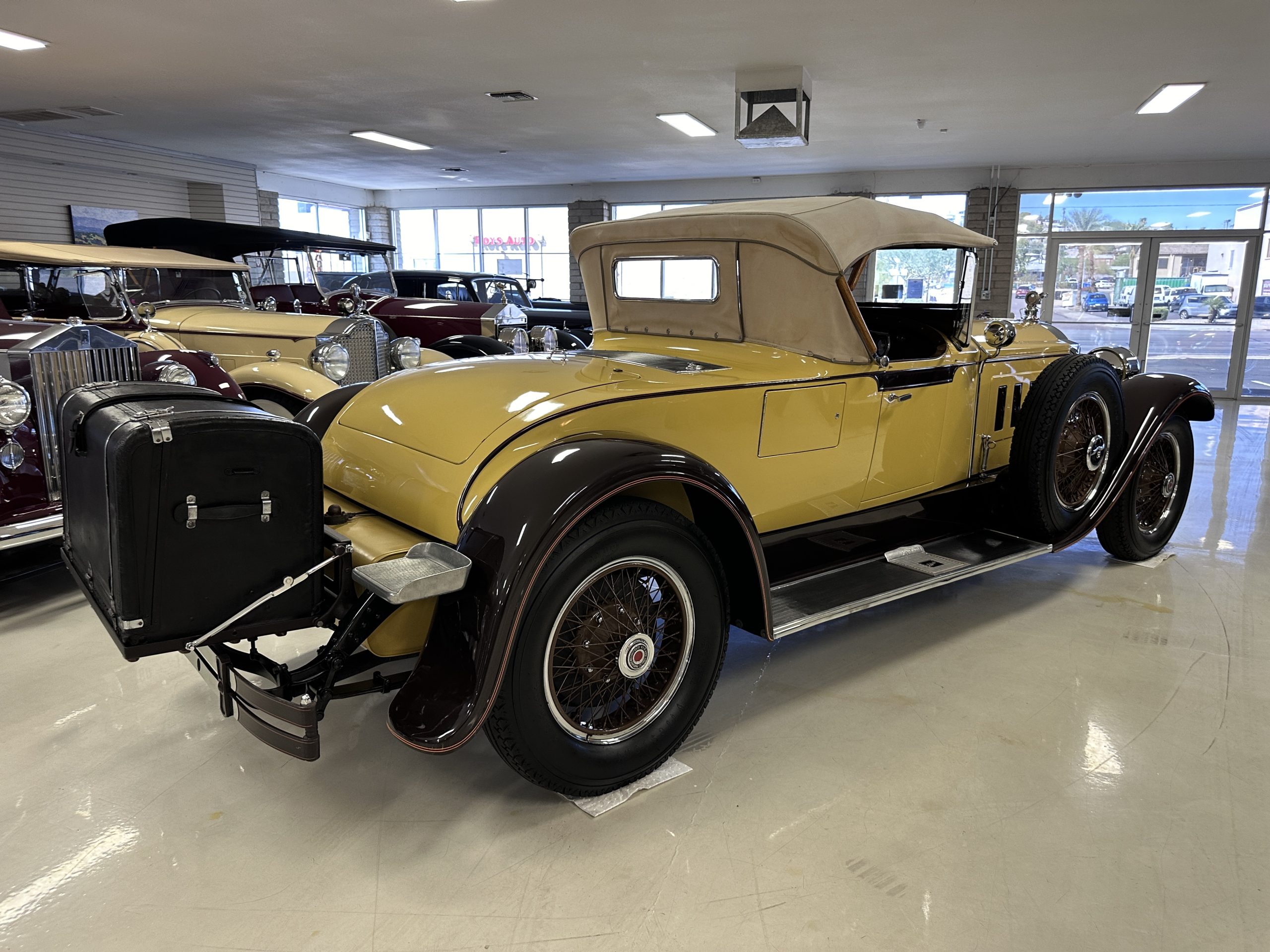 This 1928 Packard Custom Eight is a Model 443 Runabout that was purchased circa 1980 by the Antique Automobile Museum of Utah, who subsequently commissioned a refurbishment in the early 1980s. The car remained in the museum’s collection for approximately 43 years before being purchased by us in 2023. We invested a year and thousands of dollars in its recommissioning throughout 2024. Finished in yellow and brown, the car is powered by a 384.8ci L-head inline-eight that features a nine-main-bearing crankshaft and is mated to a three-speed manual transmission. Additional features include a single updraft carburetor, an exhaust cut-out, mechanically actuated four-wheel drum brakes, 20” wire wheels, dual side-mount spares, a beige convertible top, brown leather interior upholstery, a rumble seat, and a fold-down rear luggage rack hosting a trunk.