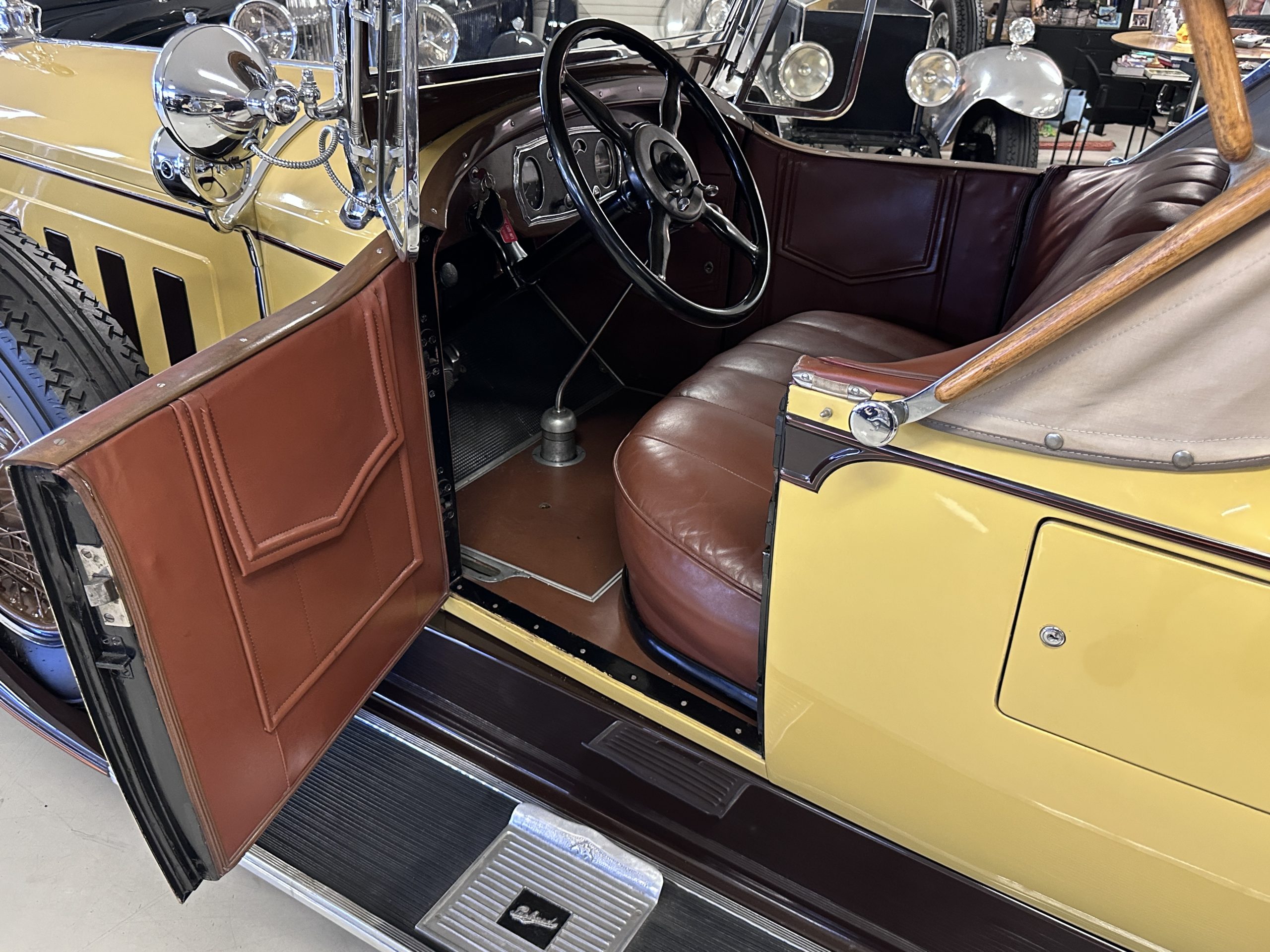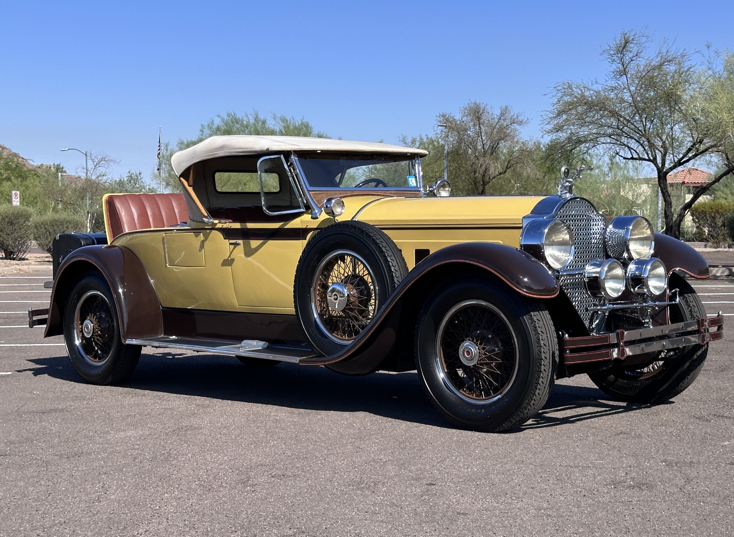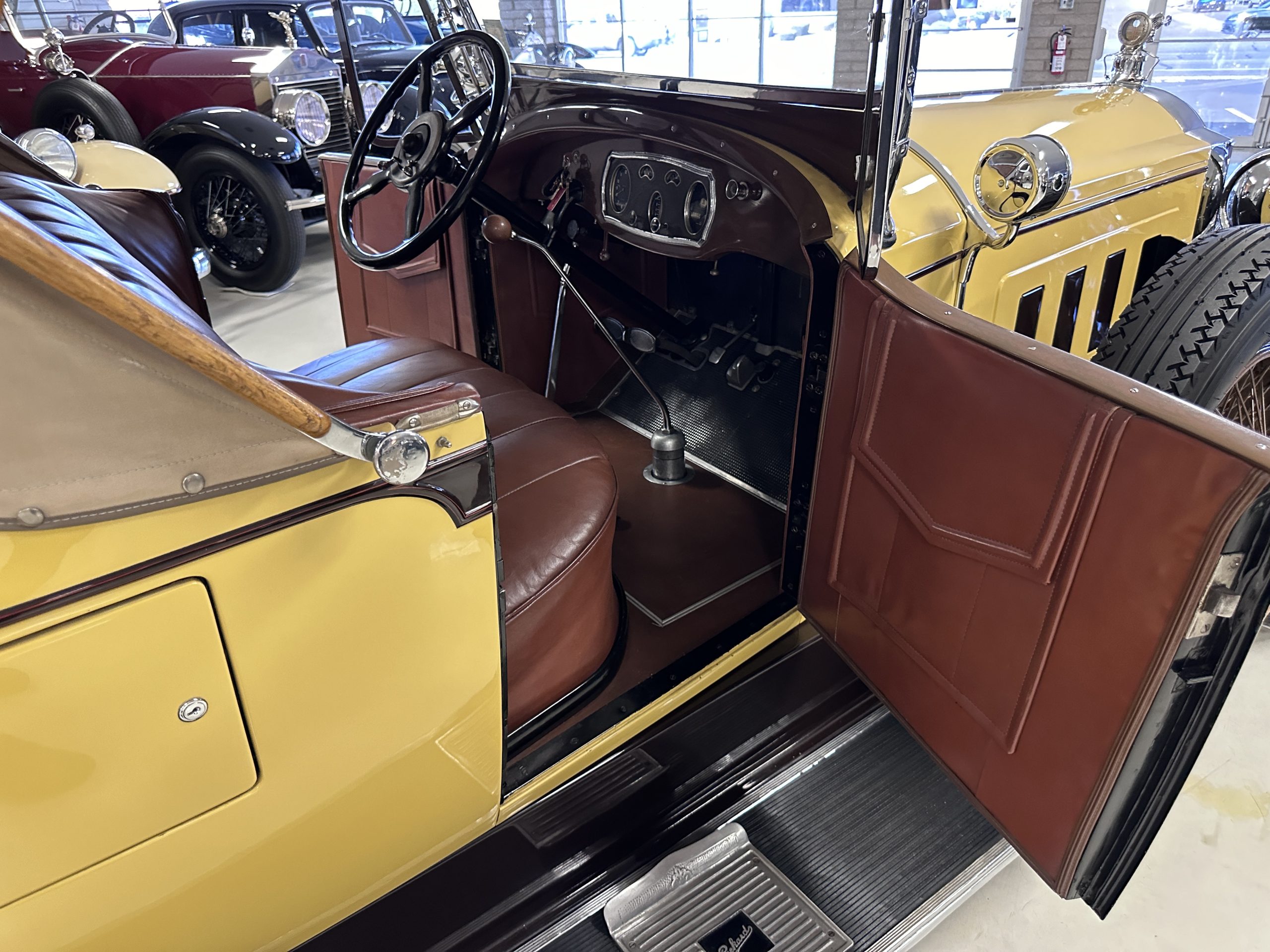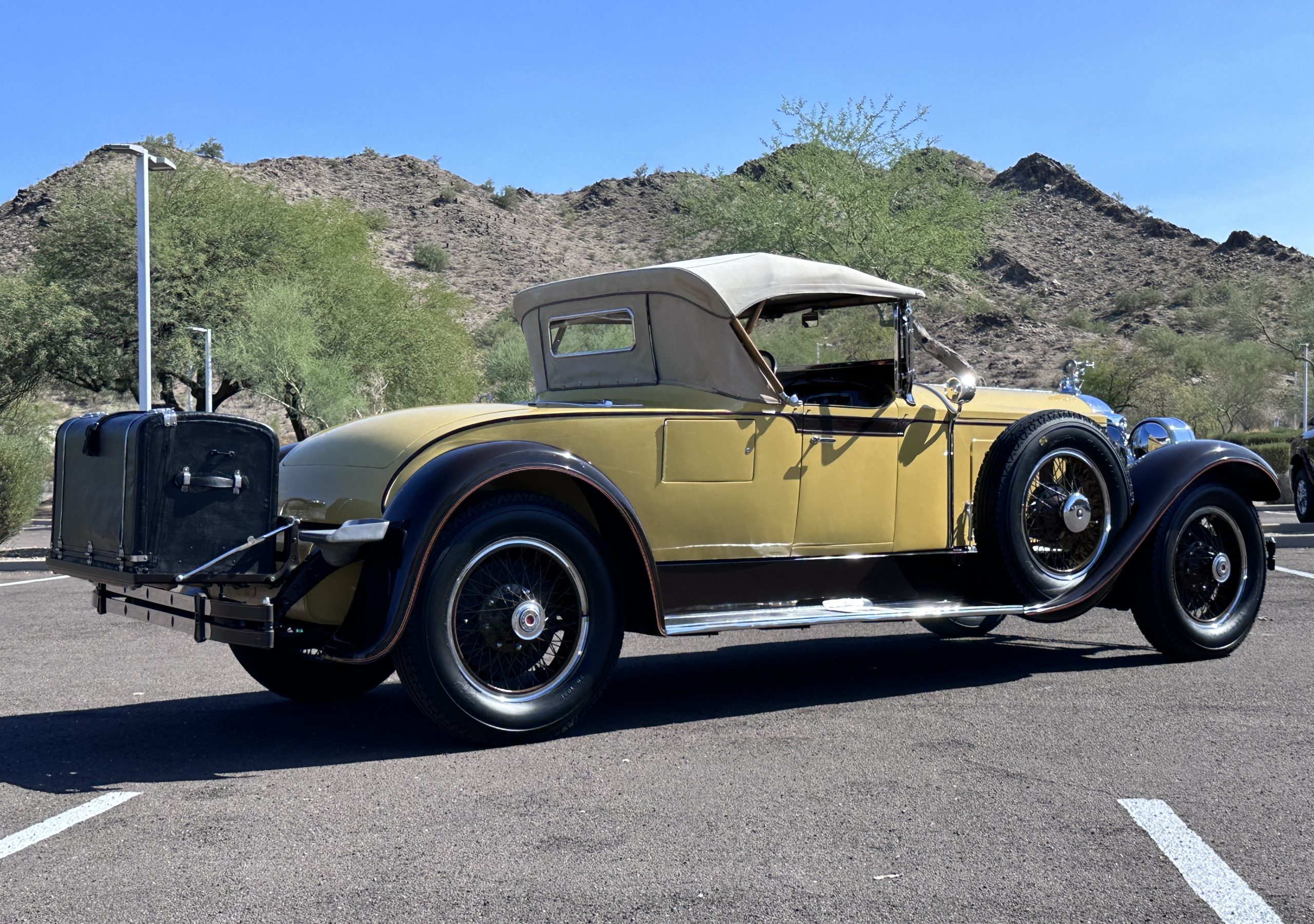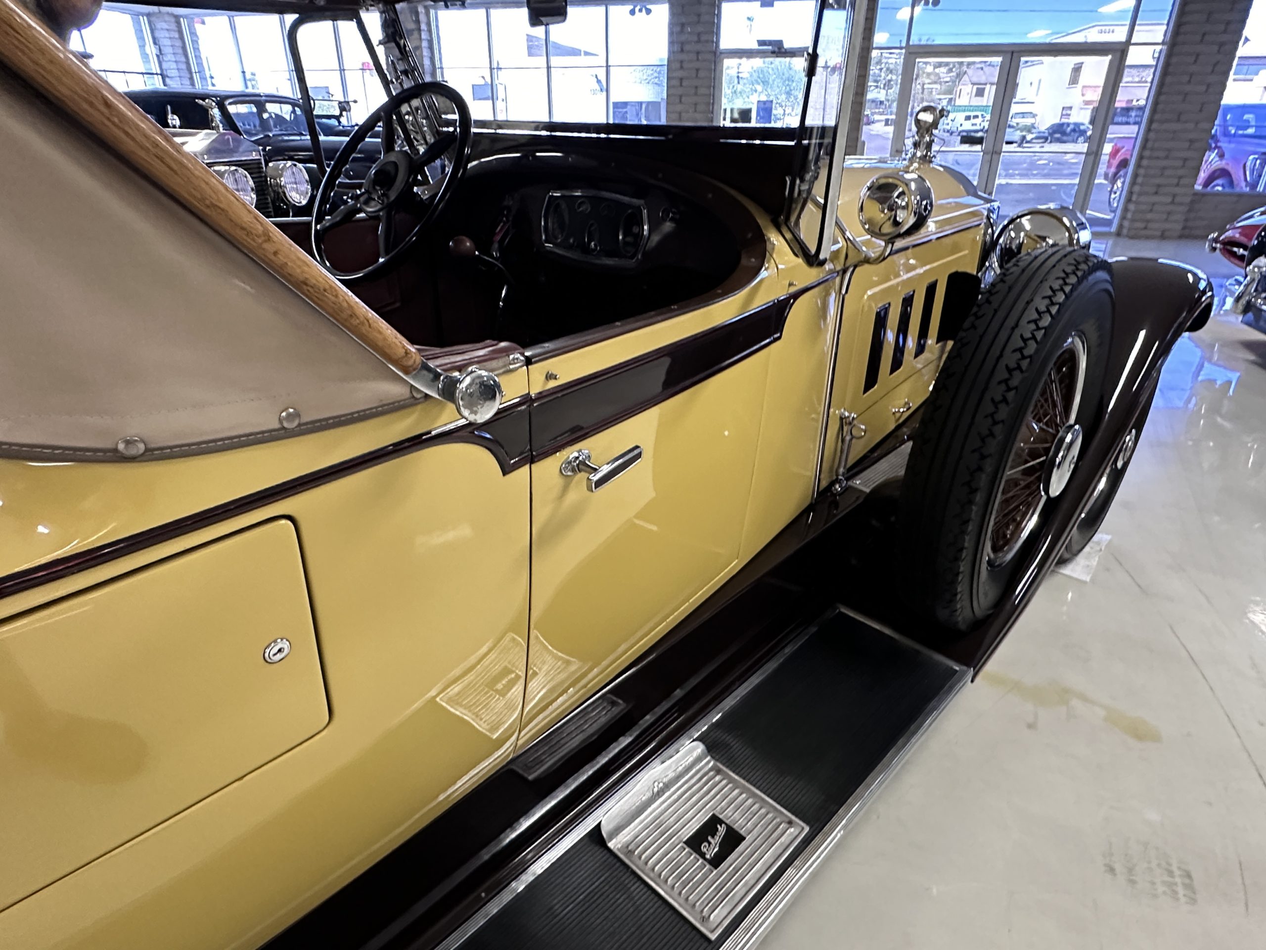 This 1928 Packard Custom Eight is a Model 443 Runabout that was purchased circa 1980 by the Antique Automobile Museum of Utah, who subsequently commissioned a refurbishment in the early 1980s. The car remained in the museum’s collection for approximately 43 years before being purchased by us in 2023. We invested a year and thousands of dollars in its recommissioning throughout 2024. Finished in yellow and brown, the car is powered by a 384.8ci L-head inline-eight that features a nine-main-bearing crankshaft and is mated to a three-speed manual transmission. Additional features include a single updraft carburetor, an exhaust cut-out, mechanically actuated four-wheel drum brakes, 20” wire wheels, dual side-mount spares, a beige convertible top, brown leather interior upholstery, a rumble seat, and a fold-down rear luggage rack hosting a trunk.