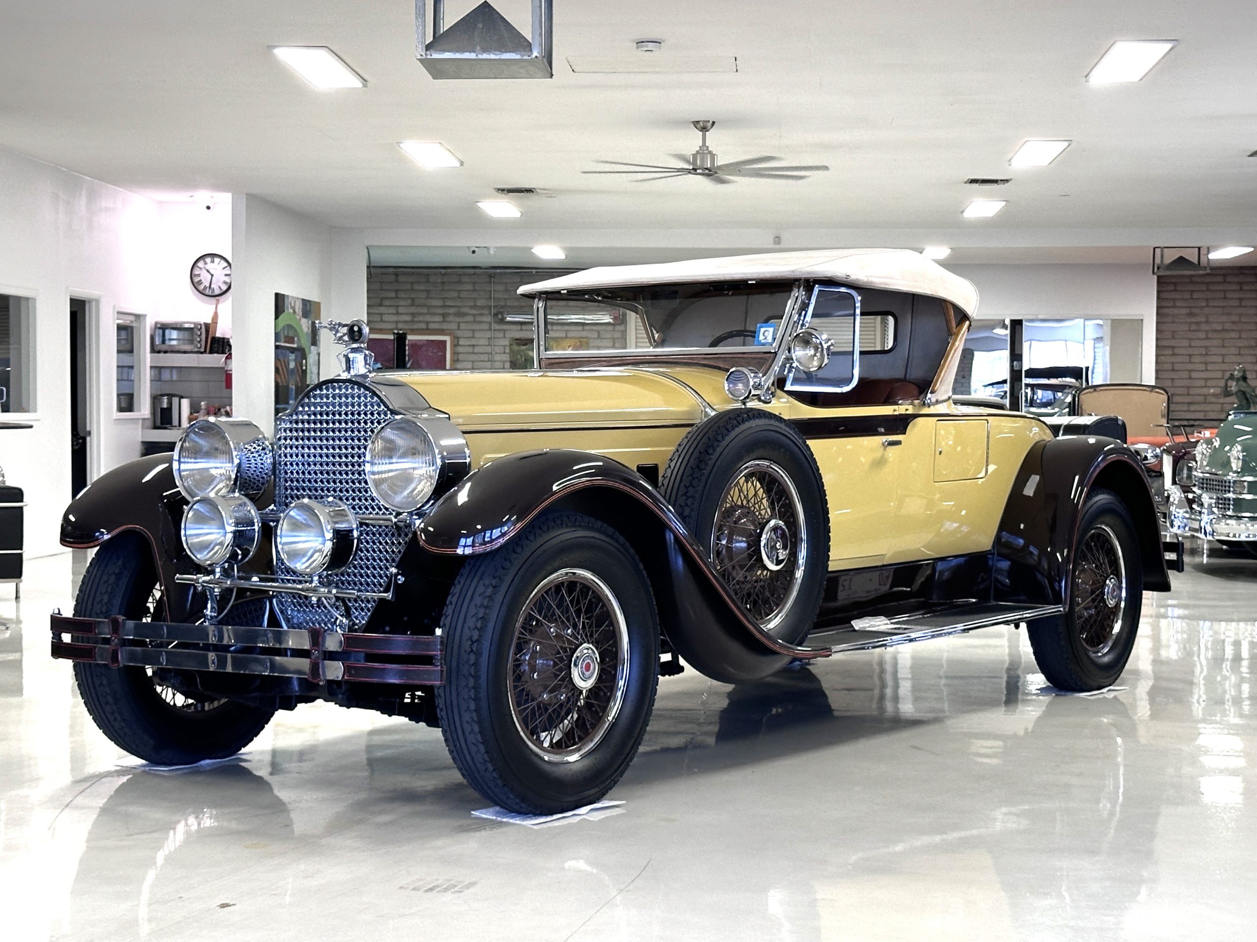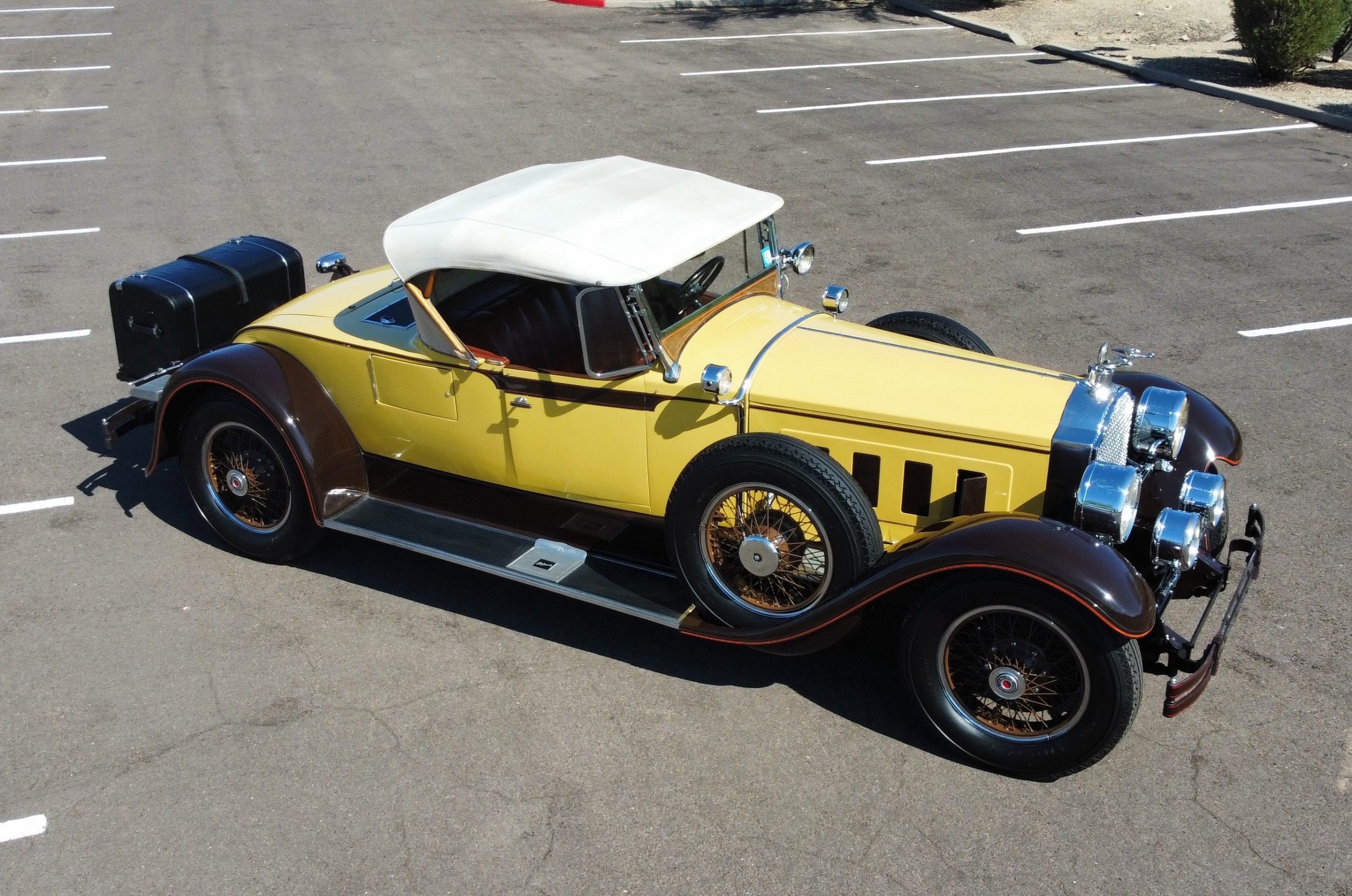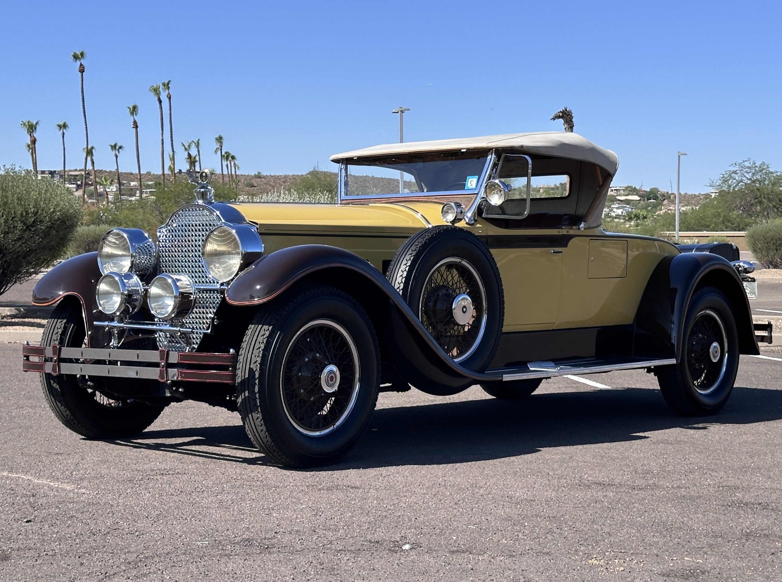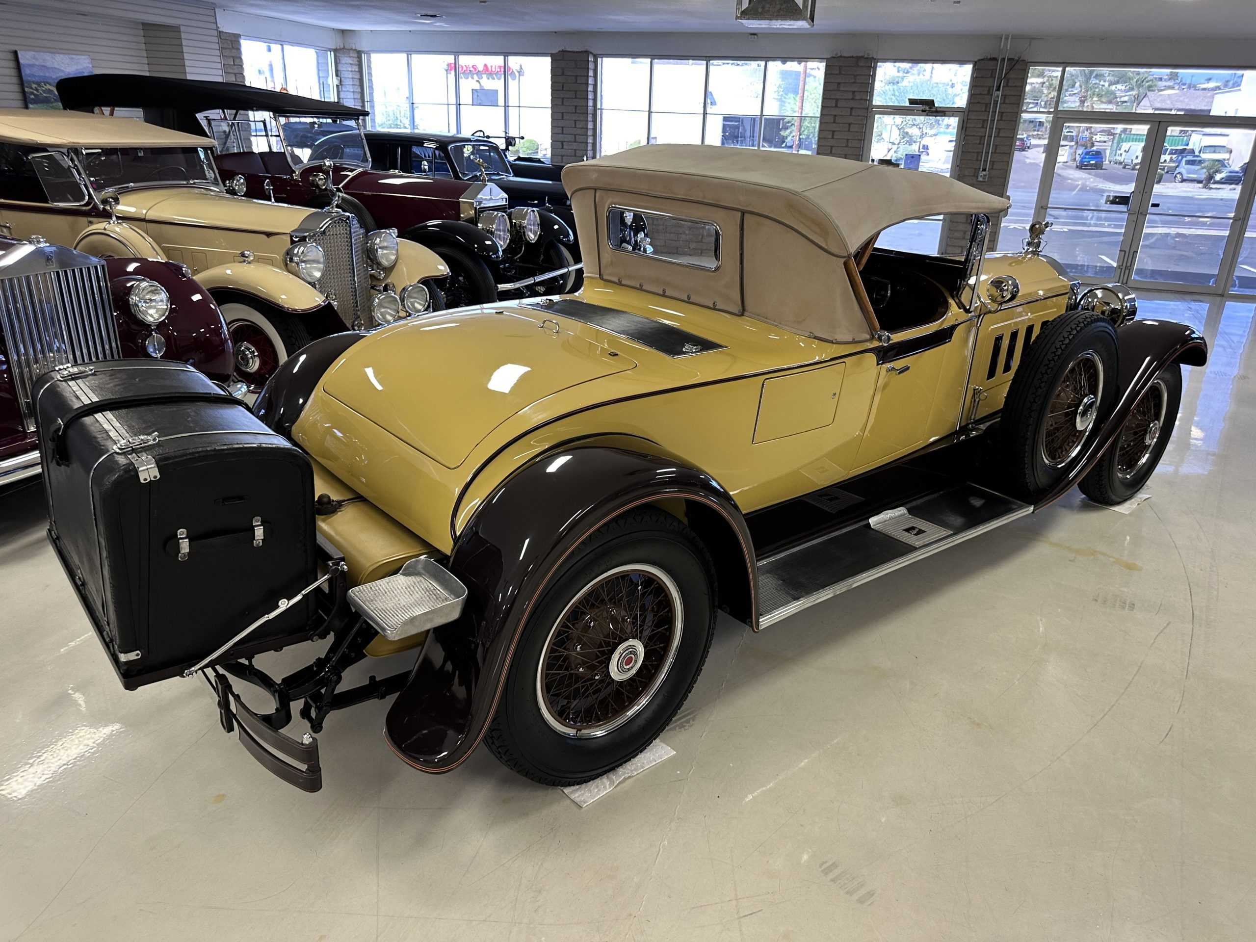 This 1928 Packard Custom Eight is a Model 443 Runabout that was purchased circa 1980 by the Antique Automobile Museum of Utah, who subsequently commissioned a refurbishment in the early 1980s. The car remained in the museum’s collection for approximately 43 years before being purchased by us in 2023. We invested a year and thousands of dollars in its recommissioning throughout 2024. Finished in yellow and brown, the car is powered by a 384.8ci L-head inline-eight that features a nine-main-bearing crankshaft and is mated to a three-speed manual transmission. Additional features include a single updraft carburetor, an exhaust cut-out, mechanically actuated four-wheel drum brakes, 20” wire wheels, dual side-mount spares, a beige convertible top, brown leather interior upholstery, a rumble seat, and a fold-down rear luggage rack hosting a trunk.