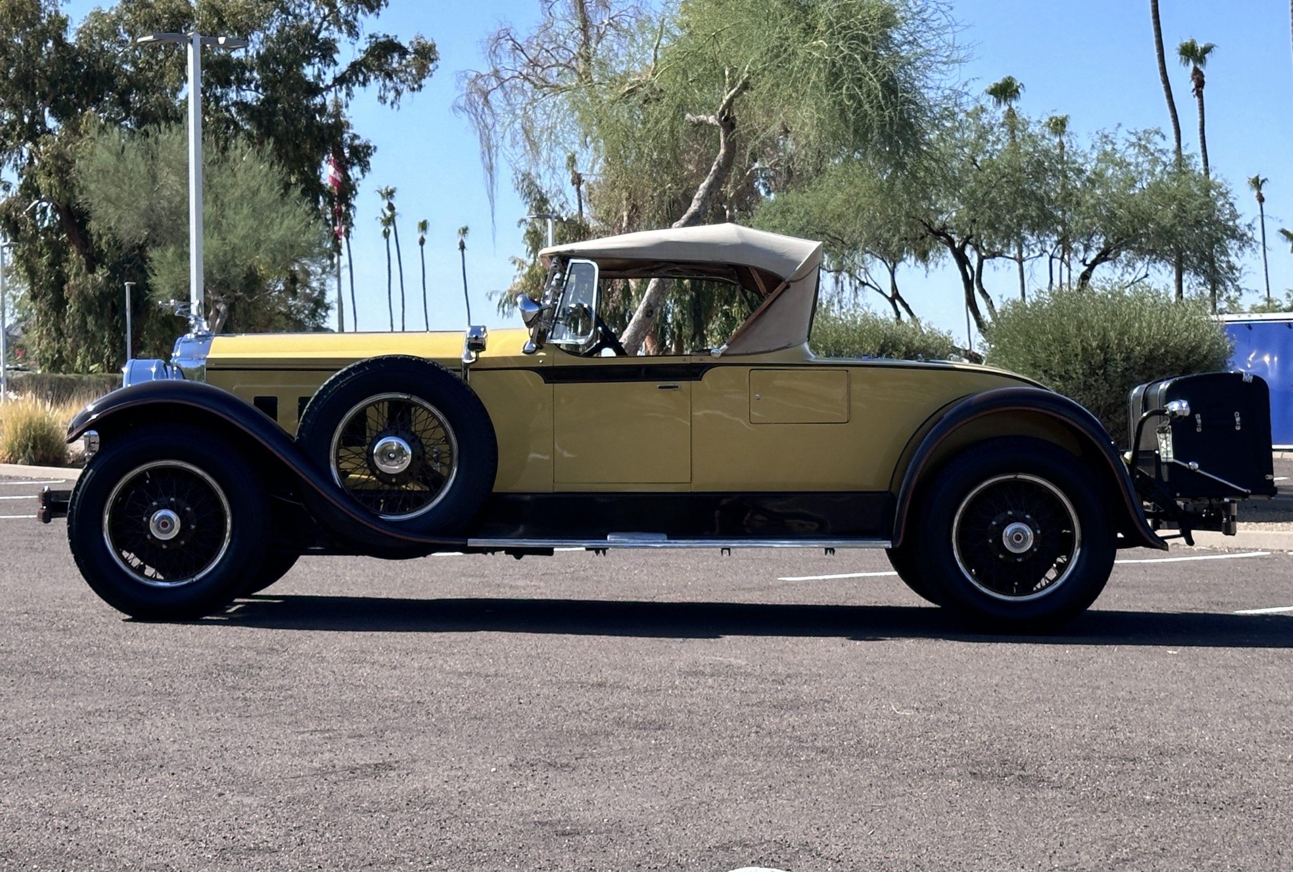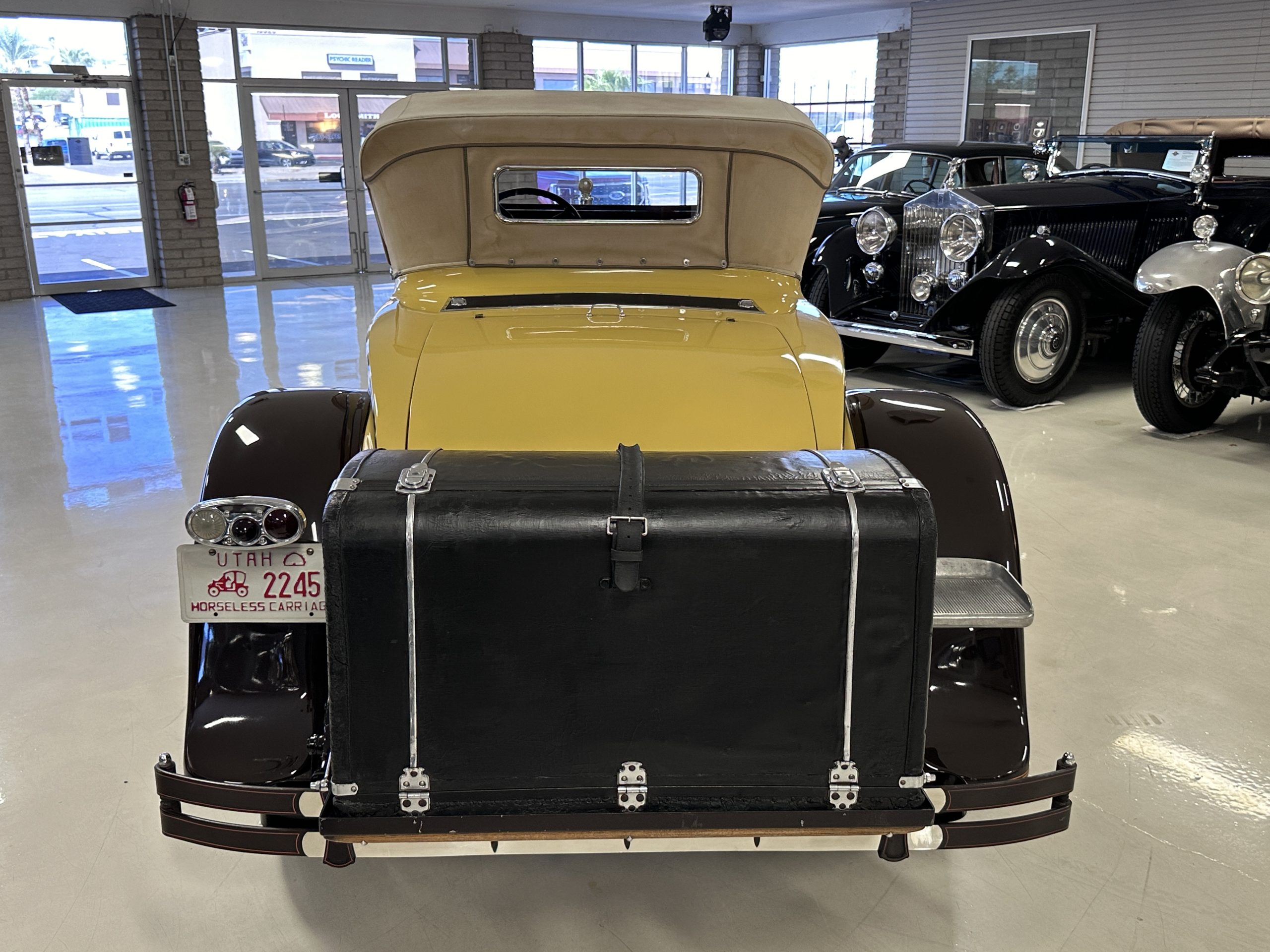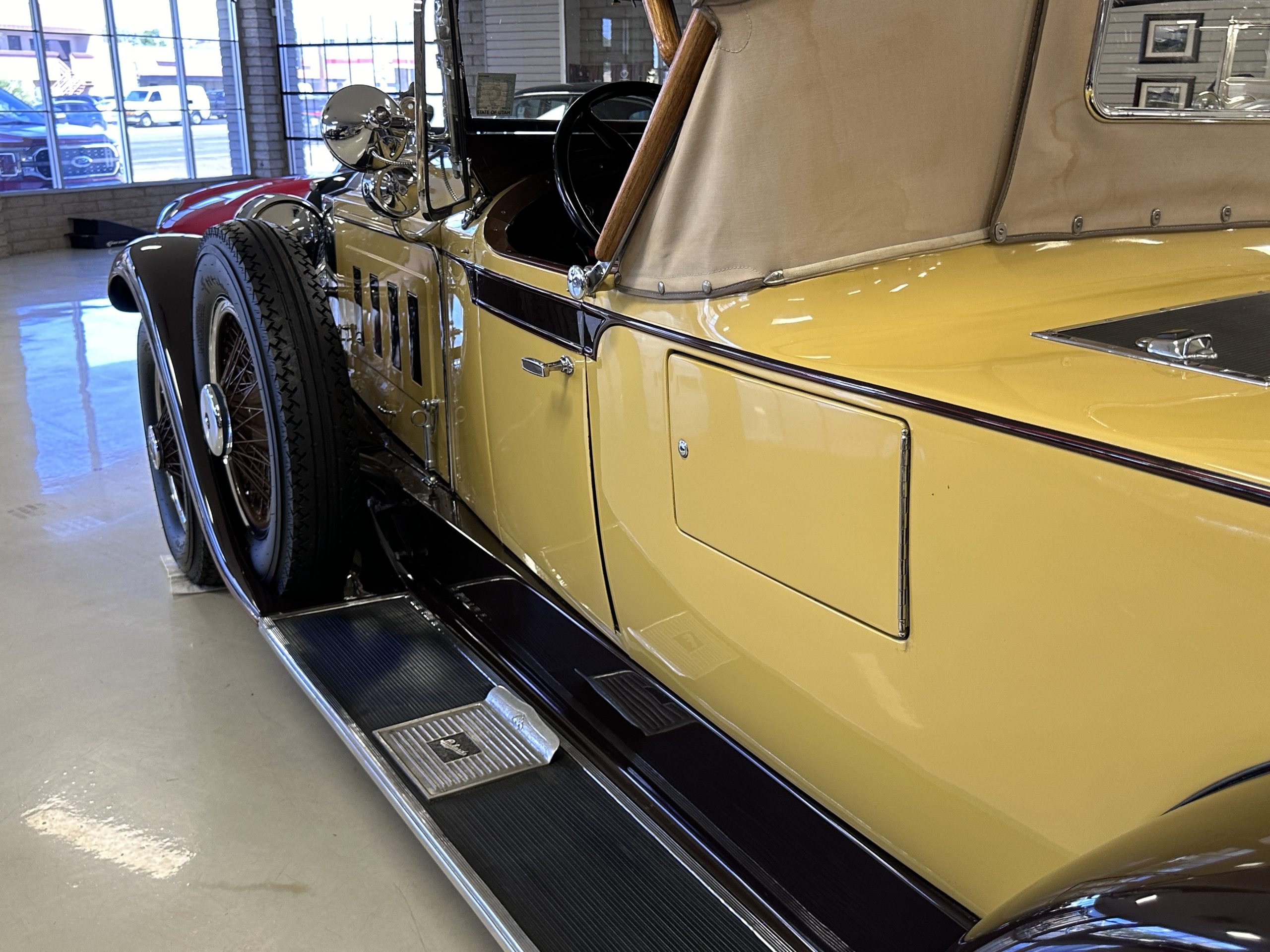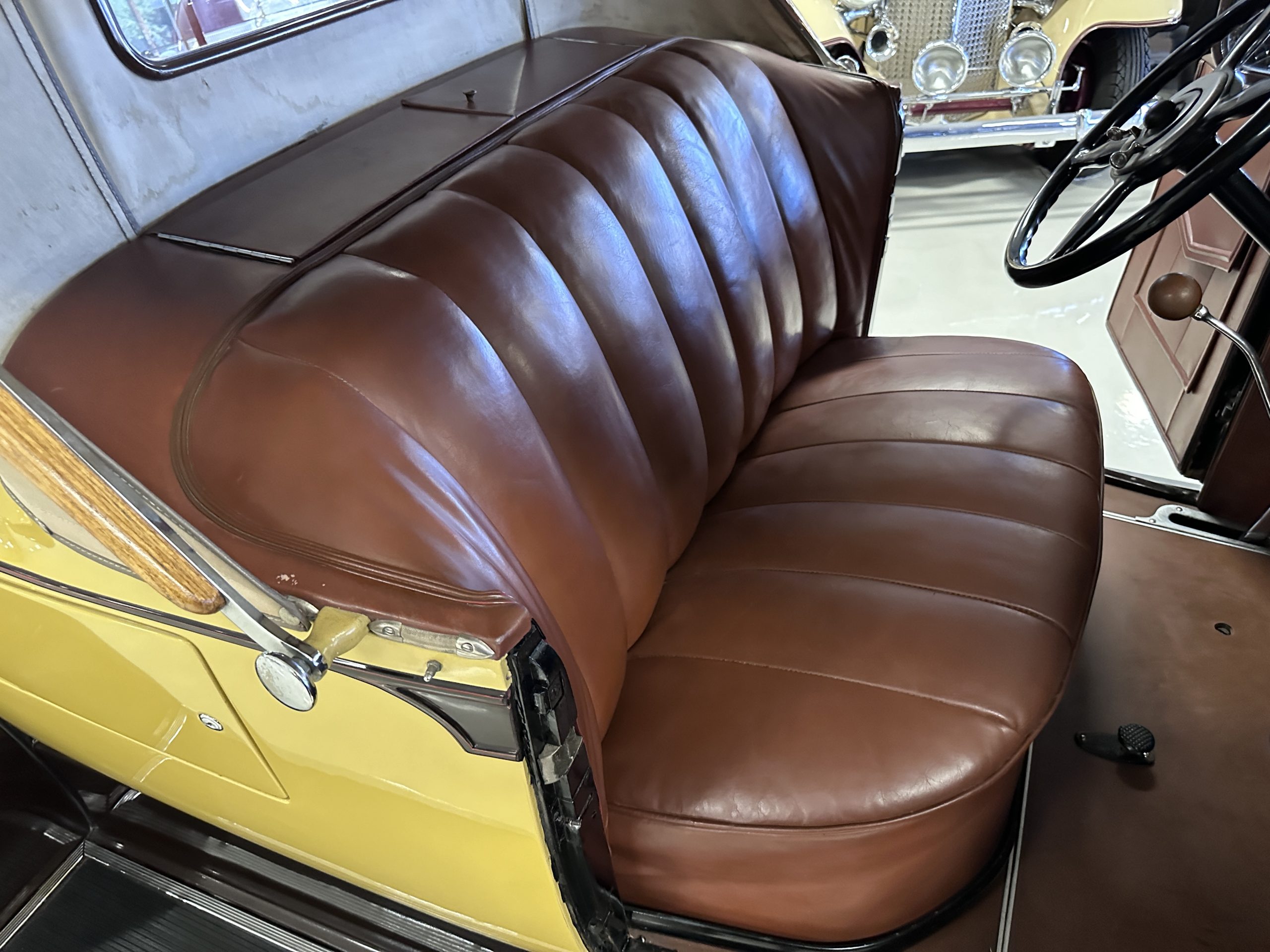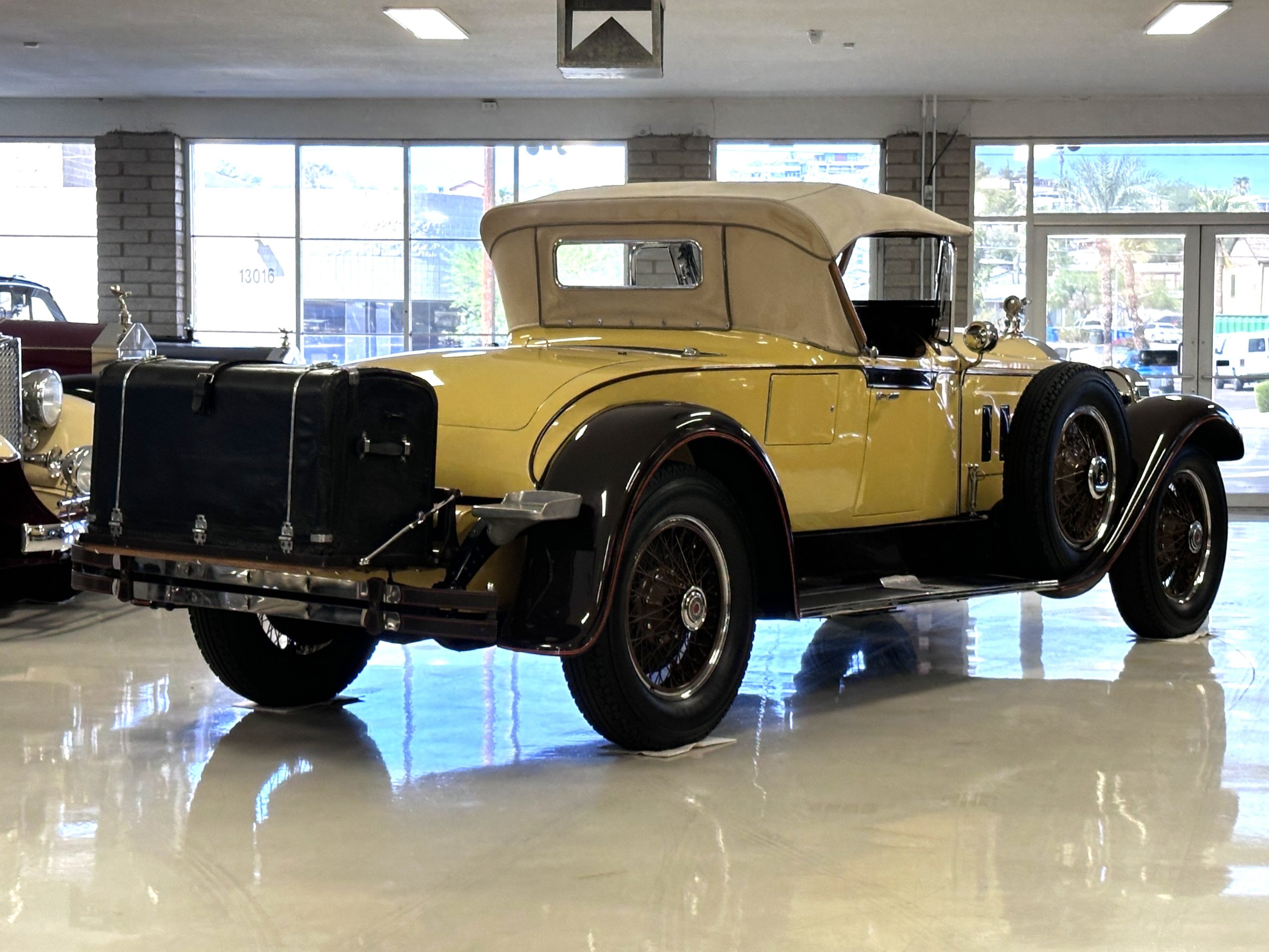 This 1928 Packard Custom Eight is a Model 443 Runabout that was purchased circa 1980 by the Antique Automobile Museum of Utah, who subsequently commissioned a refurbishment in the early 1980s. The car remained in the museum’s collection for approximately 43 years before being purchased by us in 2023. We invested a year and thousands of dollars in its recommissioning throughout 2024. Finished in yellow and brown, the car is powered by a 384.8ci L-head inline-eight that features a nine-main-bearing crankshaft and is mated to a three-speed manual transmission. Additional features include a single updraft carburetor, an exhaust cut-out, mechanically actuated four-wheel drum brakes, 20” wire wheels, dual side-mount spares, a beige convertible top, brown leather interior upholstery, a rumble seat, and a fold-down rear luggage rack hosting a trunk.