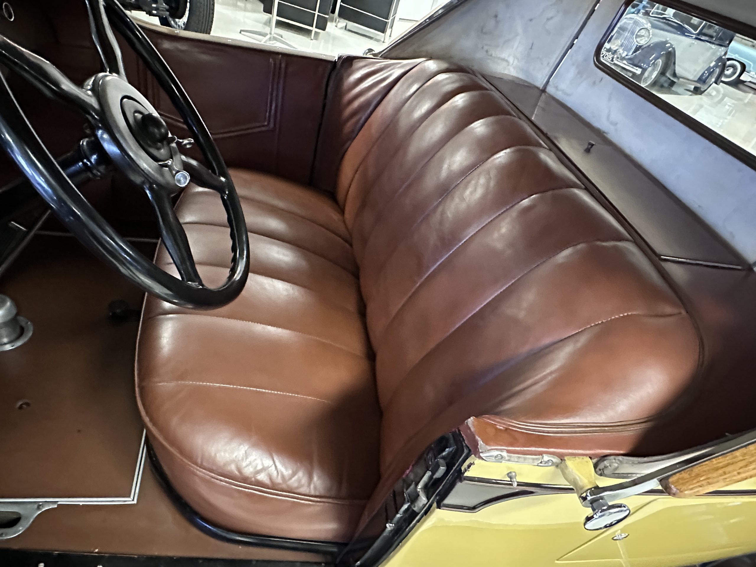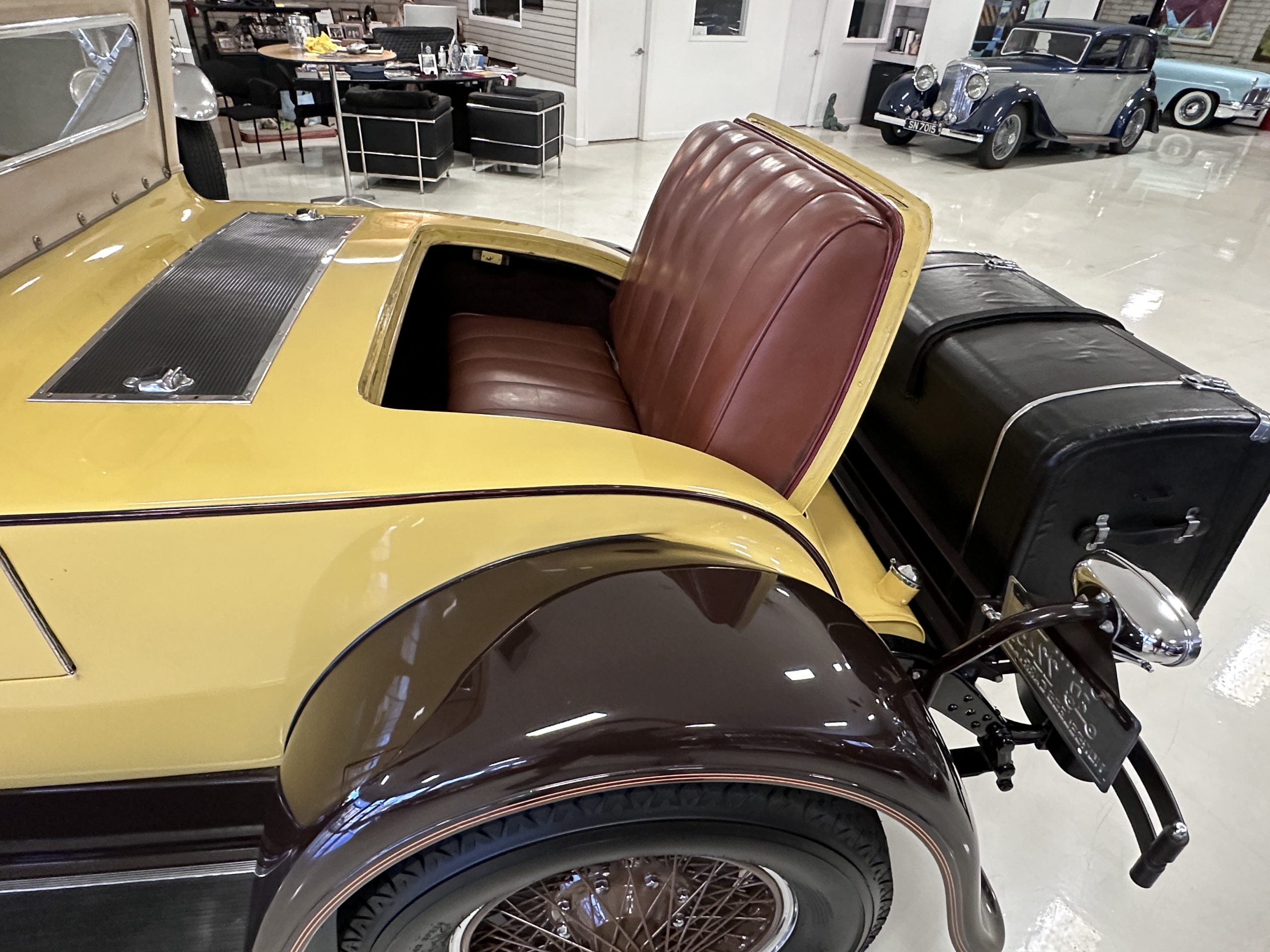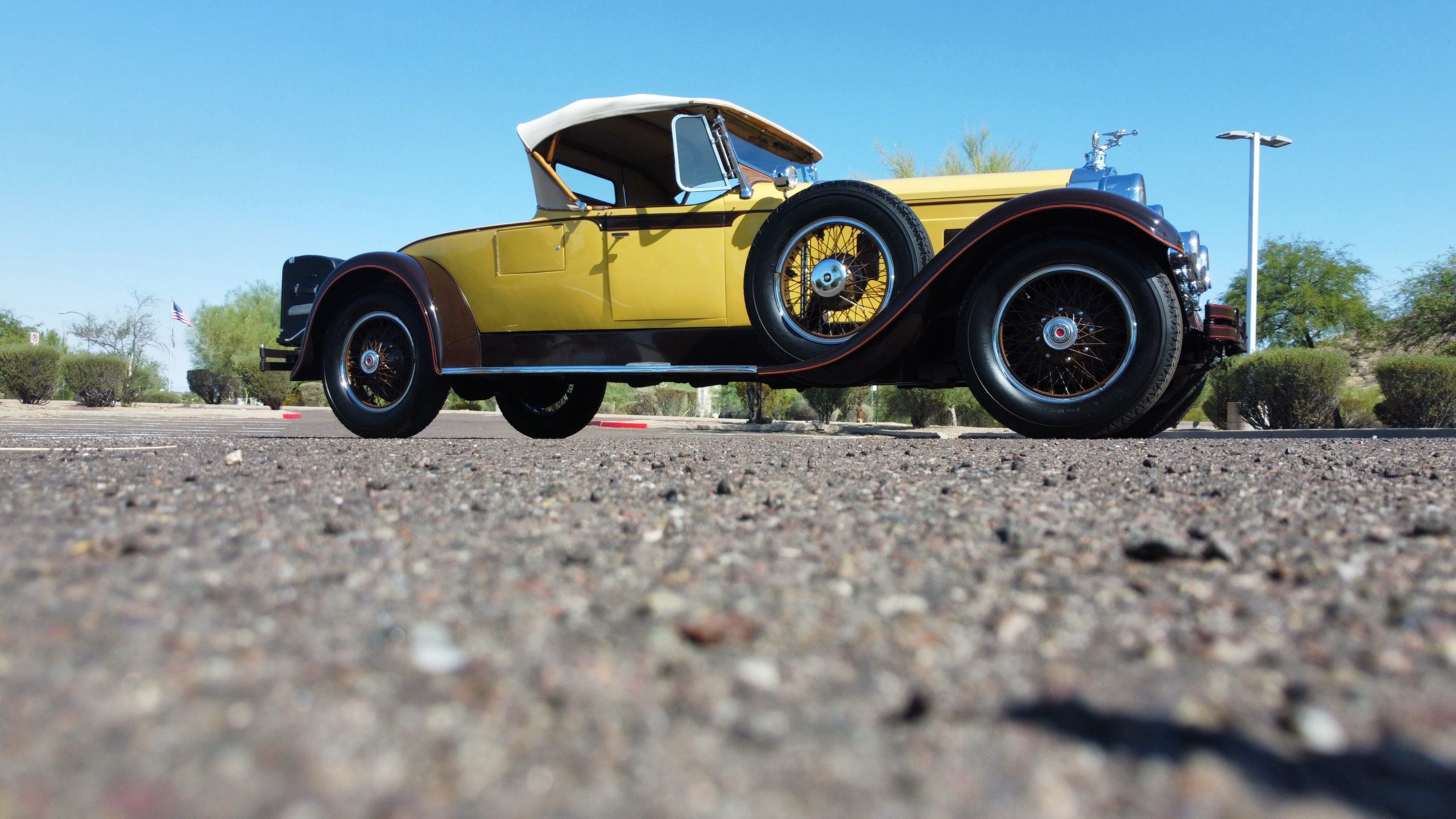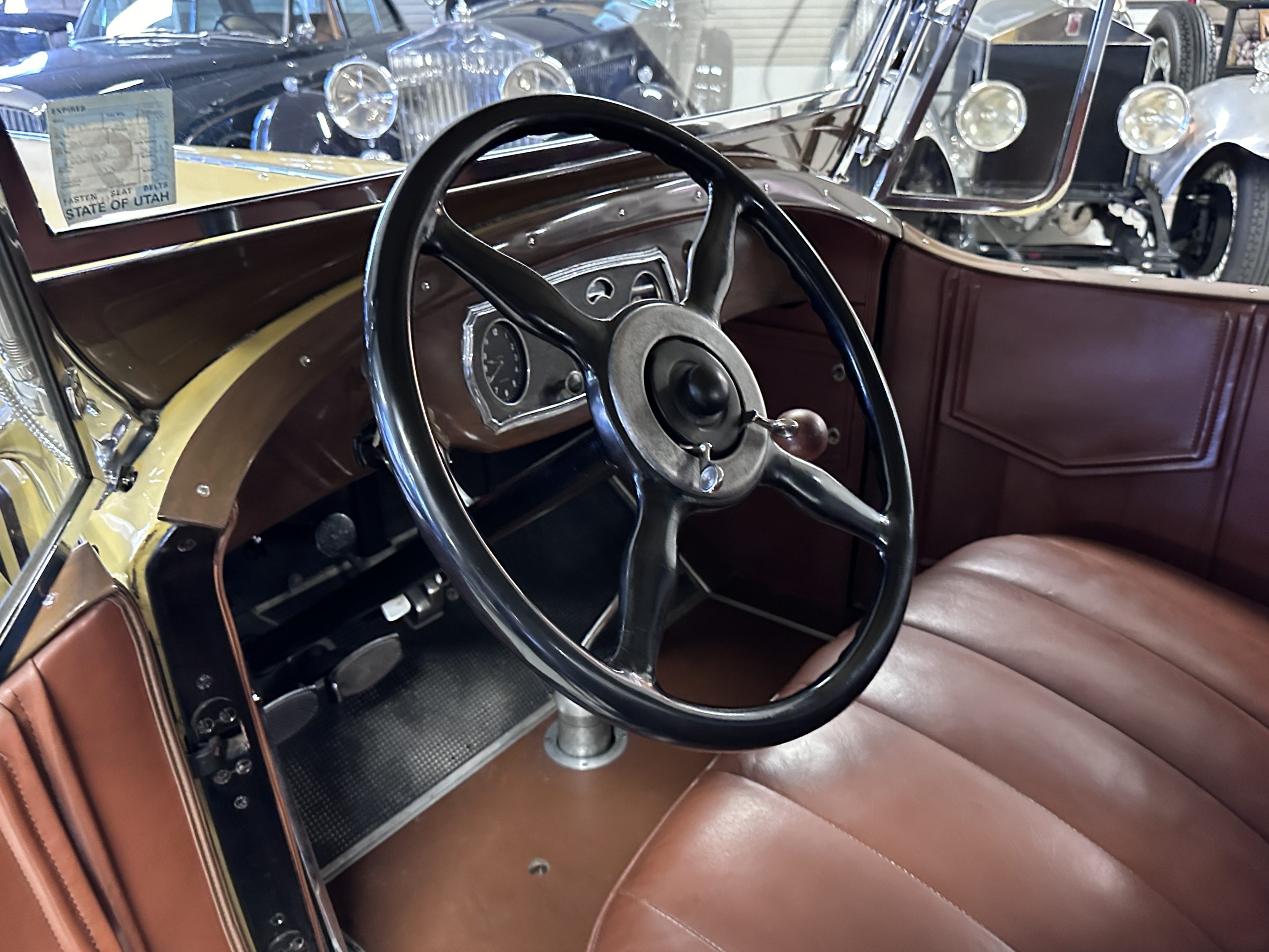 This 1928 Packard Custom Eight is a Model 443 Runabout that was purchased circa 1980 by the Antique Automobile Museum of Utah, who subsequently commissioned a refurbishment in the early 1980s. The car remained in the museum’s collection for approximately 43 years before being purchased by us in 2023. We invested a year and thousands of dollars in its recommissioning throughout 2024. Finished in yellow and brown, the car is powered by a 384.8ci L-head inline-eight that features a nine-main-bearing crankshaft and is mated to a three-speed manual transmission. Additional features include a single updraft carburetor, an exhaust cut-out, mechanically actuated four-wheel drum brakes, 20” wire wheels, dual side-mount spares, a beige convertible top, brown leather interior upholstery, a rumble seat, and a fold-down rear luggage rack hosting a trunk.