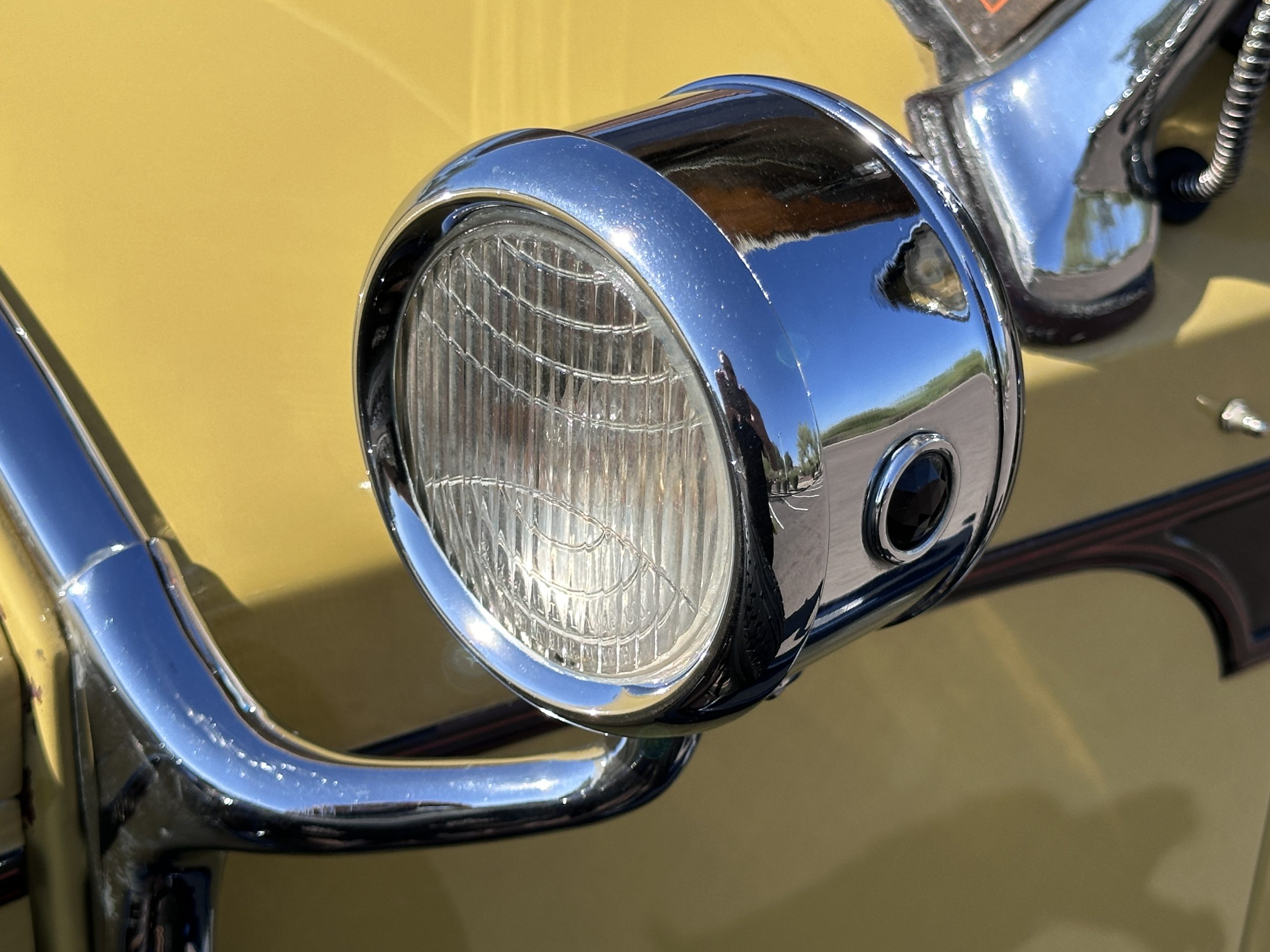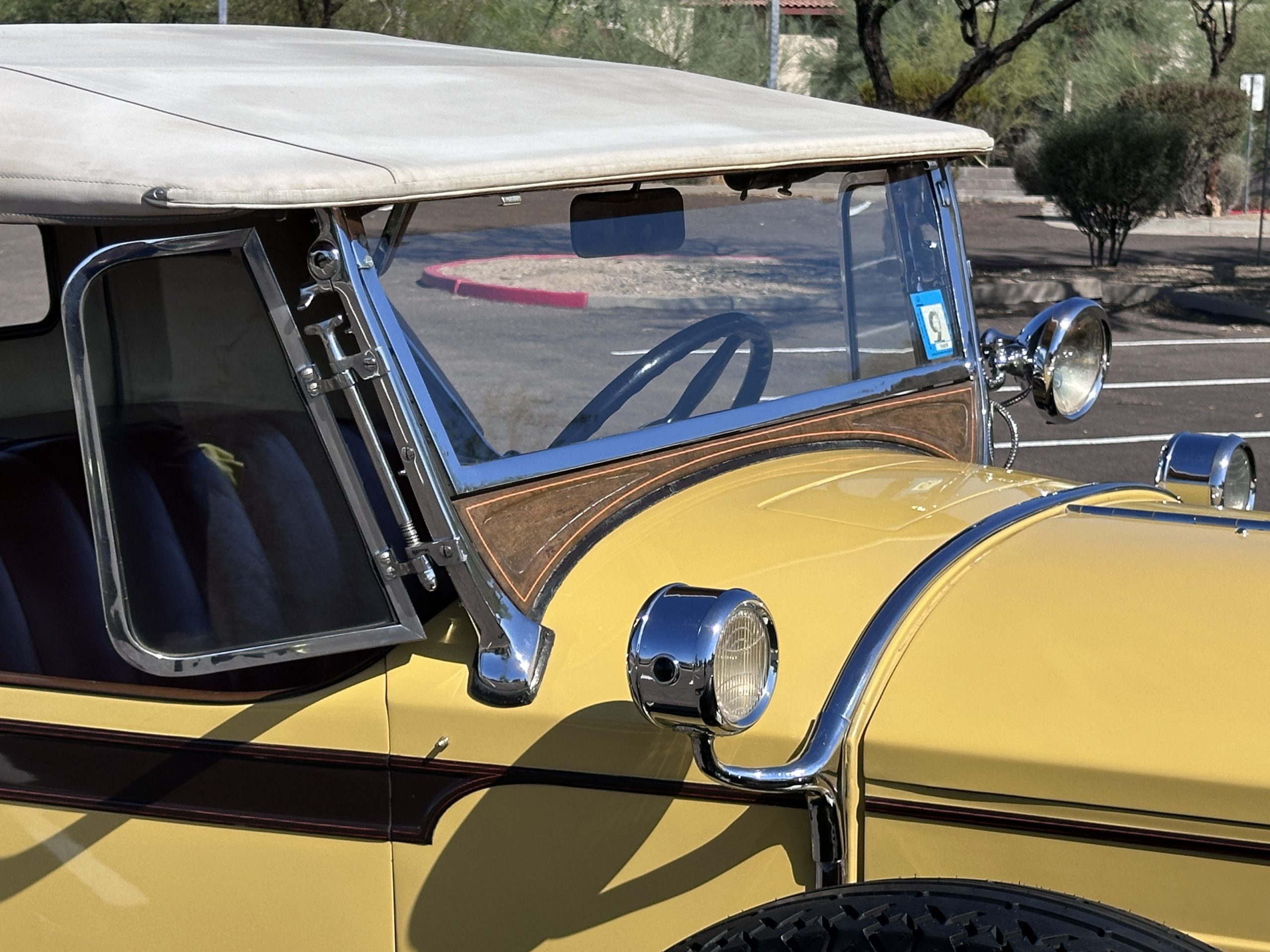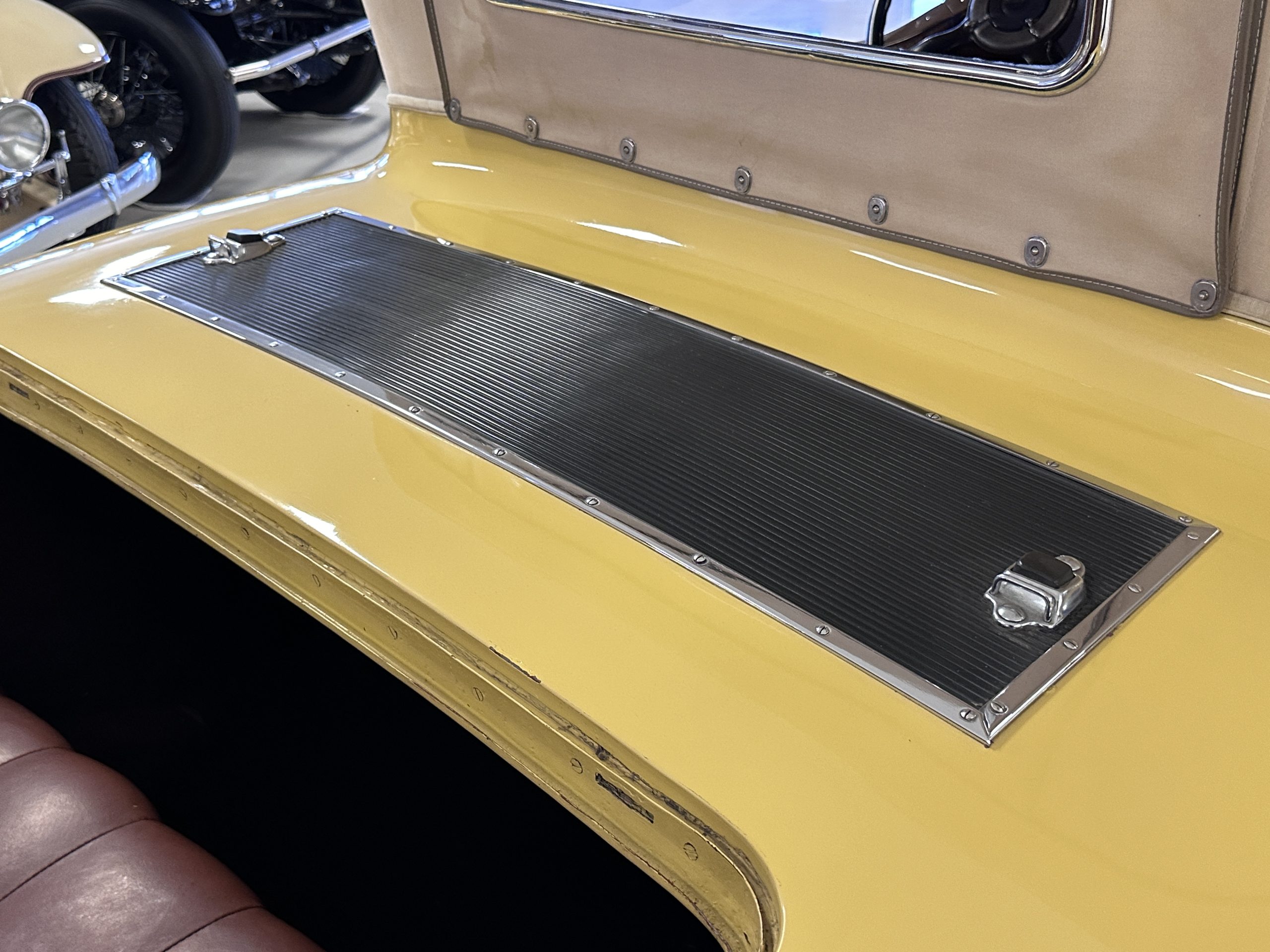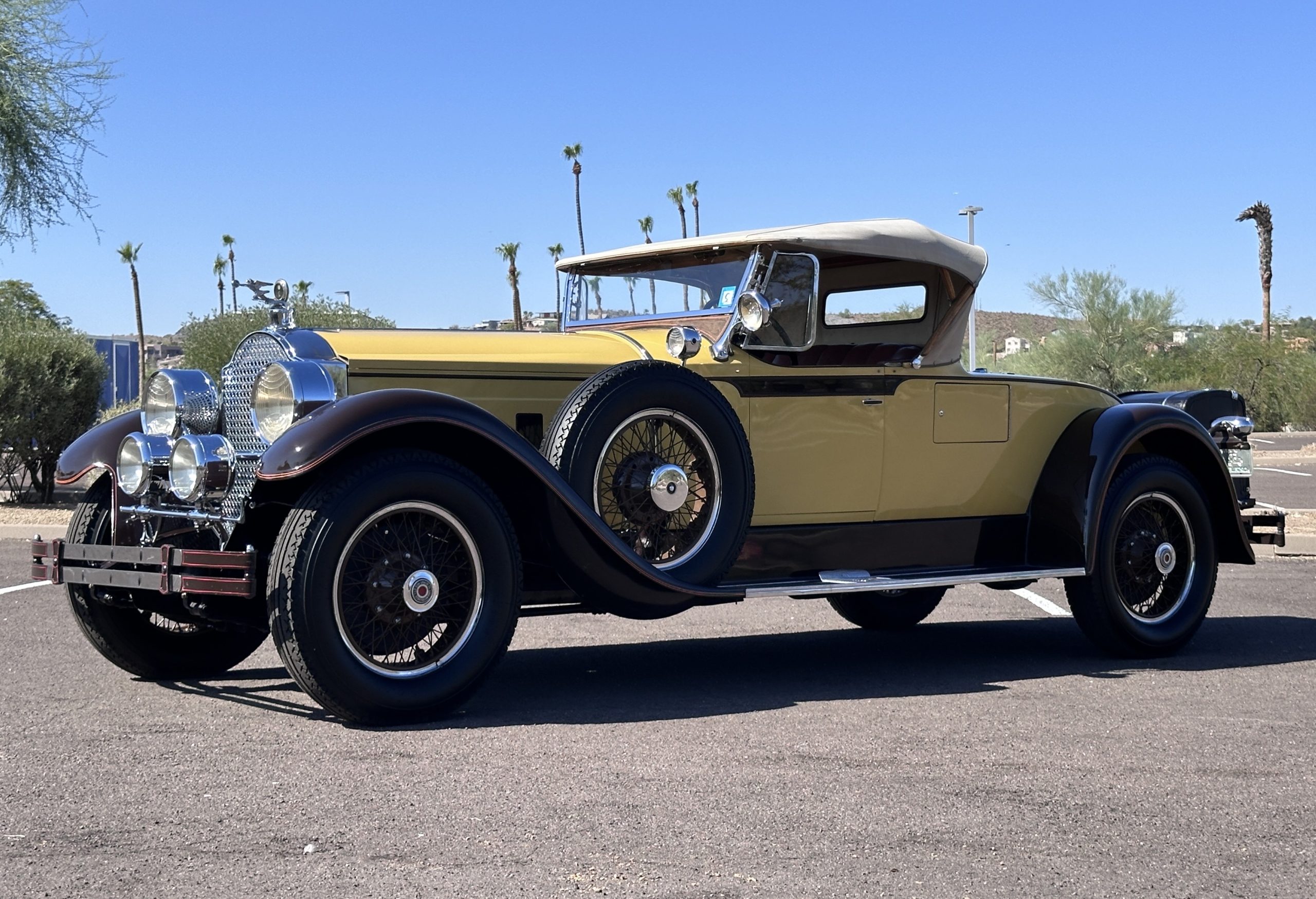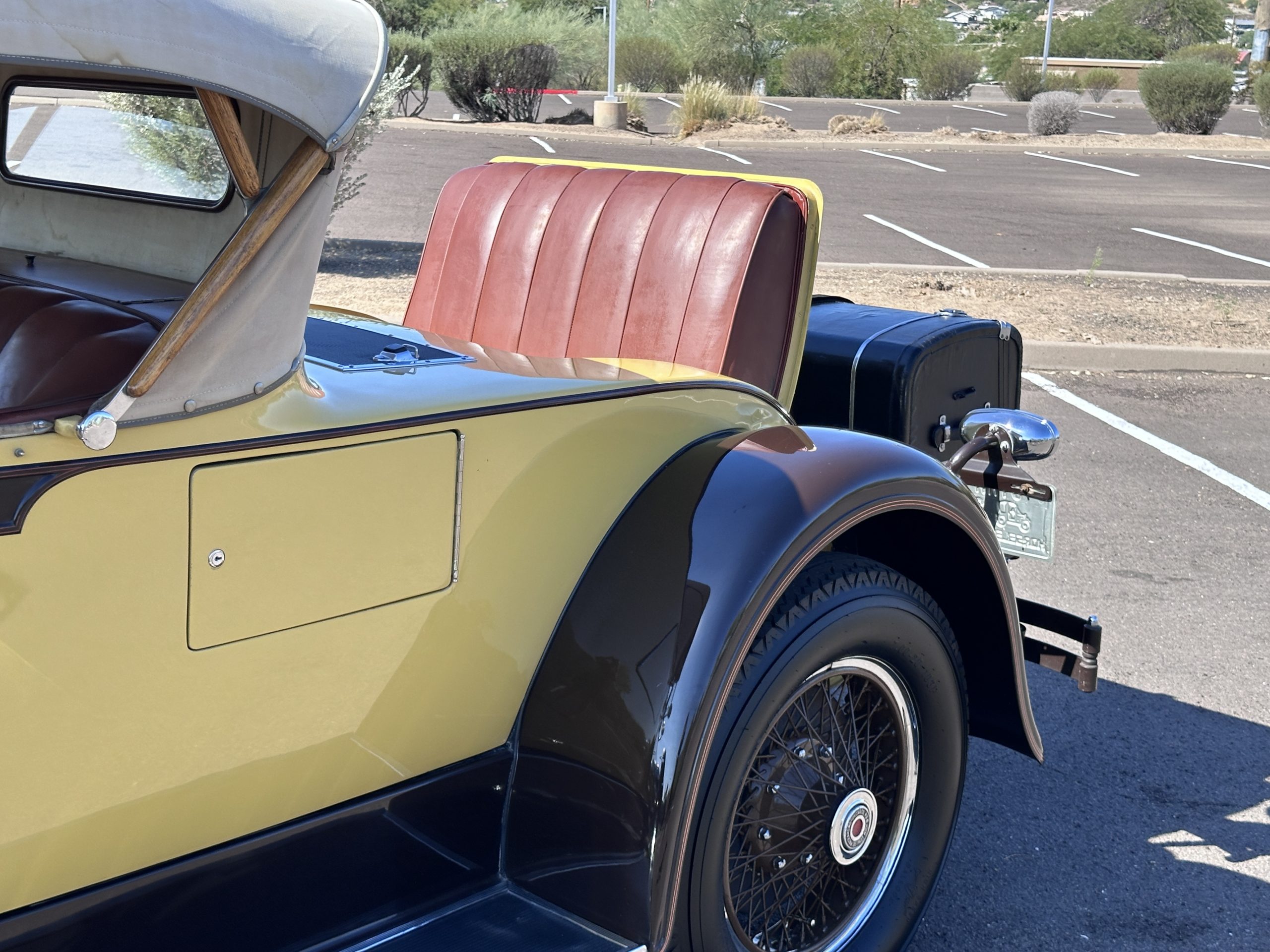 The body was refinished in its current combination of yellow with brown accents during the refurbishment performed in the early 1980s, and a paint correction was performed in 2024. Features include C.M. Hall headlights, dual swiveling Pilot Ray driving lights, a bright radiator shell with a chrome radiator stone guard, a Goddess of Speed radiator mascot, a Boyce MotoMeter, quadruple vents on each side of a centrally hinged hood, cowl lamps, a driver-side spot lamp, a tilt-out windshield with wind wings, a fold-down rear luggage rack, and a beige convertible top.