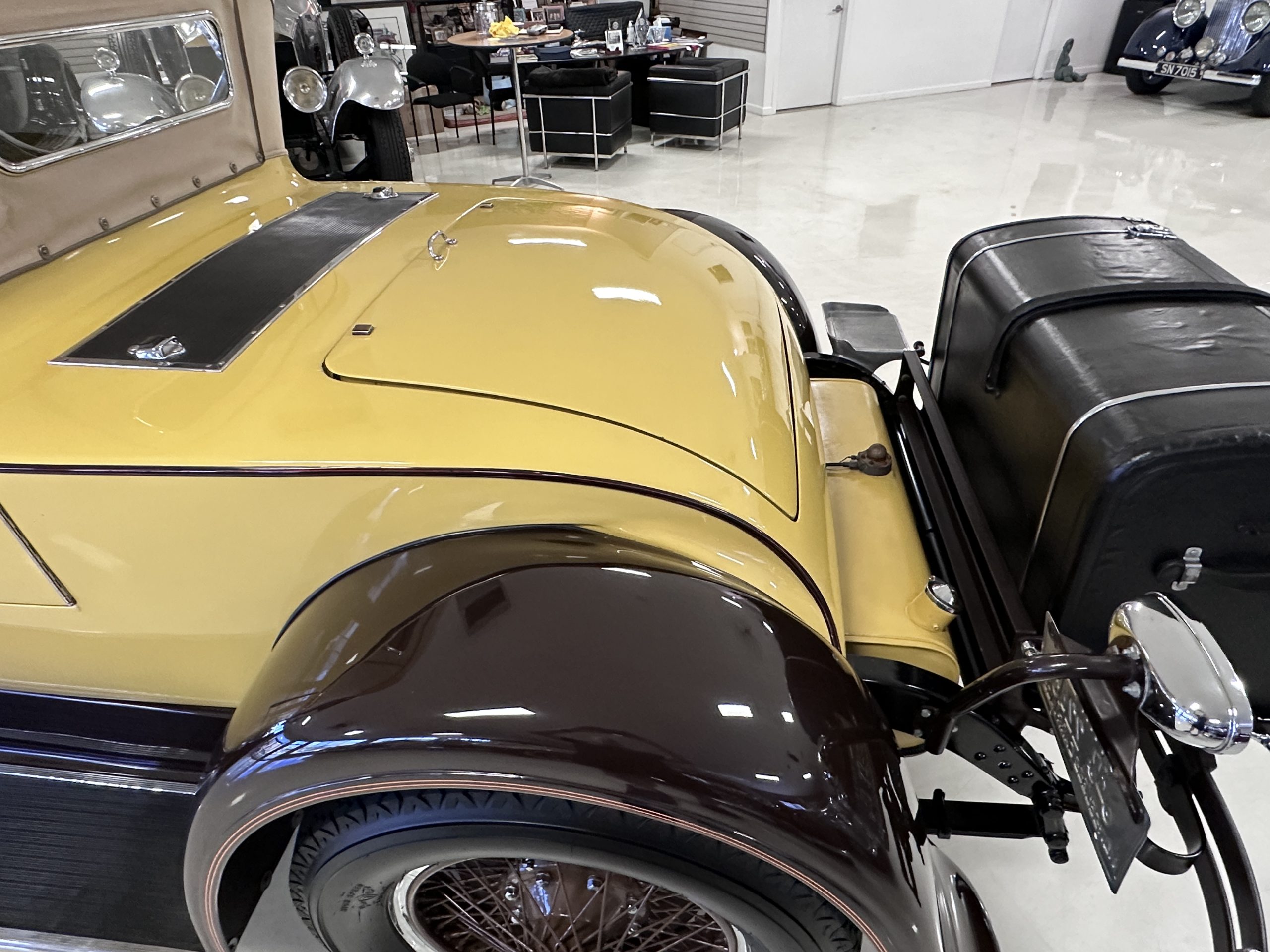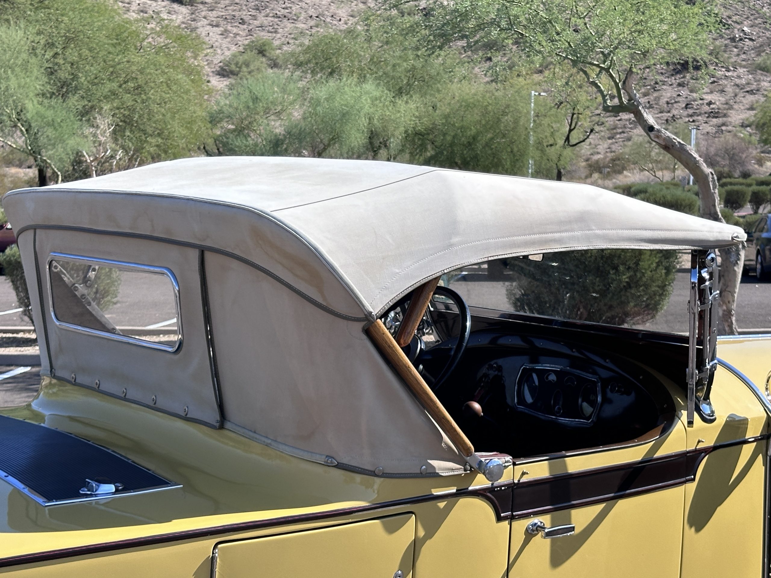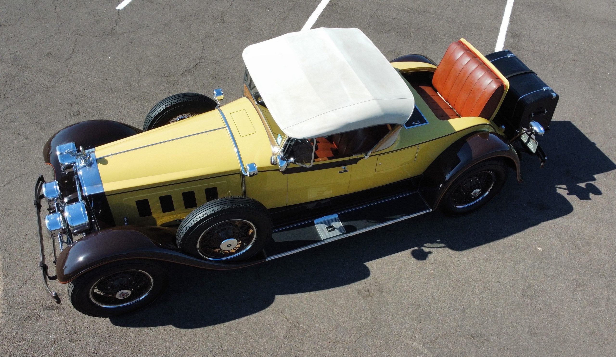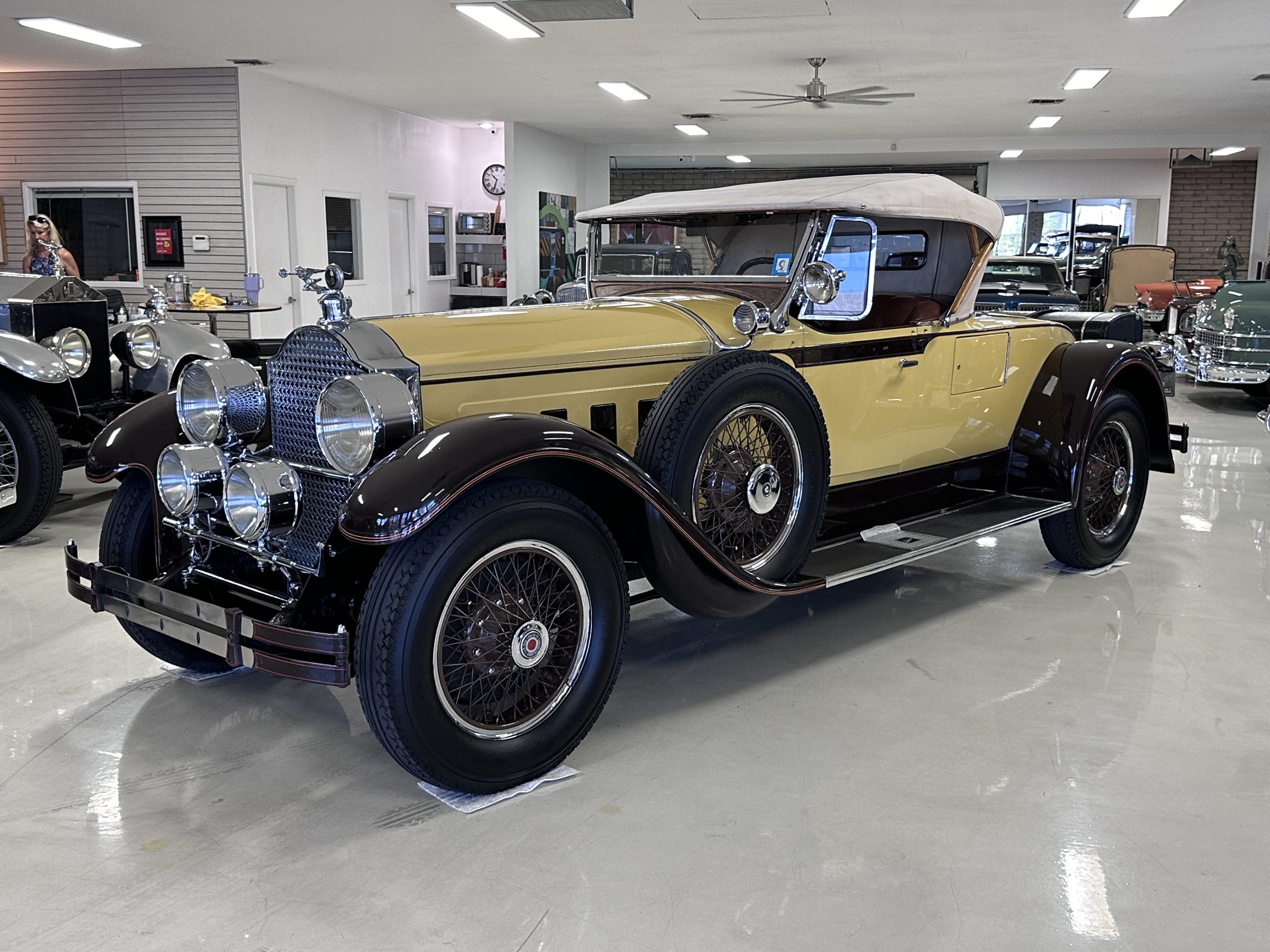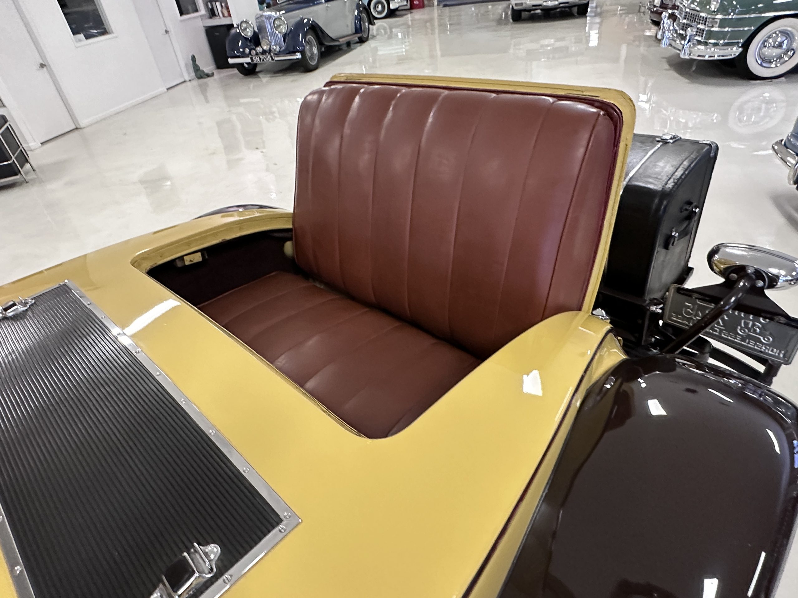 The body was refinished in its current combination of yellow with brown accents during the refurbishment performed in the early 1980s, and a paint correction was performed in 2024. Features include C.M. Hall headlights, dual swiveling Pilot Ray driving lights, a bright radiator shell with a chrome radiator stone guard, a Goddess of Speed radiator mascot, a Boyce MotoMeter, quadruple vents on each side of a centrally hinged hood, cowl lamps, a driver-side spot lamp, a tilt-out windshield with wind wings, a fold-down rear luggage rack, and a beige convertible top.