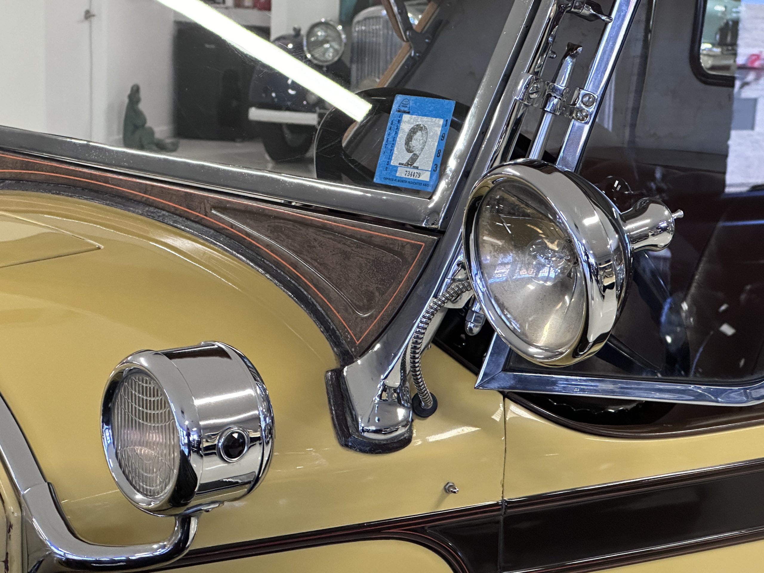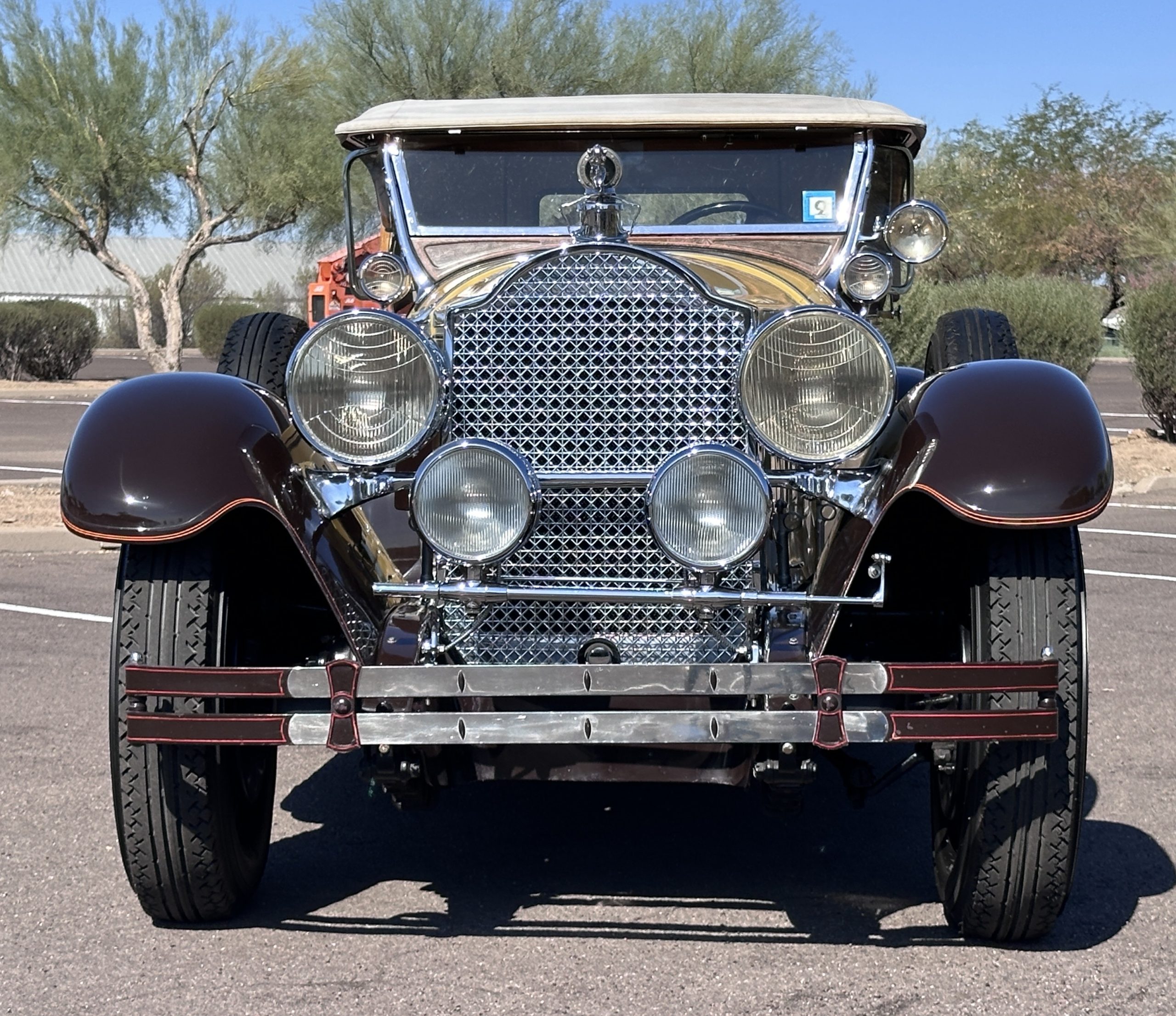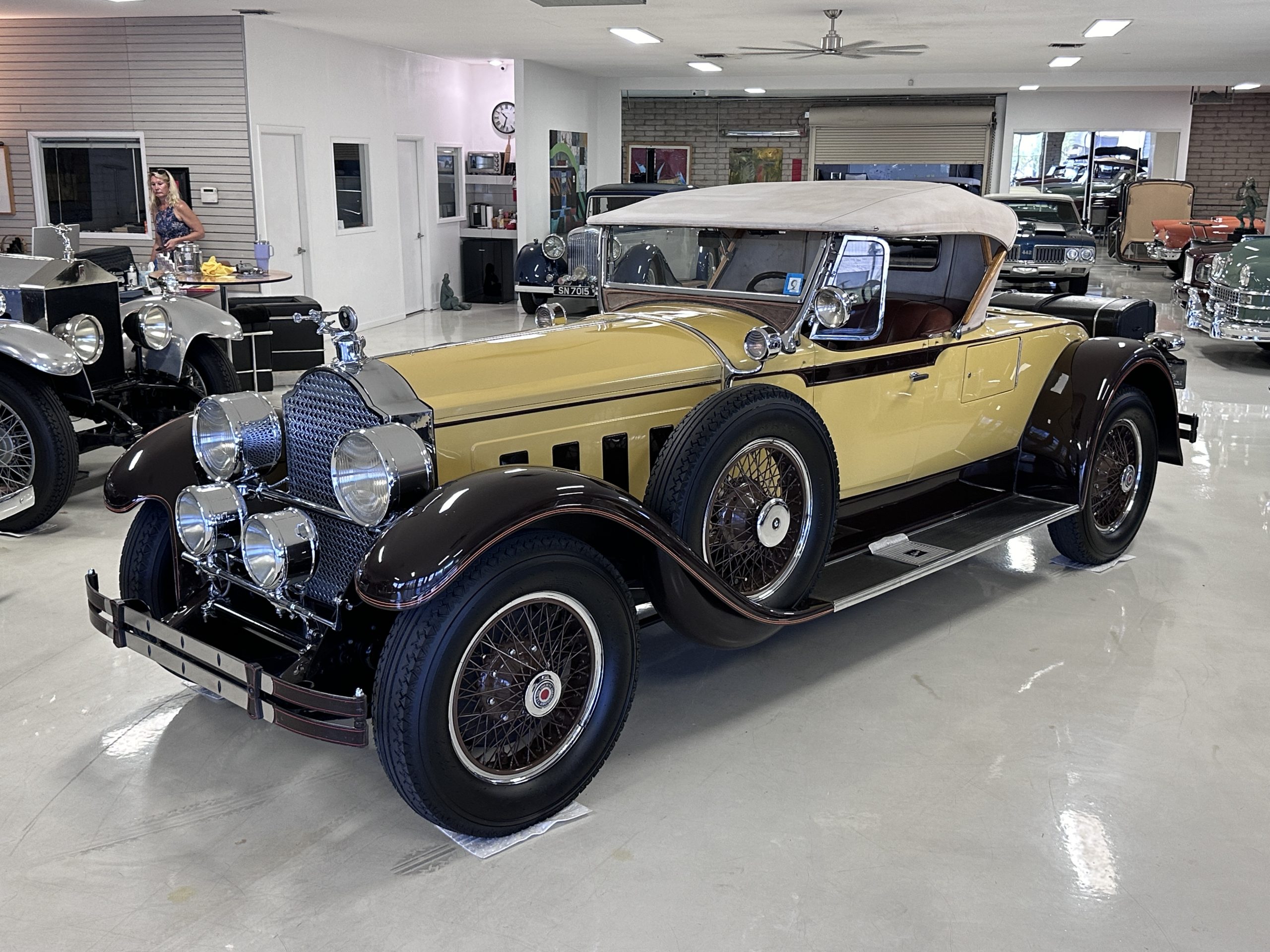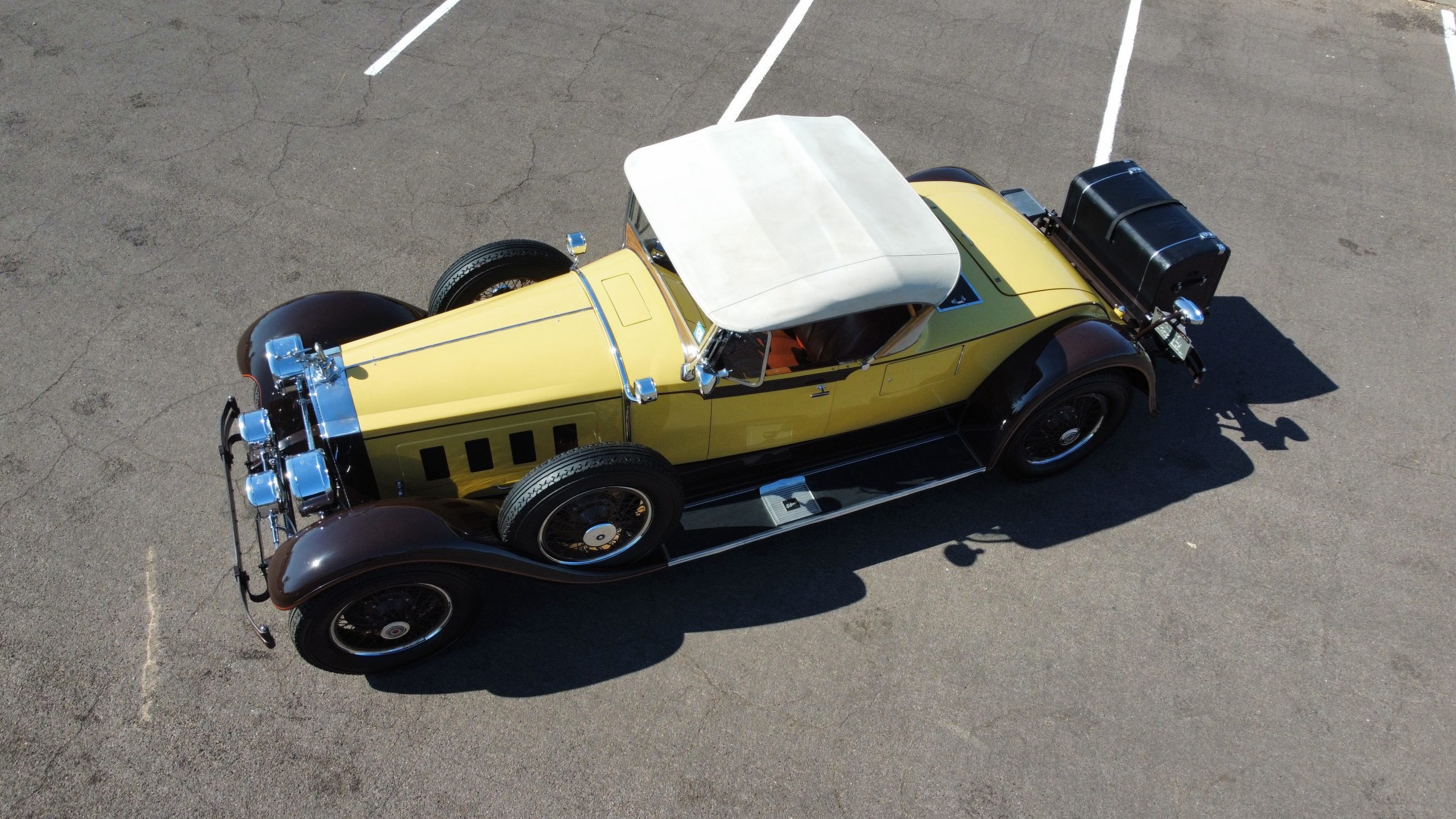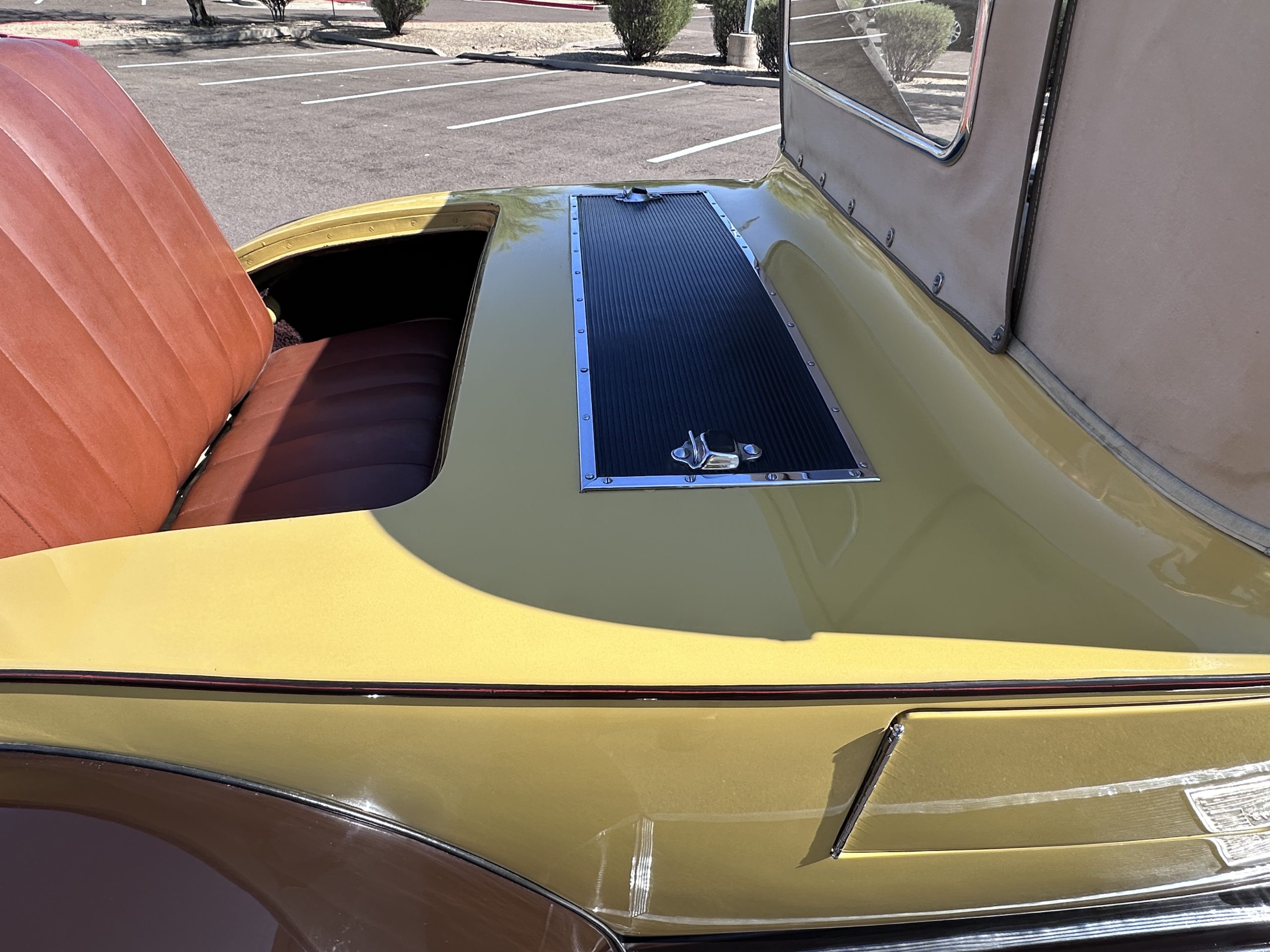 The body was refinished in its current combination of yellow with brown accents during the refurbishment performed in the early 1980s, and a paint correction was performed in 2024. Features include C.M. Hall headlights, dual swiveling Pilot Ray driving lights, a bright radiator shell with a chrome radiator stone guard, a Goddess of Speed radiator mascot, a Boyce MotoMeter, quadruple vents on each side of a centrally hinged hood, cowl lamps, a driver-side spot lamp, a tilt-out windshield with wind wings, a fold-down rear luggage rack, and a beige convertible top.