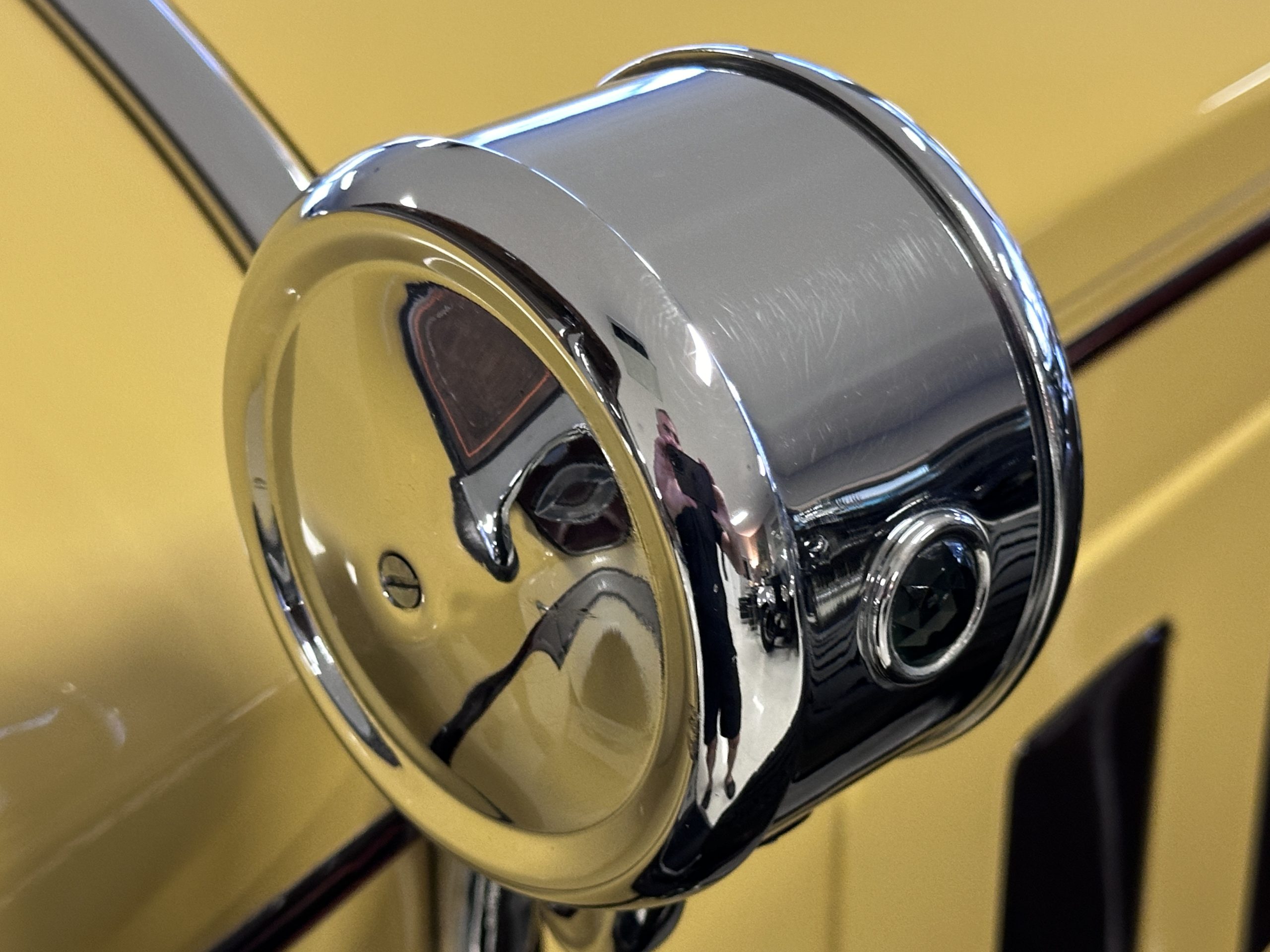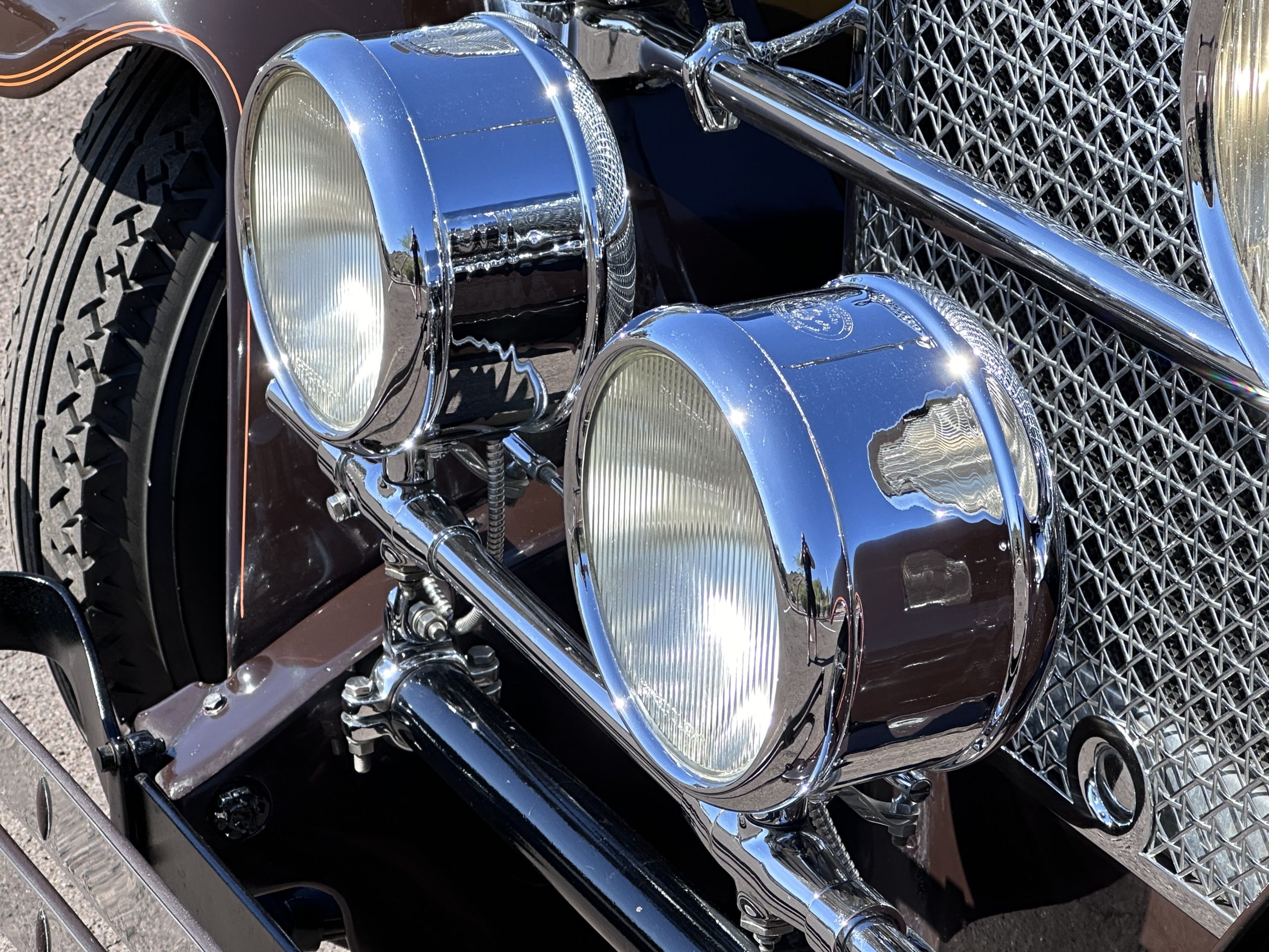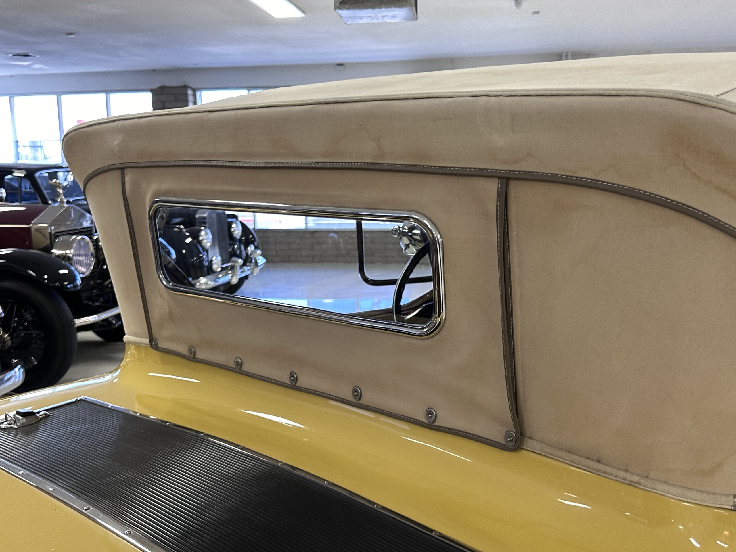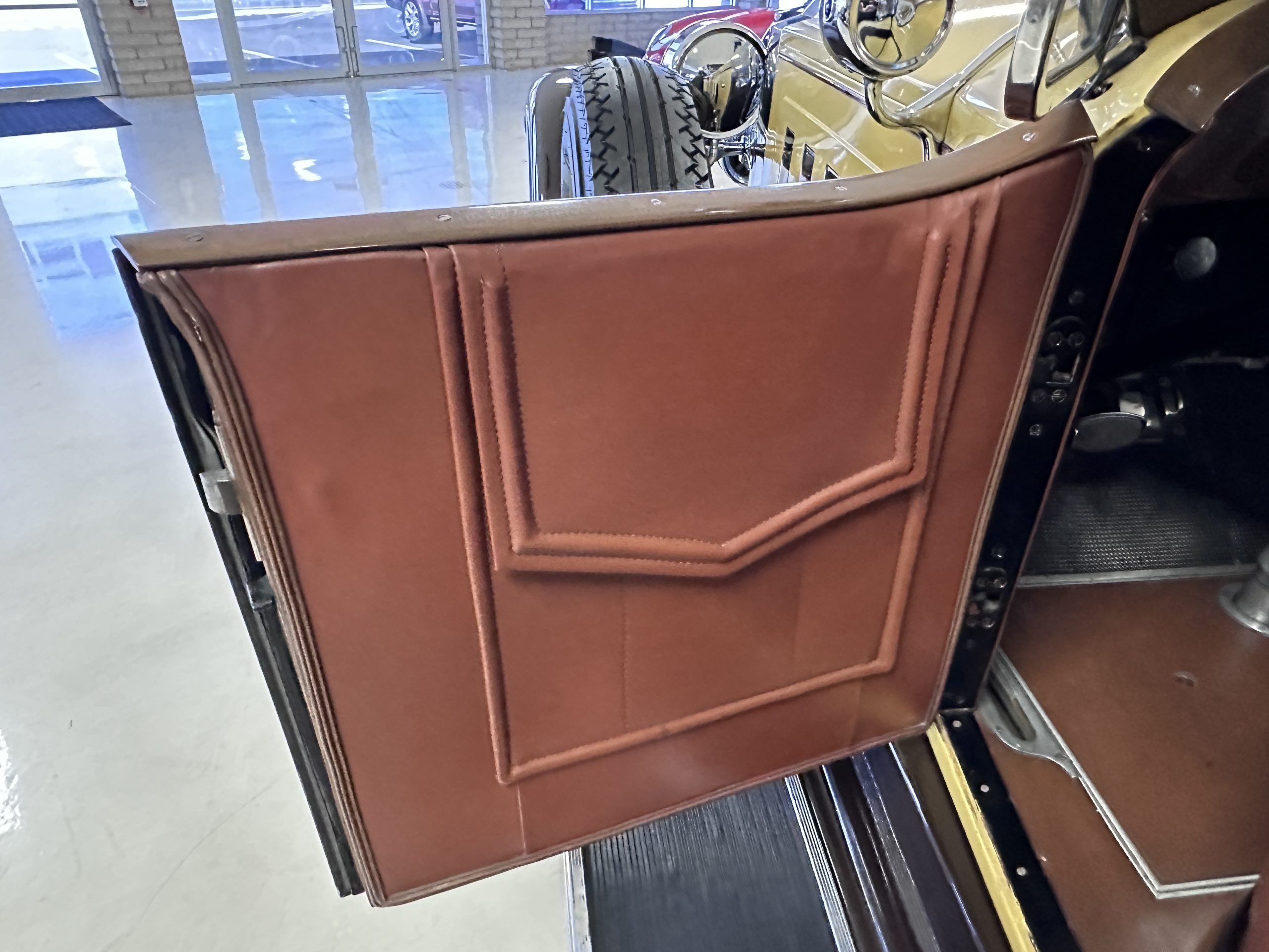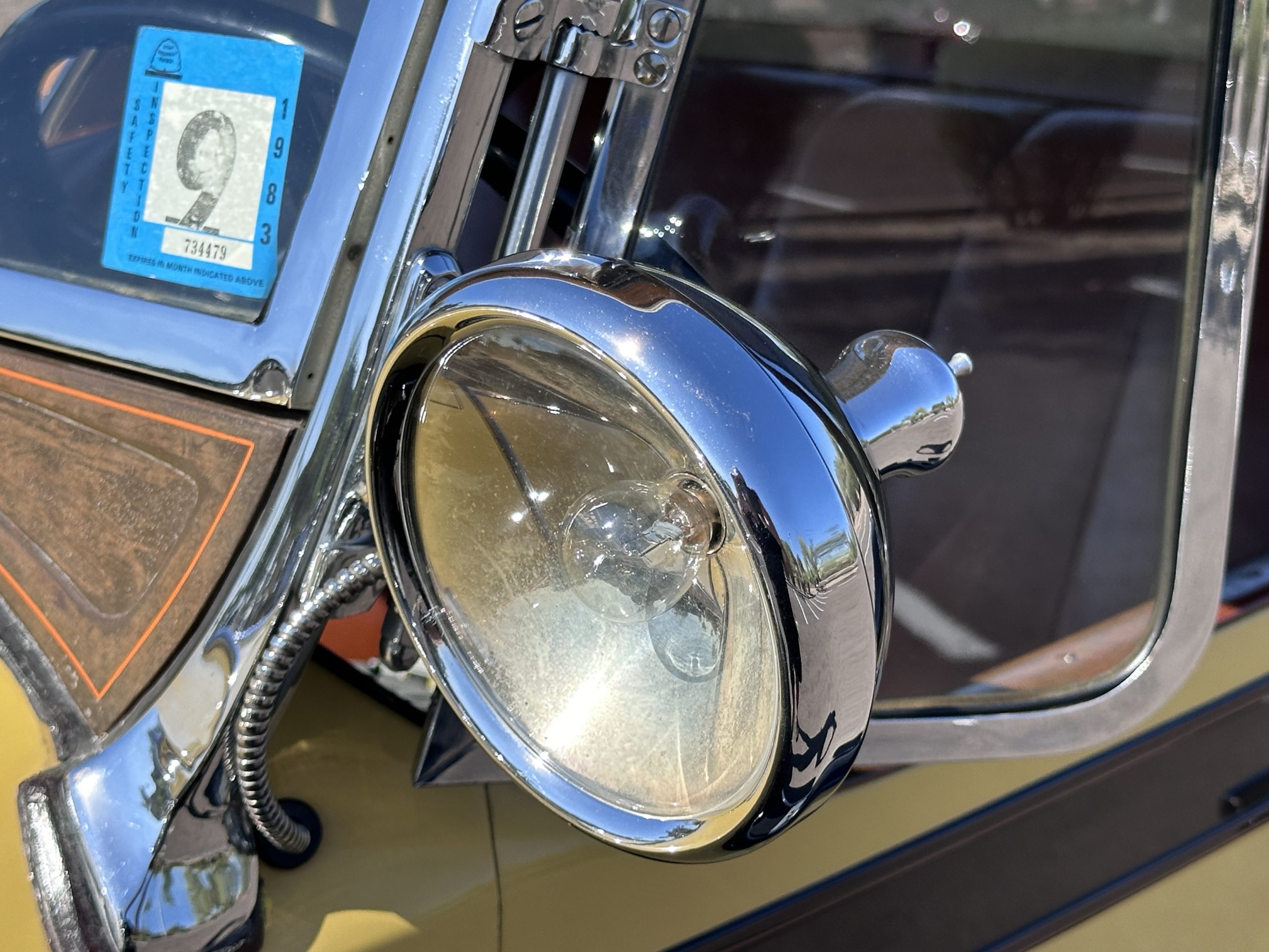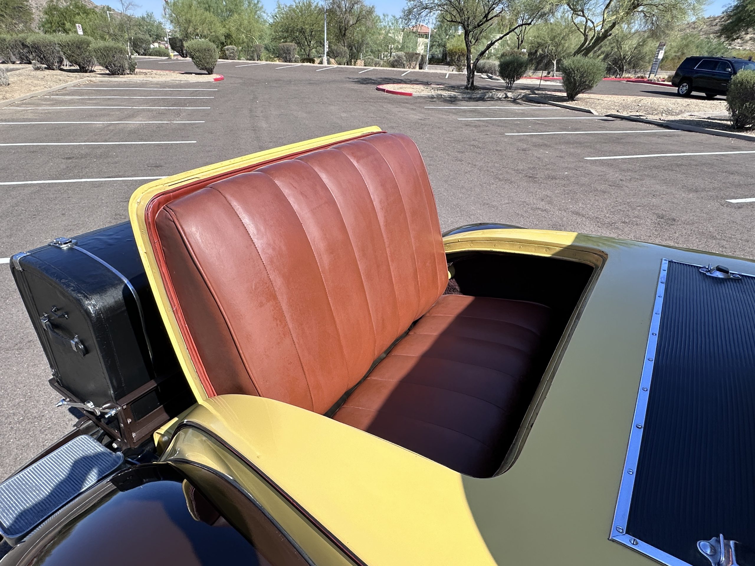 The body was refinished in its current combination of yellow with brown accents during the refurbishment performed in the early 1980s, and a paint correction was performed in 2024. Features include C.M. Hall headlights, dual swiveling Pilot Ray driving lights, a bright radiator shell with a chrome radiator stone guard, a Goddess of Speed radiator mascot, a Boyce MotoMeter, quadruple vents on each side of a centrally hinged hood, cowl lamps, a driver-side spot lamp, a tilt-out windshield with wind wings, a fold-down rear luggage rack, and a beige convertible top.