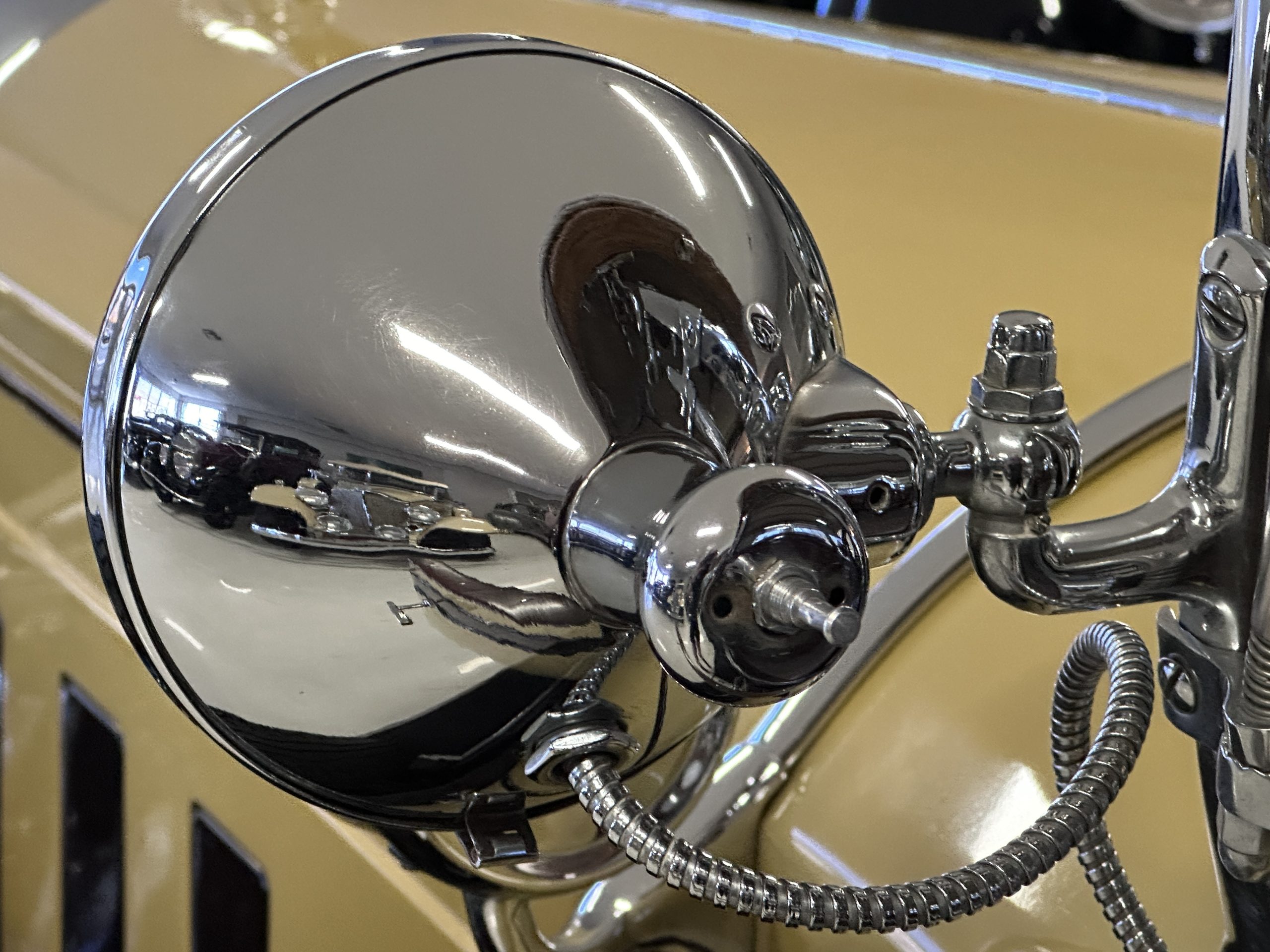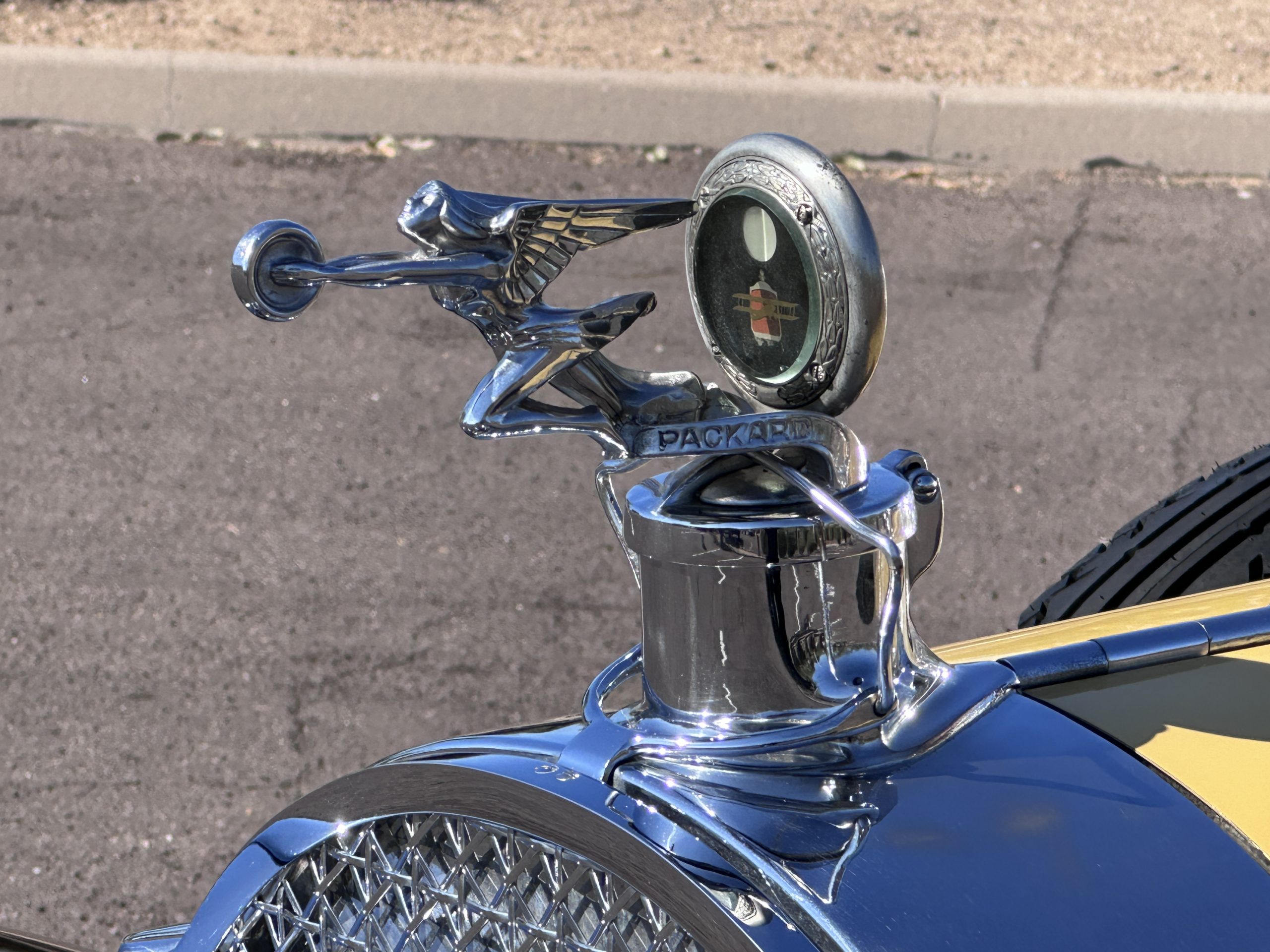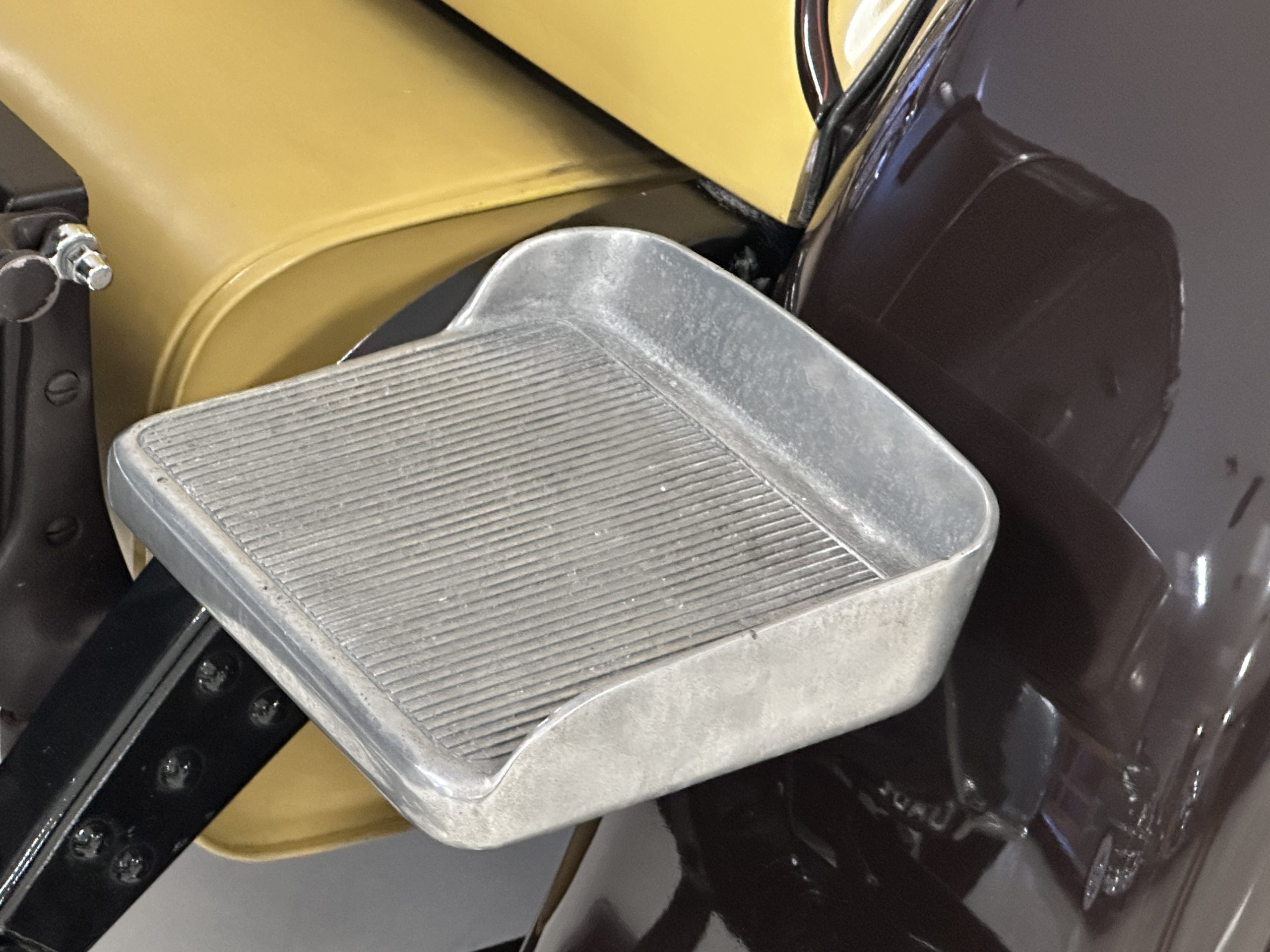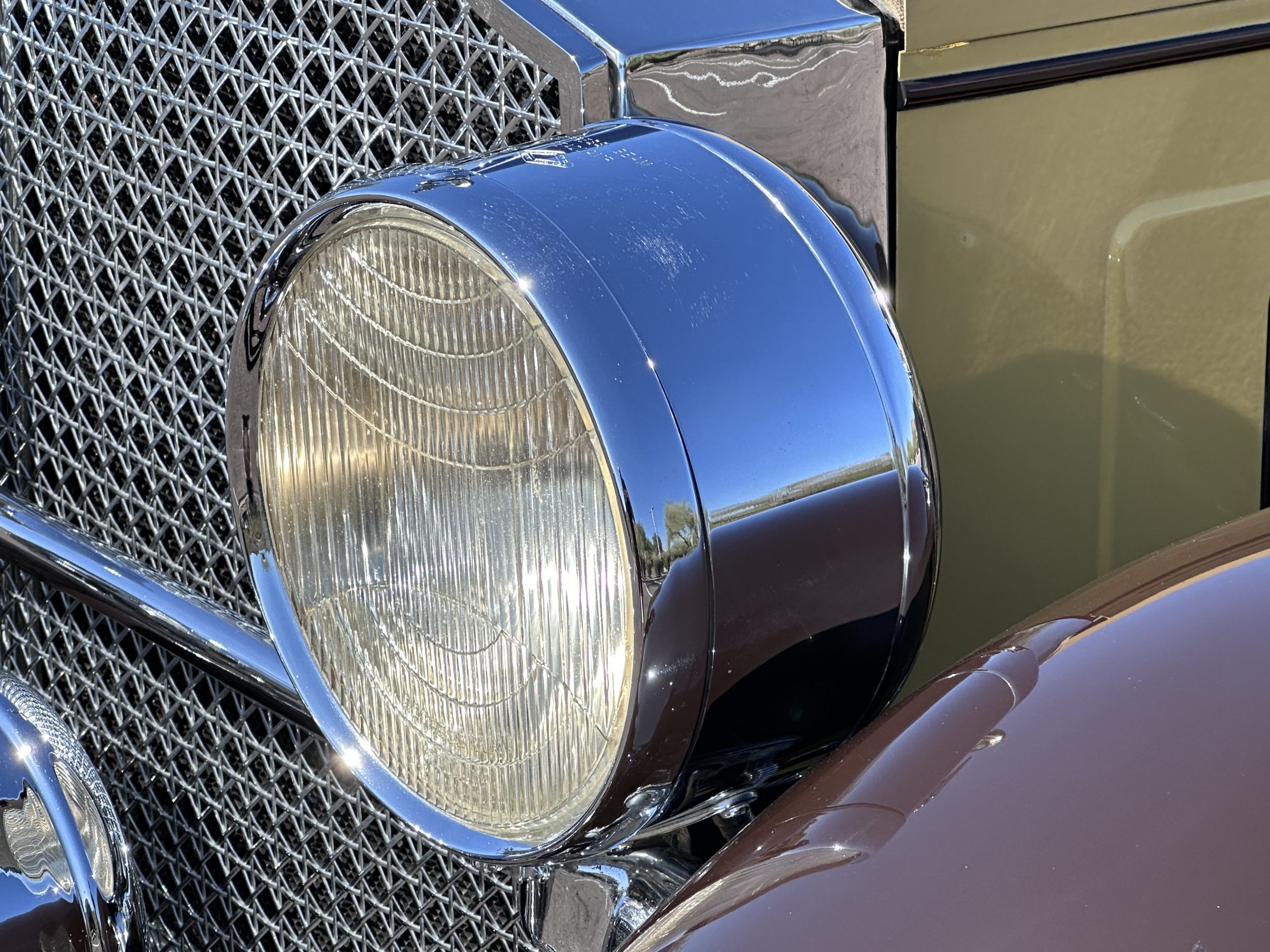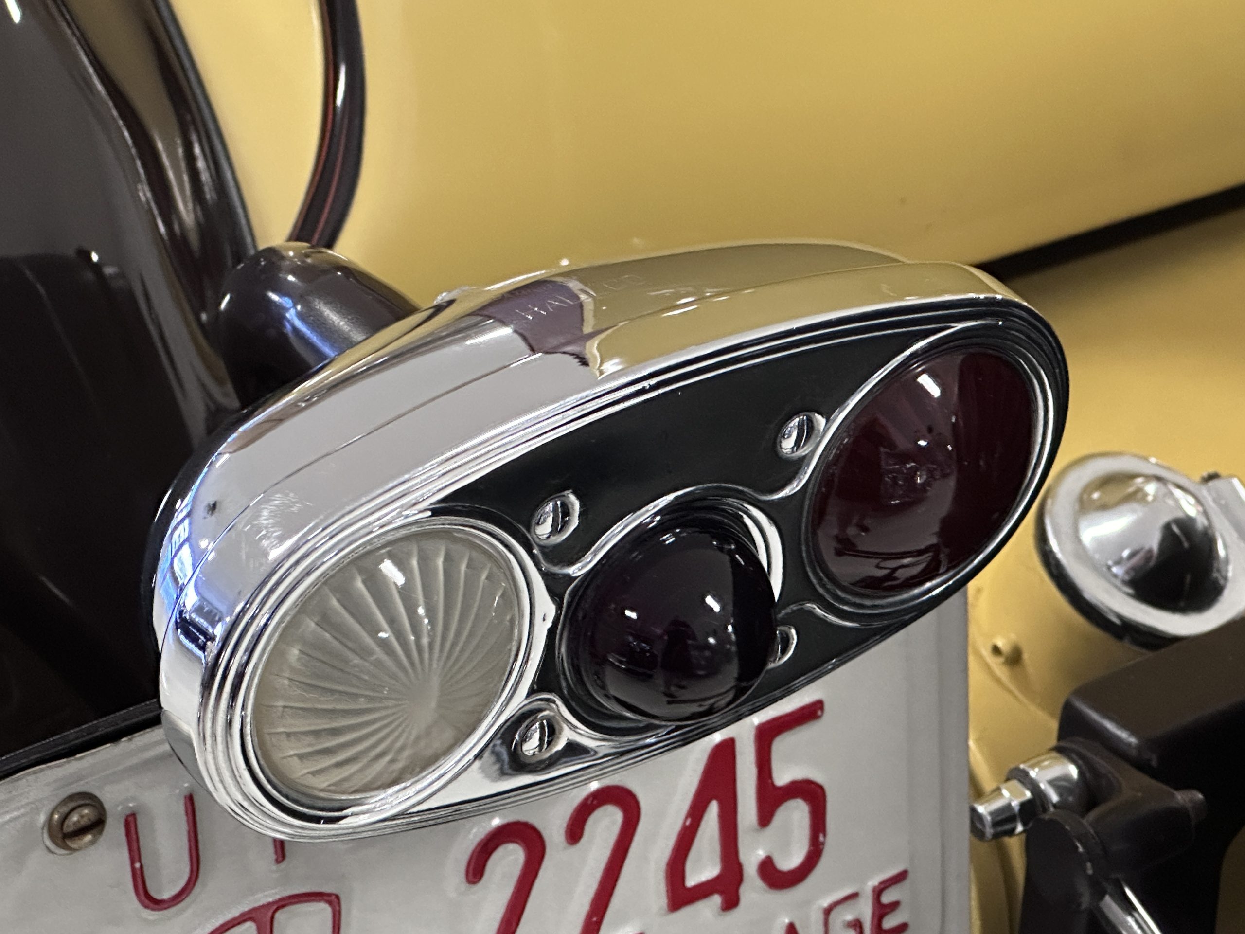 The body was refinished in its current combination of yellow with brown accents during the refurbishment performed in the early 1980s, and a paint correction was performed in 2024. Features include C.M. Hall headlights, dual swiveling Pilot Ray driving lights, a bright radiator shell with a chrome radiator stone guard, a Goddess of Speed radiator mascot, a Boyce MotoMeter, quadruple vents on each side of a centrally hinged hood, cowl lamps, a driver-side spot lamp, a tilt-out windshield with wind wings, a fold-down rear luggage rack, and a beige convertible top.