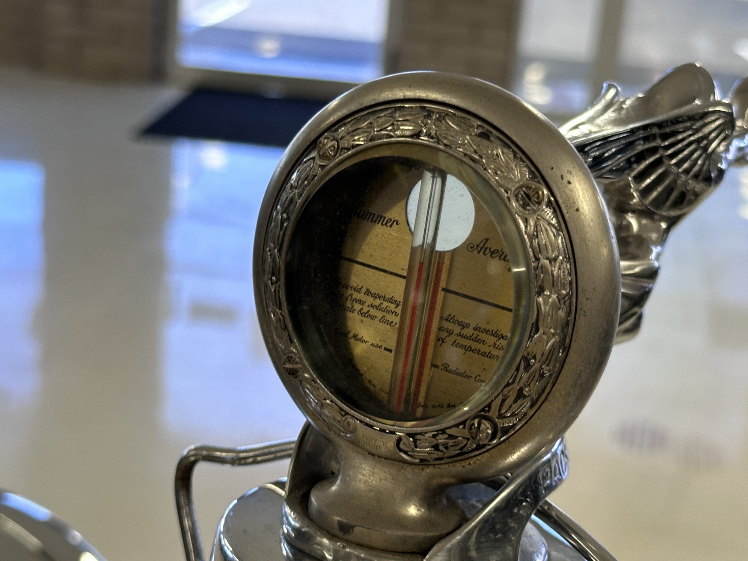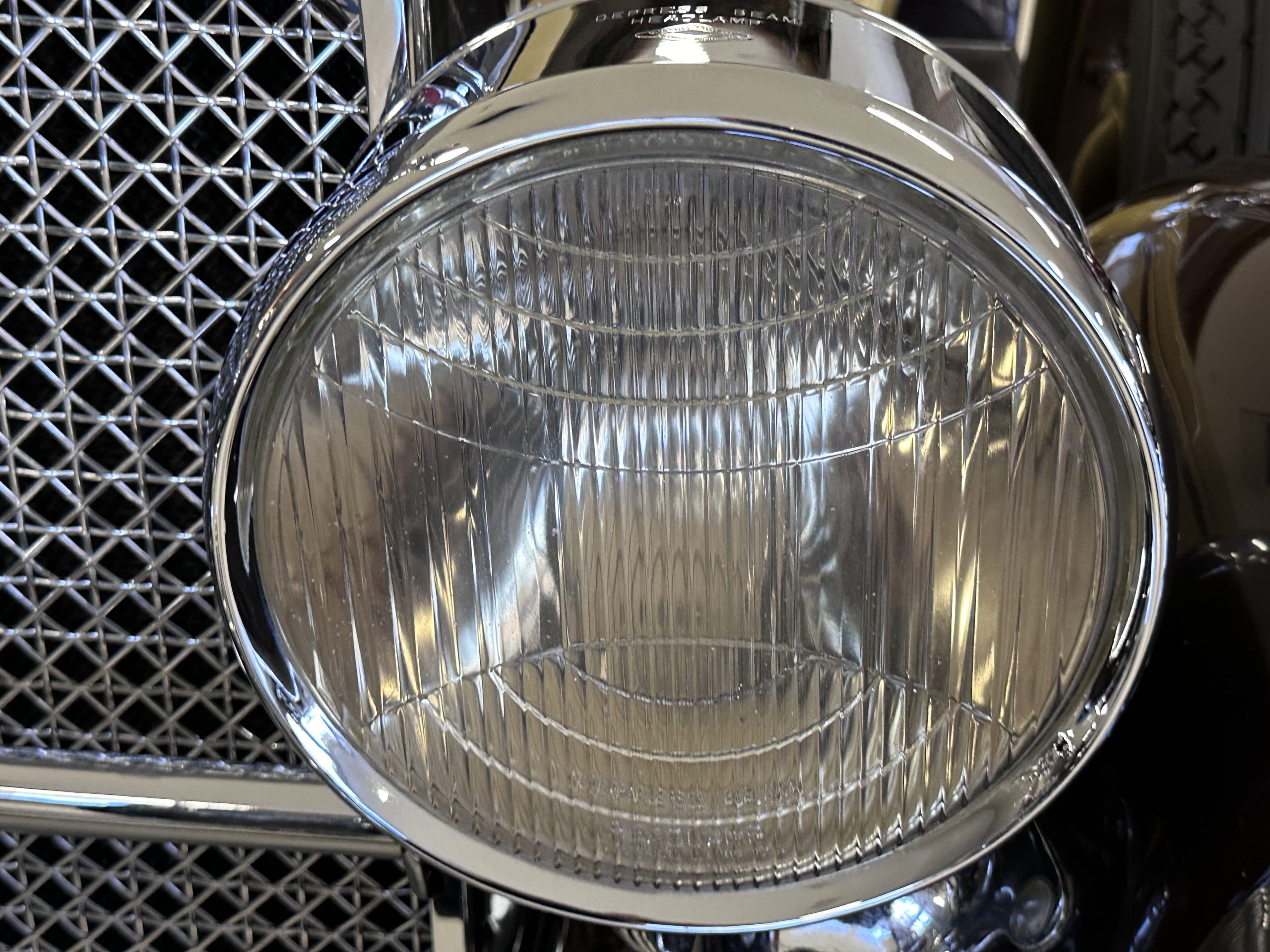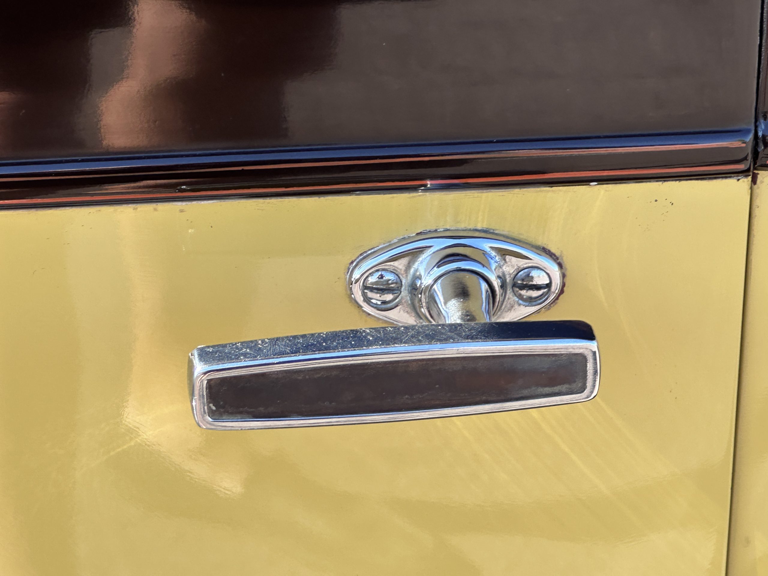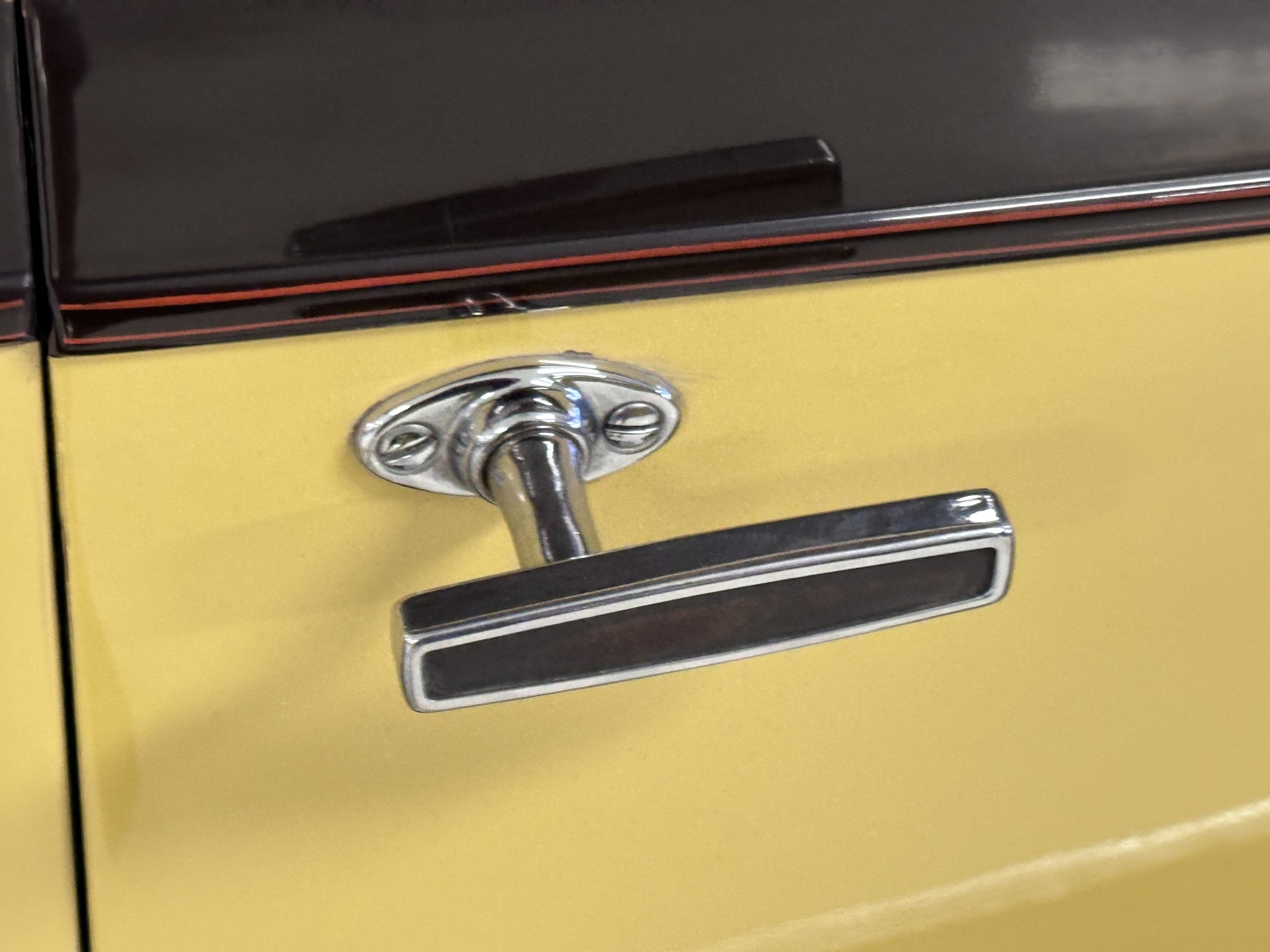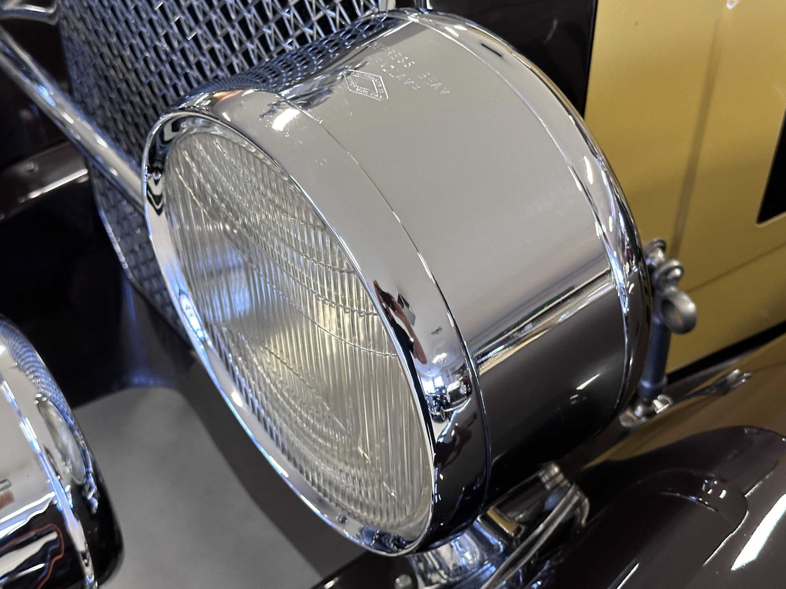 The body was refinished in its current combination of yellow with brown accents during the refurbishment performed in the early 1980s, and a paint correction was performed in 2024. Features include C.M. Hall headlights, dual swiveling Pilot Ray driving lights, a bright radiator shell with a chrome radiator stone guard, a Goddess of Speed radiator mascot, a Boyce MotoMeter, quadruple vents on each side of a centrally hinged hood, cowl lamps, a driver-side spot lamp, a tilt-out windshield with wind wings, a fold-down rear luggage rack, and a beige convertible top.