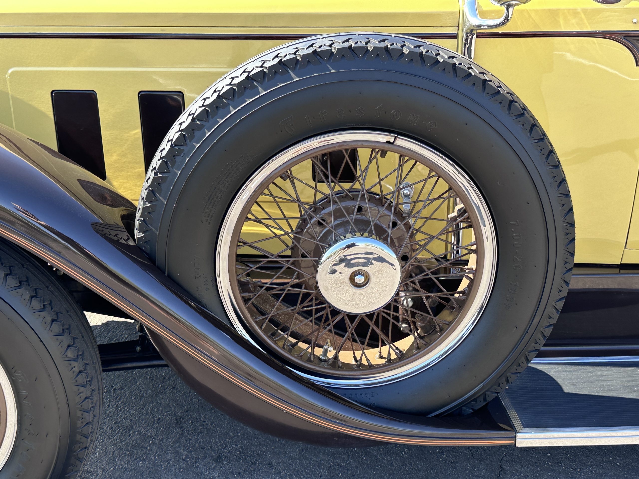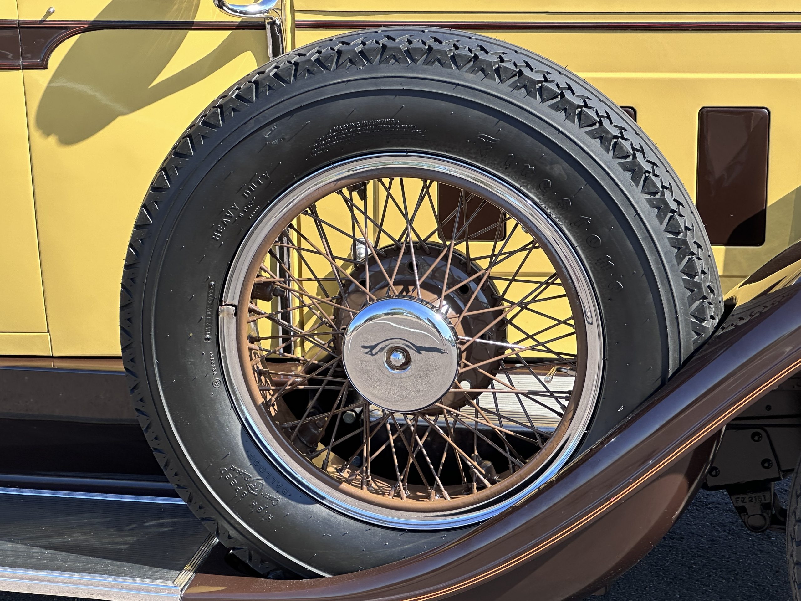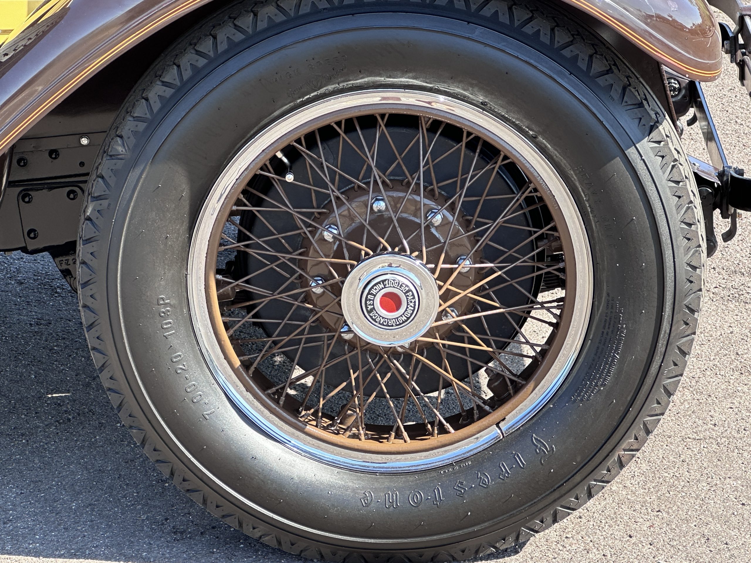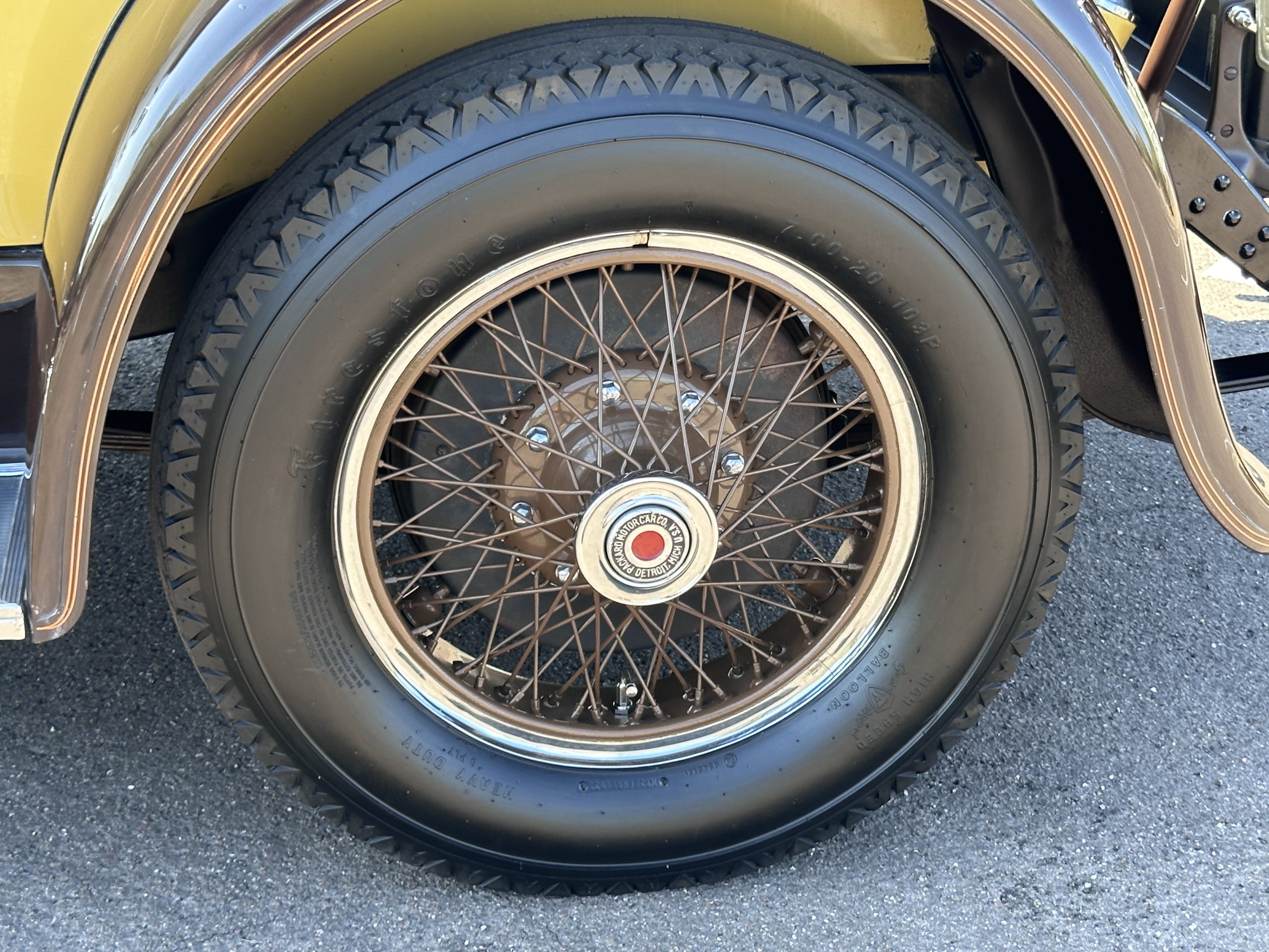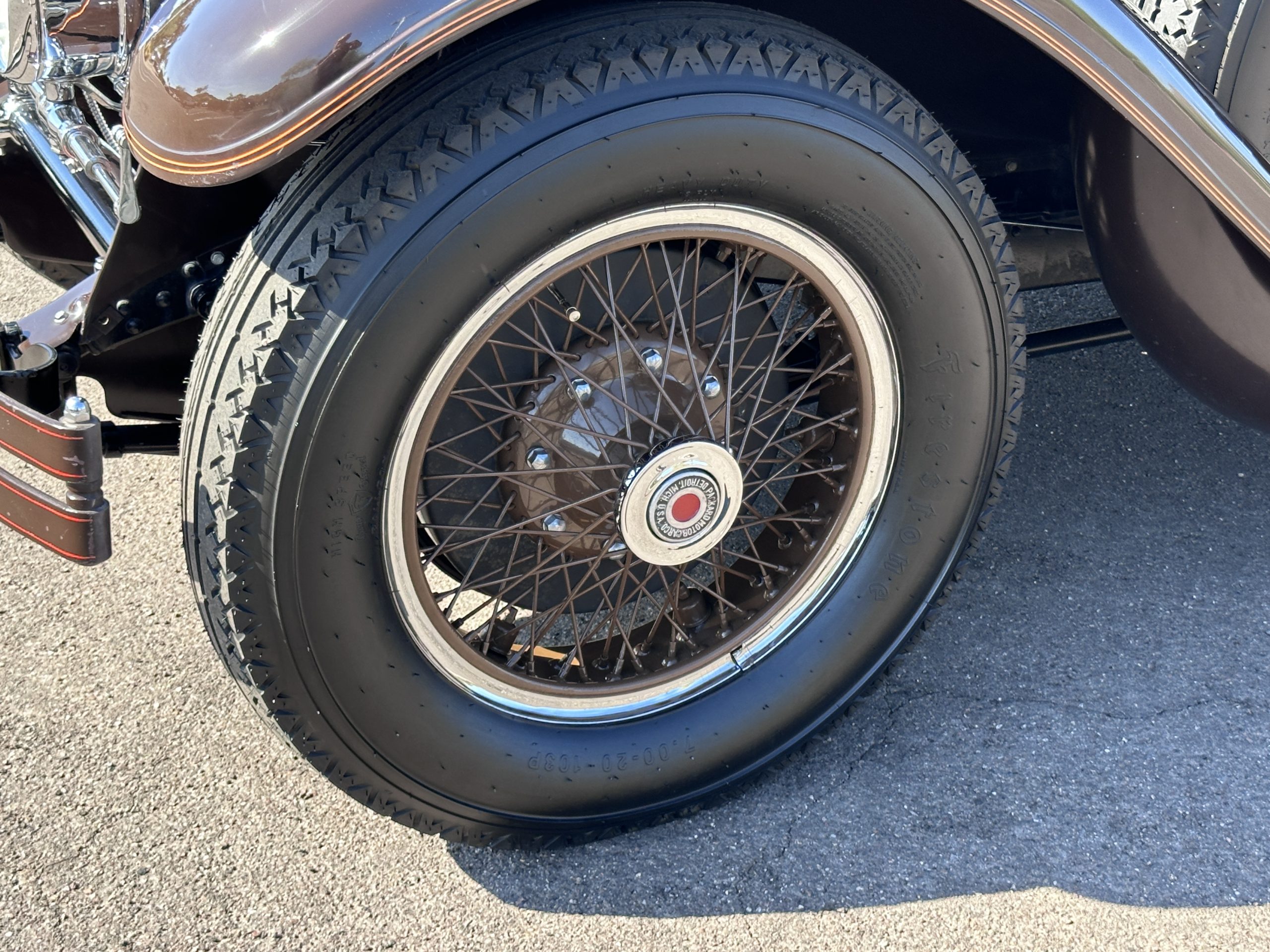 The six wire wheels, including dual side-mount spares, were powder-coated in brown during the 2024 freshening, at which time 7.00-20 Firestone tires were mounted along with replacement tubes and flaps. Stopping is handled via mechanically actuated internally expanding drum brakes at each wheel, with emergency brakes available to act independently on the rear wheels. The wheel bearings were replaced in 2024.
