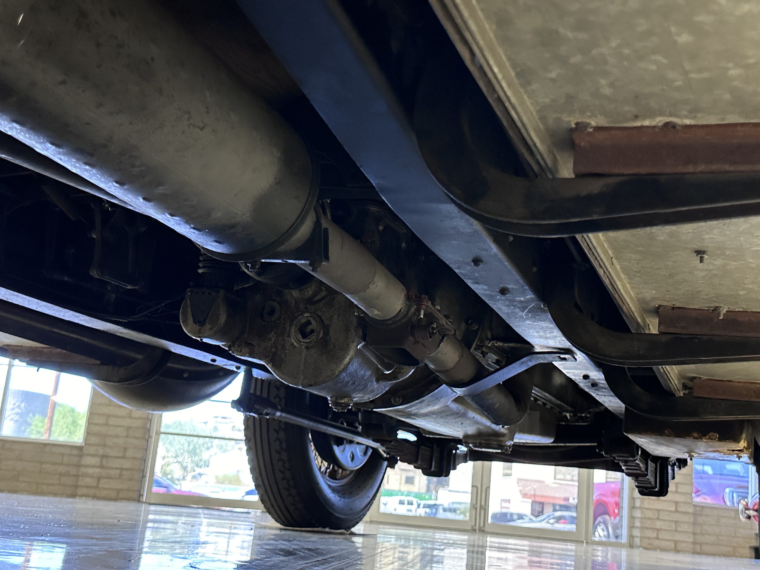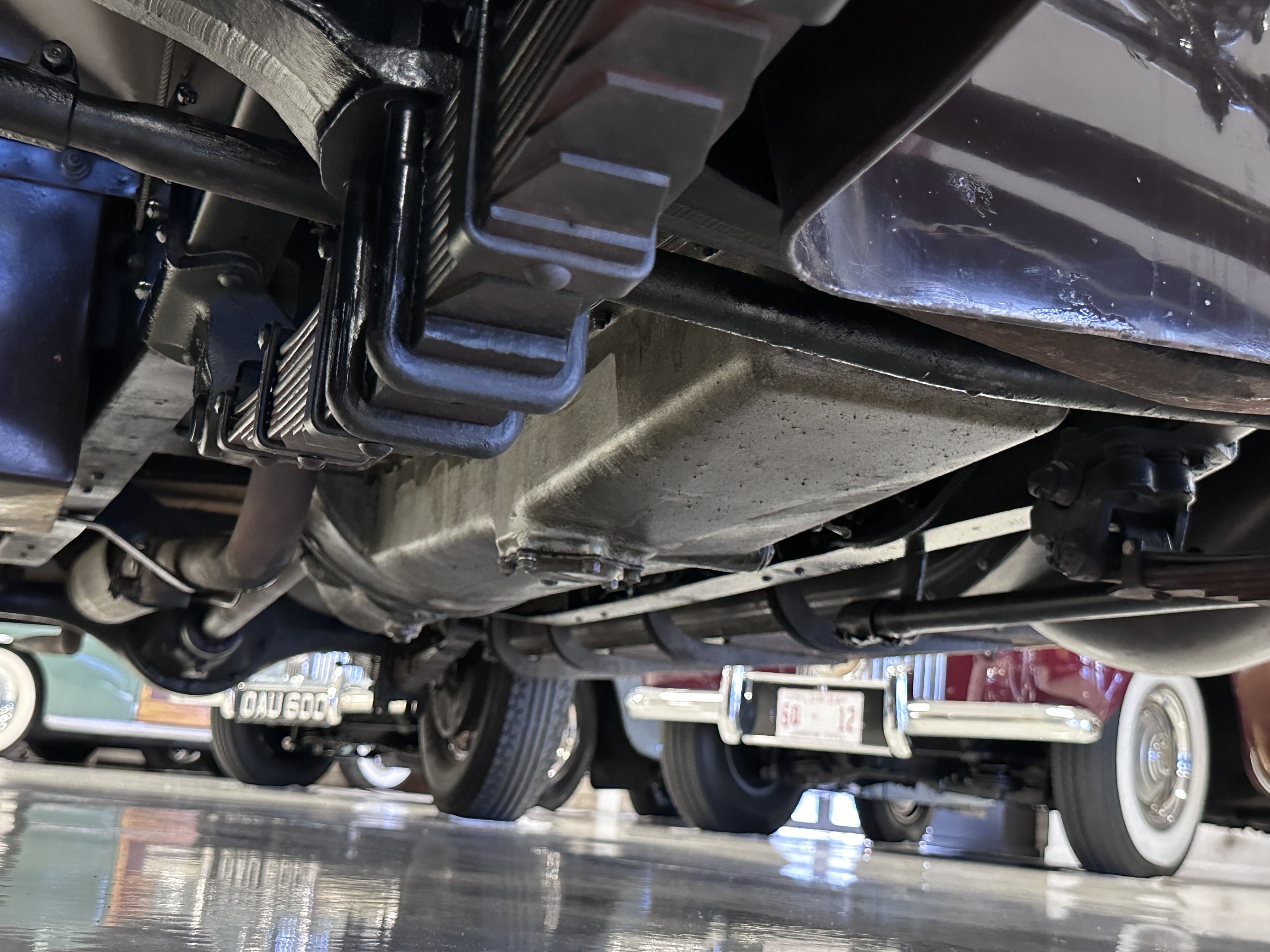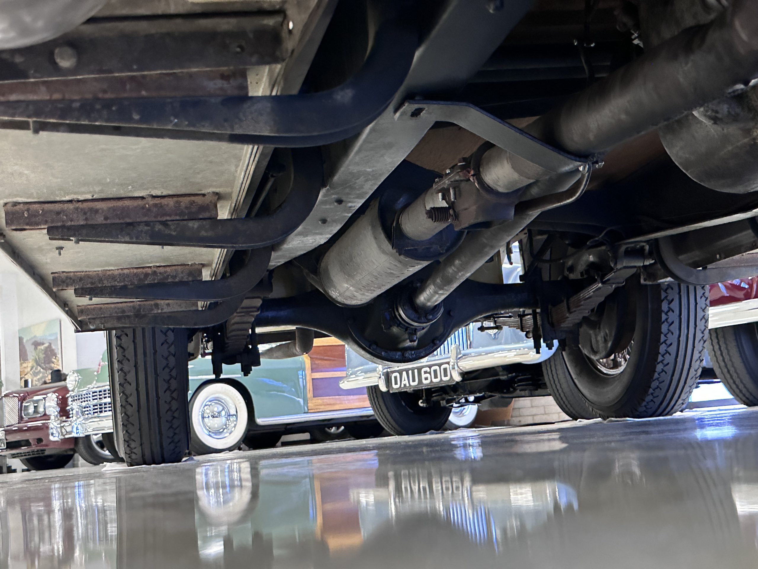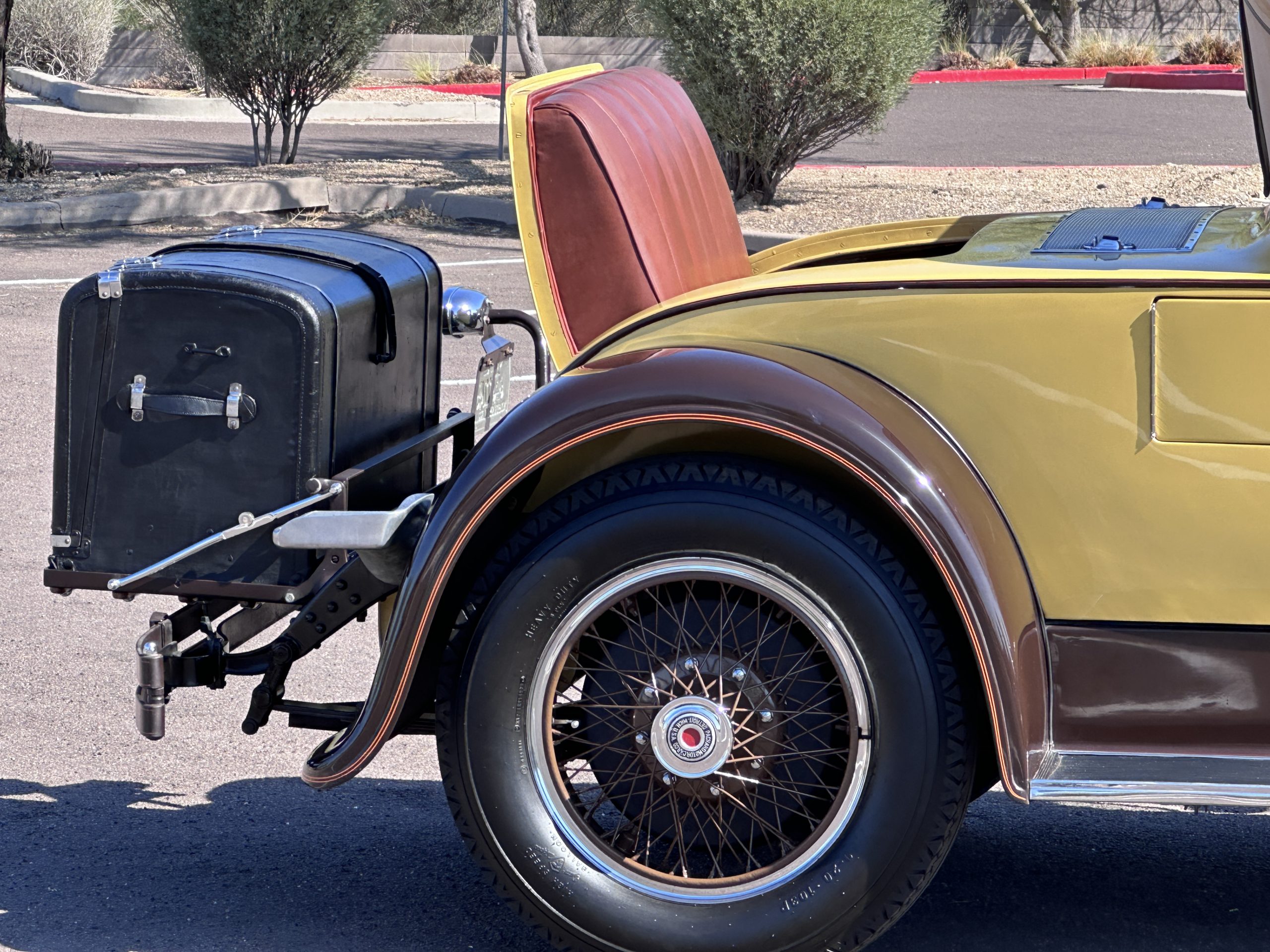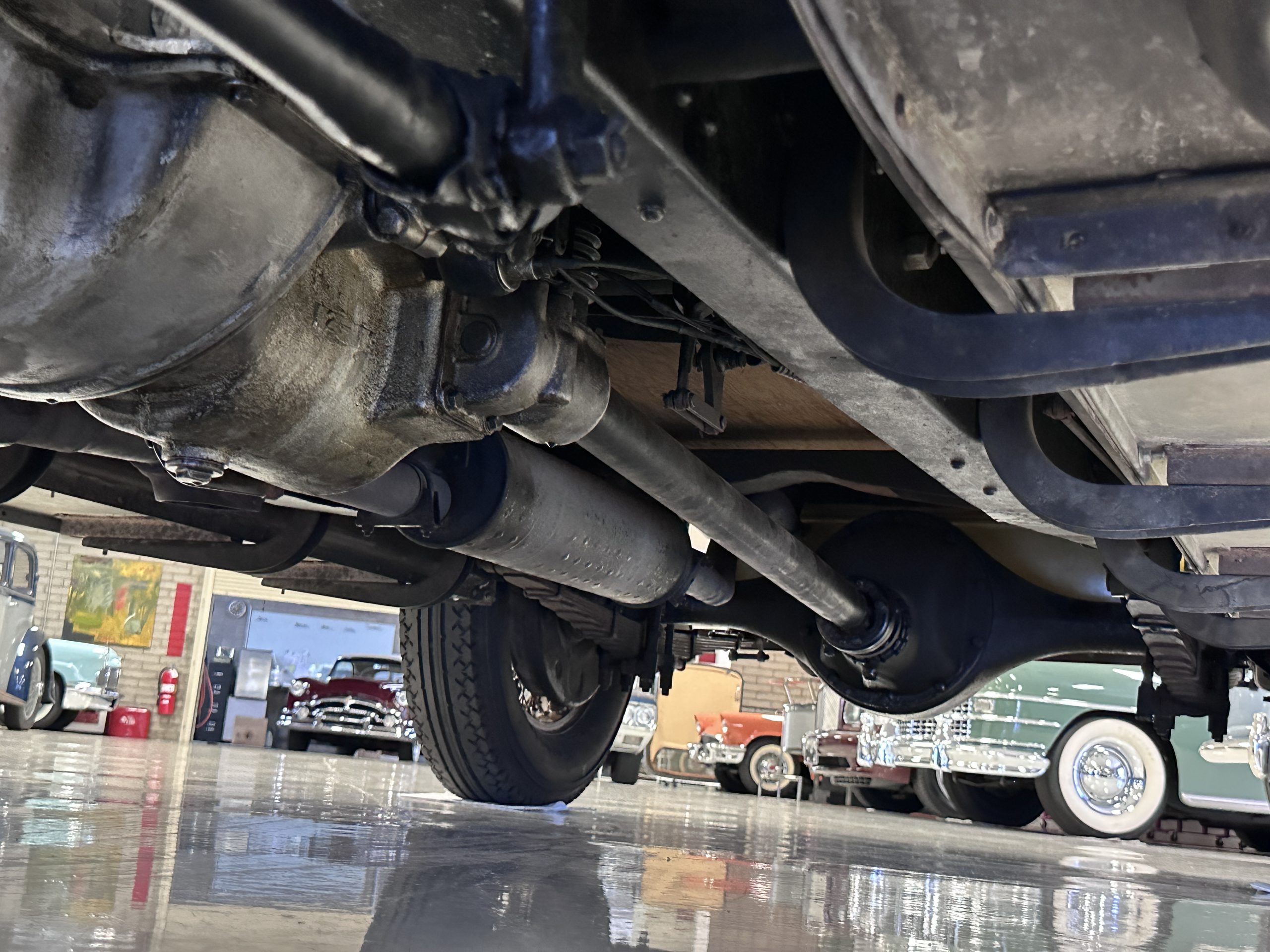 The six wire wheels, including dual side-mount spares, were powder-coated in brown during the 2024 freshening, at which time 7.00-20 Firestone tires were mounted along with replacement tubes and flaps. Stopping is handled via mechanically actuated internally expanding drum brakes at each wheel, with emergency brakes available to act independently on the rear wheels. The wheel bearings were replaced in 2024.