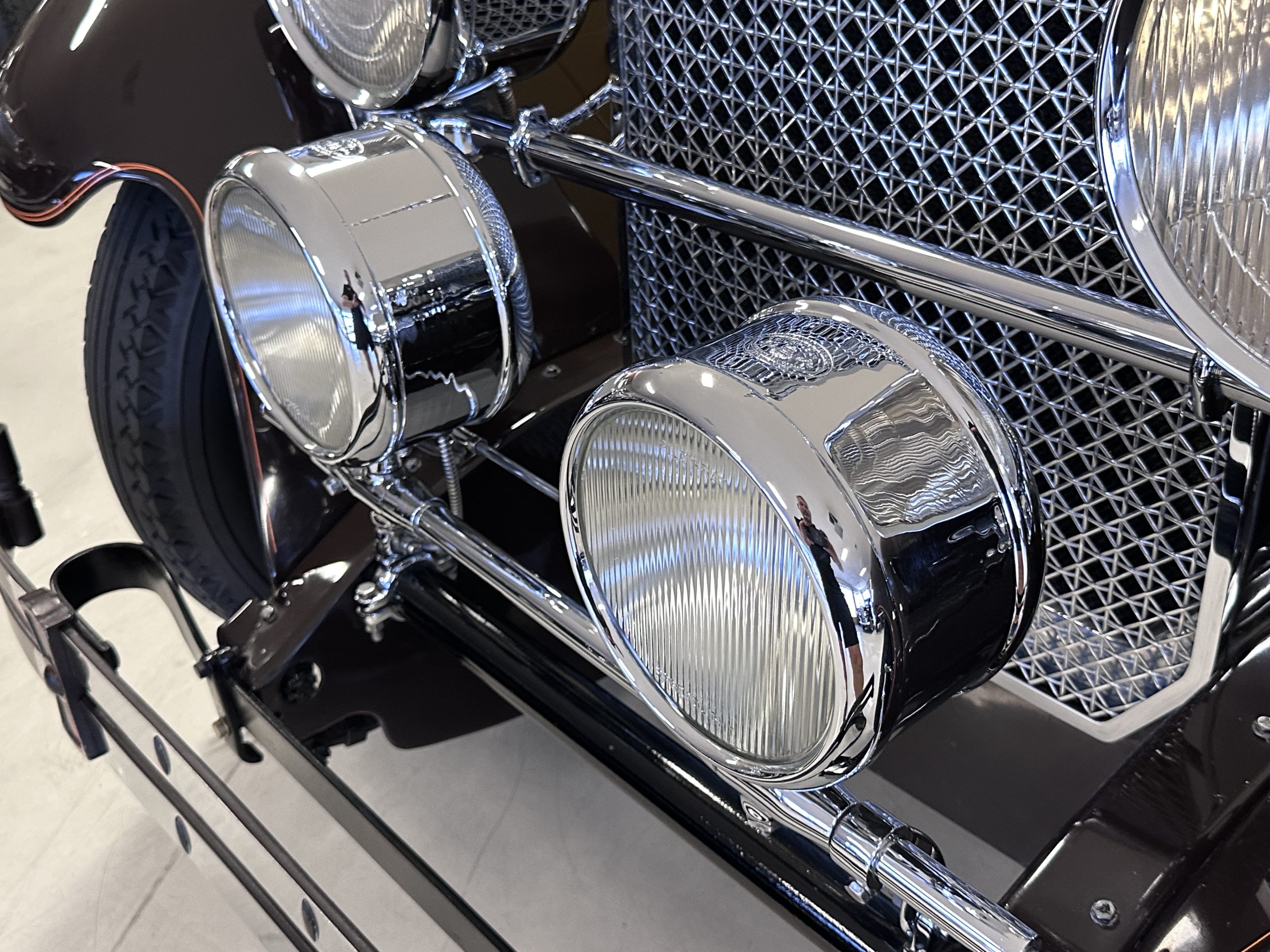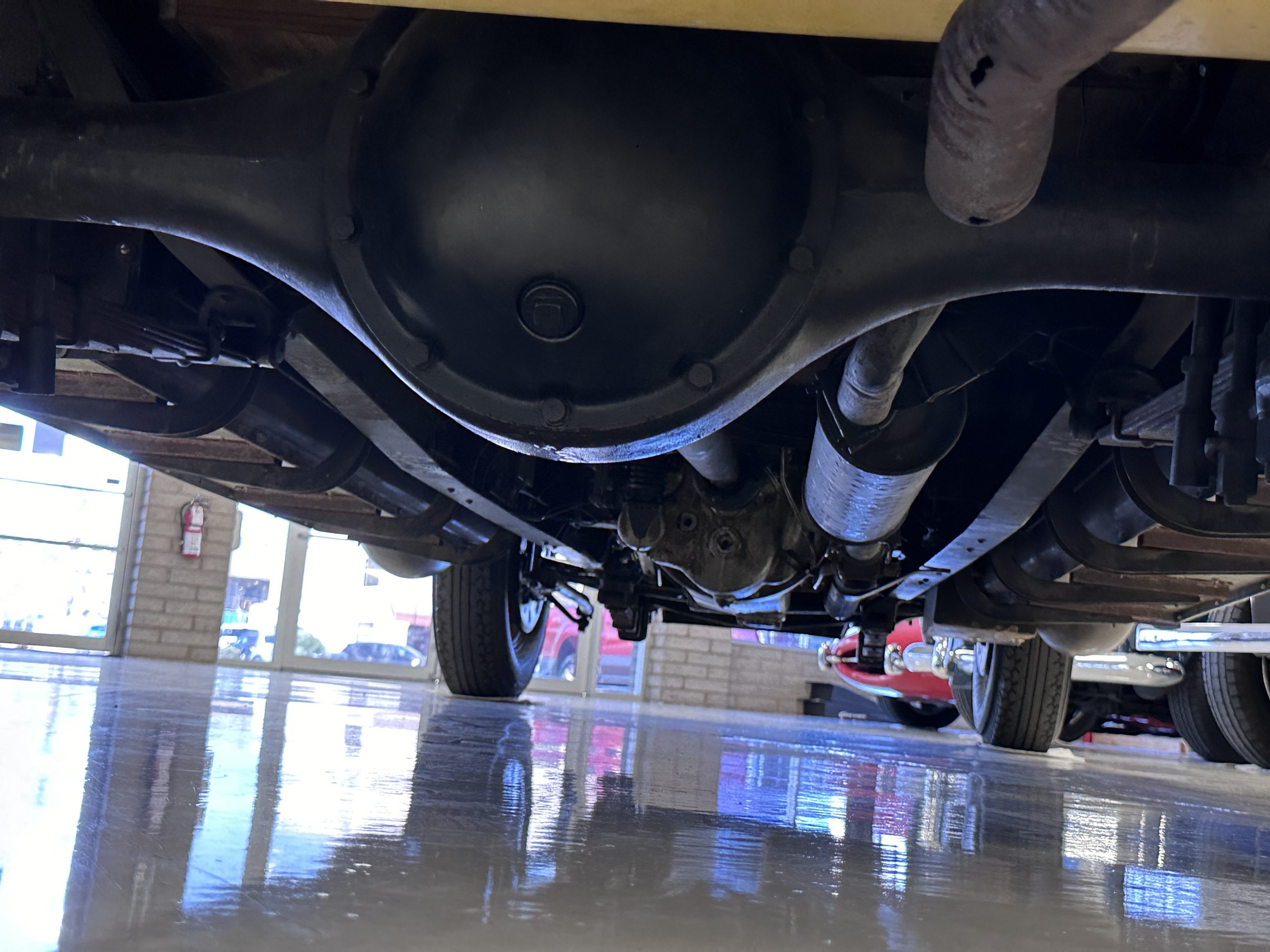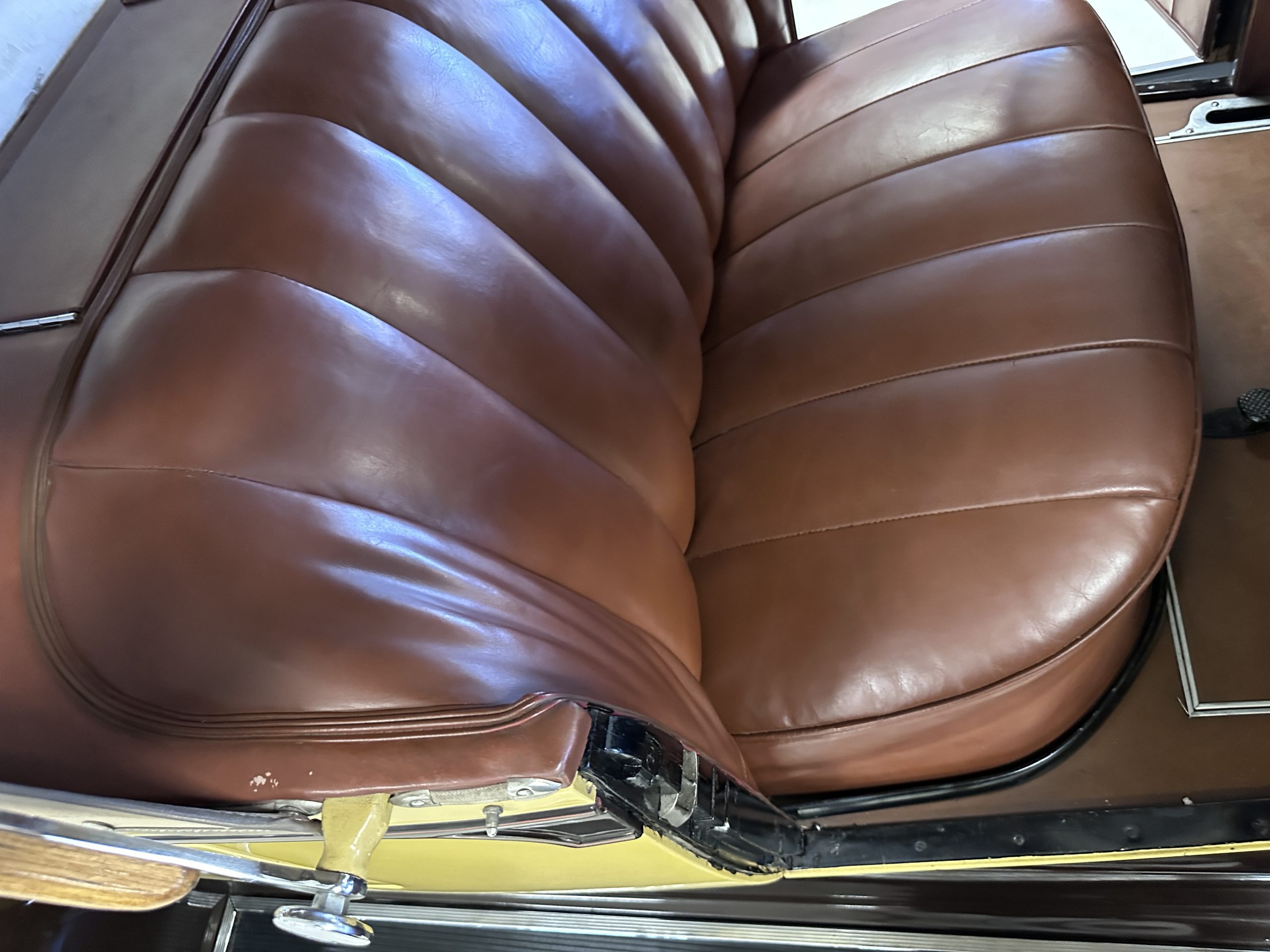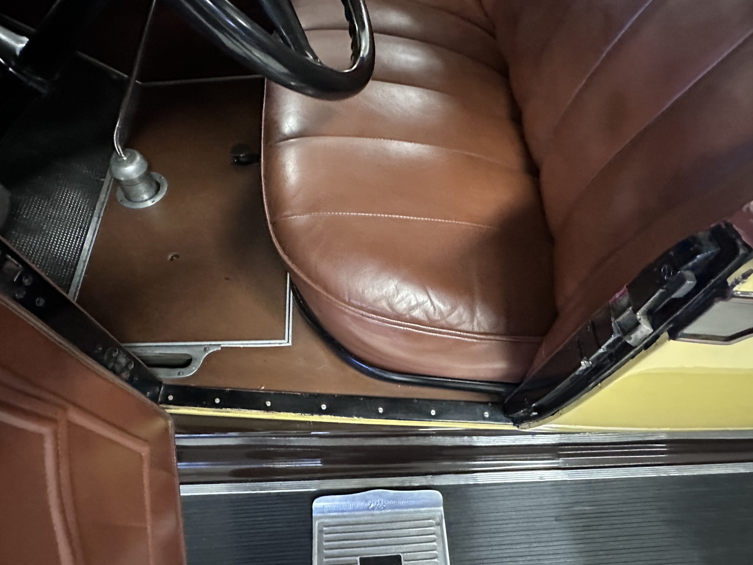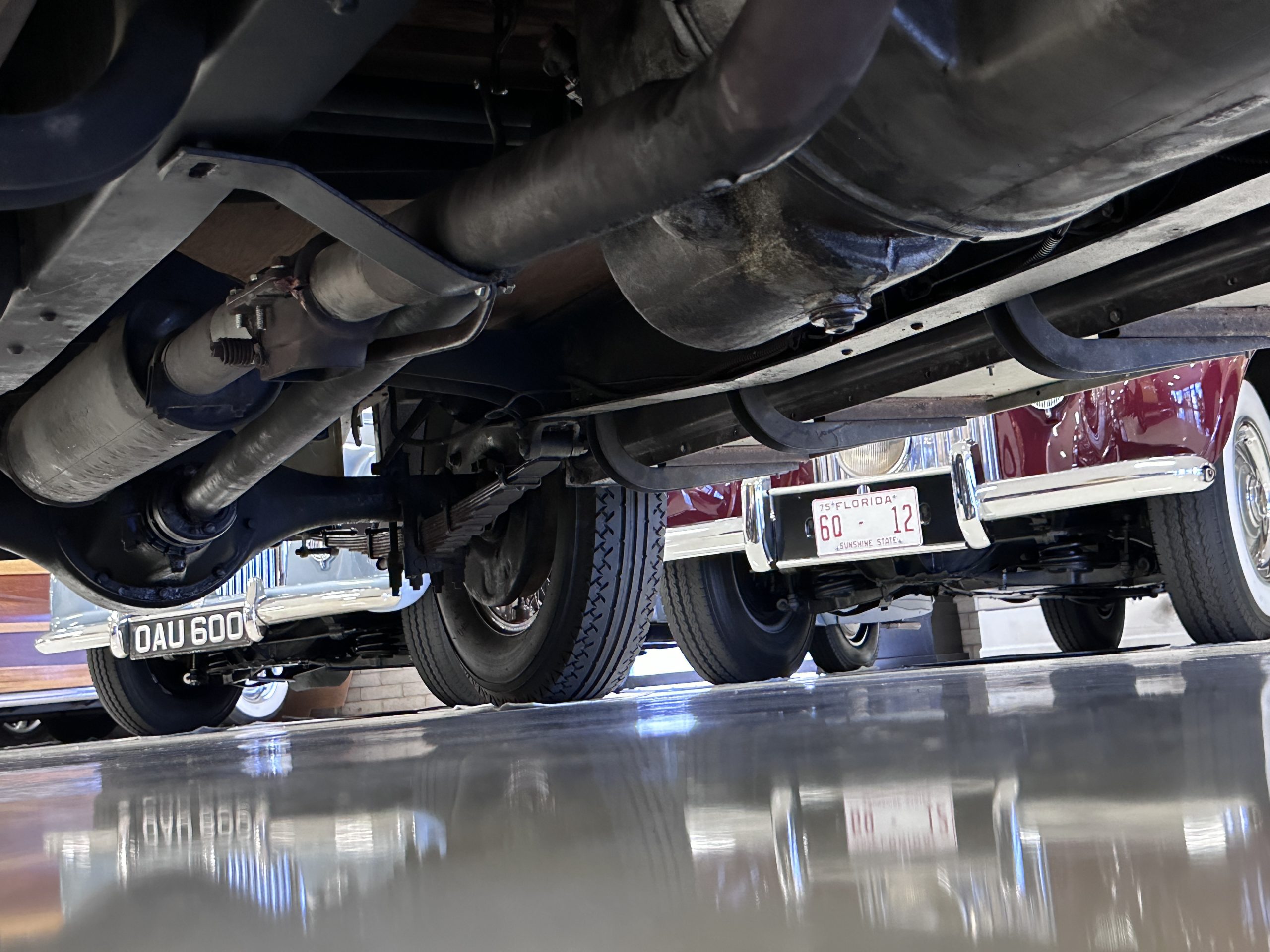 The six wire wheels, including dual side-mount spares, were powder-coated in brown during the 2024 freshening, at which time 7.00-20 Firestone tires were mounted along with replacement tubes and flaps. Stopping is handled via mechanically actuated internally expanding drum brakes at each wheel, with emergency brakes available to act independently on the rear wheels. The wheel bearings were replaced in 2024.