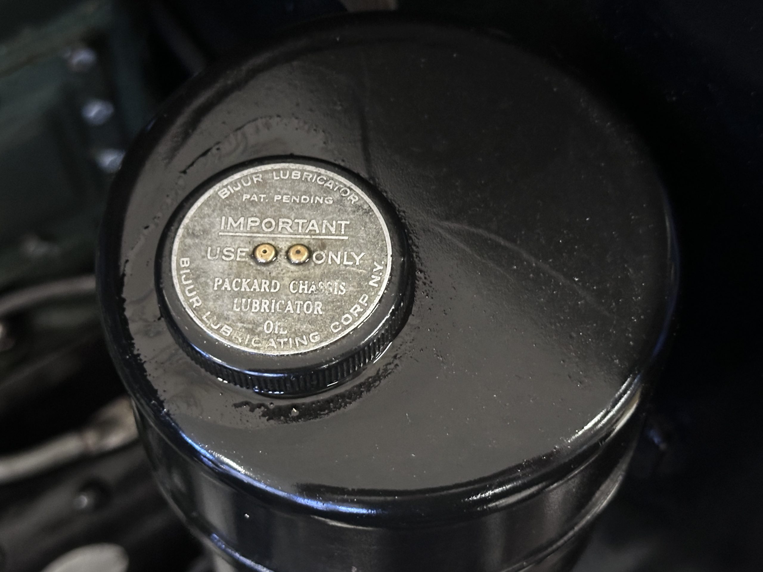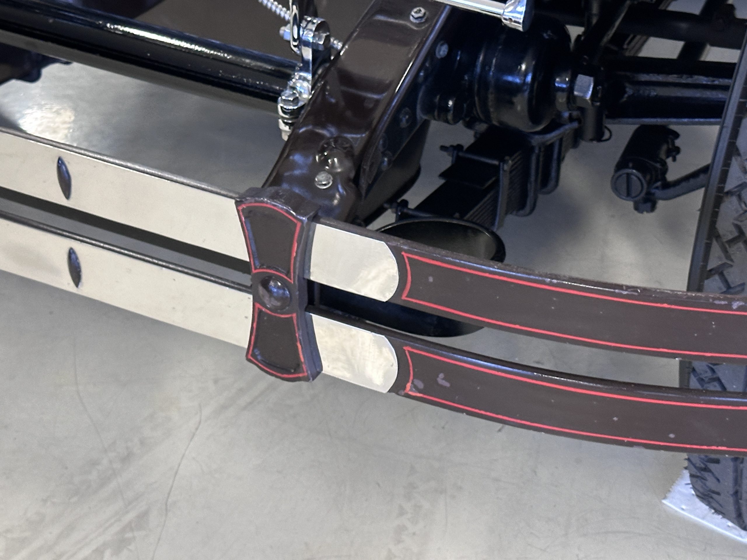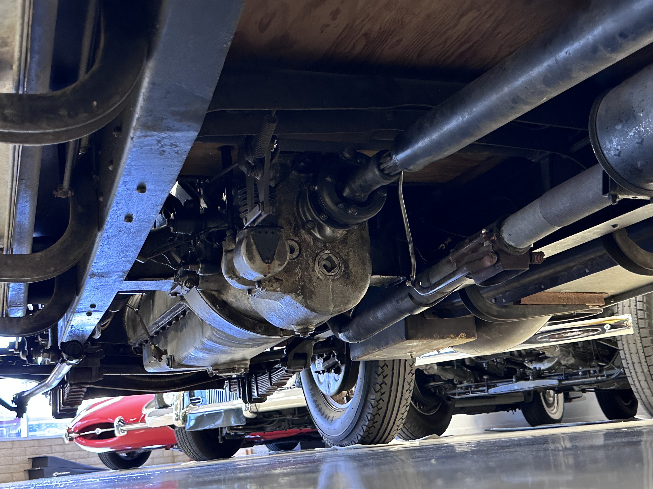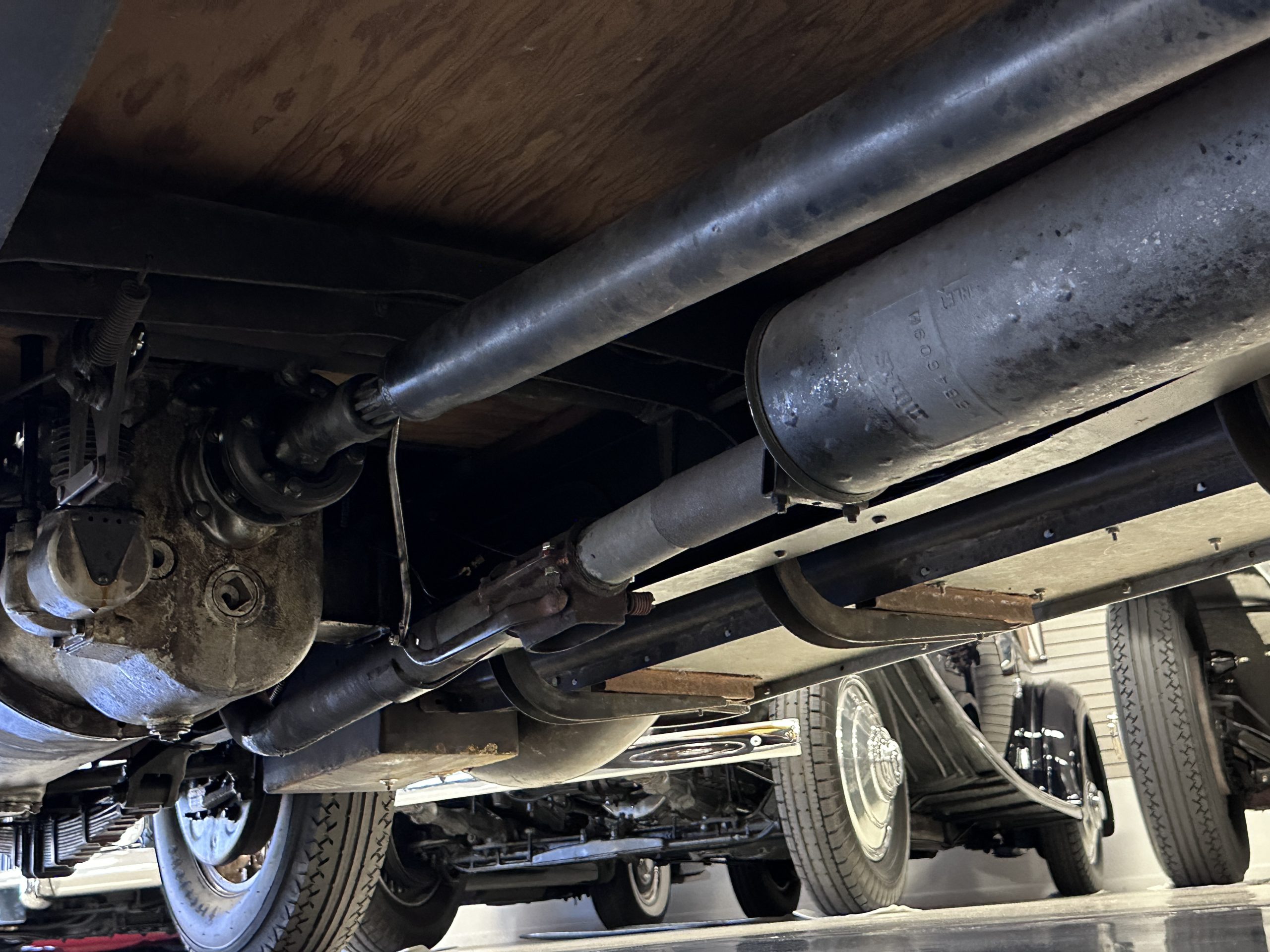 Power is sent to the rear wheels via a three-speed manual transmission, and service in 2024 included rebuilds of the clutch discs and pressure plate and replacement of the throwout bearing as well as fluid changes for the gearbox and differential. Suspension incorporates solid axles, semi-elliptical leaf springs, and hydraulic lever-arm shock absorbers at each end, while steering is via worm and sector. The Bijur central lubrication system was repaired and adjusted in 2024. The car is equipped with an exhaust cut-out that is operated via a switch on the floorboards.