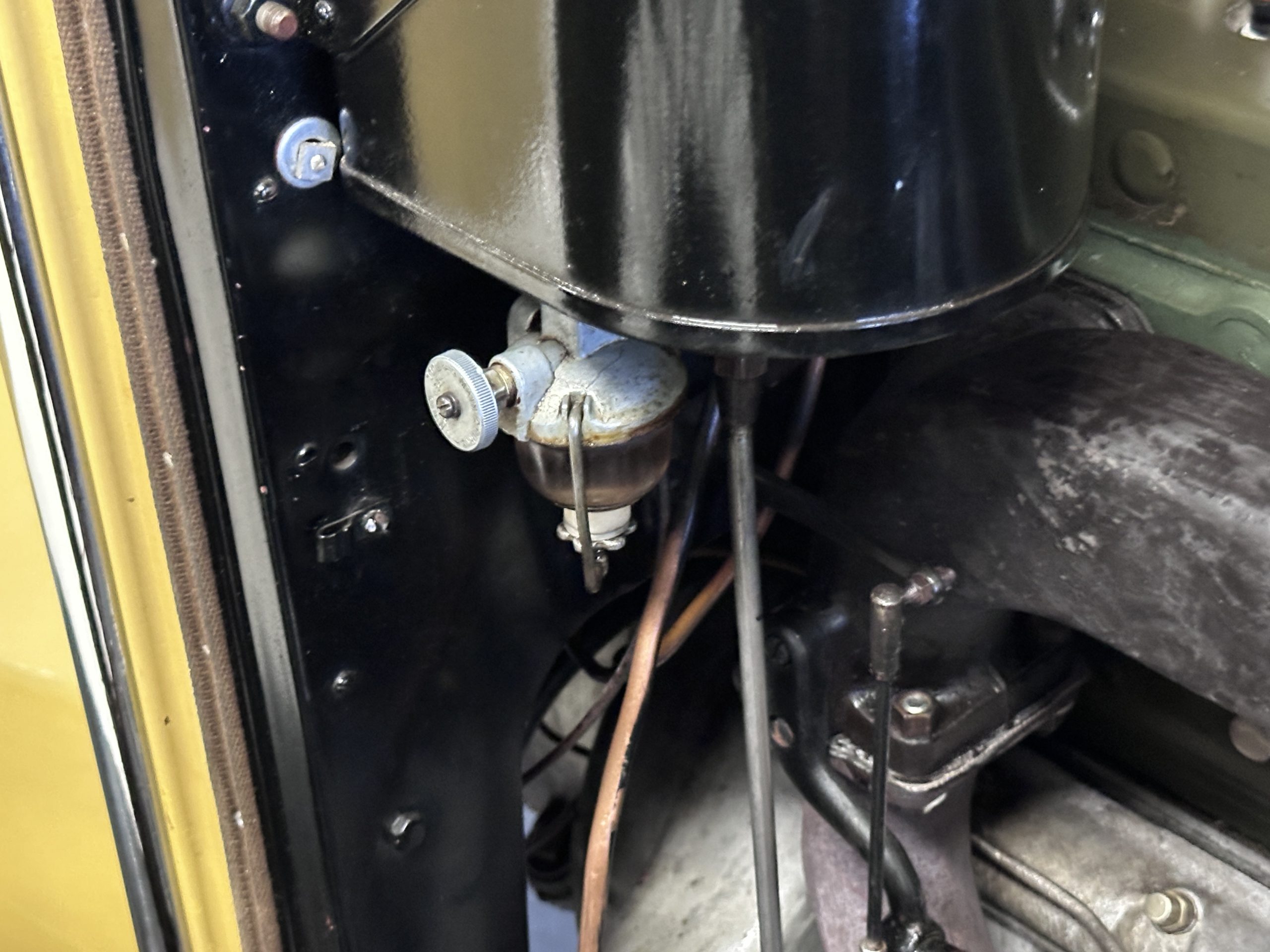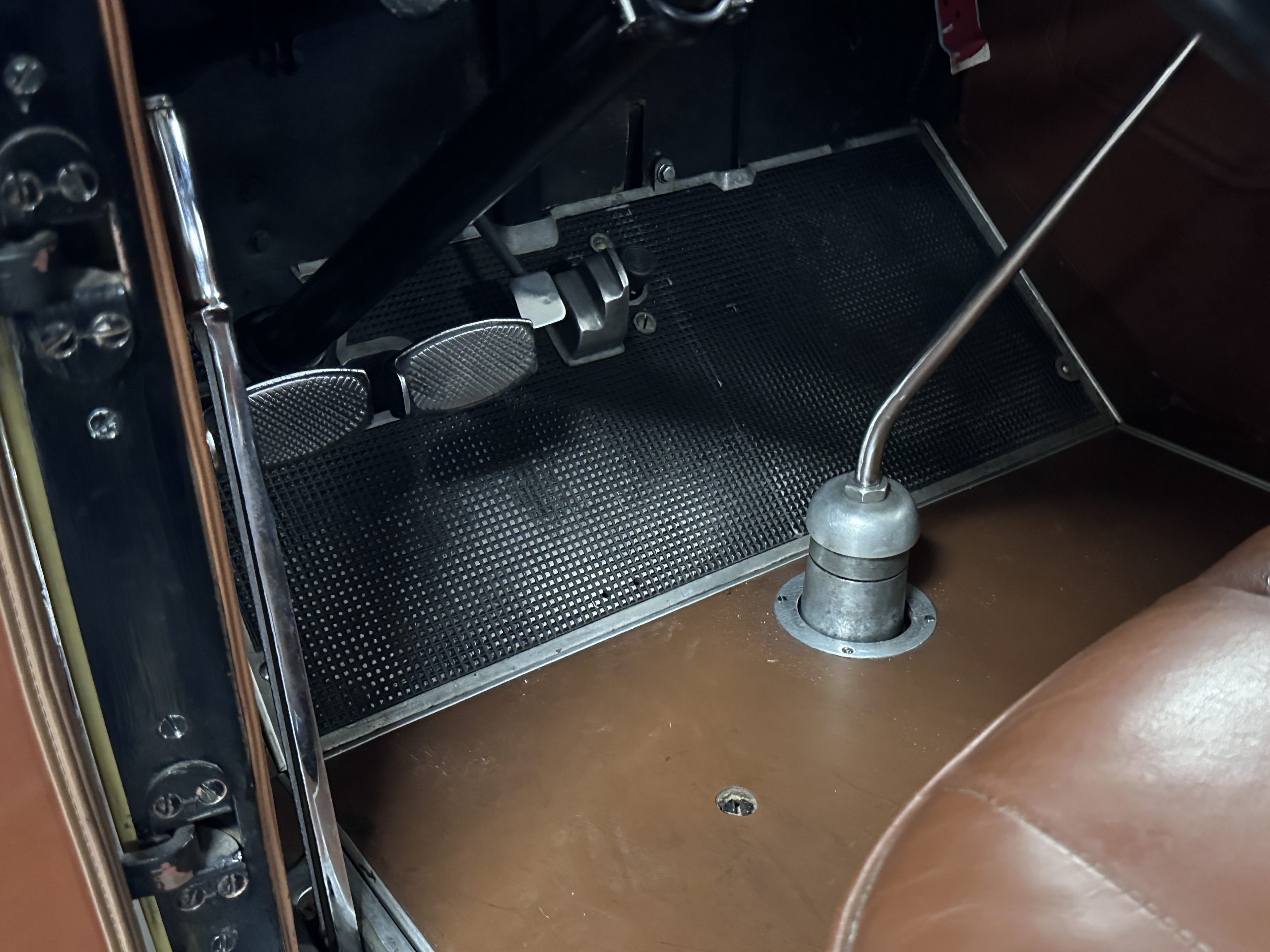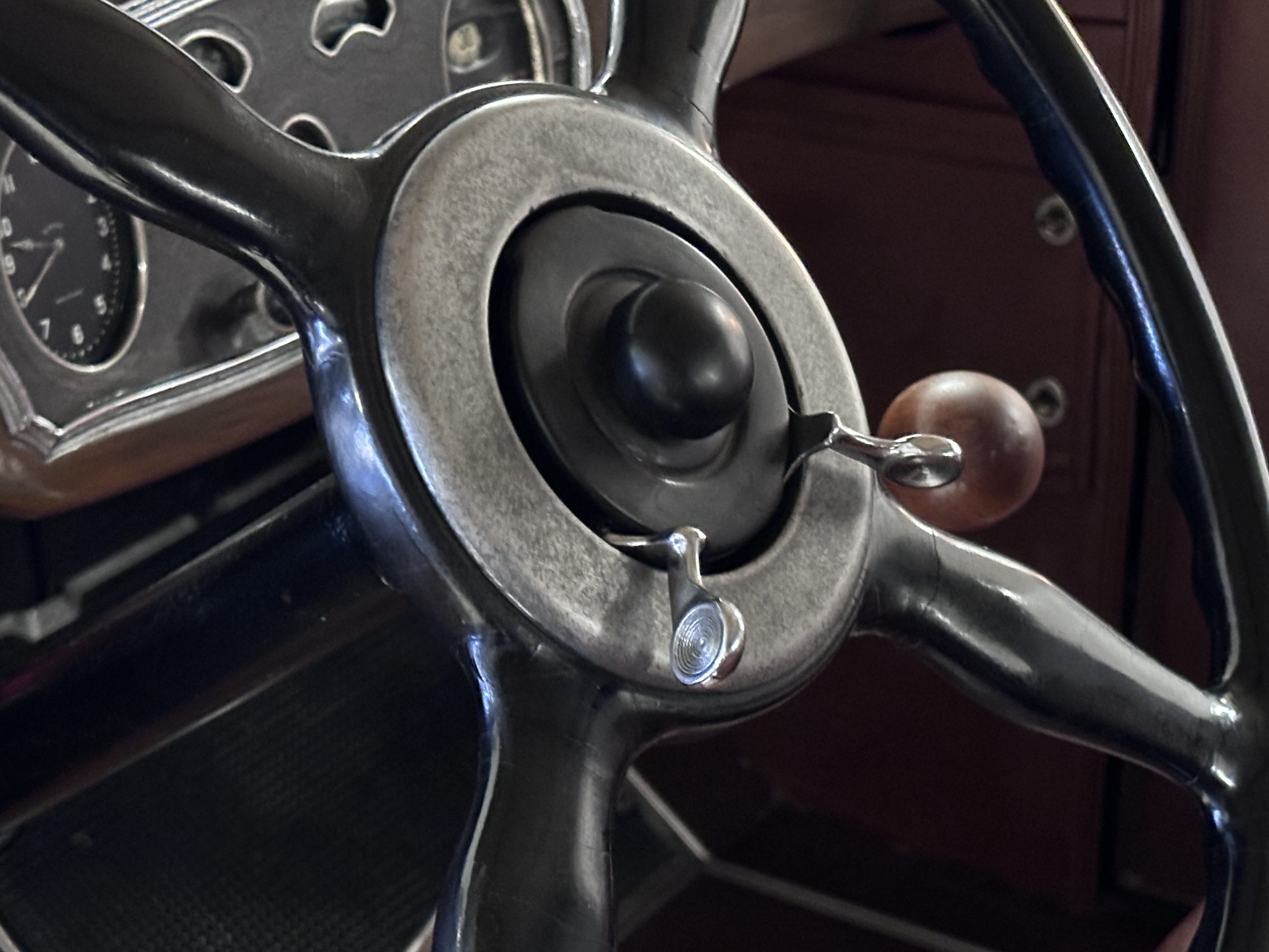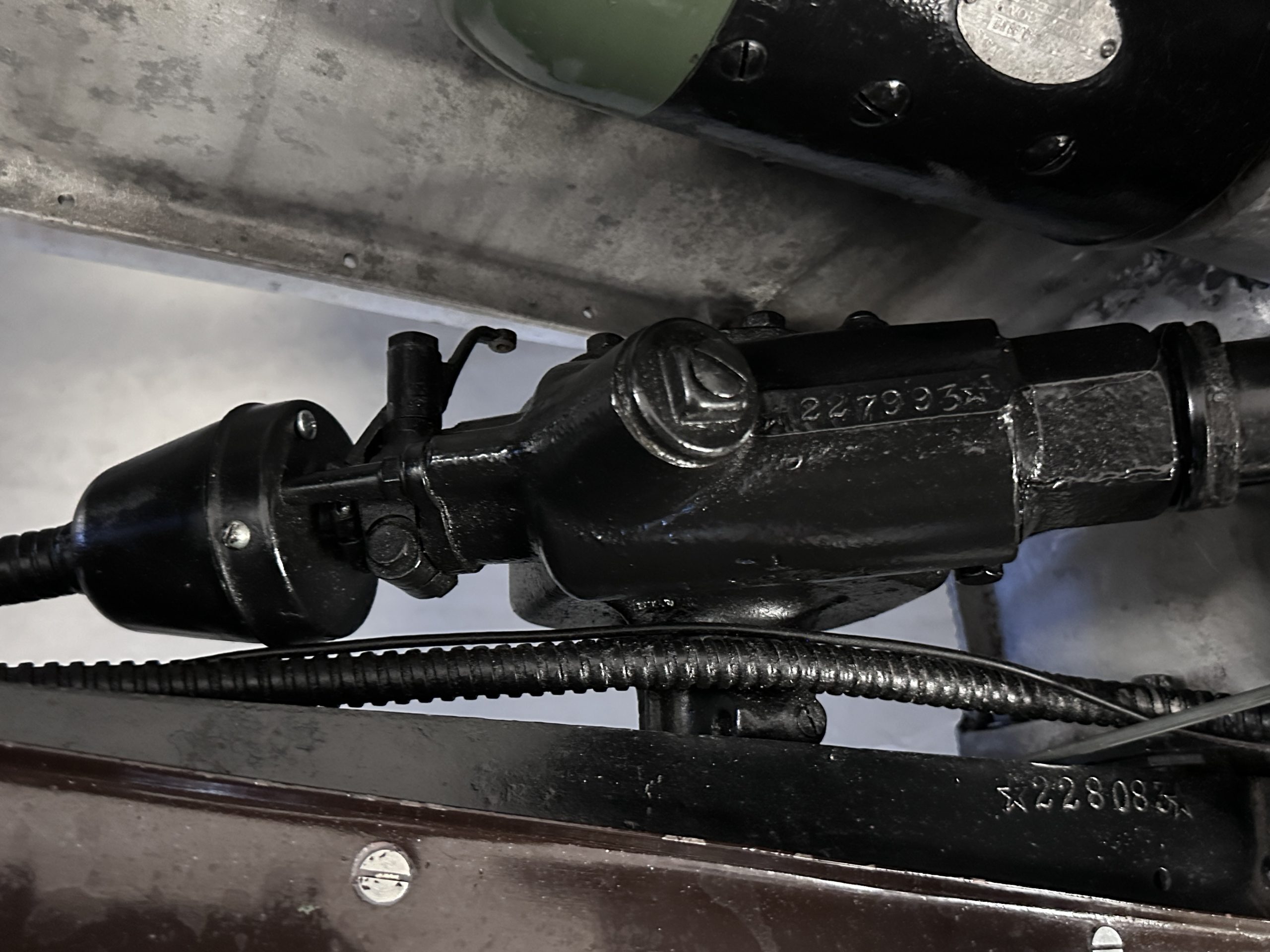 Power is sent to the rear wheels via a three-speed manual transmission, and service in 2024 included rebuilds of the clutch discs and pressure plate and replacement of the throwout bearing as well as fluid changes for the gearbox and differential. Suspension incorporates solid axles, semi-elliptical leaf springs, and hydraulic lever-arm shock absorbers at each end, while steering is via worm and sector. The Bijur central lubrication system was repaired and adjusted in 2024. The car is equipped with an exhaust cut-out that is operated via a switch on the floorboards.