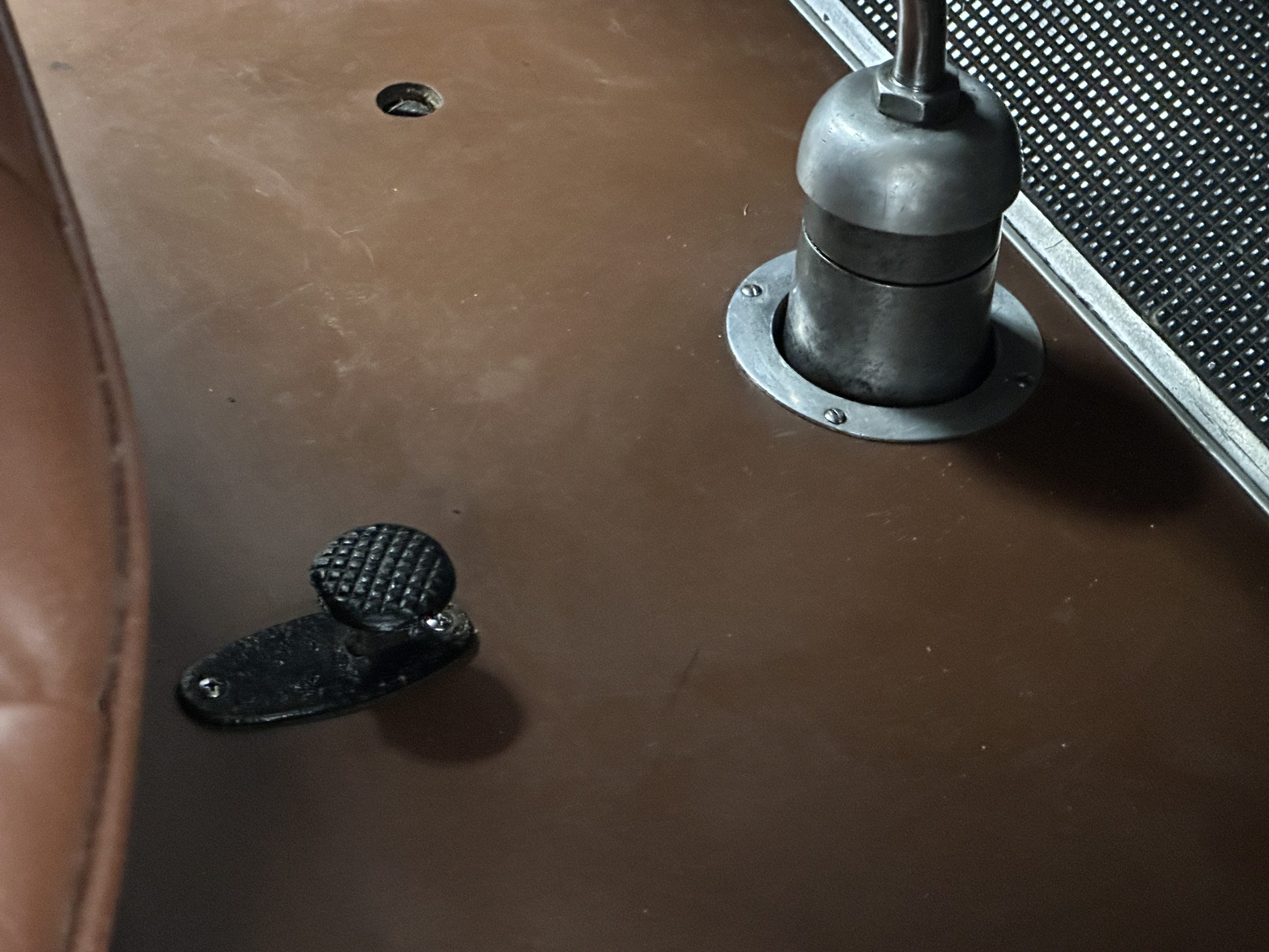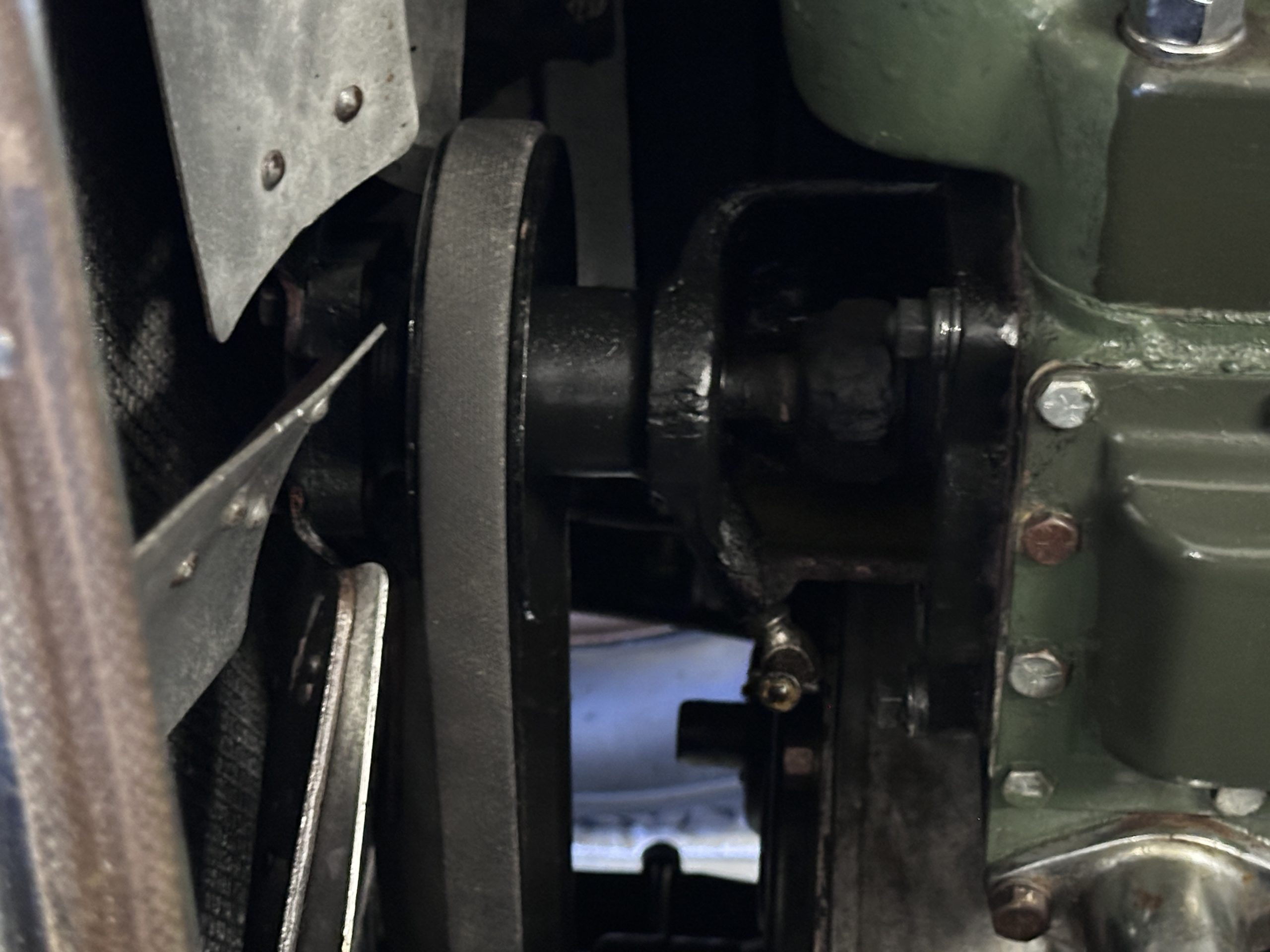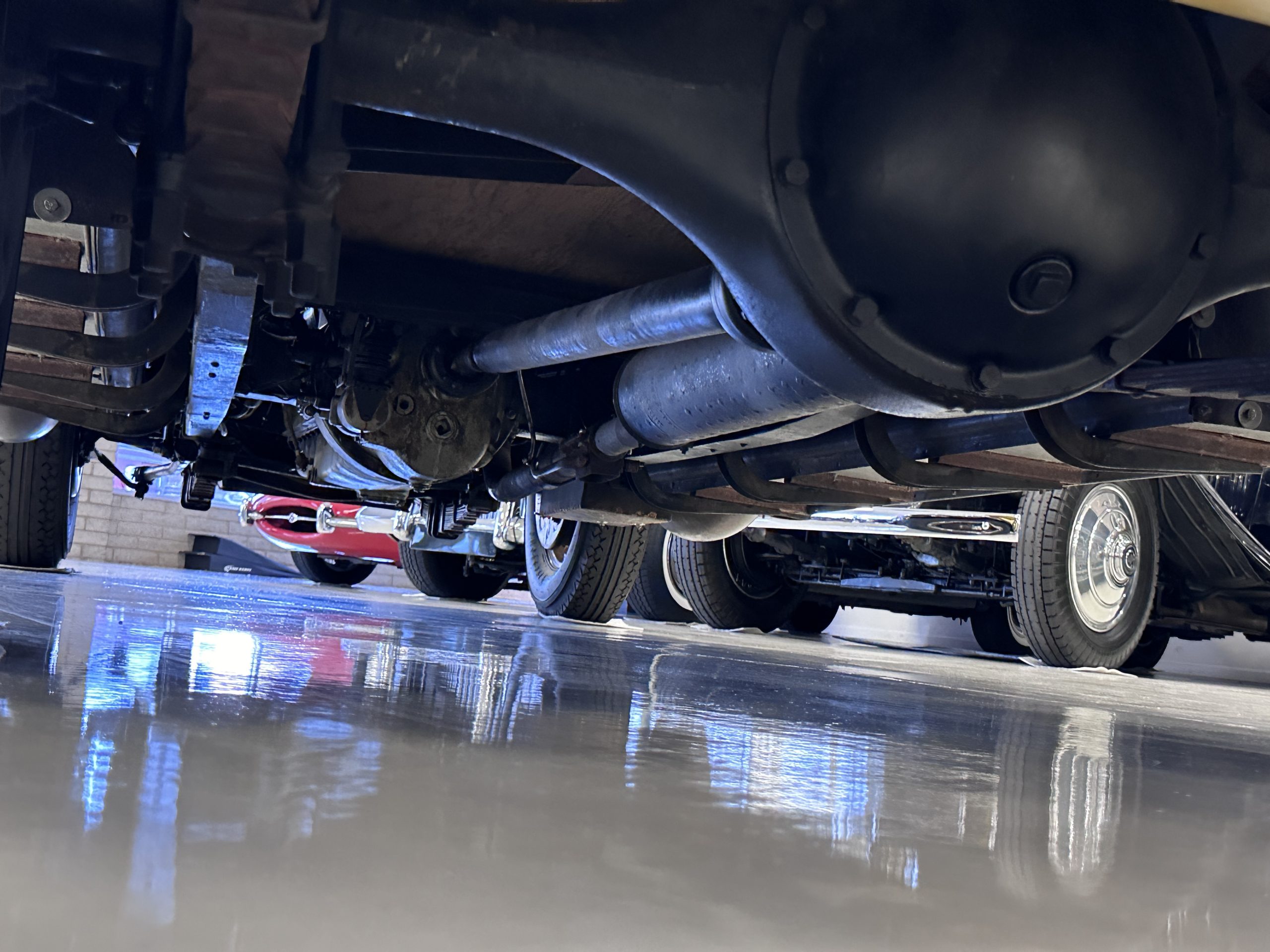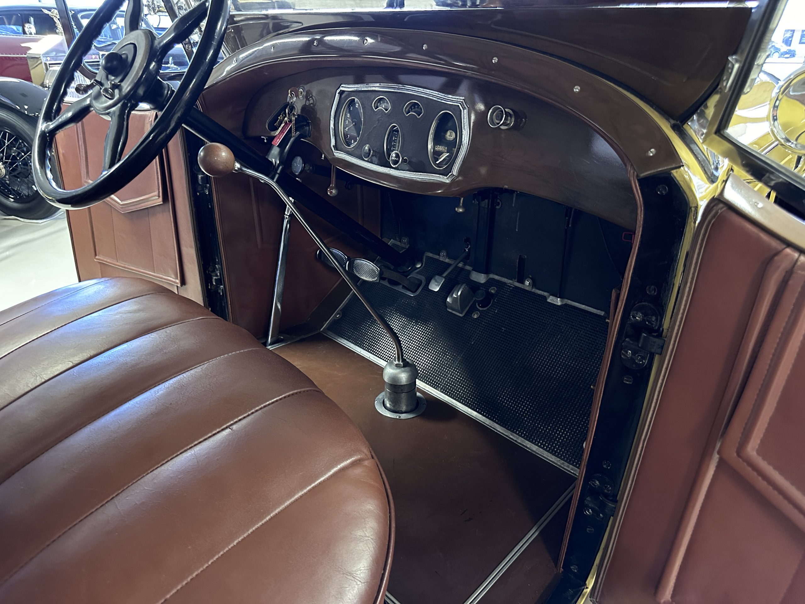 Power is sent to the rear wheels via a three-speed manual transmission, and service in 2024 included rebuilds of the clutch discs and pressure plate and replacement of the throwout bearing as well as fluid changes for the gearbox and differential. Suspension incorporates solid axles, semi-elliptical leaf springs, and hydraulic lever-arm shock absorbers at each end, while steering is via worm and sector. The Bijur central lubrication system was repaired and adjusted in 2024. The car is equipped with an exhaust cut-out that is operated via a switch on the floorboards.