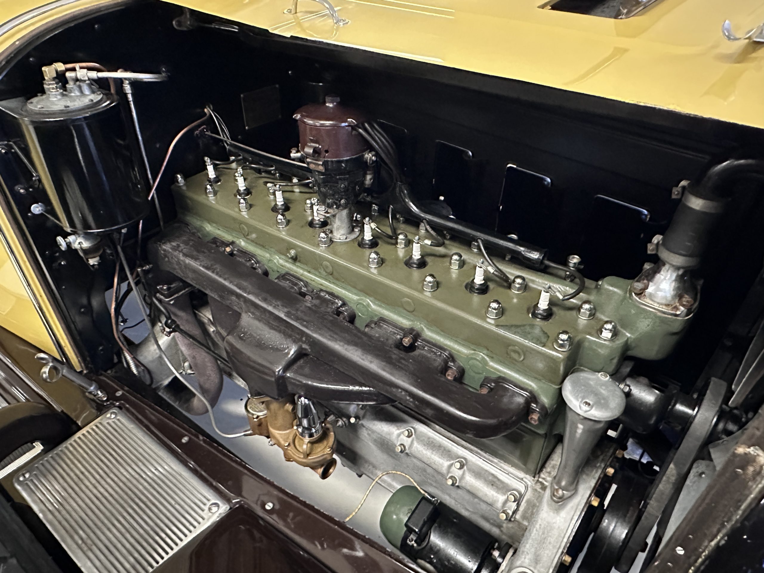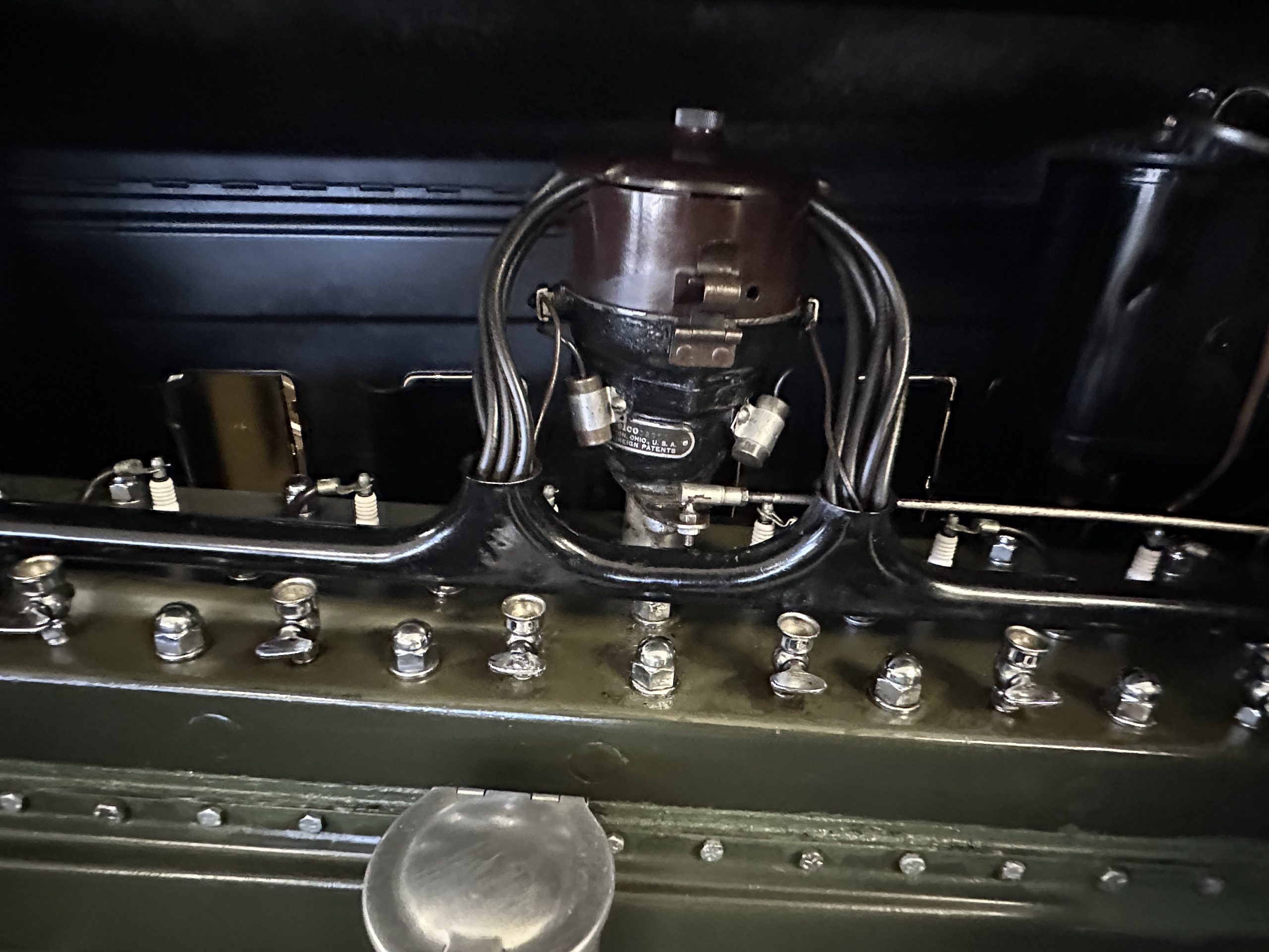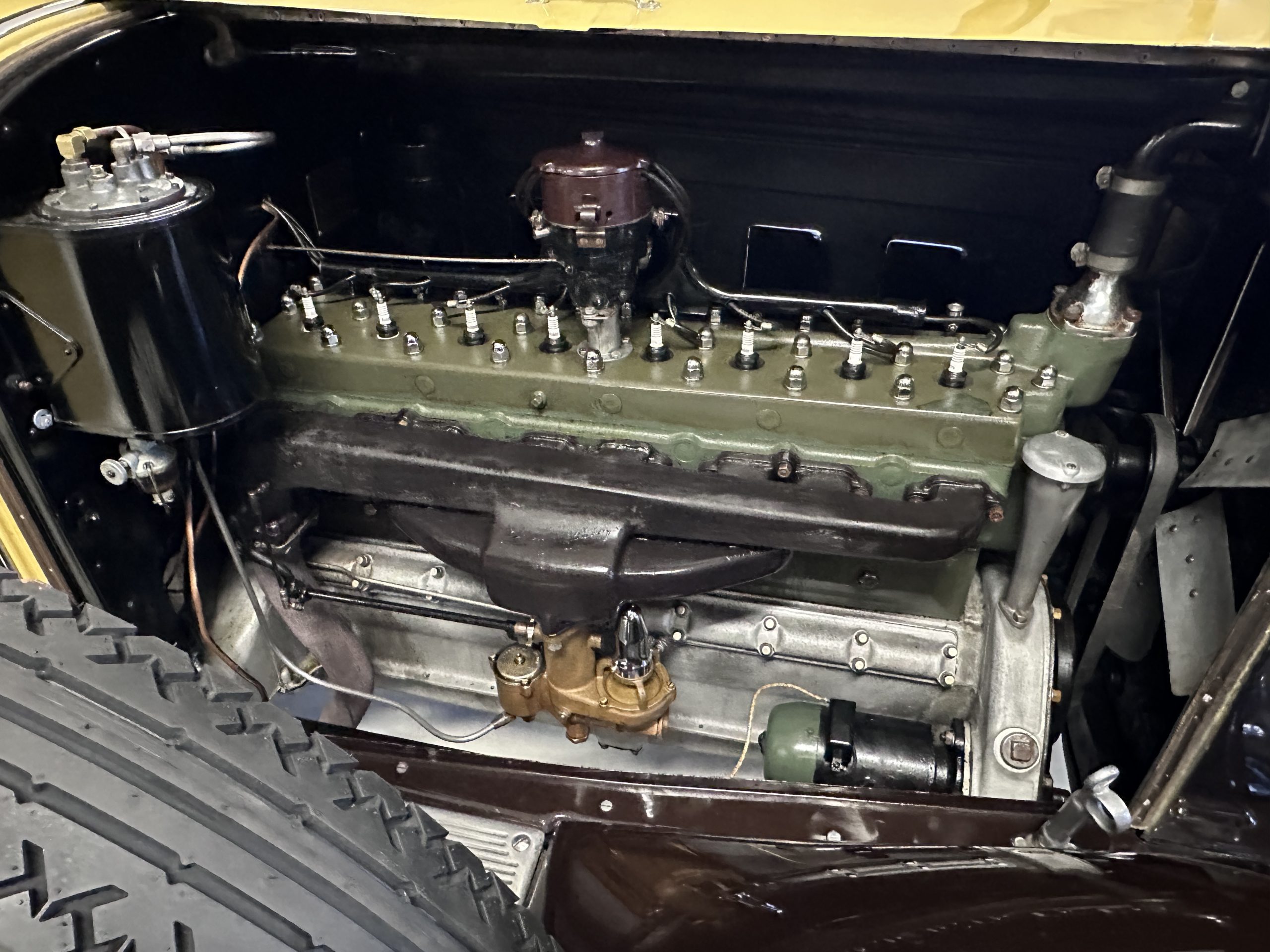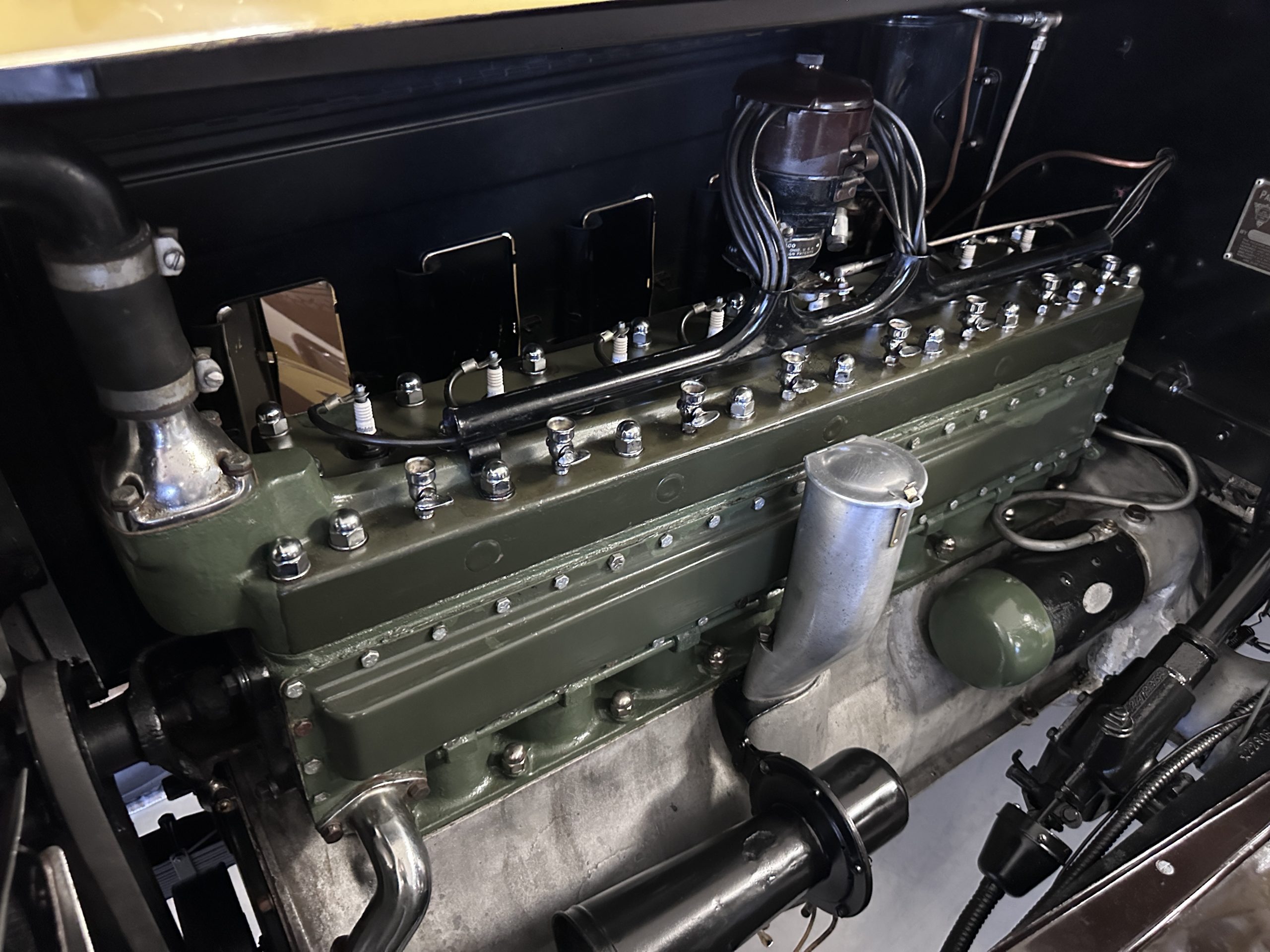 The 384.8ci inline-eight incorporates a single block casting with a detachable cylinder head, side valves, an alloy crankcase, a nine-main-bearing crankshaft, and a single updraft carburetor. Output was factory rated at 105 horsepower. The 2024 refresh included rebuilds of the starter and generator, rewiring of the car with cloth-covered cables, an oil change, a tune-up, and replacement of one of the coils, the battery, and the battery cables.