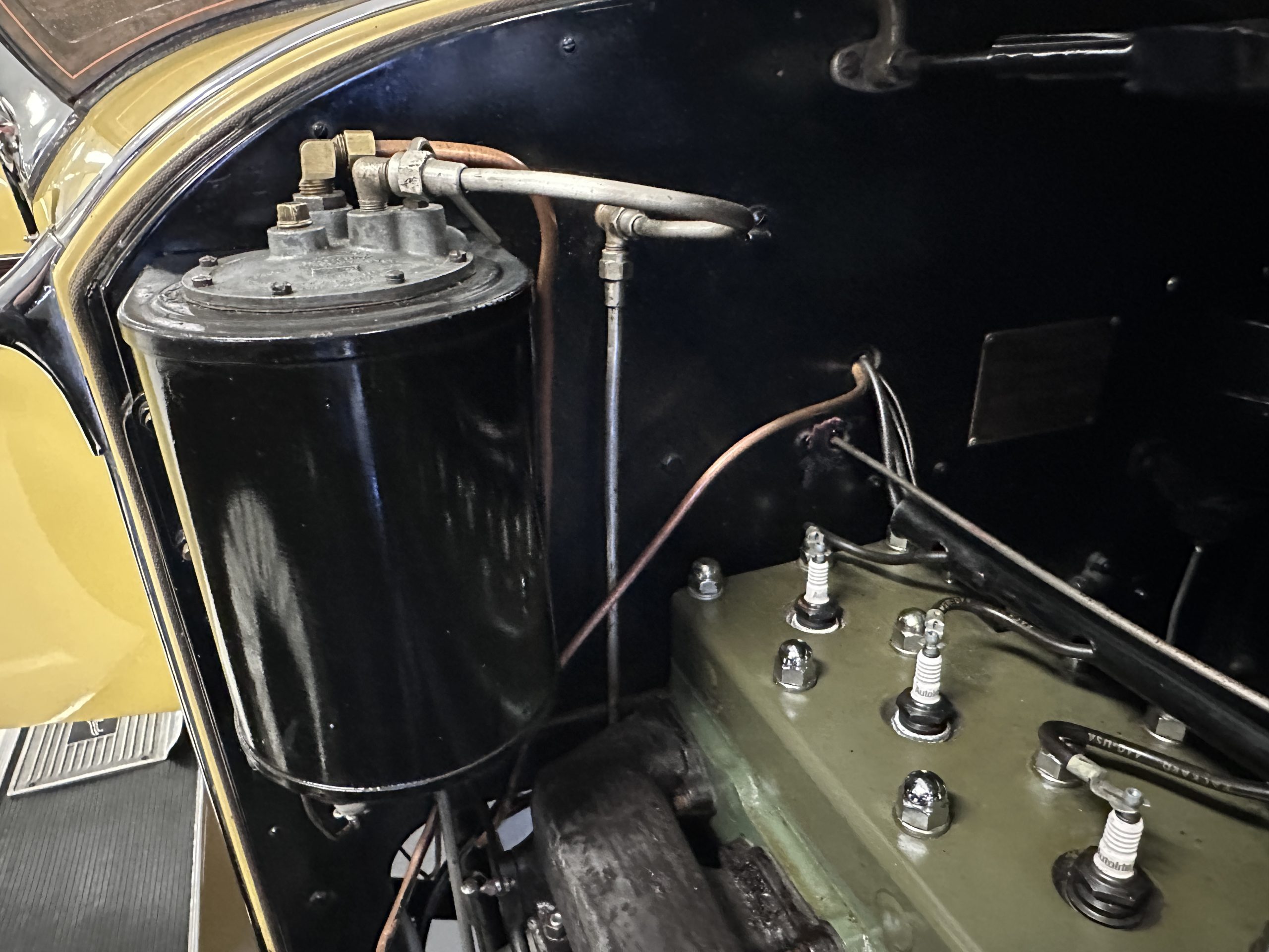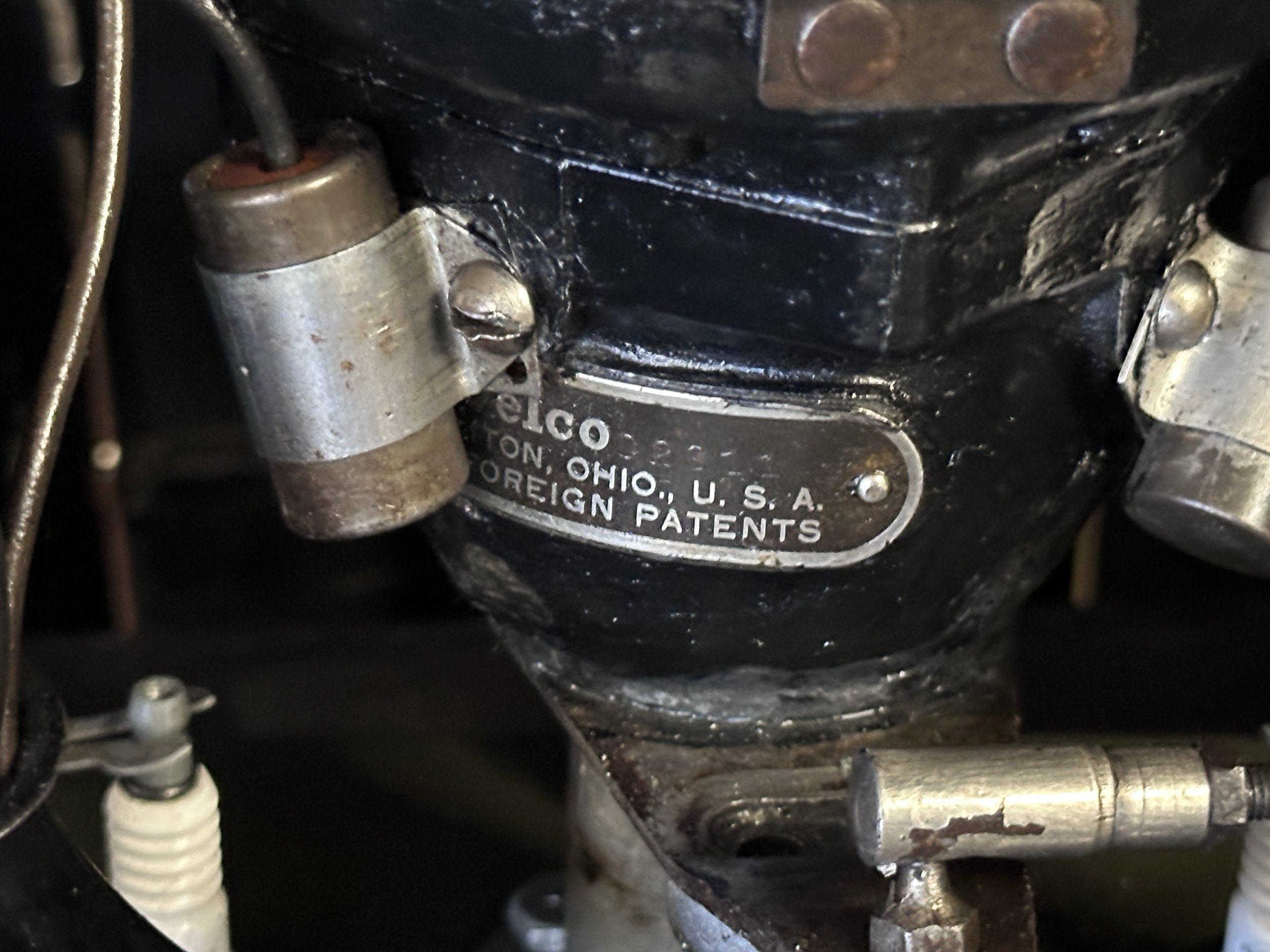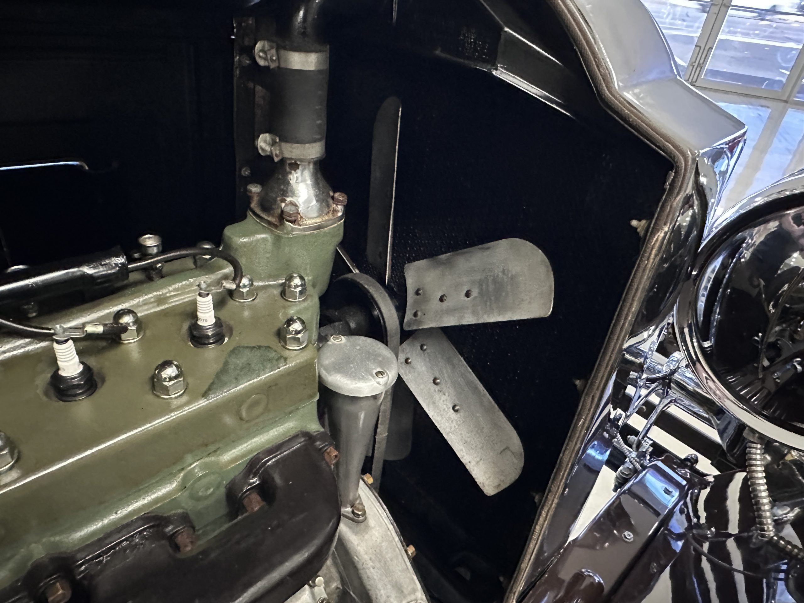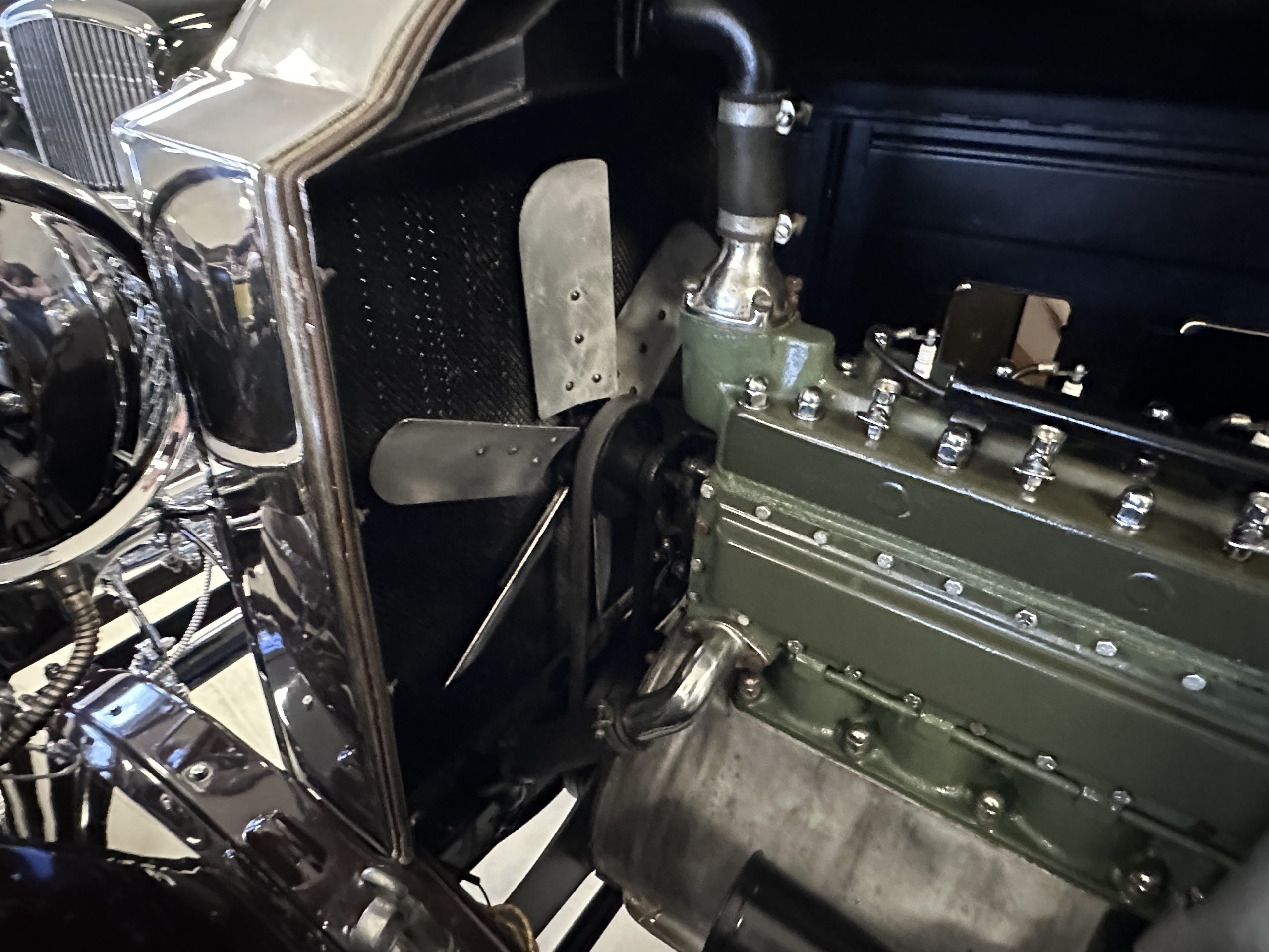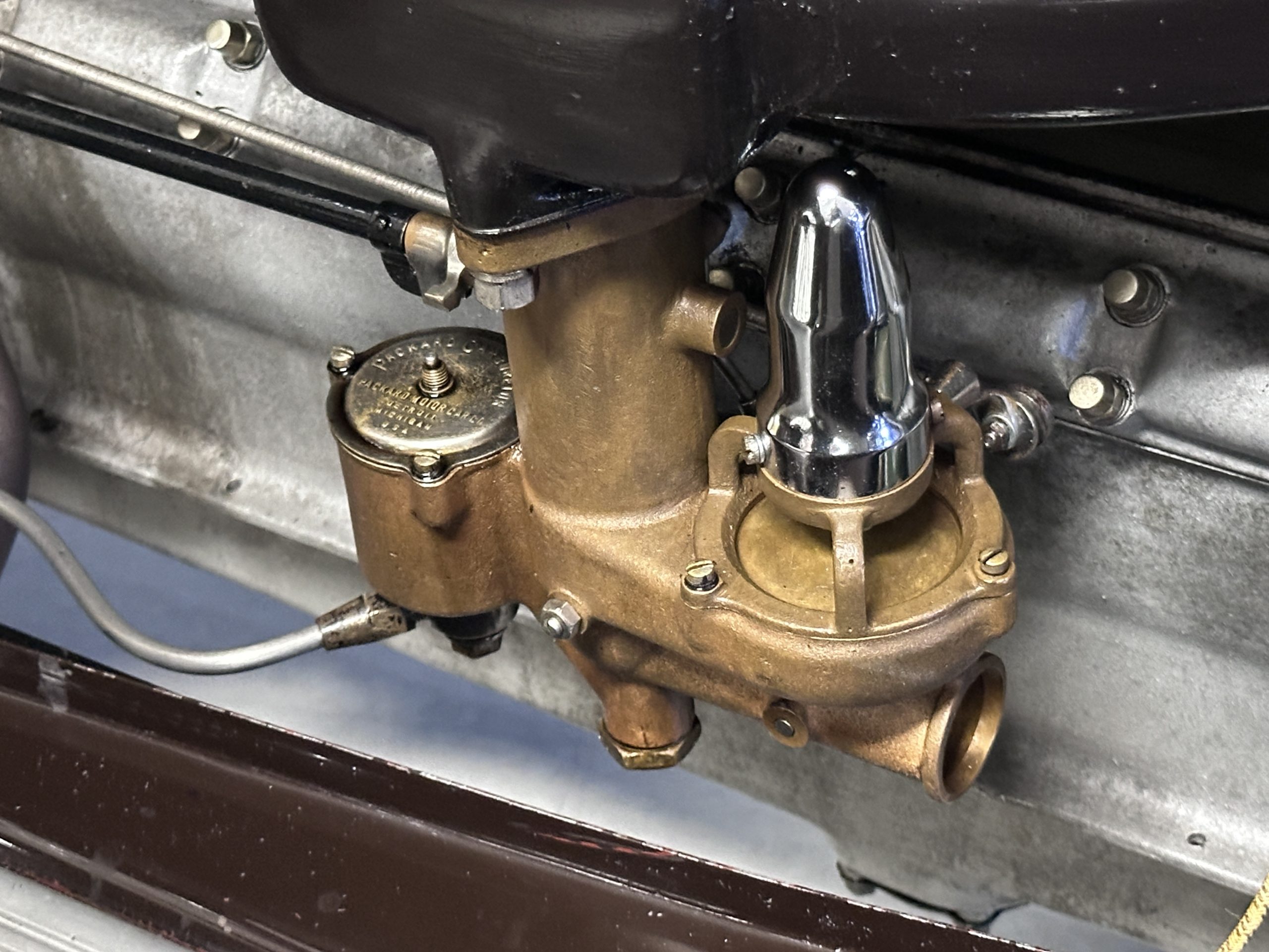 The 384.8ci inline-eight incorporates a single block casting with a detachable cylinder head, side valves, an alloy crankcase, a nine-main-bearing crankshaft, and a single updraft carburetor. Output was factory rated at 105 horsepower. The 2024 refresh included rebuilds of the starter and generator, rewiring of the car with cloth-covered cables, an oil change, a tune-up, and replacement of one of the coils, the battery, and the battery cables.
