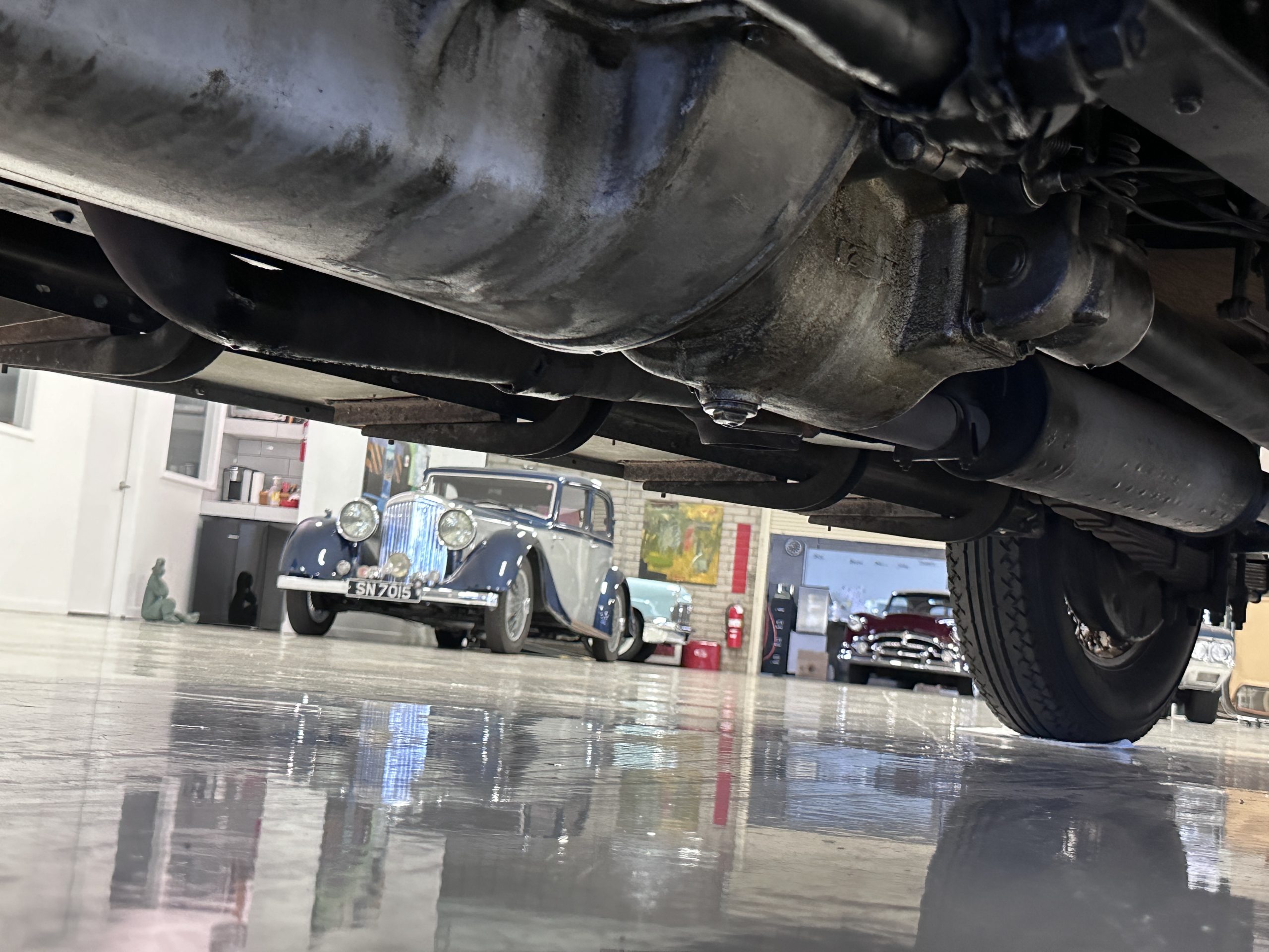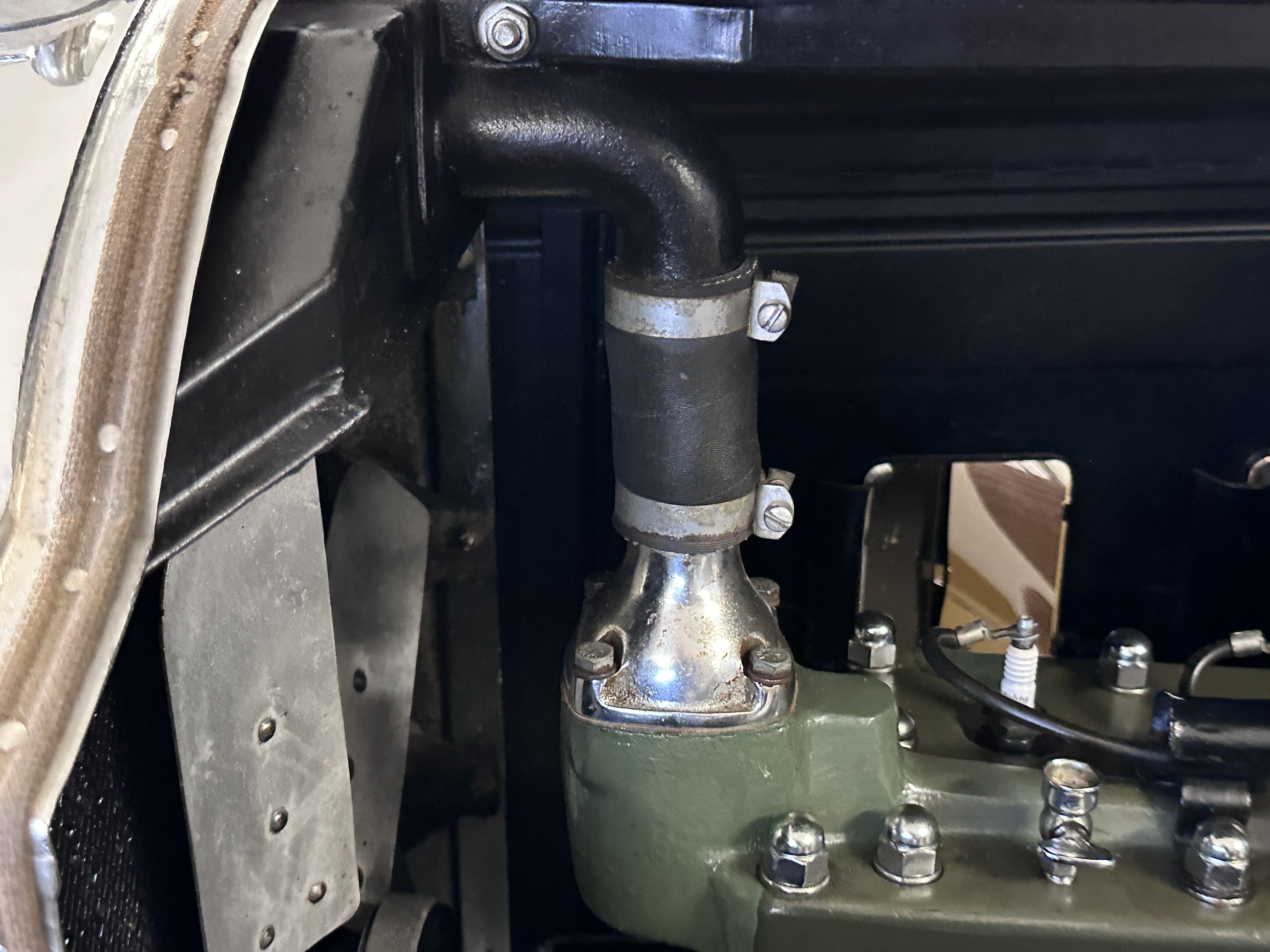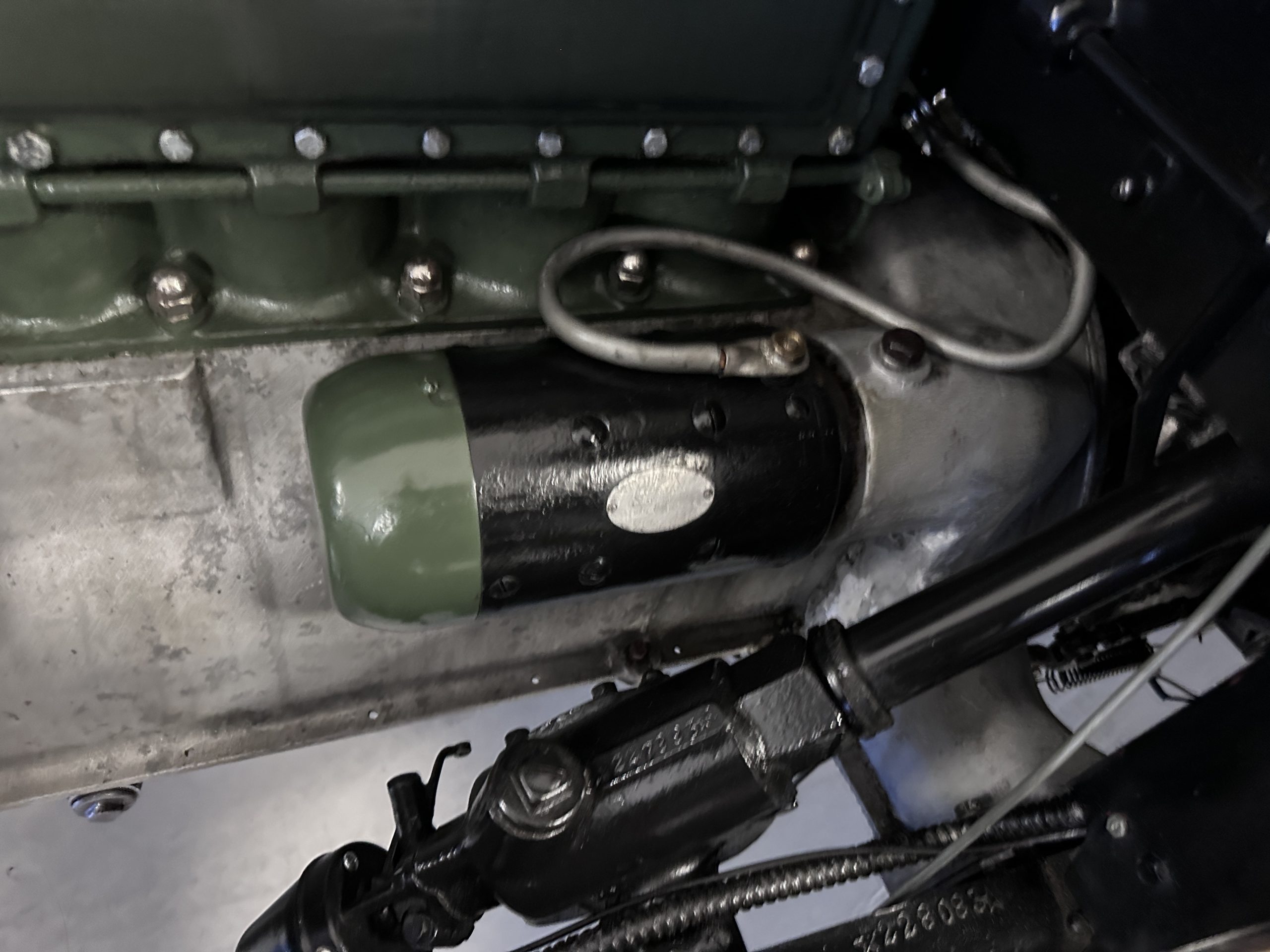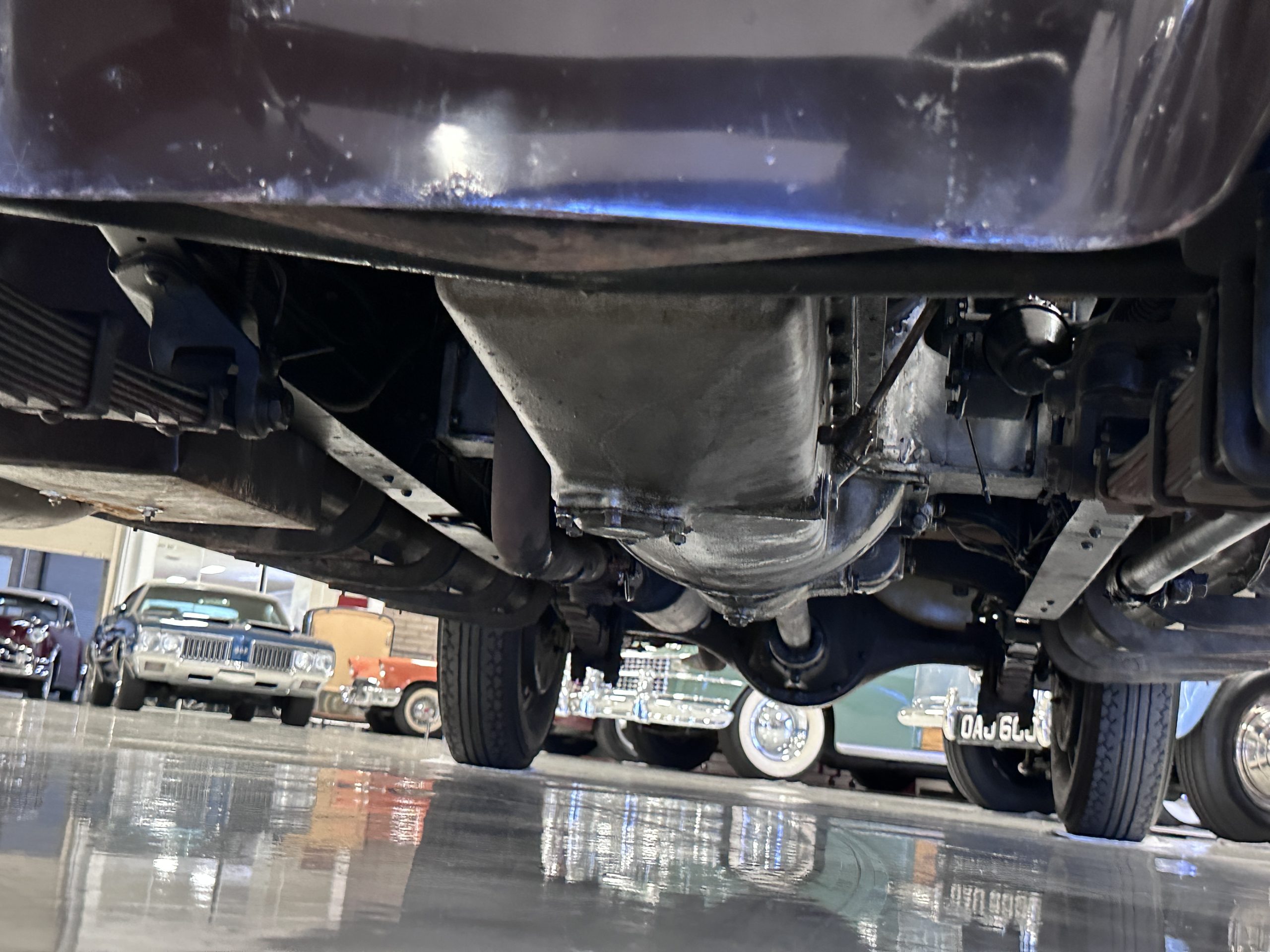 The 384.8ci inline-eight incorporates a single block casting with a detachable cylinder head, side valves, an alloy crankcase, a nine-main-bearing crankshaft, and a single updraft carburetor. Output was factory rated at 105 horsepower. The 2024 refresh included rebuilds of the starter and generator, rewiring of the car with cloth-covered cables, an oil change, a tune-up, and replacement of one of the coils, the battery, and the battery cables.