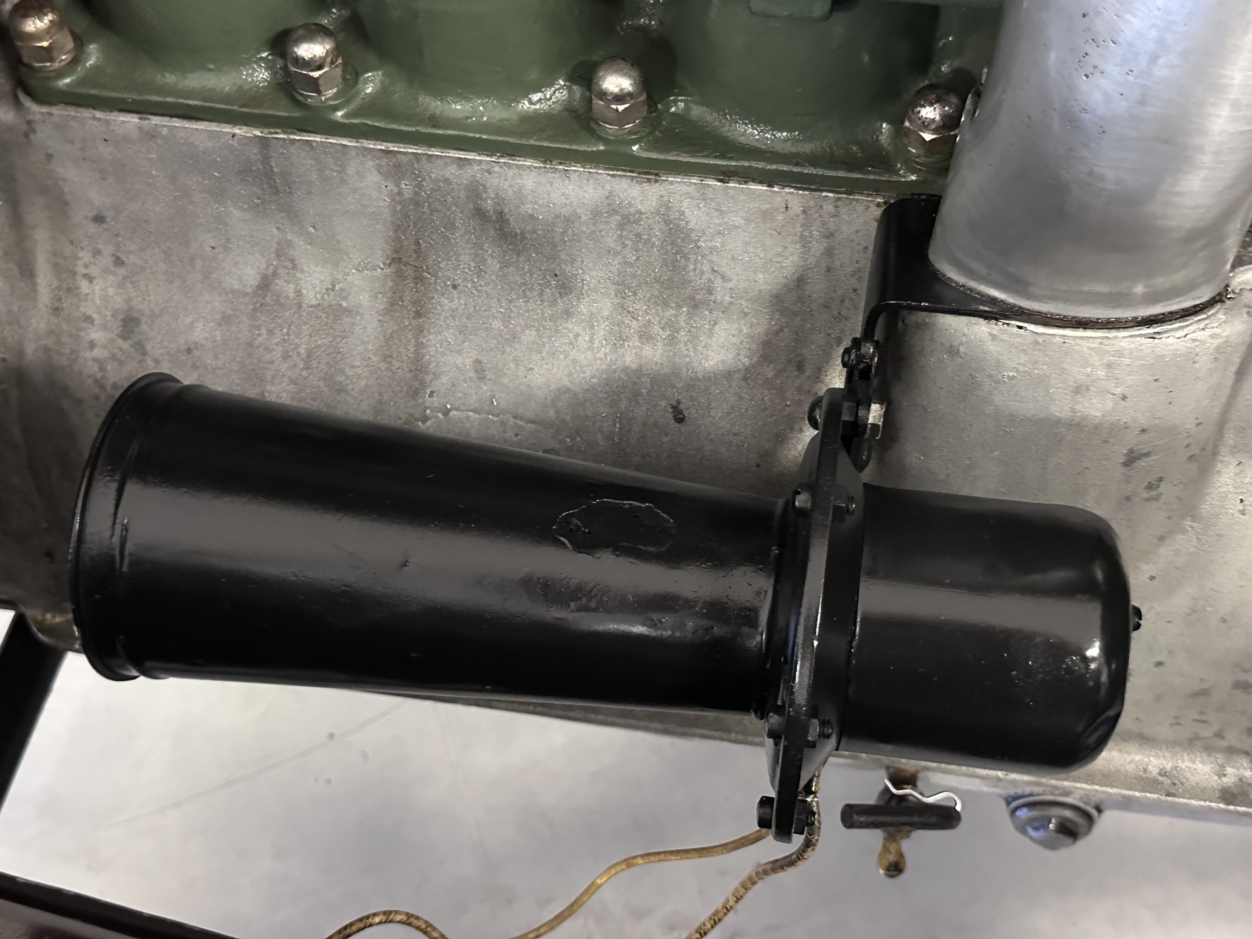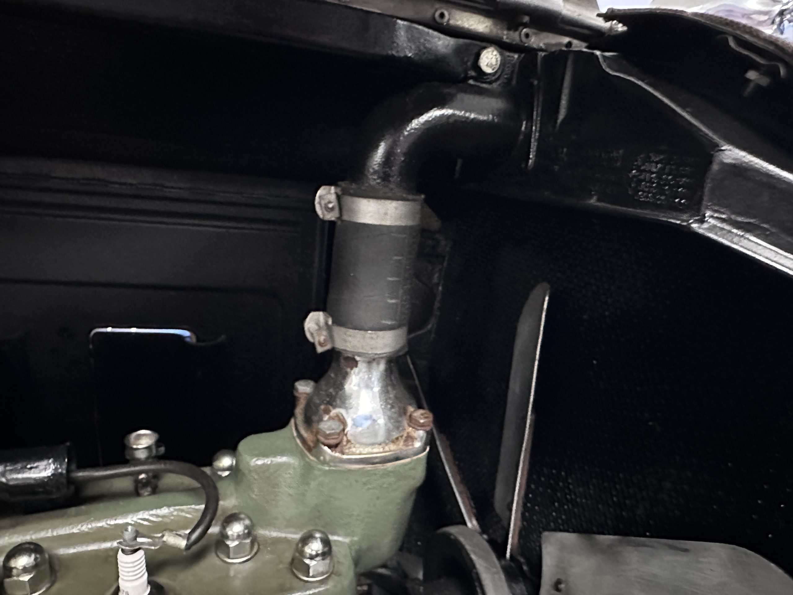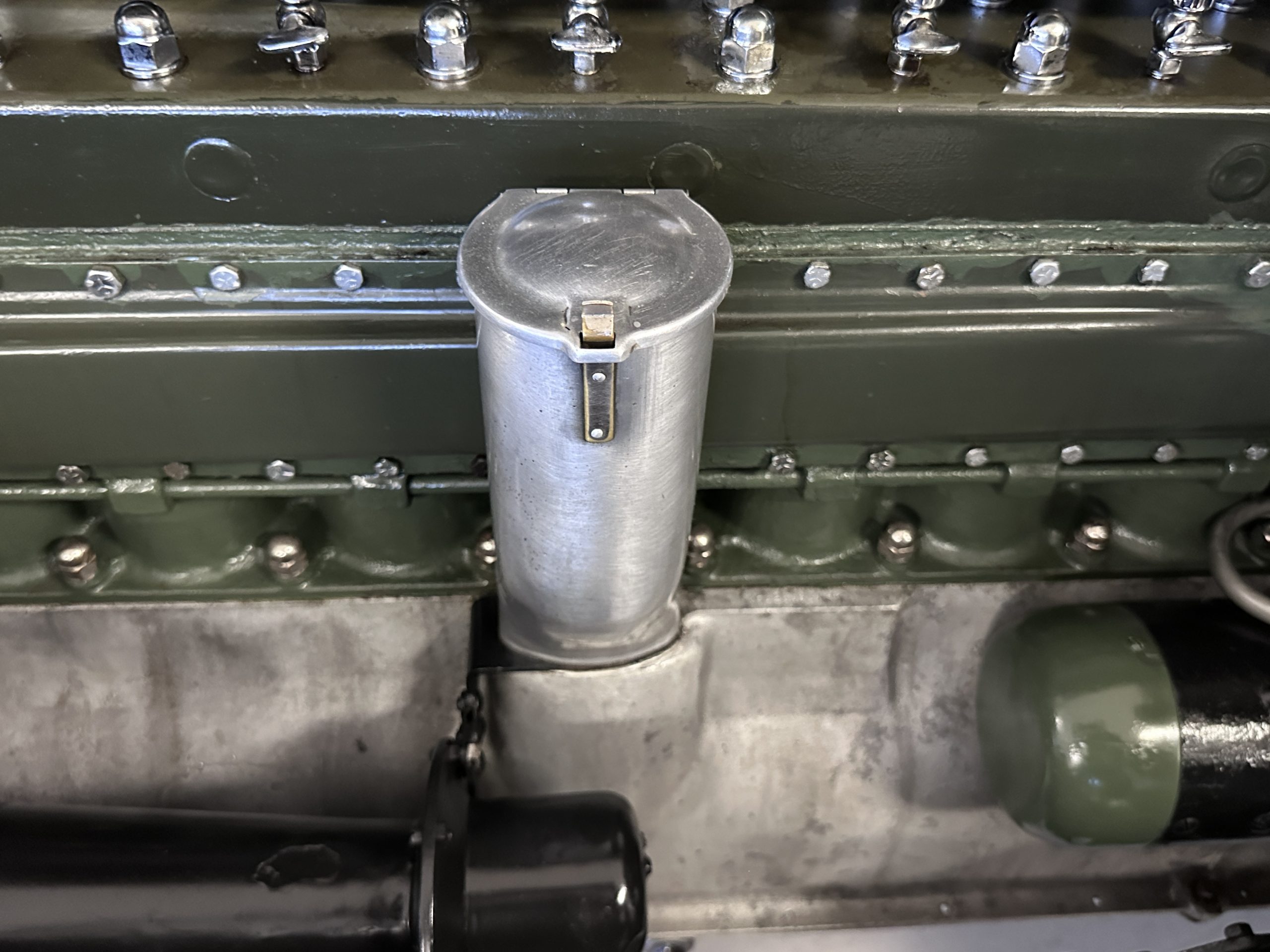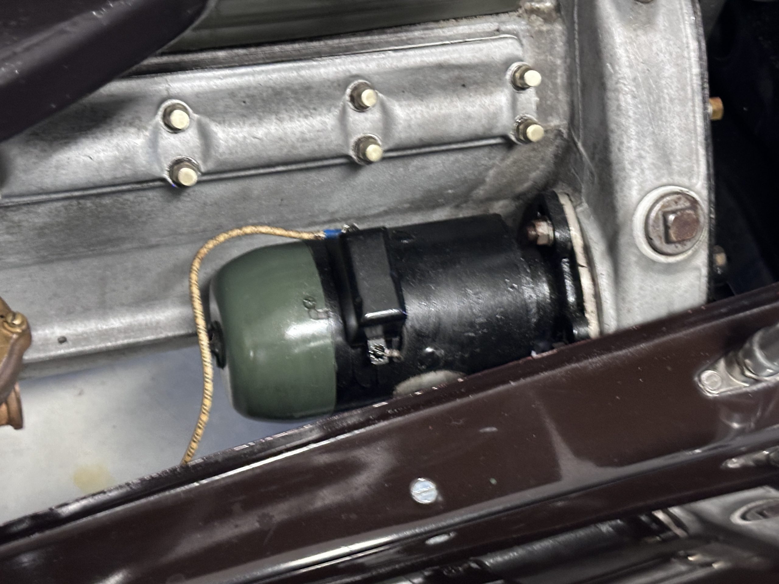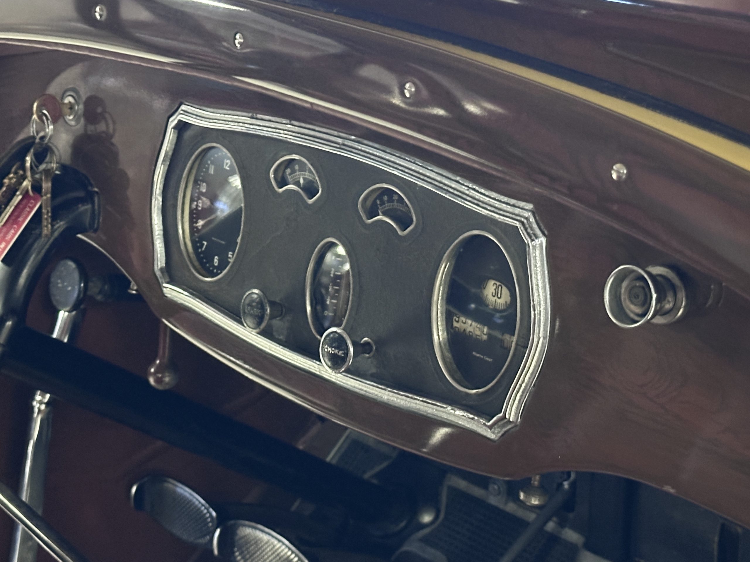 The 384.8ci inline-eight incorporates a single block casting with a detachable cylinder head, side valves, an alloy crankcase, a nine-main-bearing crankshaft, and a single updraft carburetor. Output was factory rated at 105 horsepower. The 2024 refresh included rebuilds of the starter and generator, rewiring of the car with cloth-covered cables, an oil change, a tune-up, and replacement of one of the coils, the battery, and the battery cables.