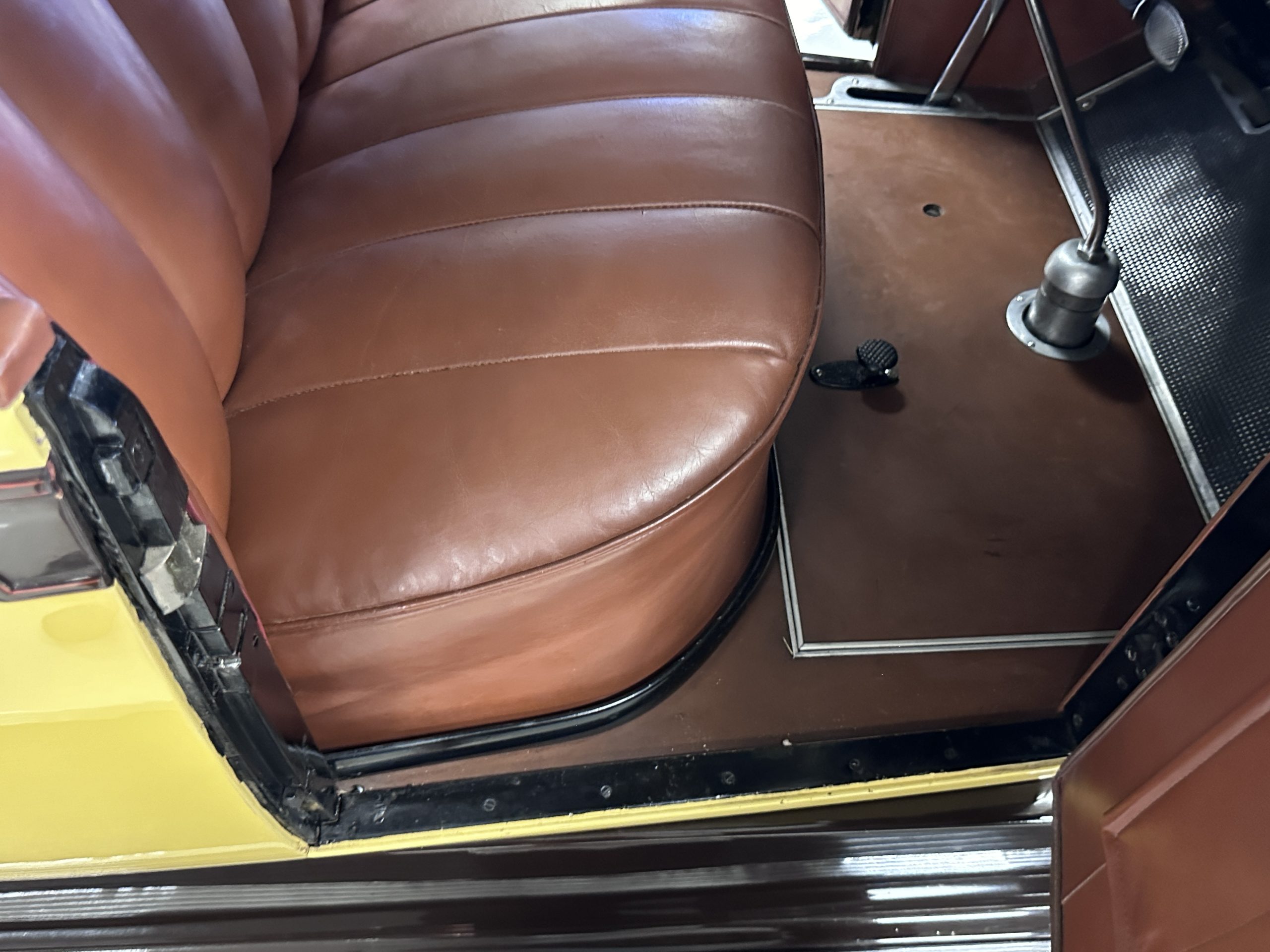The cabin is trimmed in brown leather over the single bench seat with matching upholstery covering the door panels and rumble seat. Features include color-keyed flooring, door pockets, a cigar lighter, and a color-keyed shift knob. Lockable doors on each side of the body allow access to a golf club storage compartment.