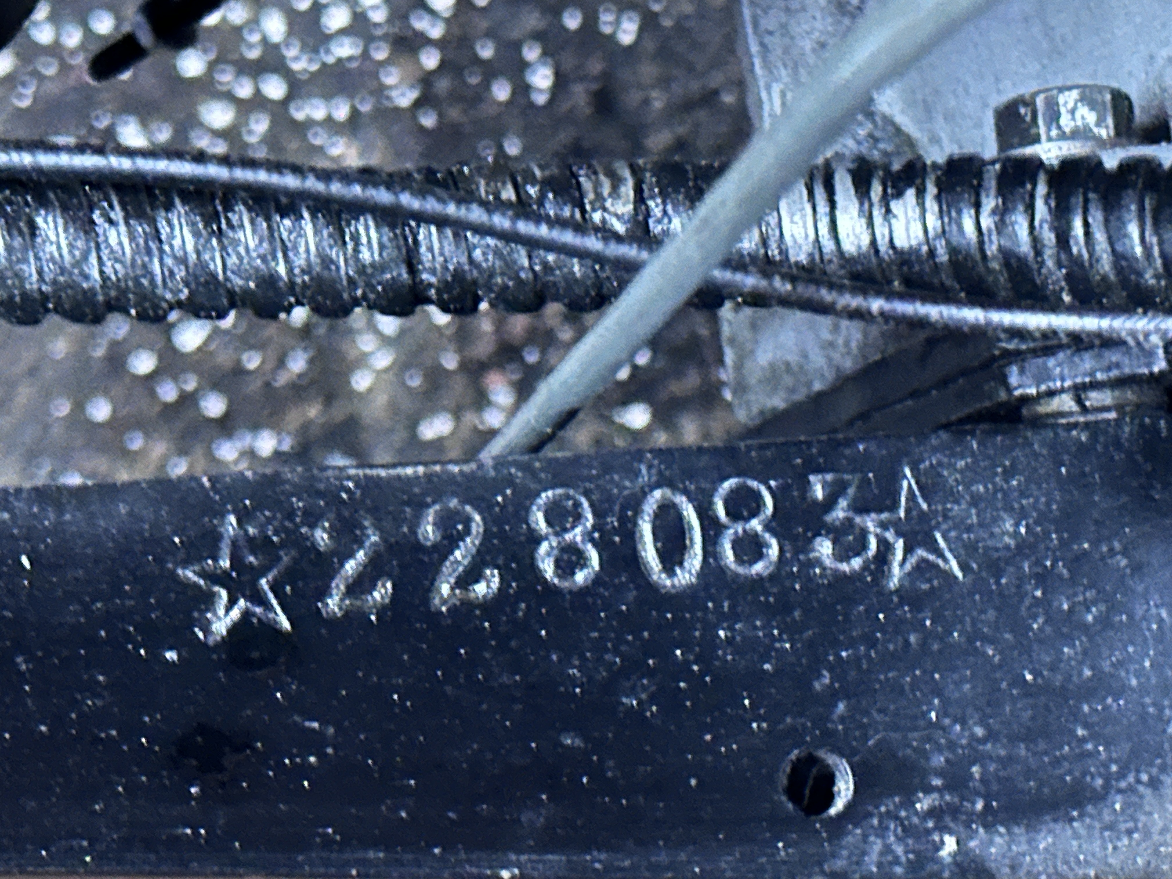 The frame is stamped with number 228083, which is listed as the car’s identification number on the title.
