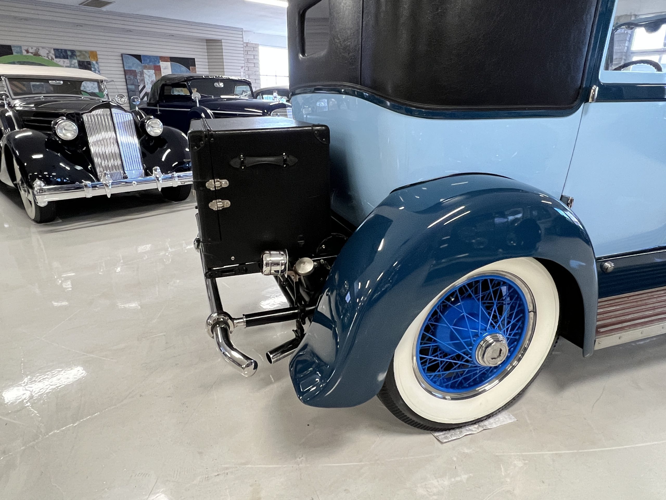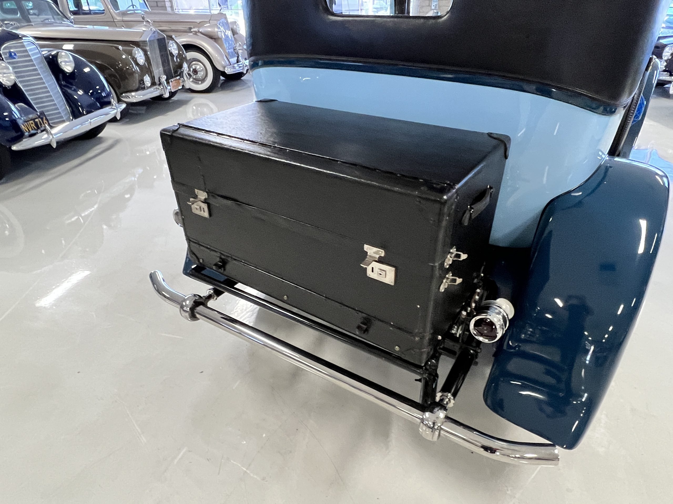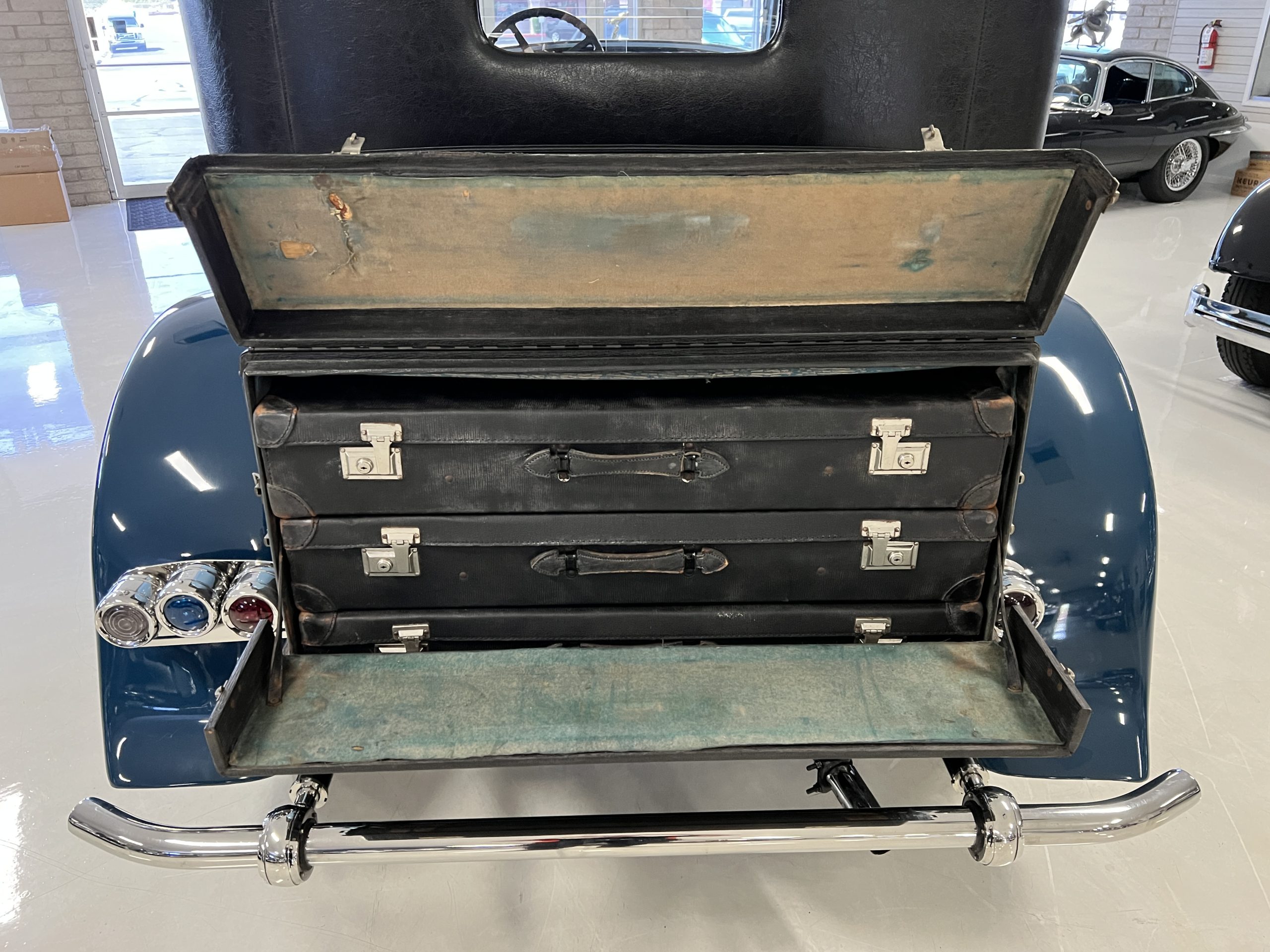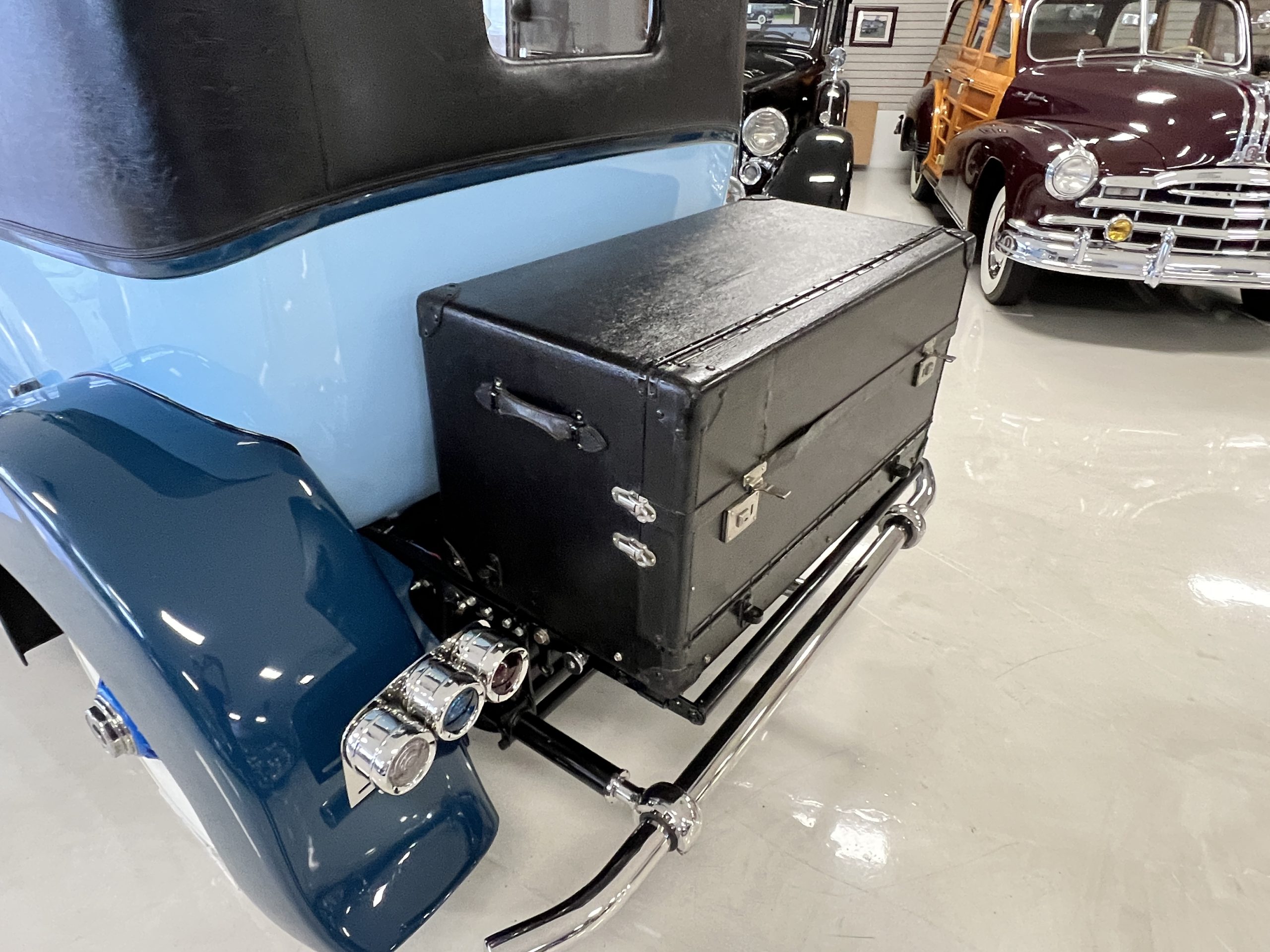 EXTERIOR: The livery is an elegant two-tone blue that is in overall nice enough for most concours events but what we refer to as touring quality. The paint presents itself with very nice shine and luster but has many small touched up chips and a few small cracks. The chrome has largely been redone and in very good to excellent condition with some signs of wear. The black vinyl top looks correct and in very nice condition. The original trunk with three fitted suitcases is still original and in beautiful condition. The glass is all excellent having been replaced during the restoration.