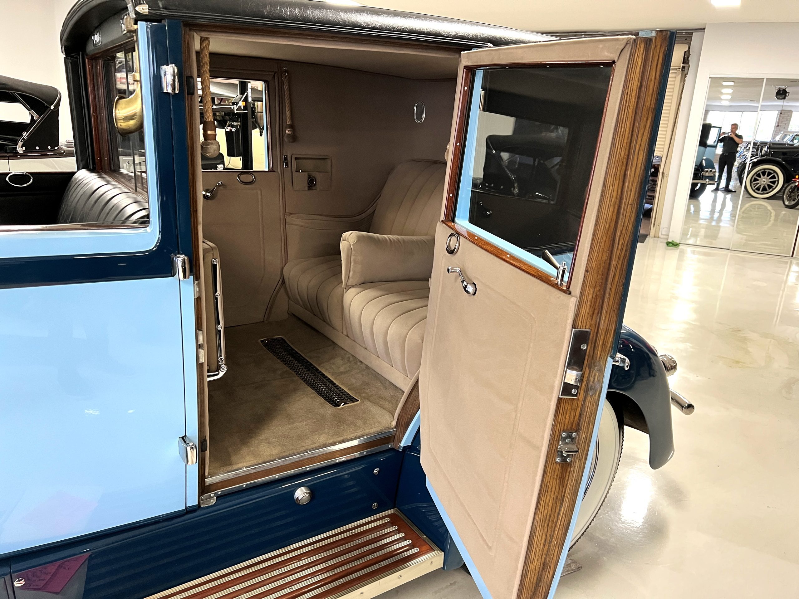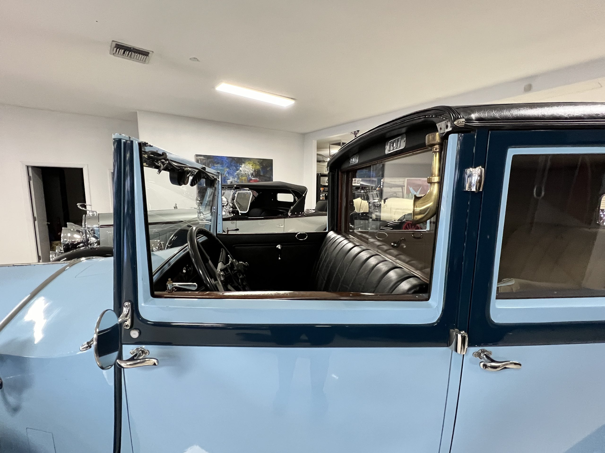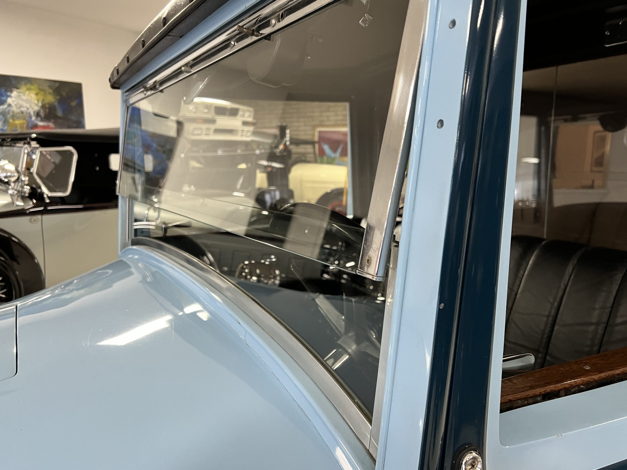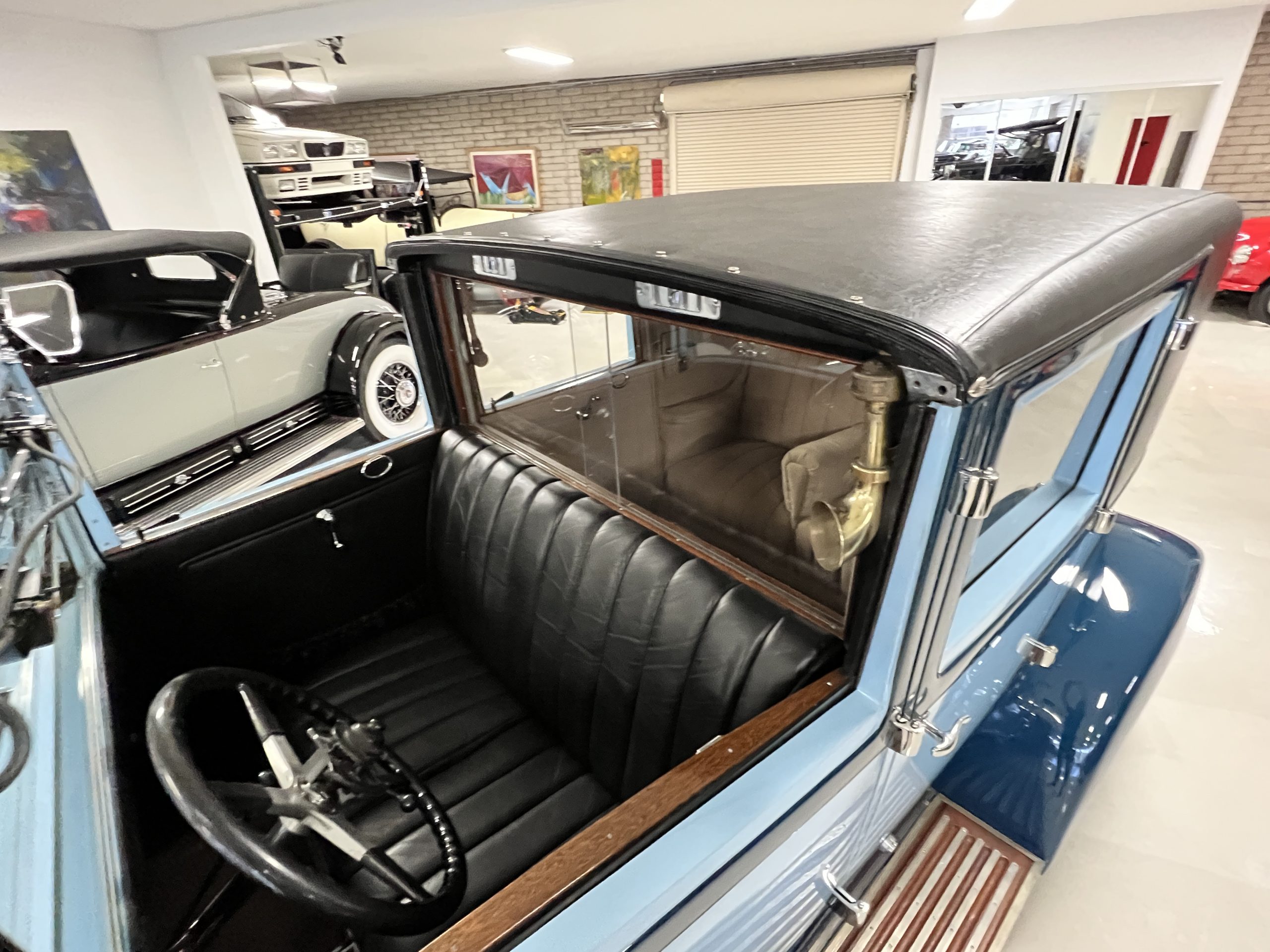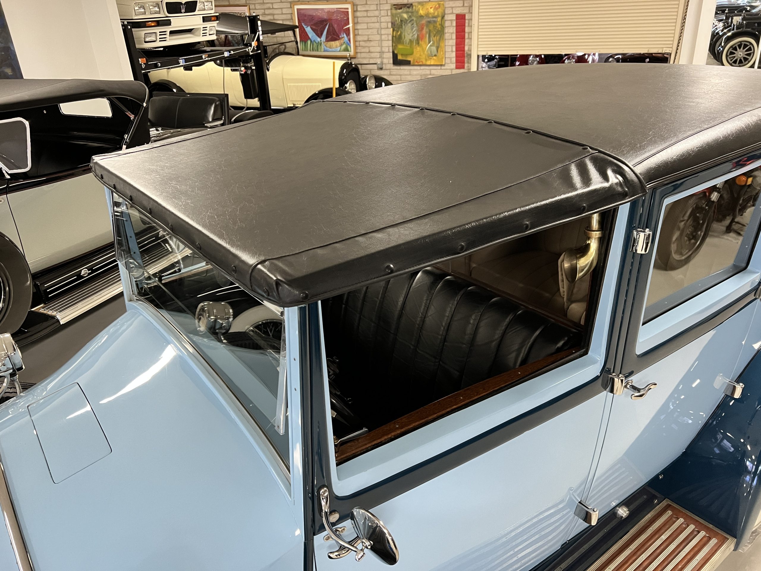 EXTERIOR: The livery is an elegant two-tone blue that is in overall nice enough for most concours events but what we refer to as touring quality. The paint presents itself with very nice shine and luster but has many small touched up chips and a few small cracks. The chrome has largely been redone and in very good to excellent condition with some signs of wear. The black vinyl top looks correct and in very nice condition. The original trunk with three fitted suitcases is still original and in beautiful condition. The glass is all excellent having been replaced during the restoration.