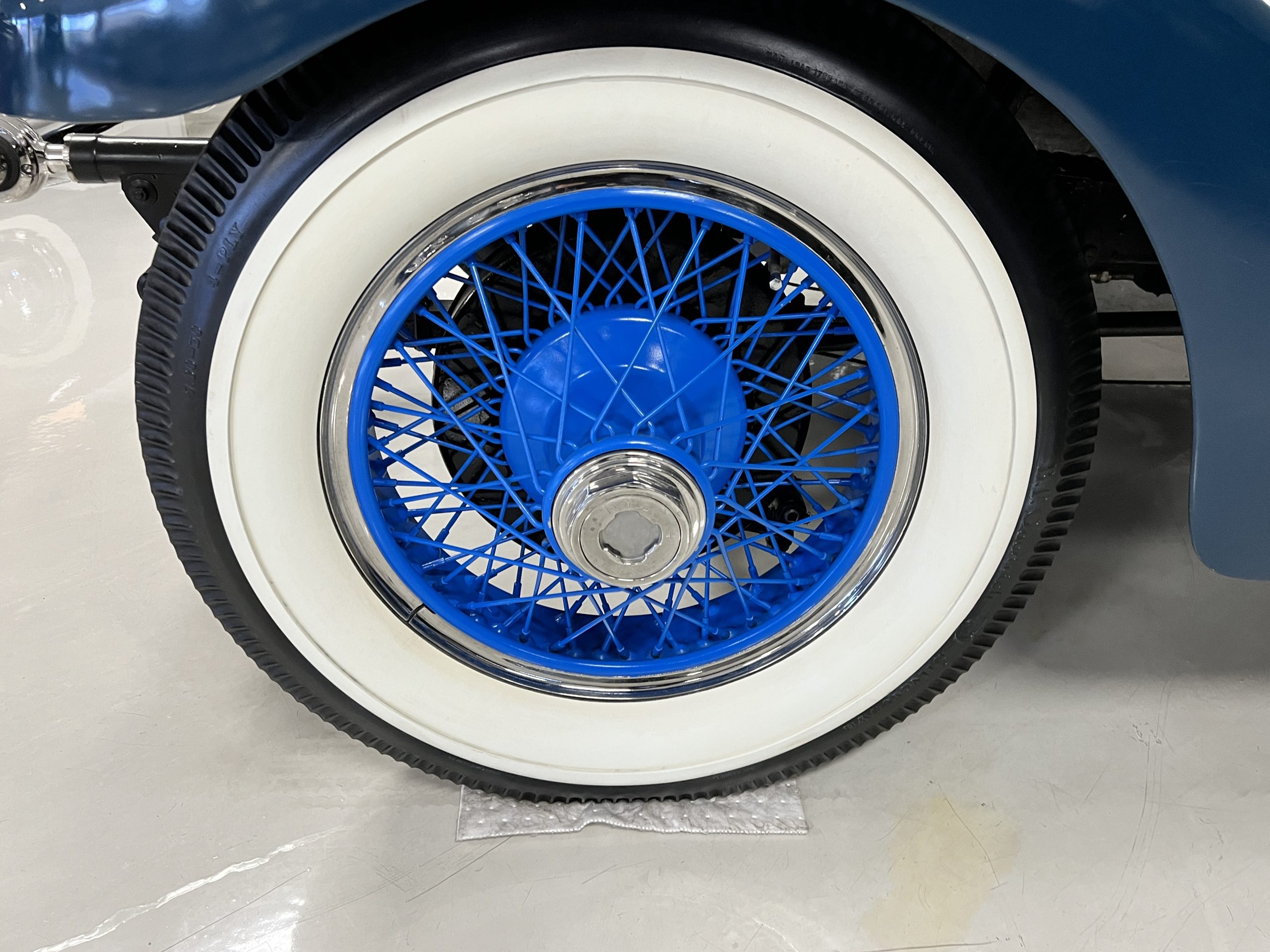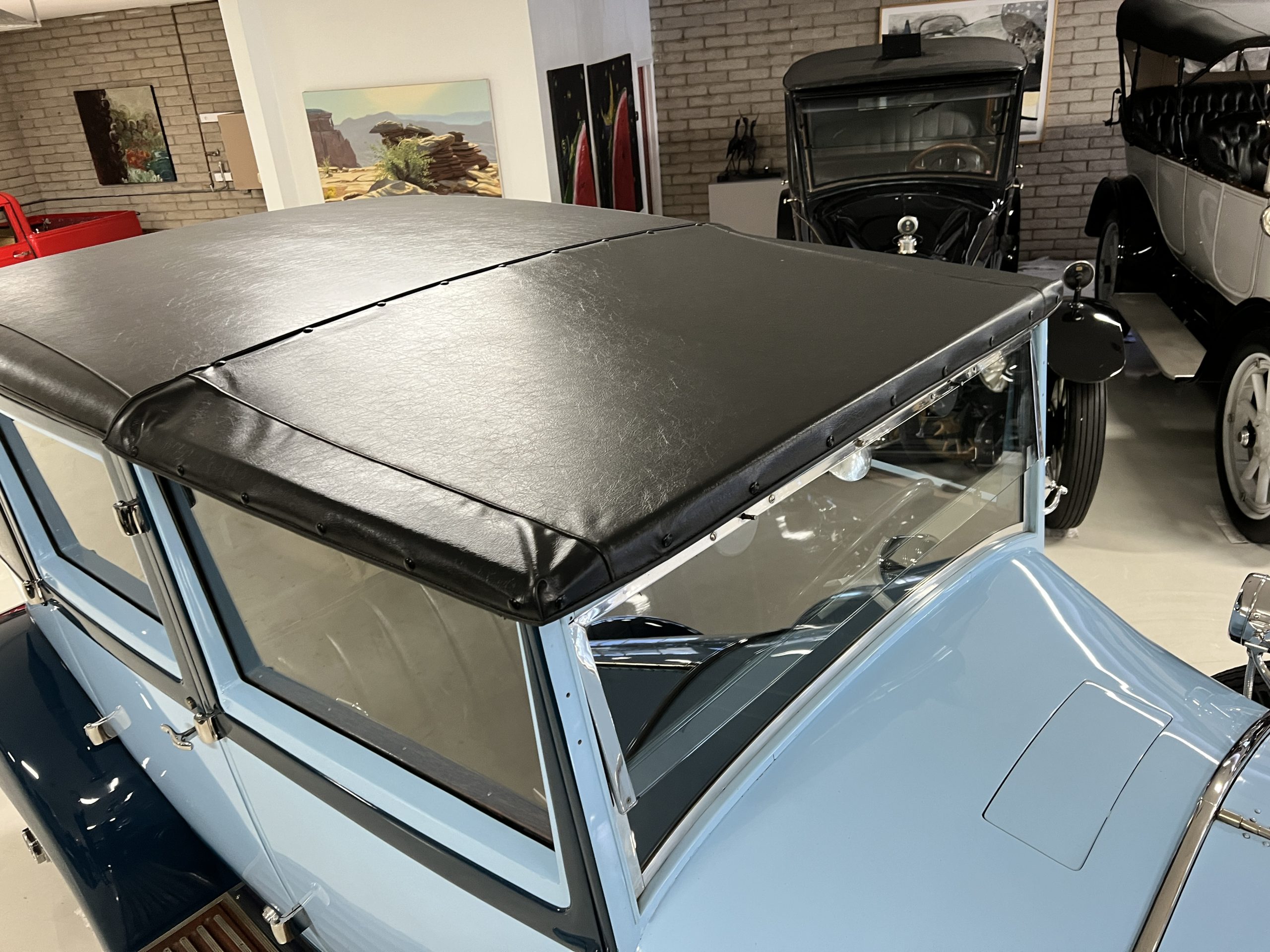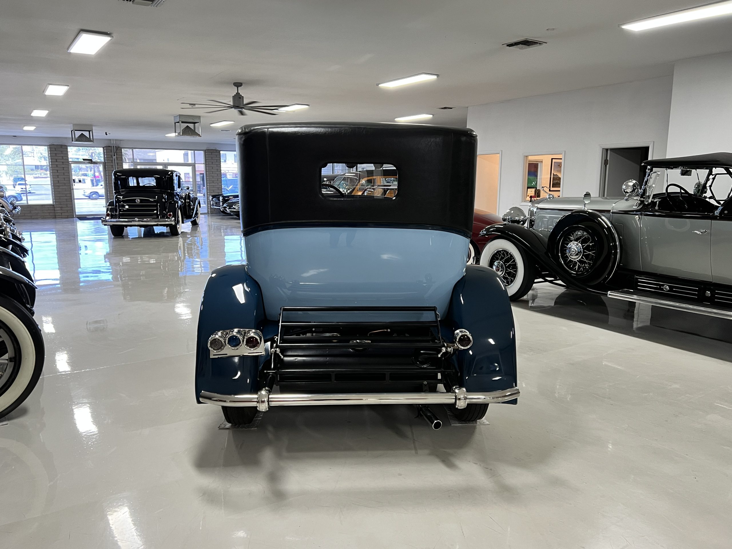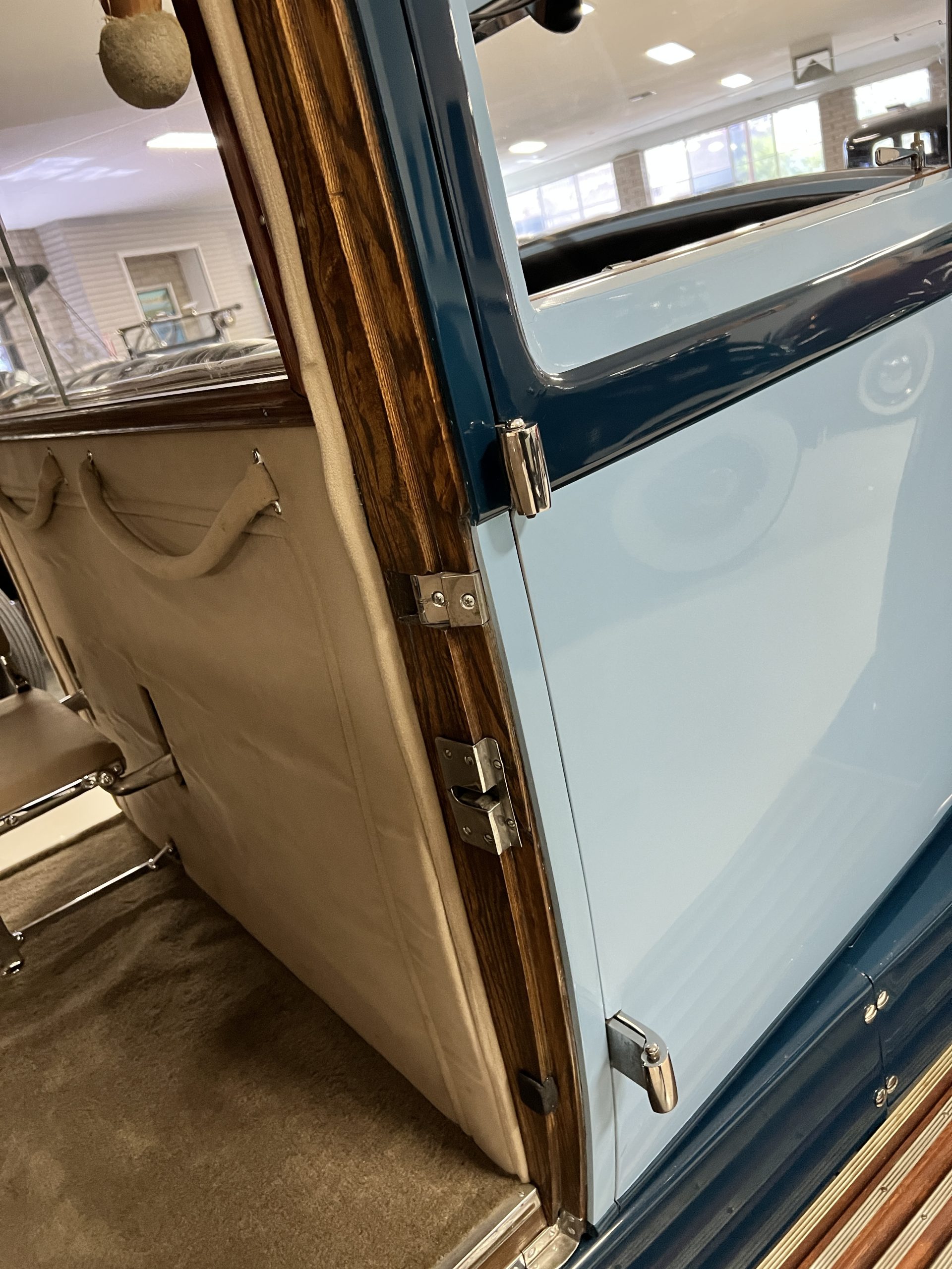 EXTERIOR: The livery is an elegant two-tone blue that is in overall nice enough for most concours events but what we refer to as touring quality. The paint presents itself with very nice shine and luster but has many small touched up chips and a few small cracks. The chrome has largely been redone and in very good to excellent condition with some signs of wear. The black vinyl top looks correct and in very nice condition. The original trunk with three fitted suitcases is still original and in beautiful condition. The glass is all excellent having been replaced during the restoration.