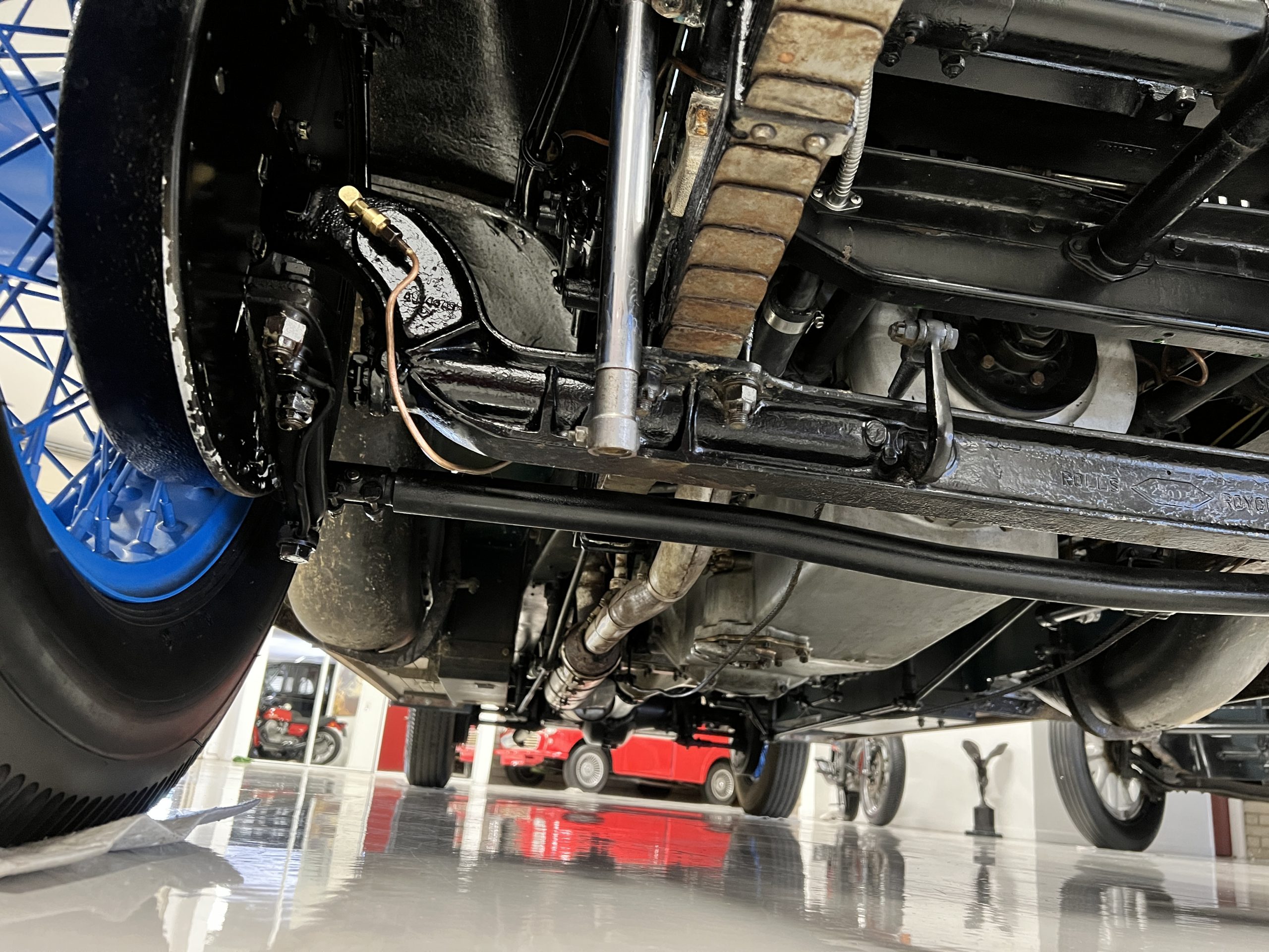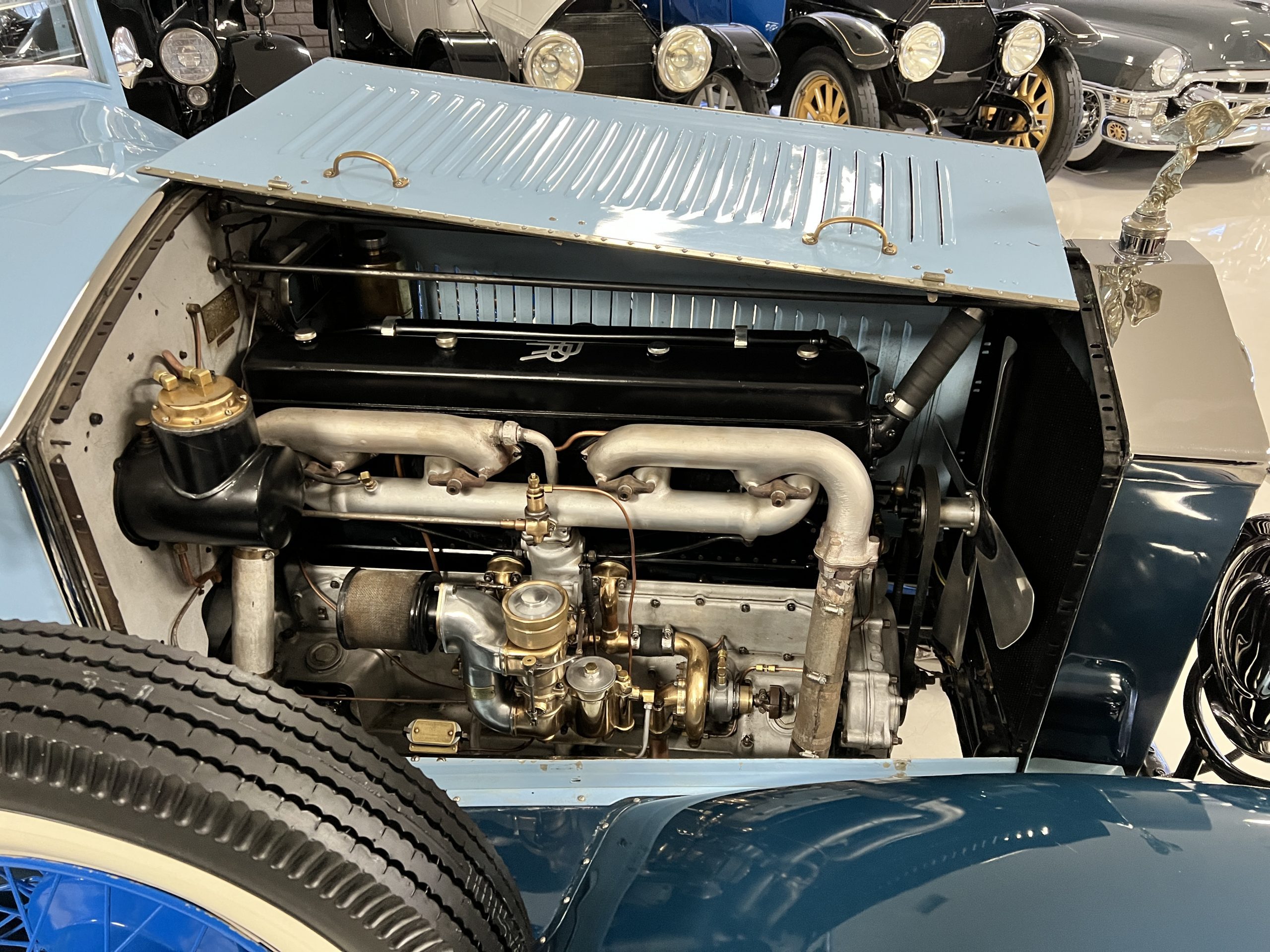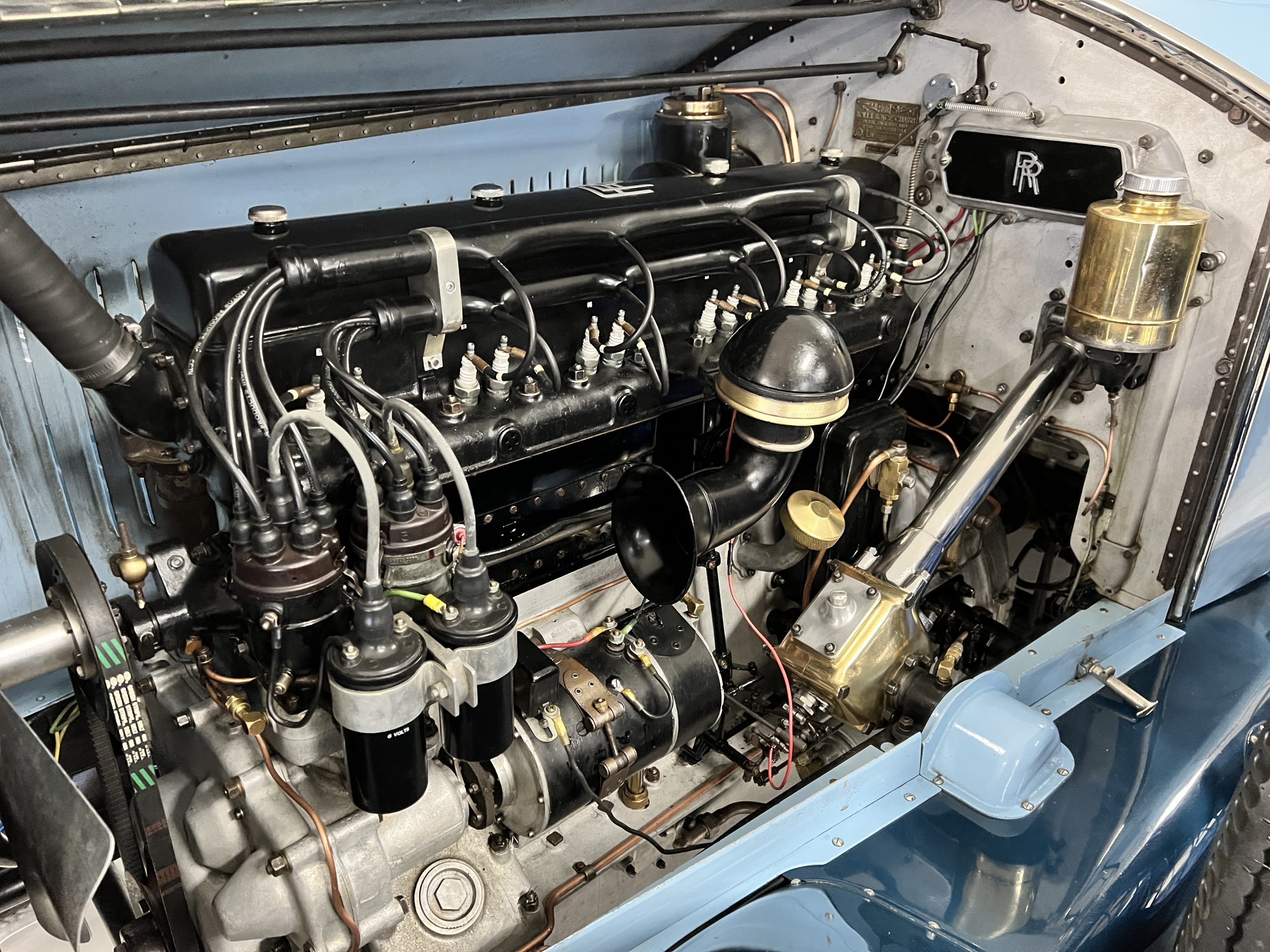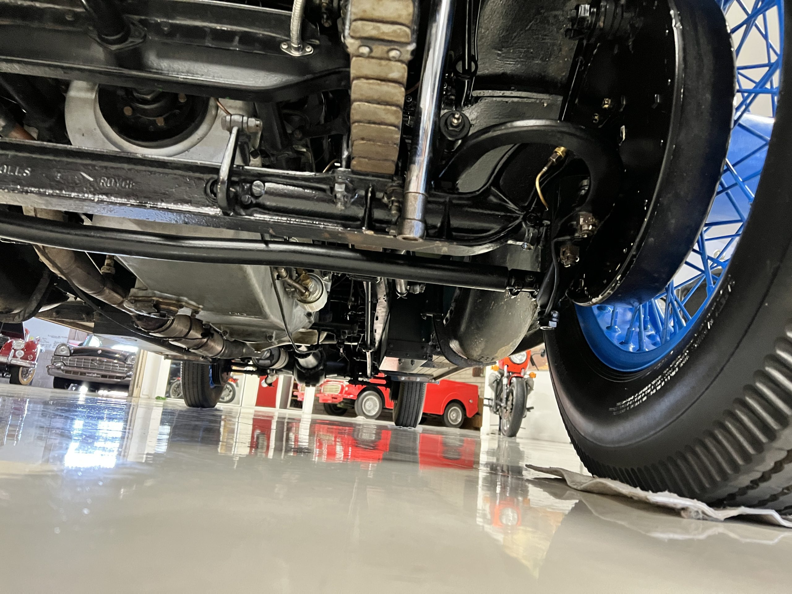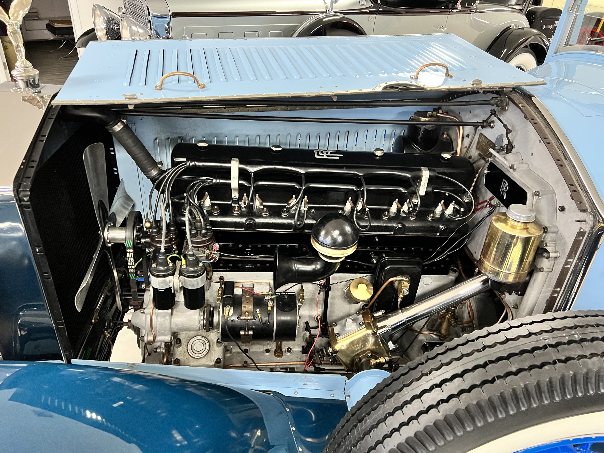 DRIVETRAIN: The engine and engine compartment are very impressive and in beautiful condition. The engine was replaced with a correct series SPI 7,668 cc six-cylinder inline engine with its 4-speed transmission (Engine No. 23006). The gauges all appear to work well including the speedometer, oil pressure, temperature, amp meter and fuel gauge. The clock is not working but is correct and original to the car. The drivetrain was completely restored during the restoration including the engine, transmission, suspension, Bjur lubrication, radiator, etc. The chassis is well detailed for a tour car and appropriate for show. The Phantom drives very well with cool operating temperatures and great oil pressure. We have serviced the oil, lubricated the chassis and completely serviced the carburetor.
