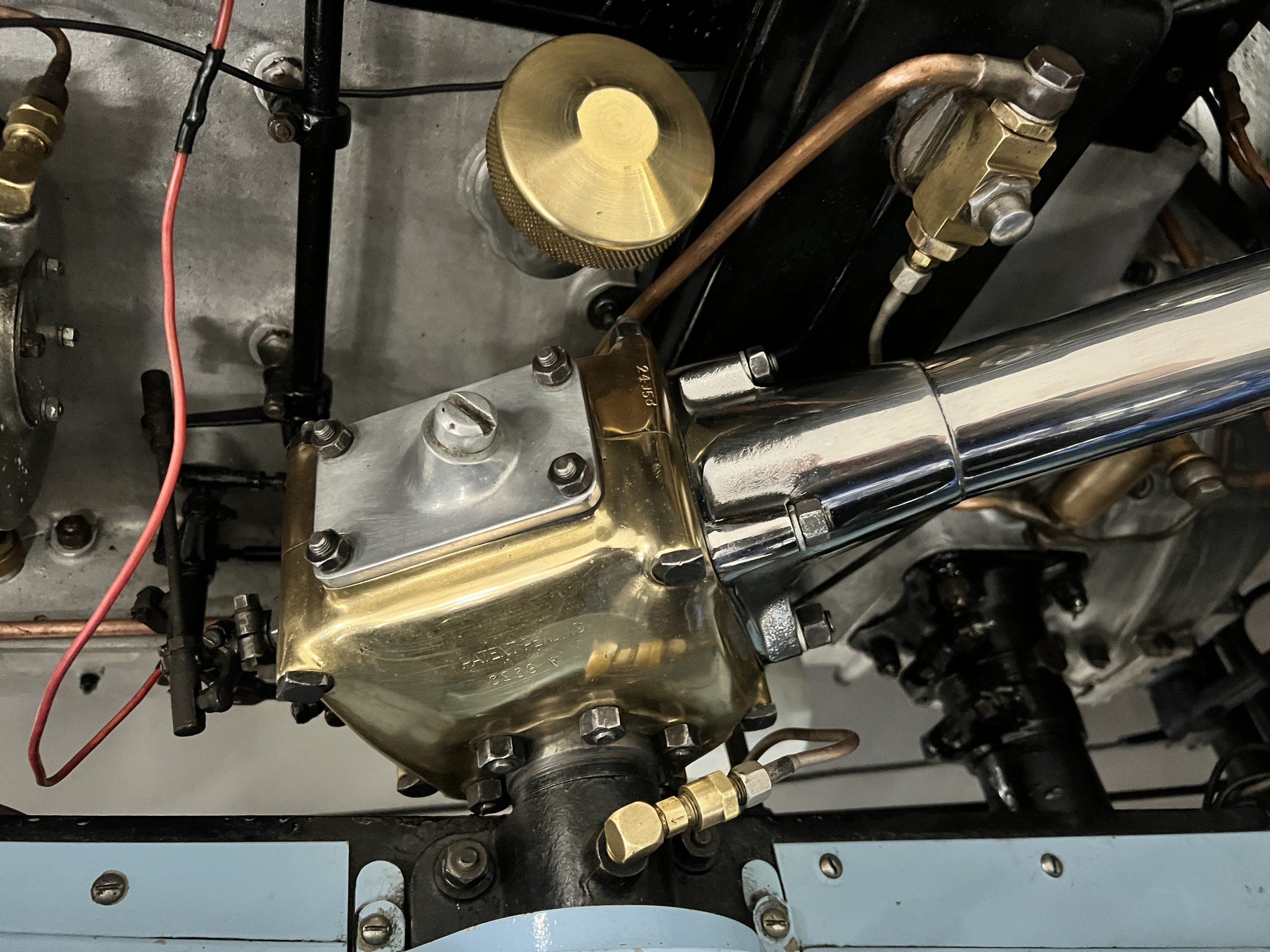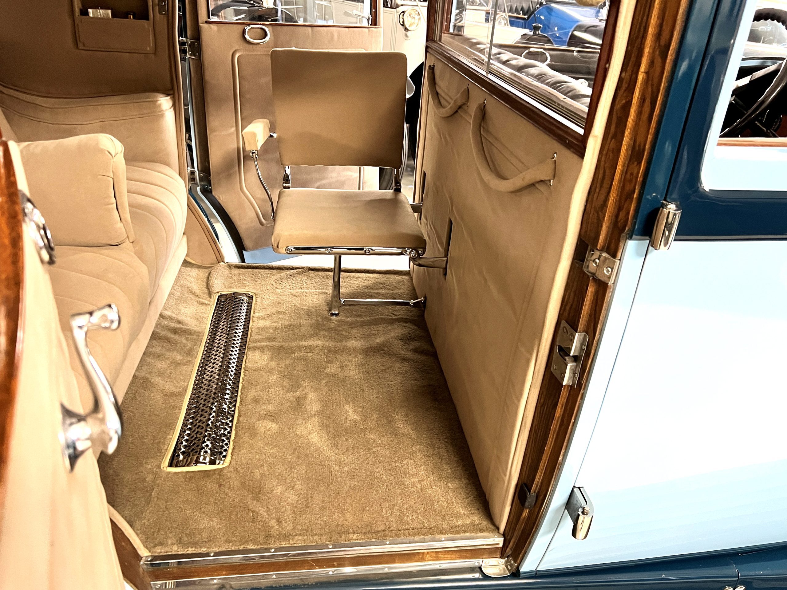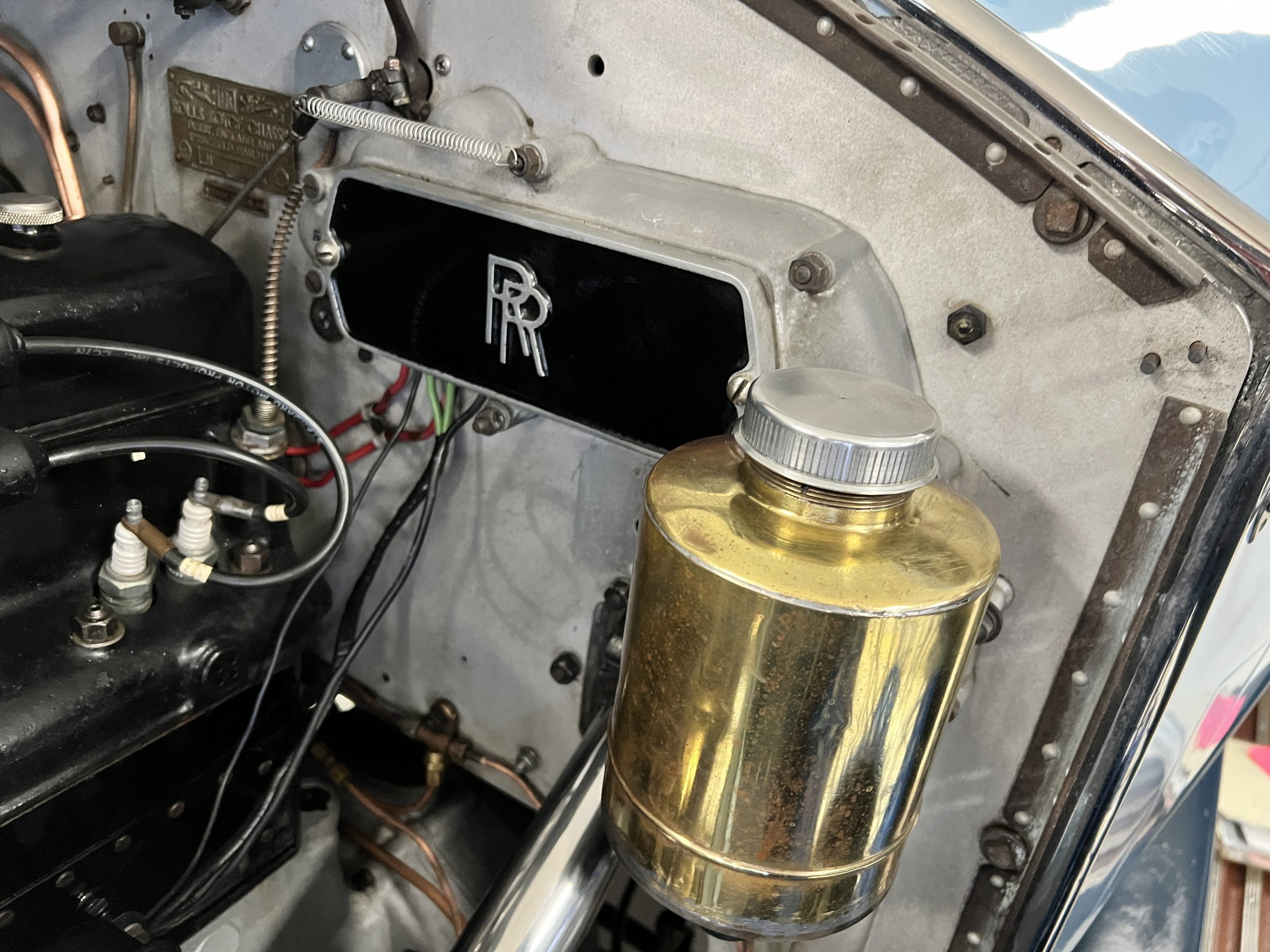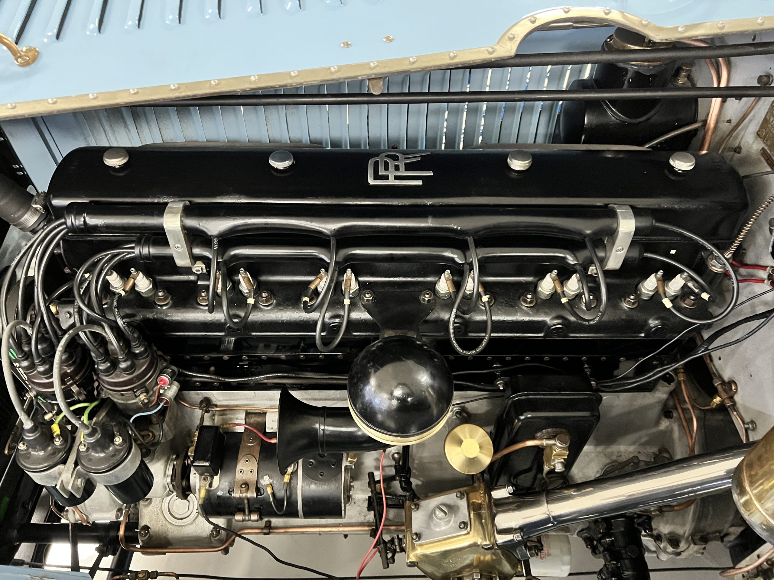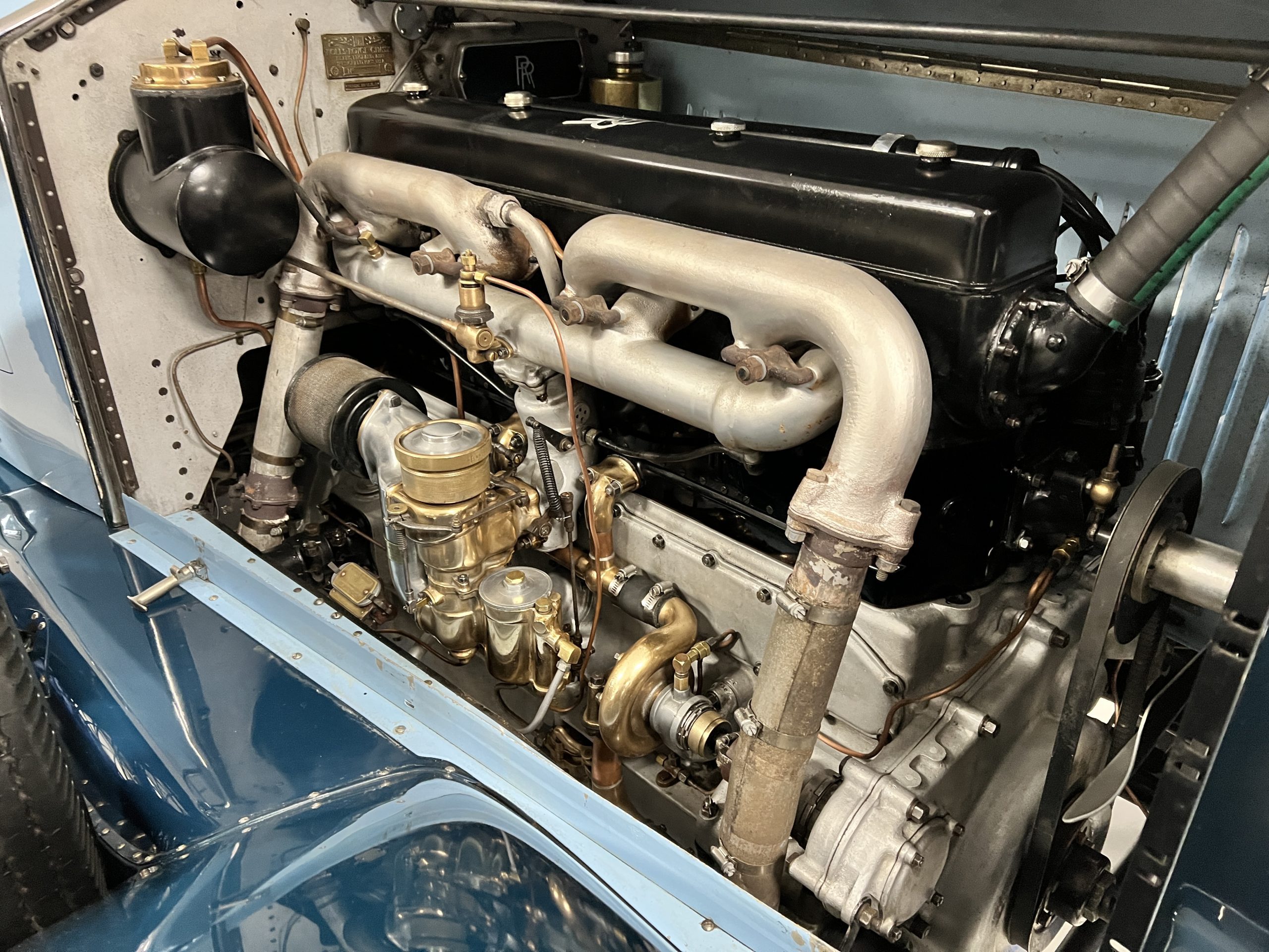 DRIVETRAIN: The engine and engine compartment are very impressive and in beautiful condition. The engine was replaced with a correct series SPI 7,668 cc six-cylinder inline engine with its 4-speed transmission (Engine No. 23006). The gauges all appear to work well including the speedometer, oil pressure, temperature, amp meter and fuel gauge. The clock is not working but is correct and original to the car. The drivetrain was completely restored during the restoration including the engine, transmission, suspension, Bjur lubrication, radiator, etc. The chassis is well detailed for a tour car and appropriate for show. The Phantom drives very well with cool operating temperatures and great oil pressure. We have serviced the oil, lubricated the chassis and completely serviced the carburetor.