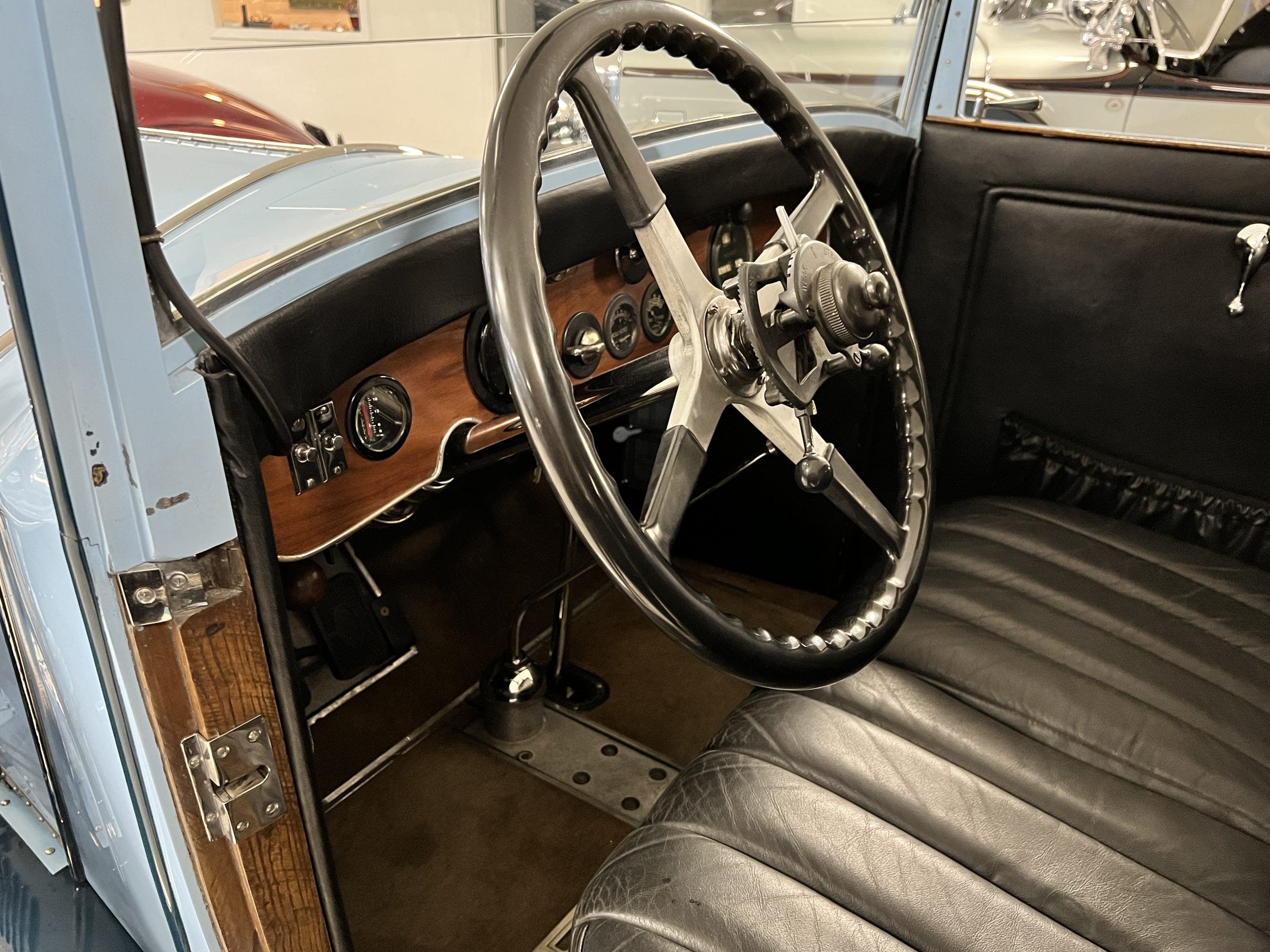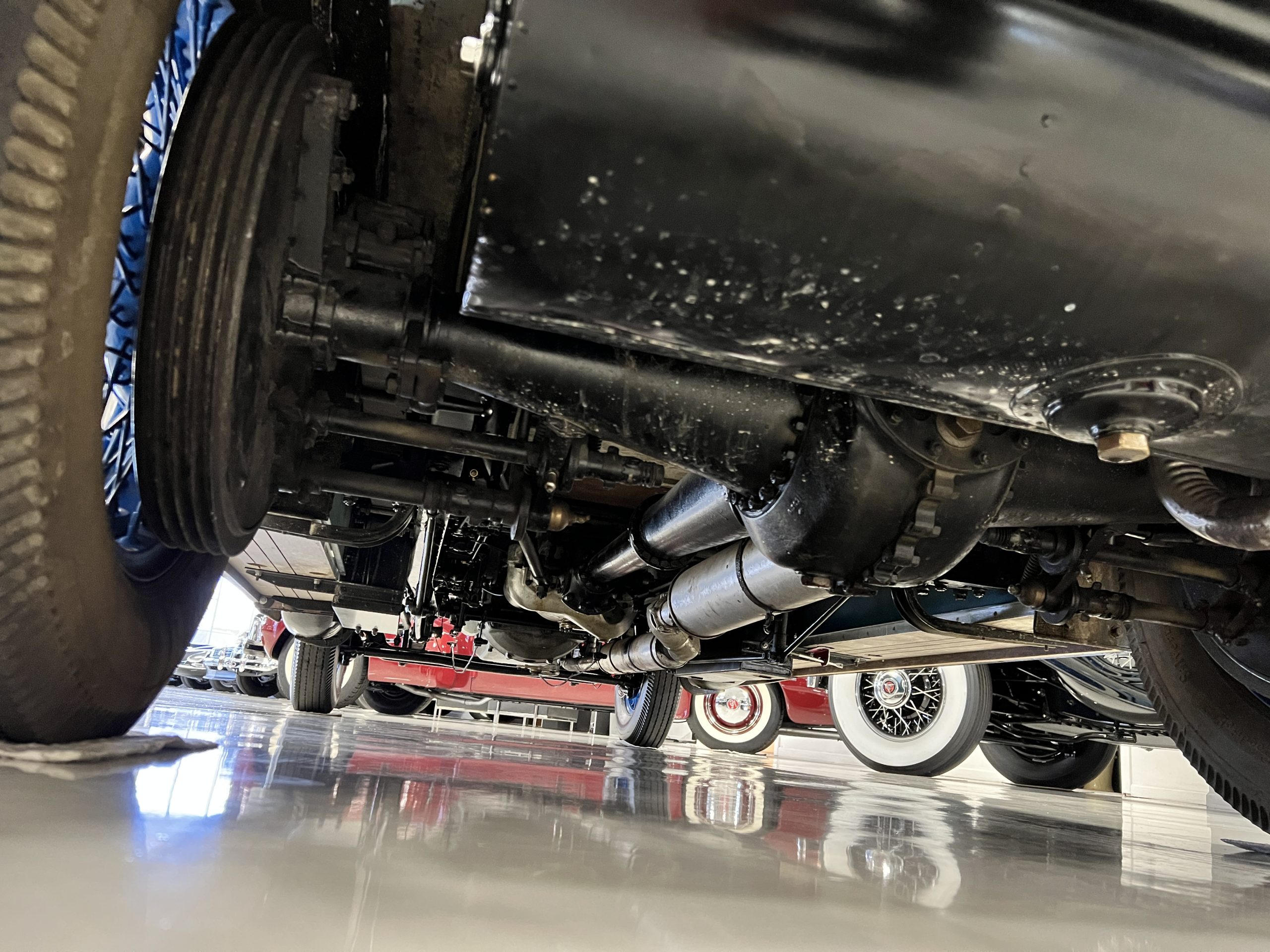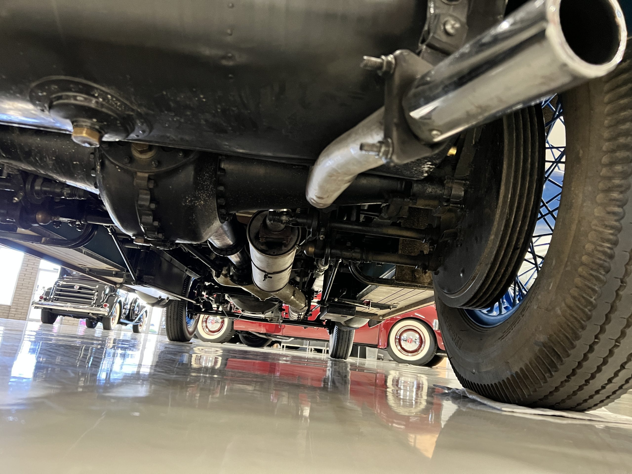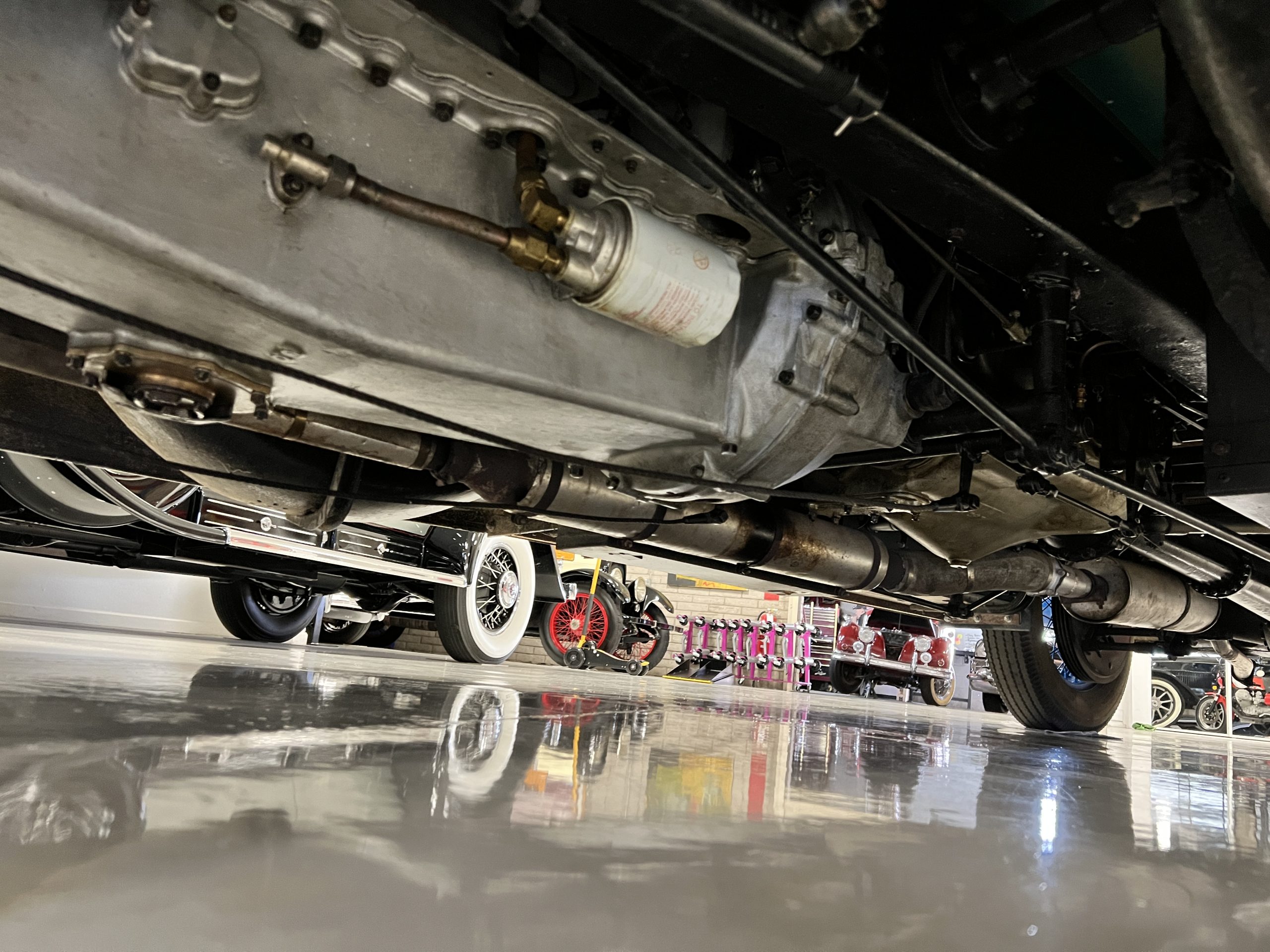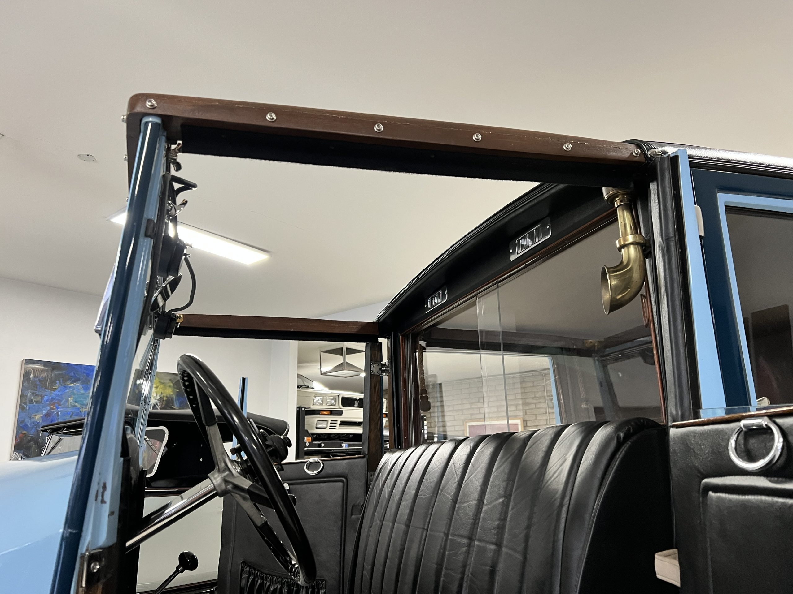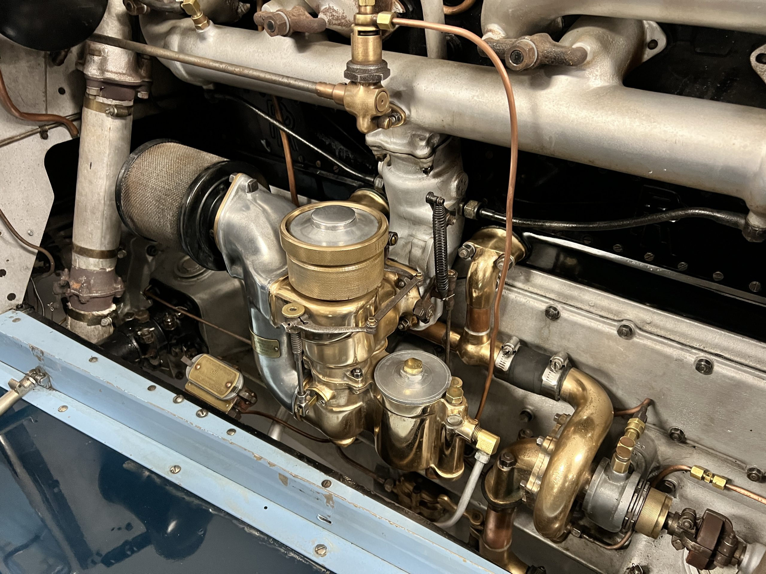 DRIVETRAIN: The engine and engine compartment are very impressive and in beautiful condition. The engine was replaced with a correct series SPI 7,668 cc six-cylinder inline engine with its 4-speed transmission (Engine No. 23006). The gauges all appear to work well including the speedometer, oil pressure, temperature, amp meter and fuel gauge. The clock is not working but is correct and original to the car. The drivetrain was completely restored during the restoration including the engine, transmission, suspension, Bjur lubrication, radiator, etc. The chassis is well detailed for a tour car and appropriate for show. The Phantom drives very well with cool operating temperatures and great oil pressure. We have serviced the oil, lubricated the chassis and completely serviced the carburetor.