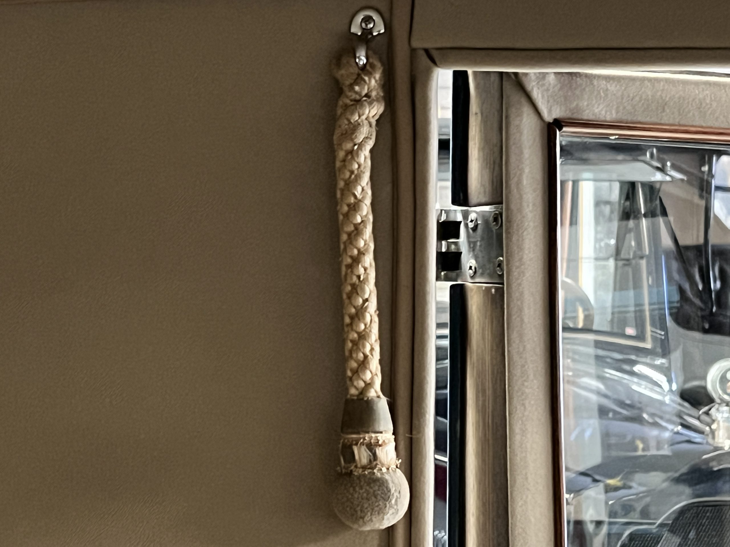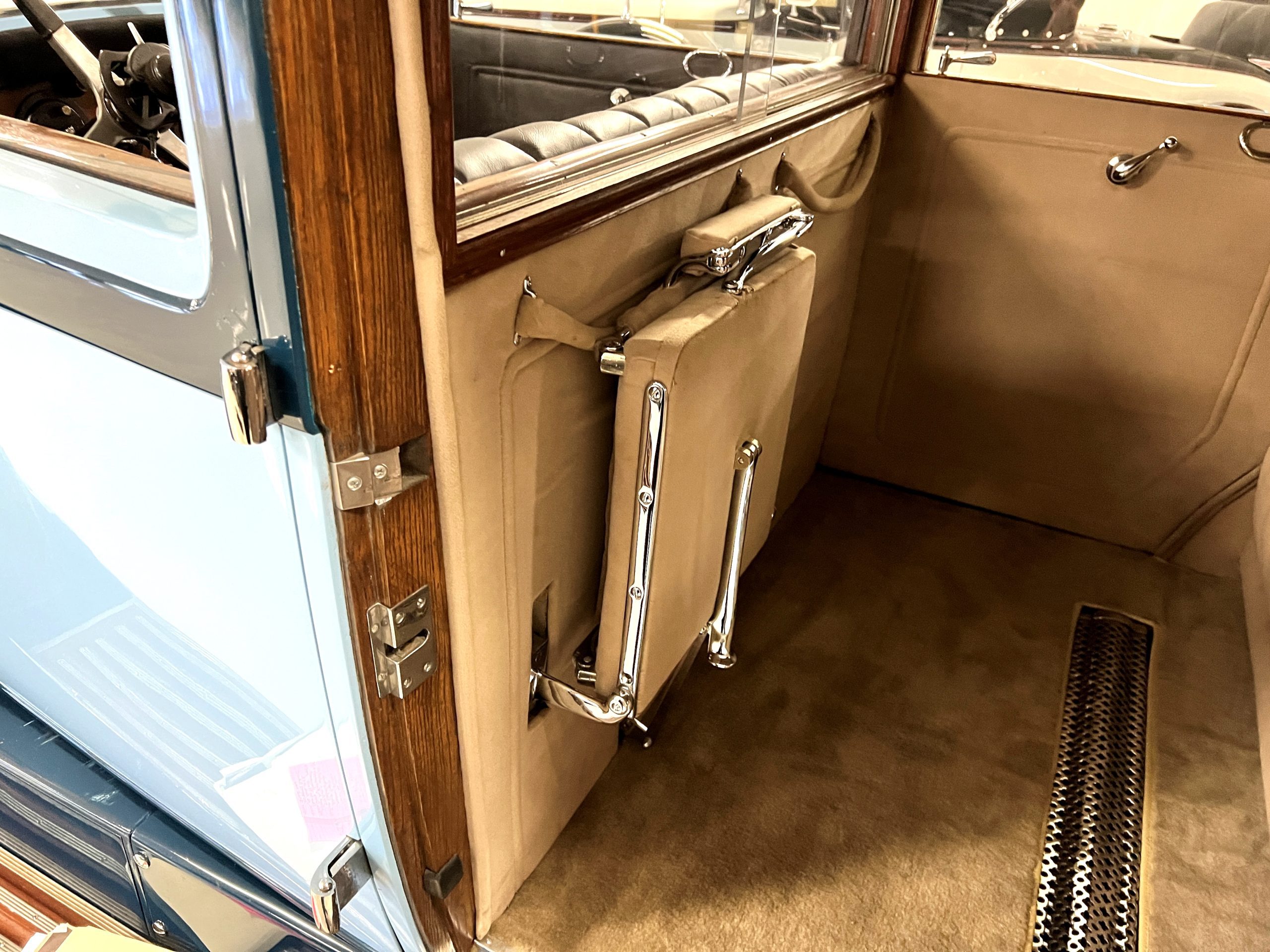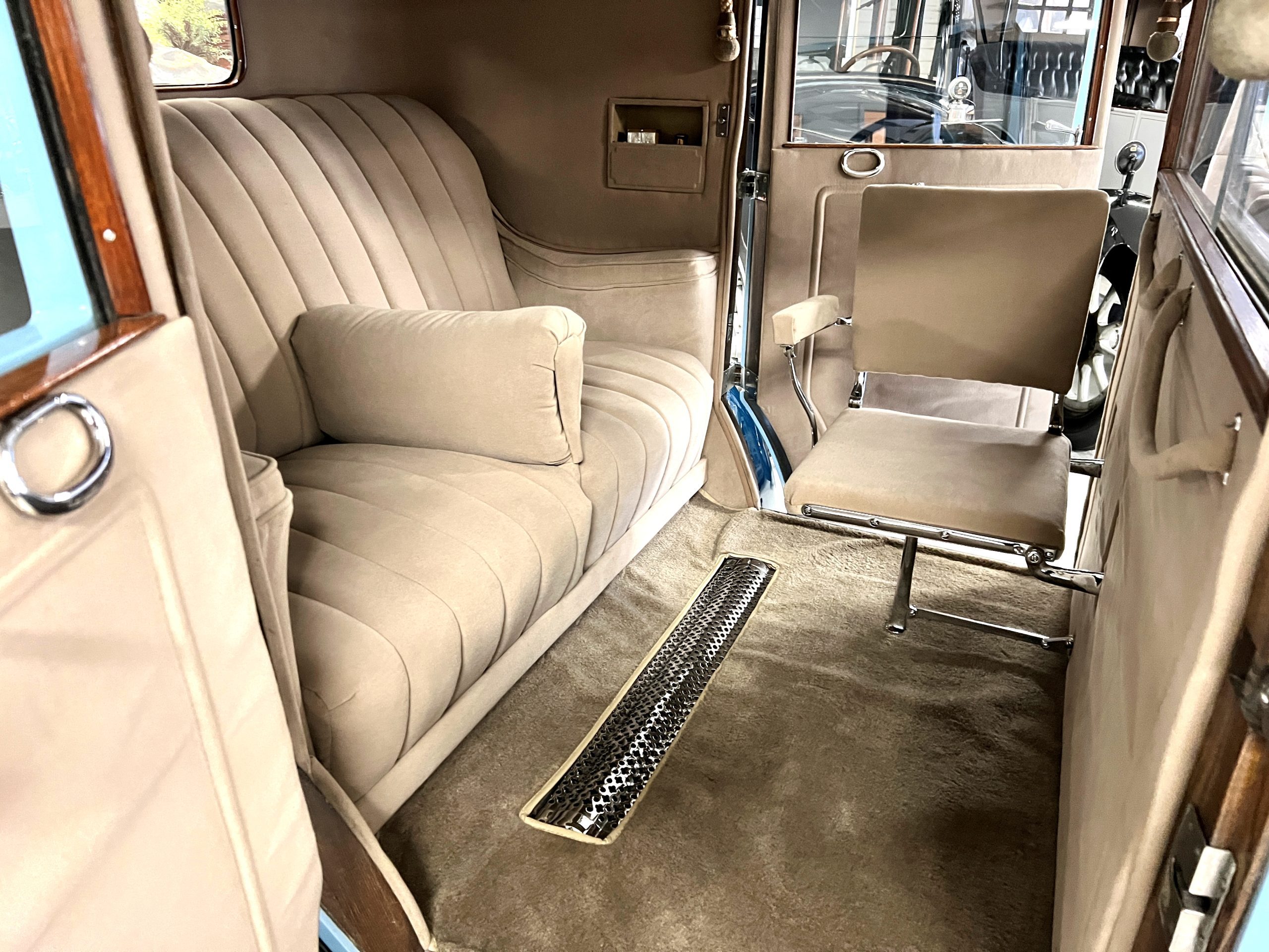 INTERIOR: The chauffeur’s compartment of the interior is black leather that is in very nice condition. It is very correct and soft and supple. The dash is original and in very nice condition. There is carpet that appears to be original in front and it is in nice condition. The rear compartment is in tan wool broadcloth and features a full rear seat with a divider armrest and a full jump seat for one additional passenger. The tan carpeting is also wool and in very nice condition. S195FR was ordered with dual vanities and a cigar lighter and additionally has a Motor Dictograph and a sliding division window. The rear passenger area has two vanities which include a beautiful cigarette case, lighter, pen set, bottles and other items befitting such a car. The wood inside the passenger’s compartment is also in nice condition. Overall, the interior has a consistent patina with the rest of the Phantom I. It is very presentable and correct for touring and regional shows. S195FR comes with its original luggage trunk with three suitcases and its canvas cover, all in very nice original condition.