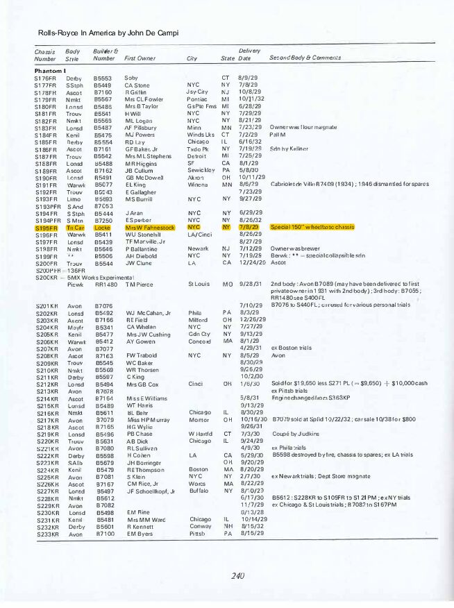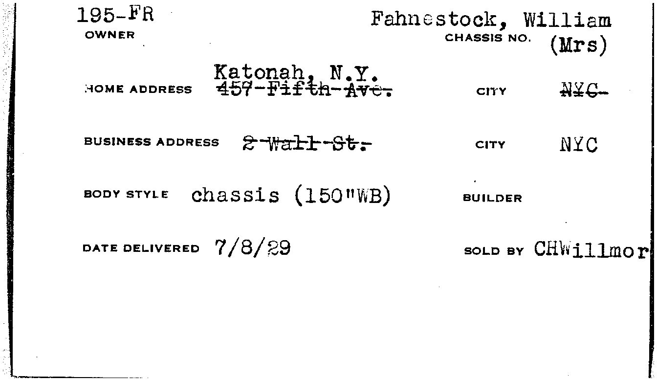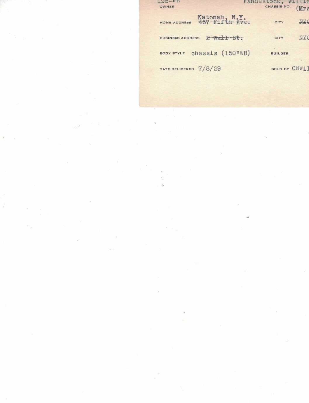 HISTORY: S195FR comes with a wonderful file history spanning its entire life. William Fahnestock ordered it from his office at 2 Wall Street and their Manhattan home at 457 Fifth Ave. According to the extensive correspondence between the Fahnestock’s and Rolls-Royce of America, S195FR was custom ordered to be a special long wheelbase of 150 inches. This was because S195FR was replacing their 1914 Silver Ghost (37CD), which had its 151 ½ inch wheelbase. 37CD was used as a trade in while specifying that they could continue enjoying it until S195FR was delivered. Ultimately, Rolls-Royce built S195FR as a special order 148 ½ inch wheelbase (according to letters the front axle was moved back 1.5 inches), which is likely a unique specification.