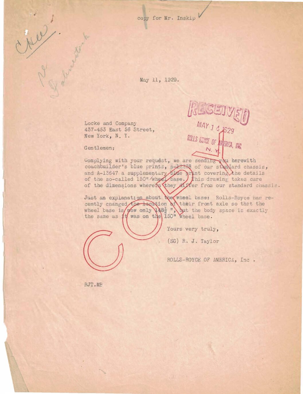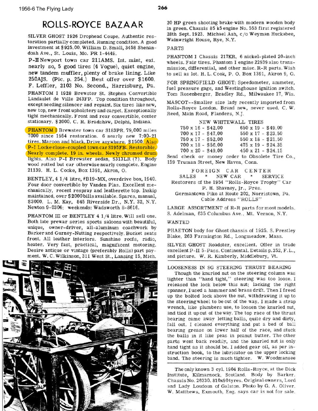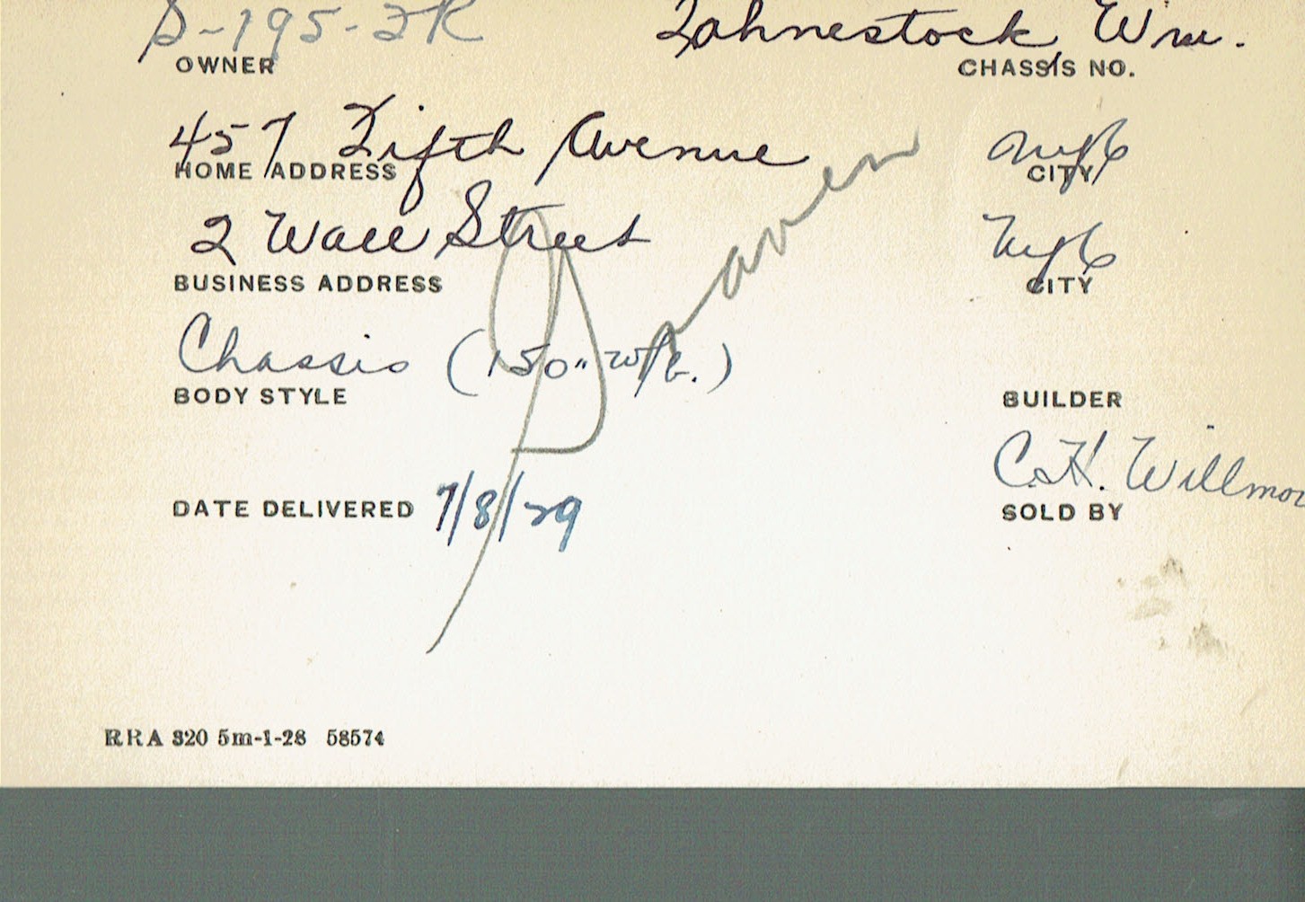 HISTORY: S195FR comes with a wonderful file history spanning its entire life. William Fahnestock ordered it from his office at 2 Wall Street and their Manhattan home at 457 Fifth Ave. According to the extensive correspondence between the Fahnestock’s and Rolls-Royce of America, S195FR was custom ordered to be a special long wheelbase of 150 inches. This was because S195FR was replacing their 1914 Silver Ghost (37CD), which had its 151 ½ inch wheelbase. 37CD was used as a trade in while specifying that they could continue enjoying it until S195FR was delivered. Ultimately, Rolls-Royce built S195FR as a special order 148 ½ inch wheelbase (according to letters the front axle was moved back 1.5 inches), which is likely a unique specification.