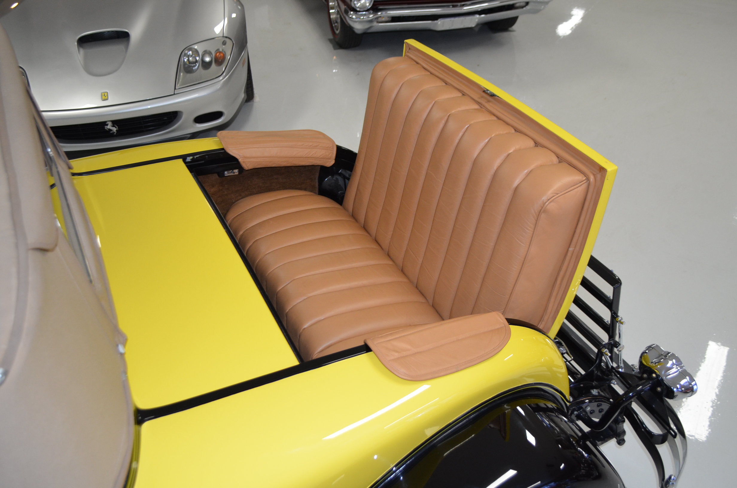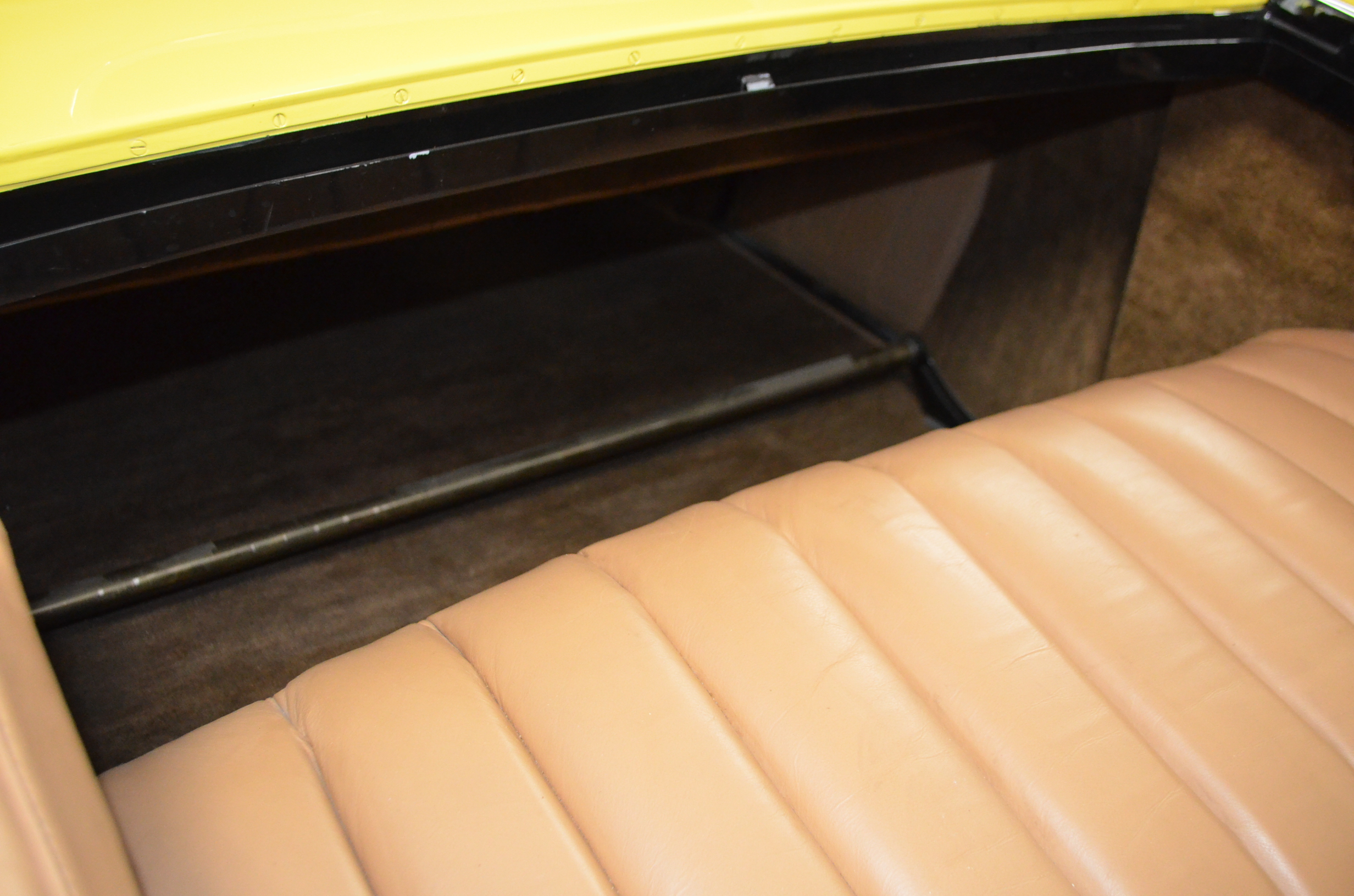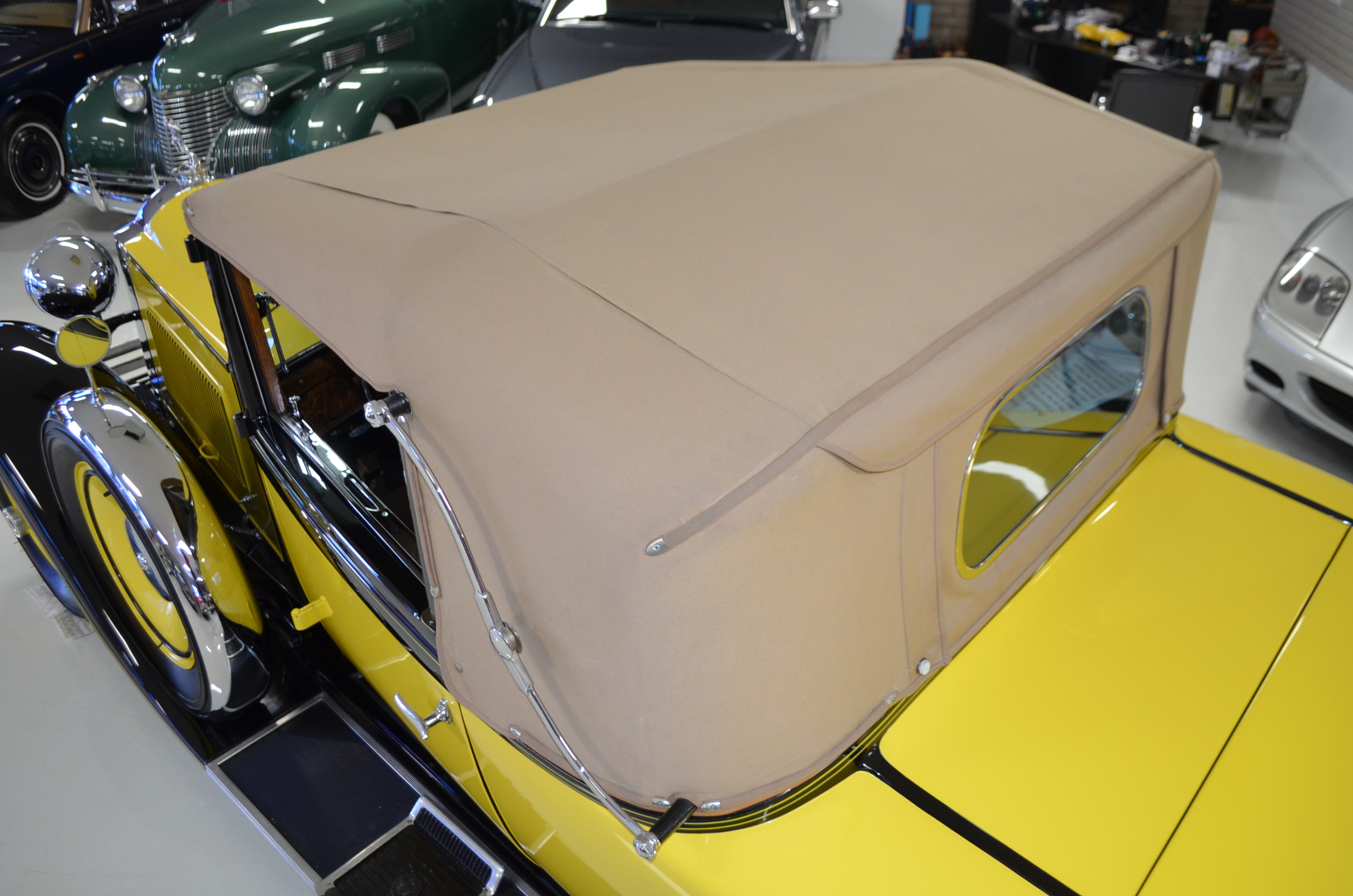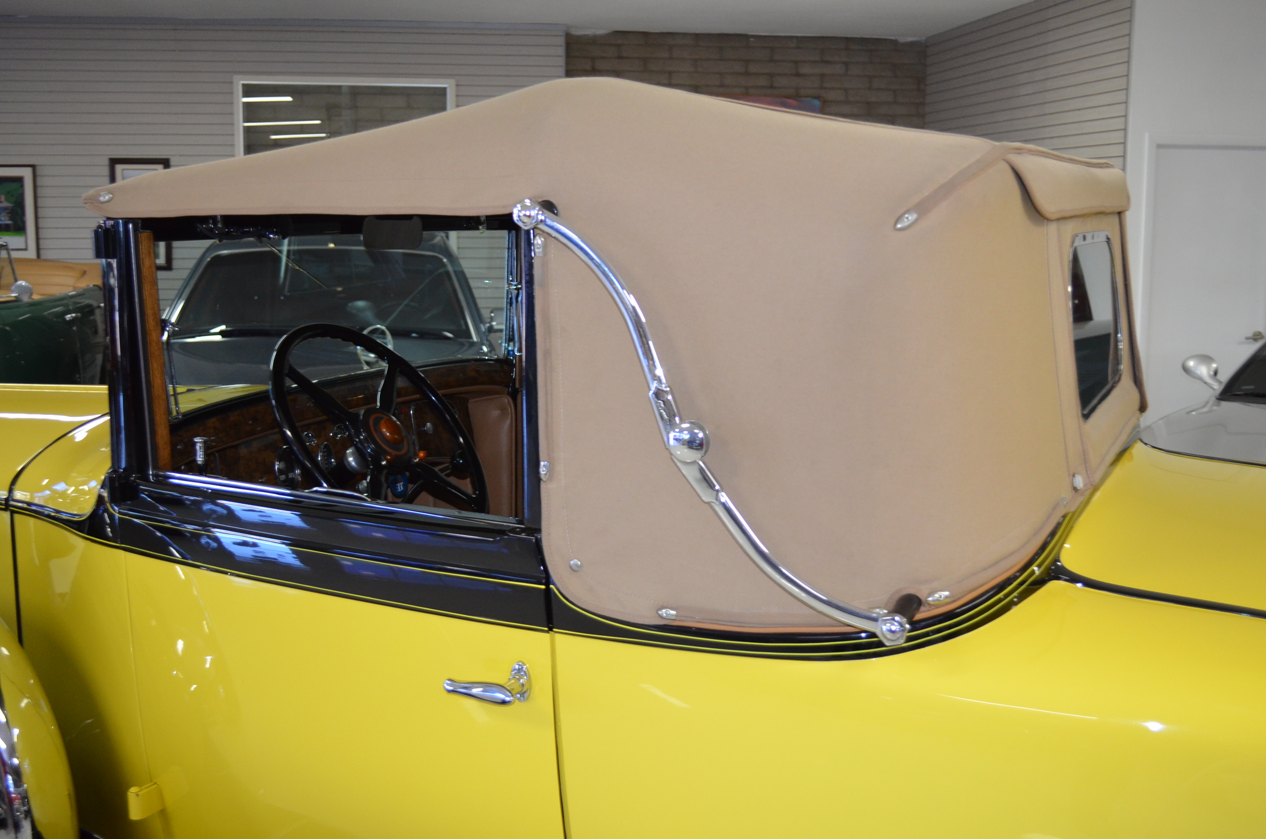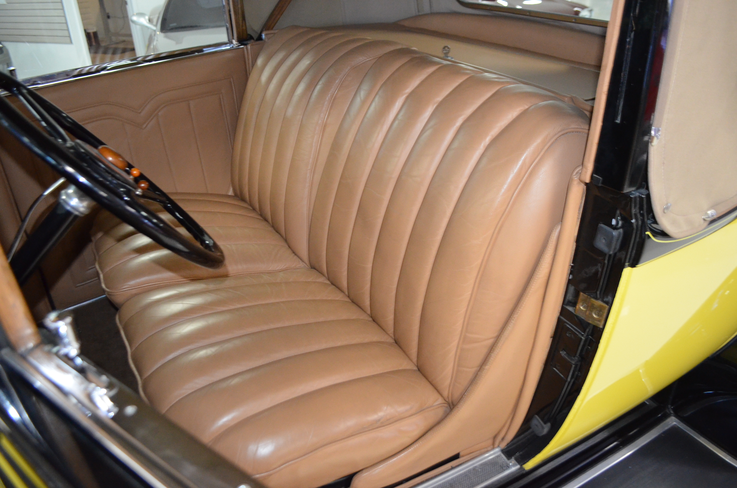 The interior is replete with tan leather that is as-new, being soft and supple. The woodgraining, interior instrumentation and details are also excellent. The rumble seat appears never to have been used and the carpet and trim as well as the tan leather are all excellent. The tan Haartz cloth canvas convertible top is in very good condition and folds down in a few minutes. There are minor scuff marks where the rumble seat folds down, which is very normal even with limited use.