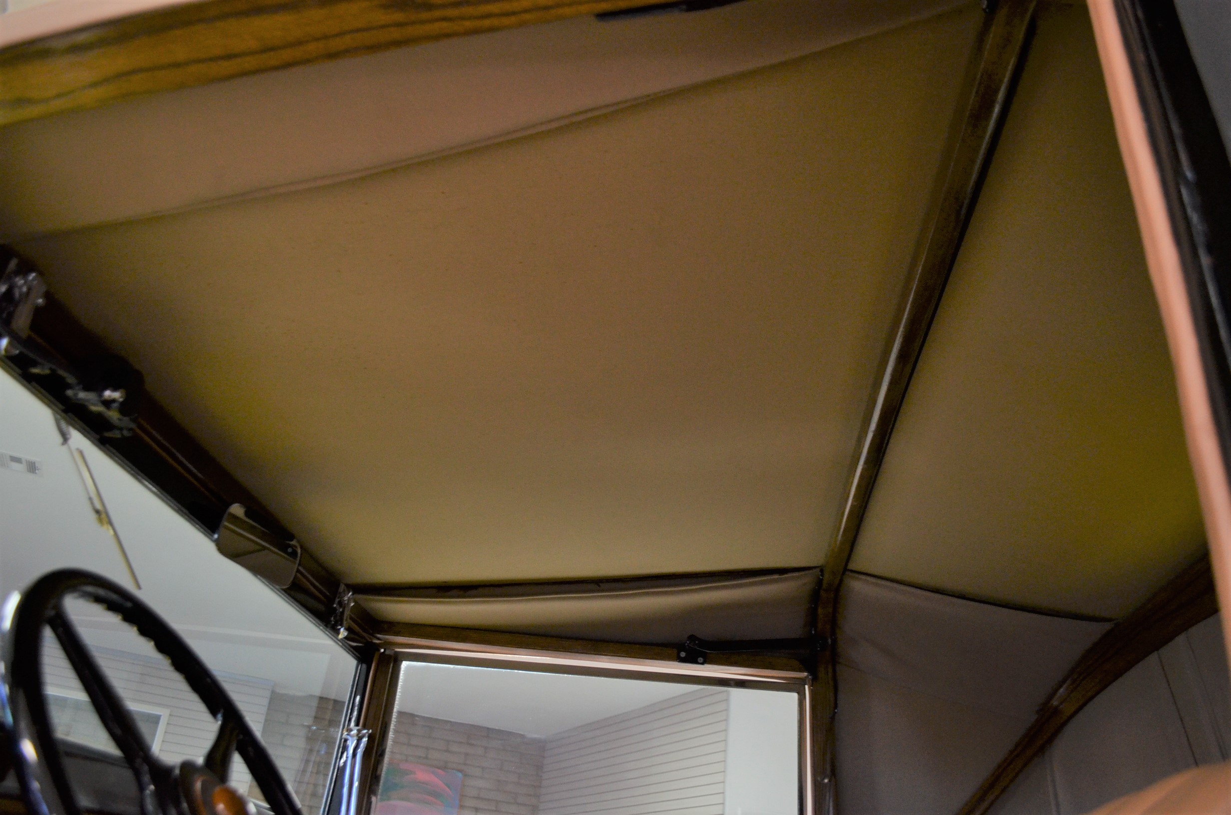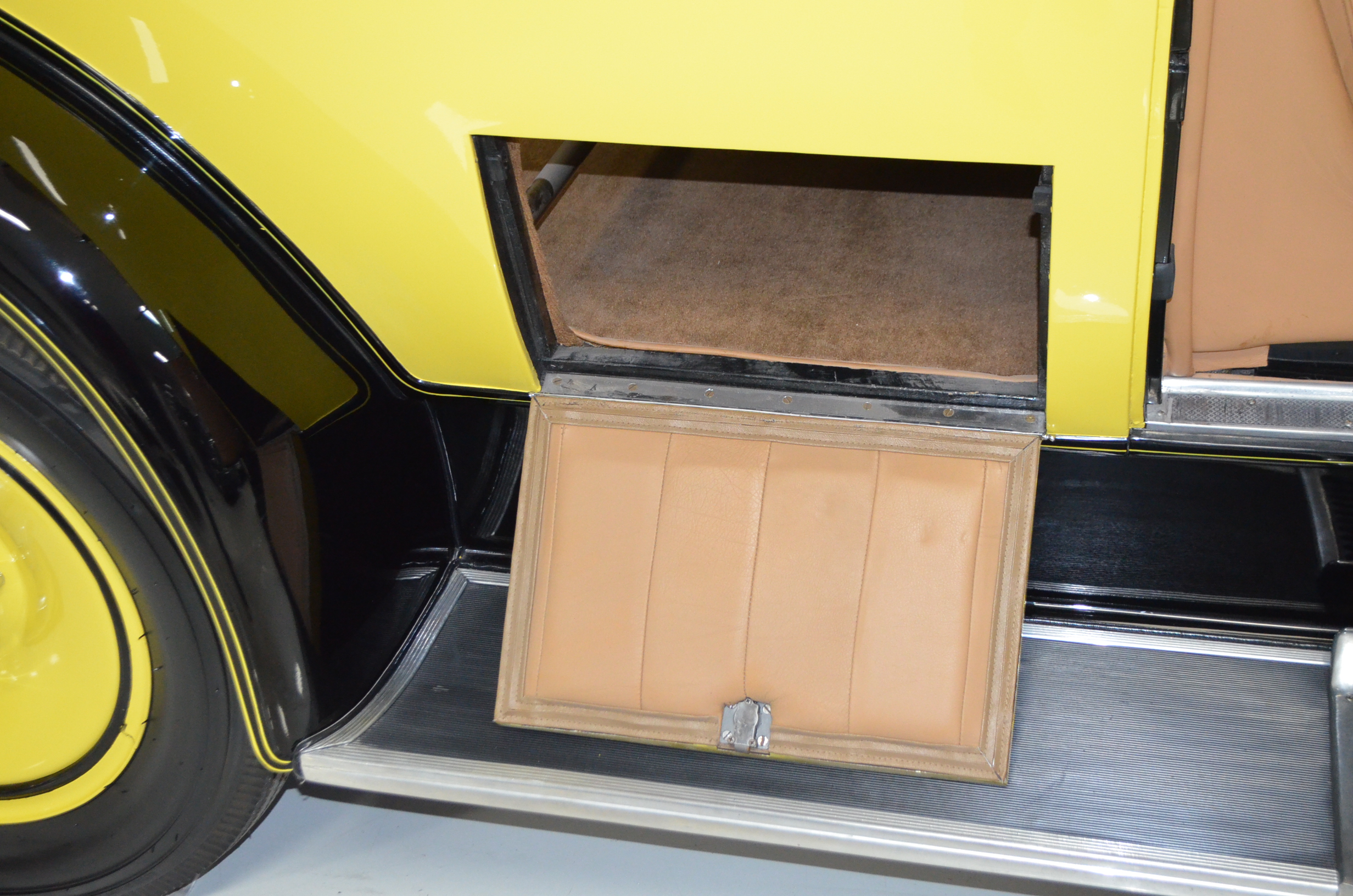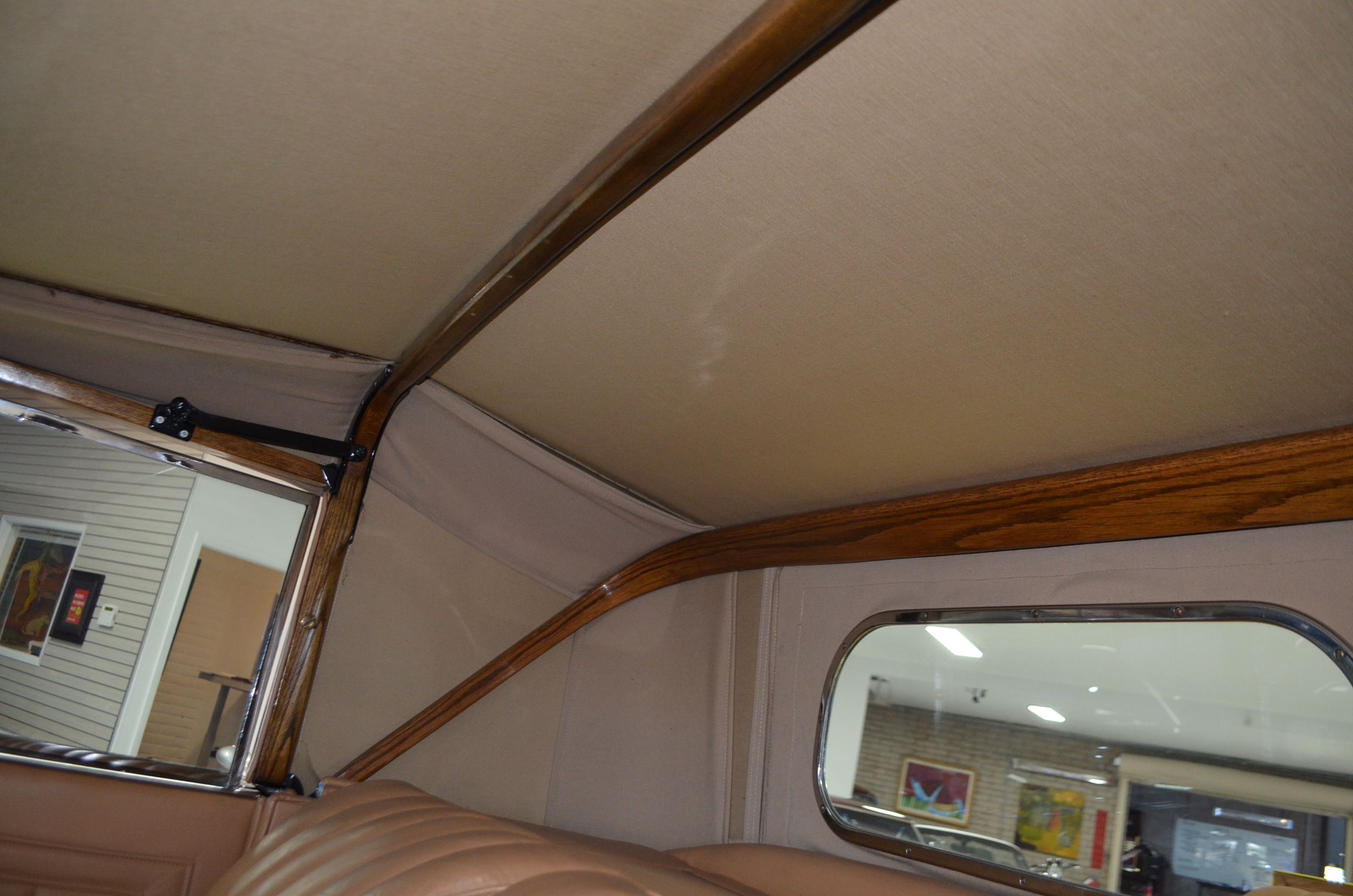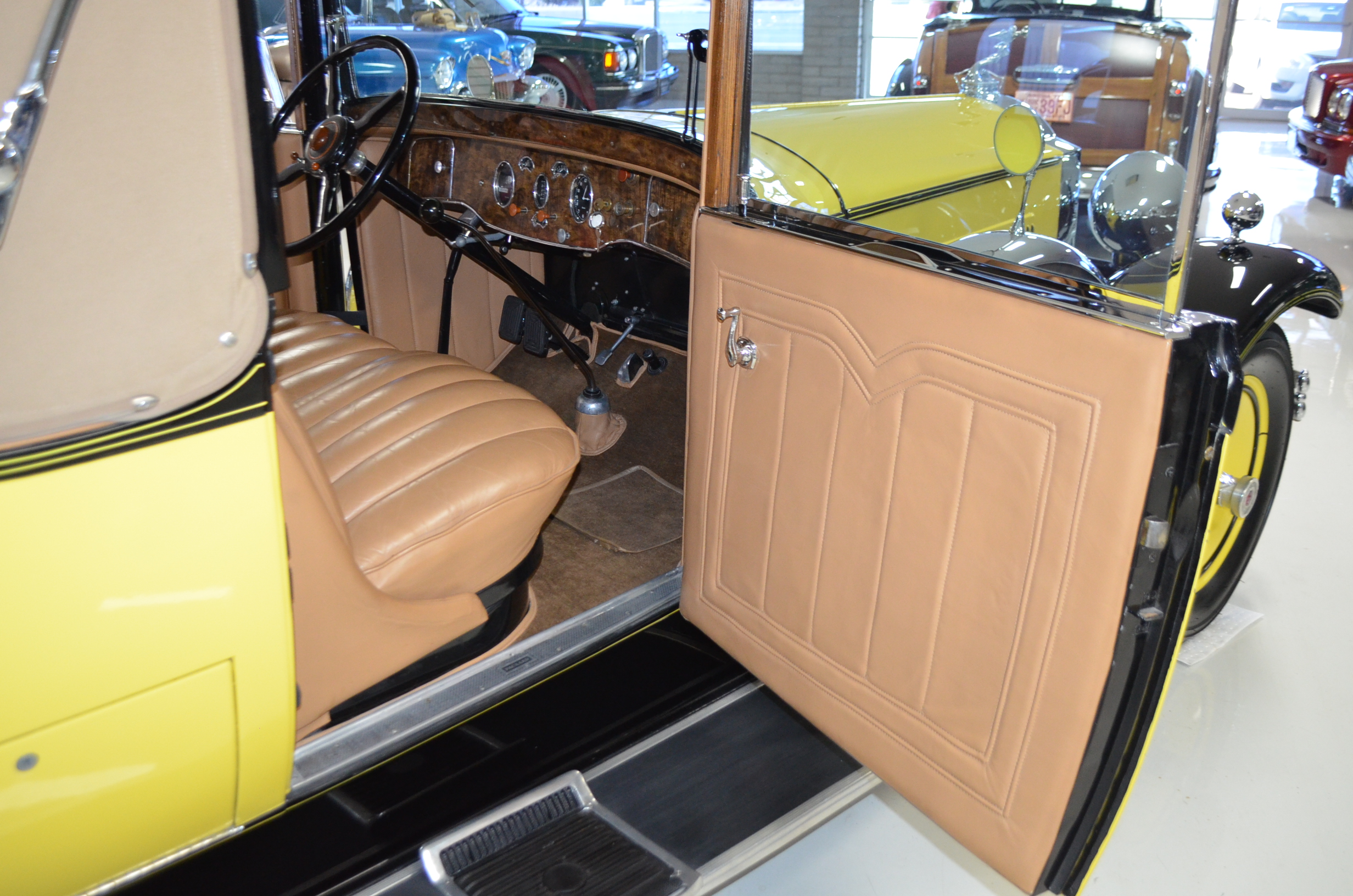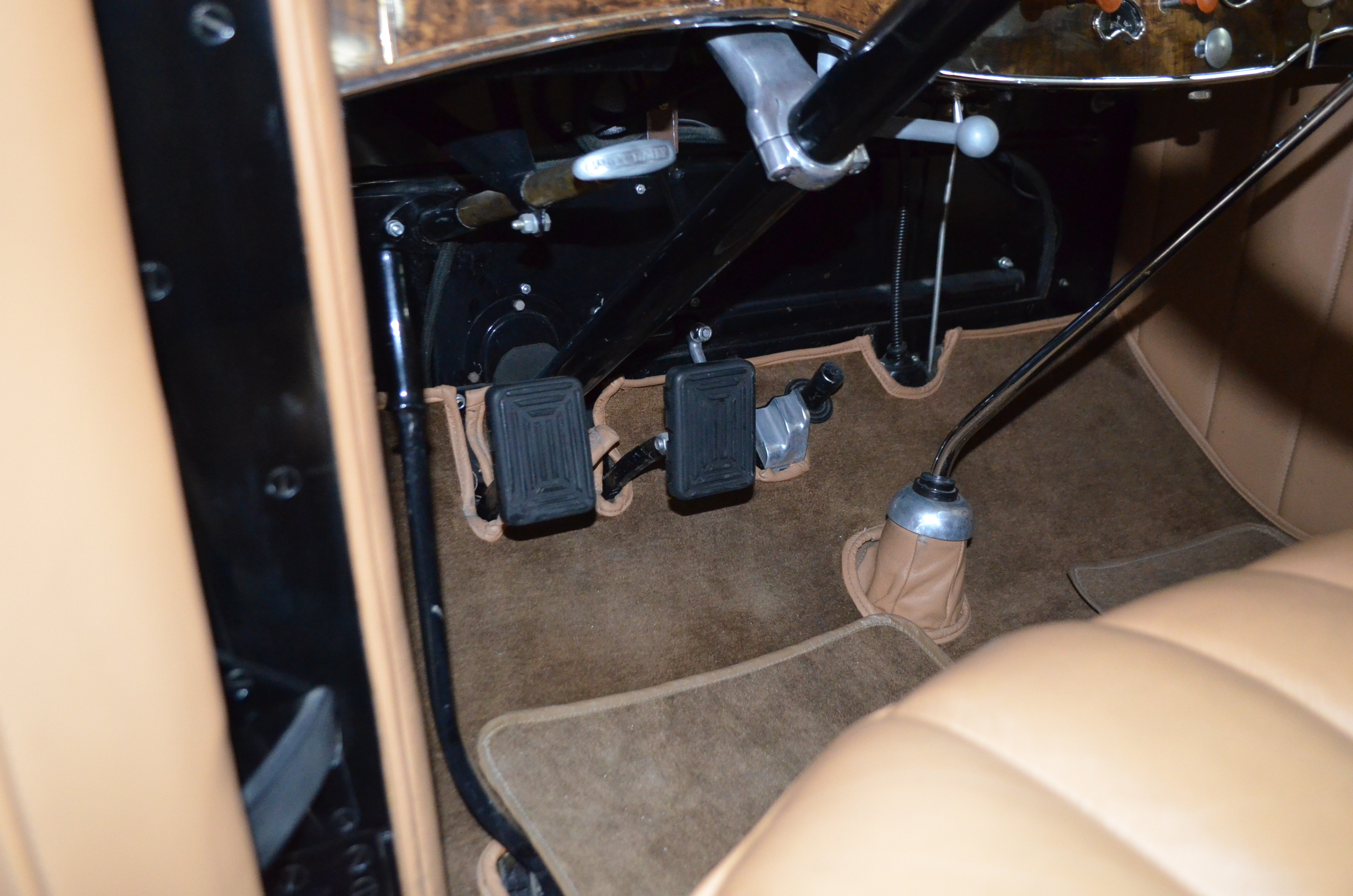 The interior is replete with tan leather that is as-new, being soft and supple. The woodgraining, interior instrumentation and details are also excellent. The rumble seat appears never to have been used and the carpet and trim as well as the tan leather are all excellent. The tan Haartz cloth canvas convertible top is in very good condition and folds down in a few minutes. There are minor scuff marks where the rumble seat folds down, which is very normal even with limited use.