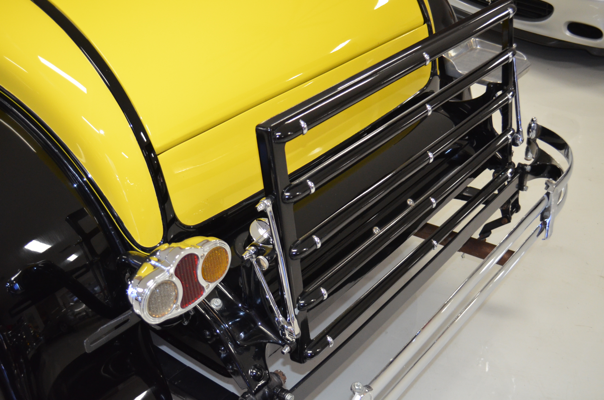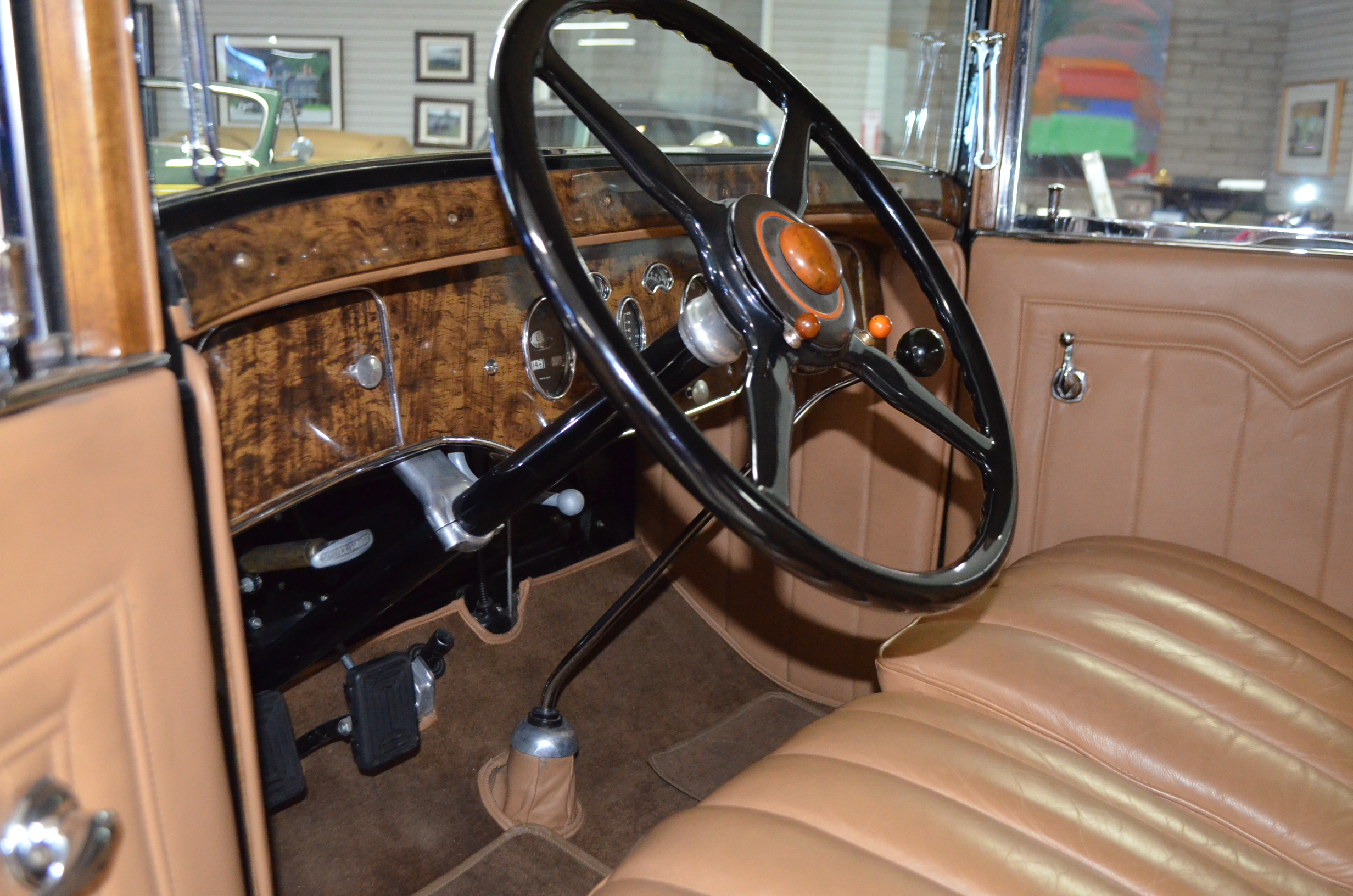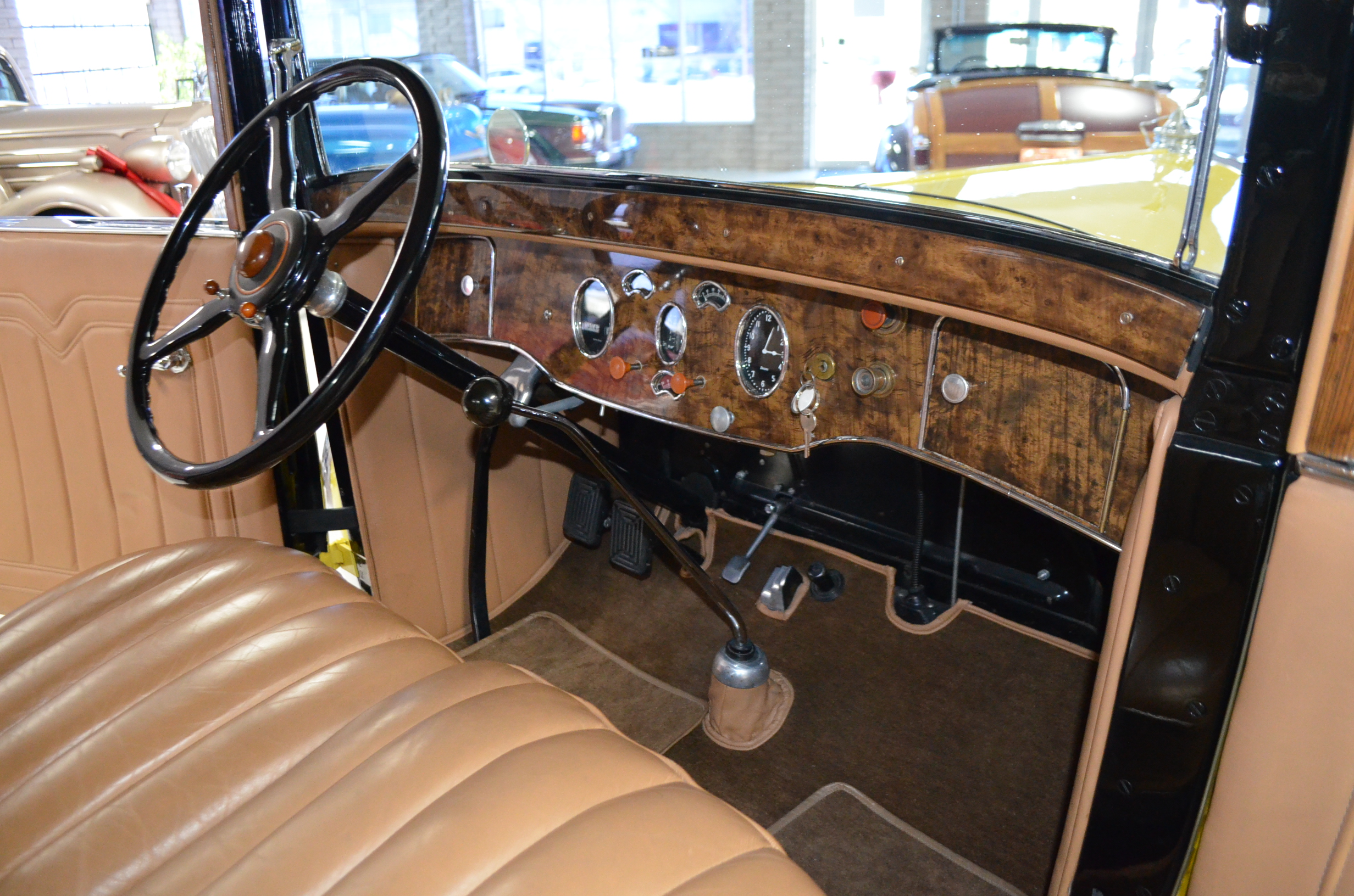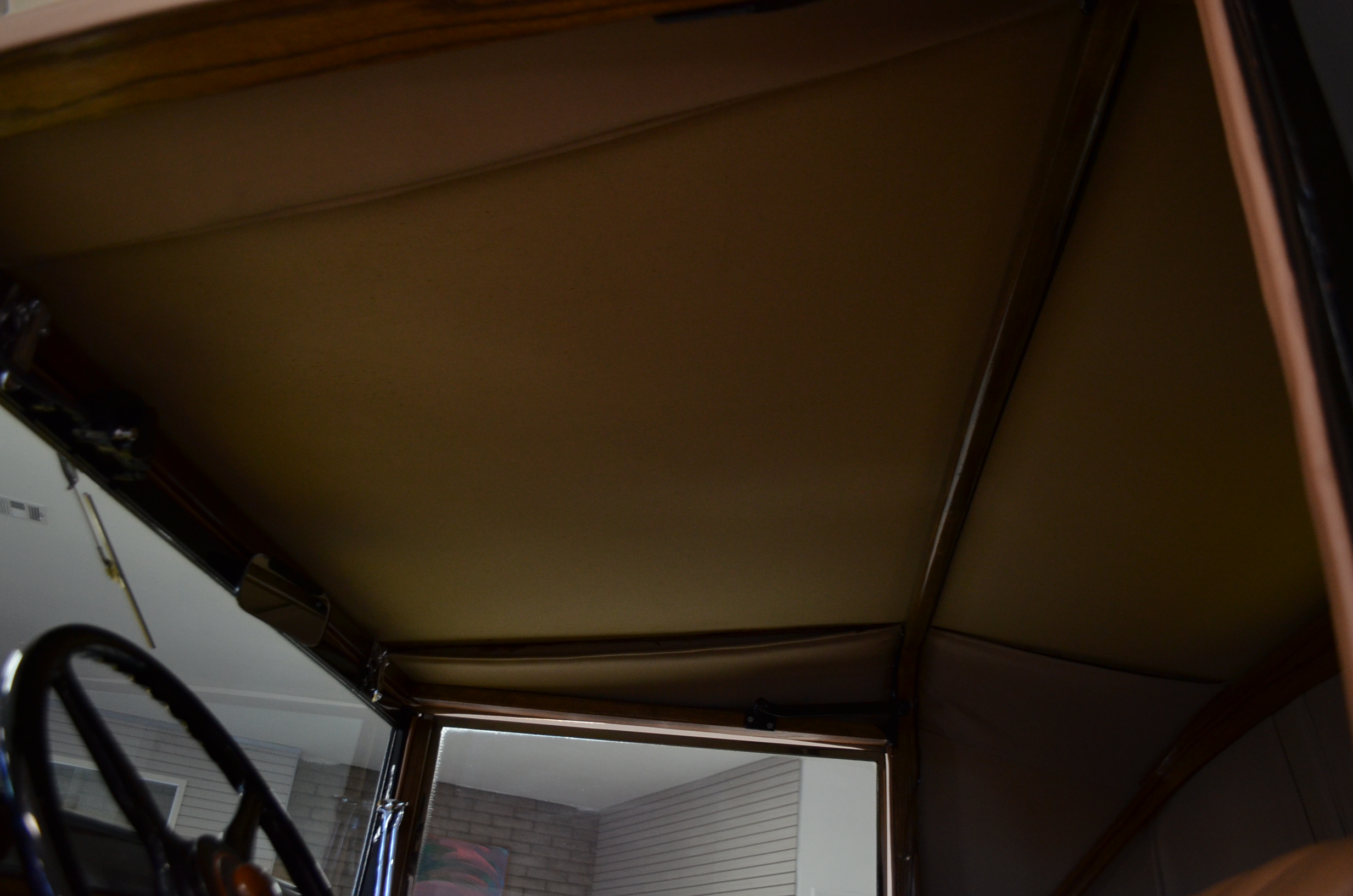 The interior is replete with tan leather that is as-new, being soft and supple. The woodgraining, interior instrumentation and details are also excellent. The rumble seat appears never to have been used and the carpet and trim as well as the tan leather are all excellent. The tan Haartz cloth canvas convertible top is in very good condition and folds down in a few minutes. There are minor scuff marks where the rumble seat folds down, which is very normal even with limited use.