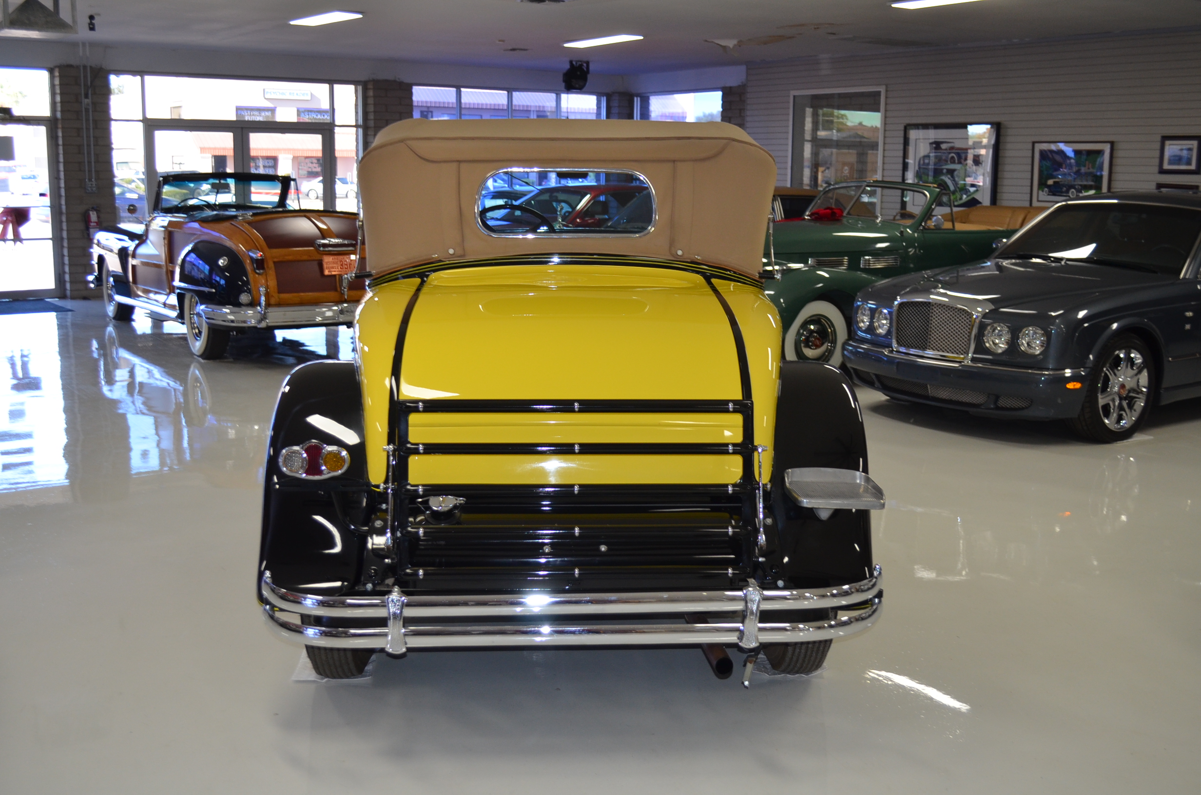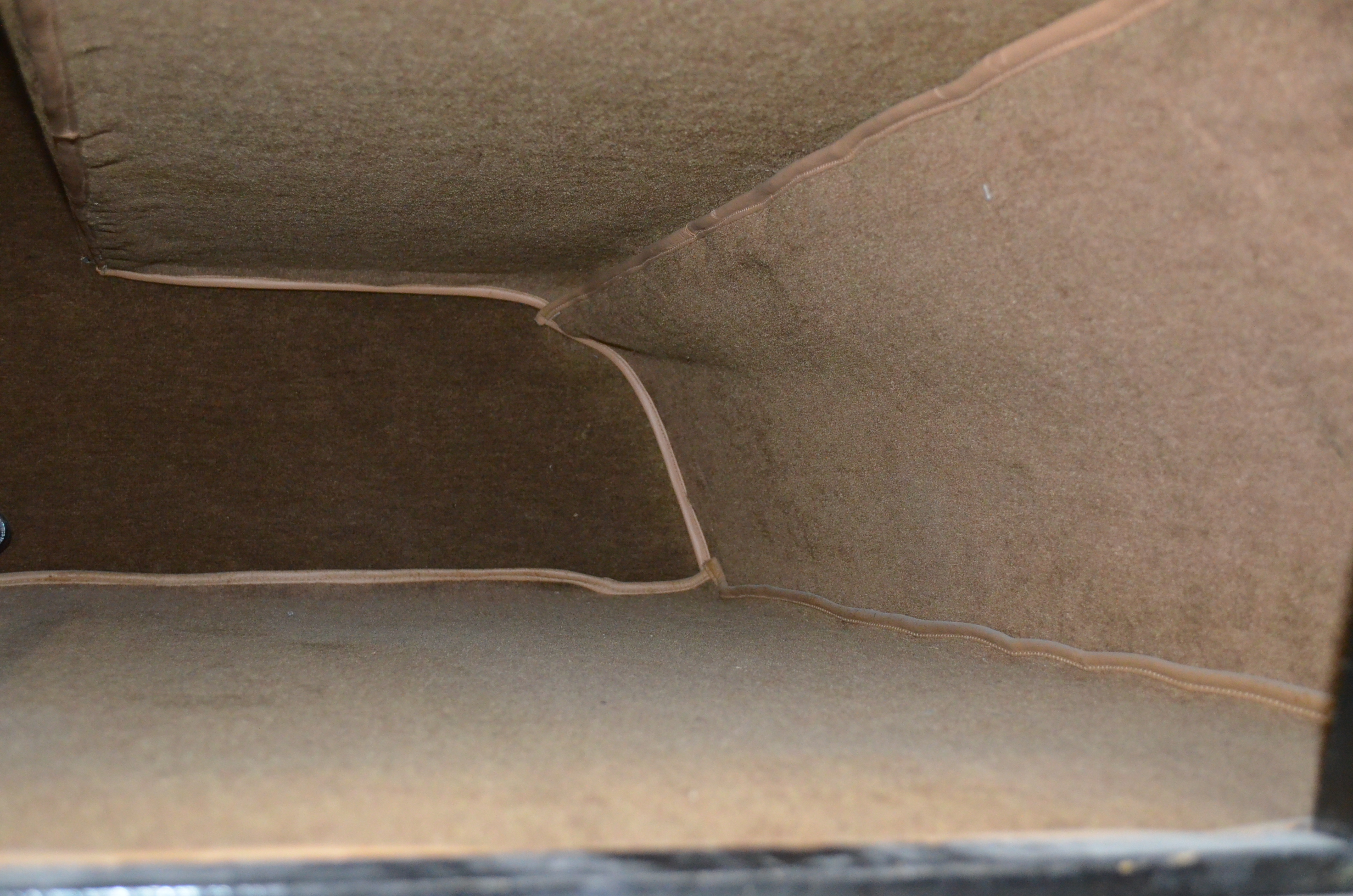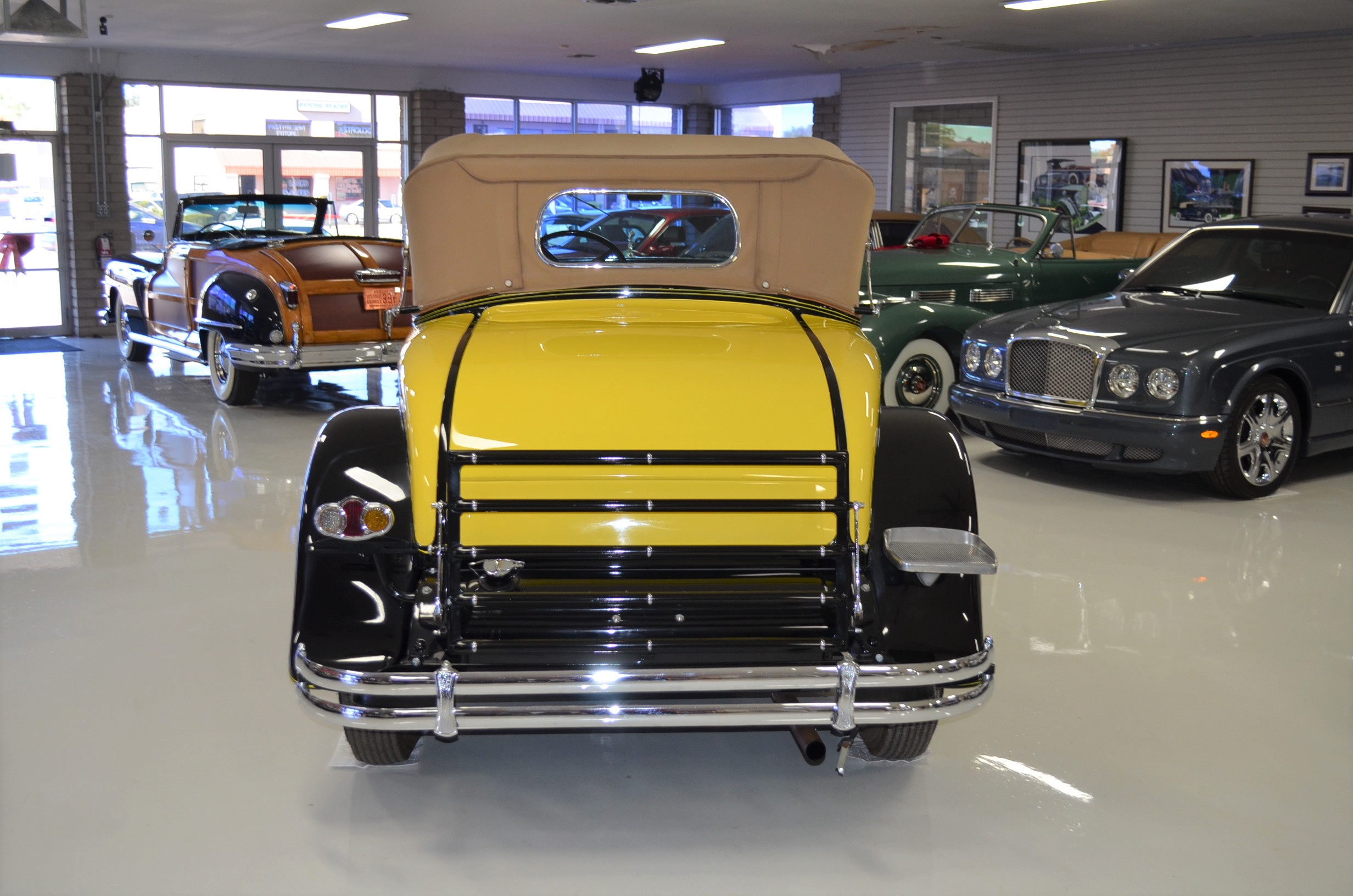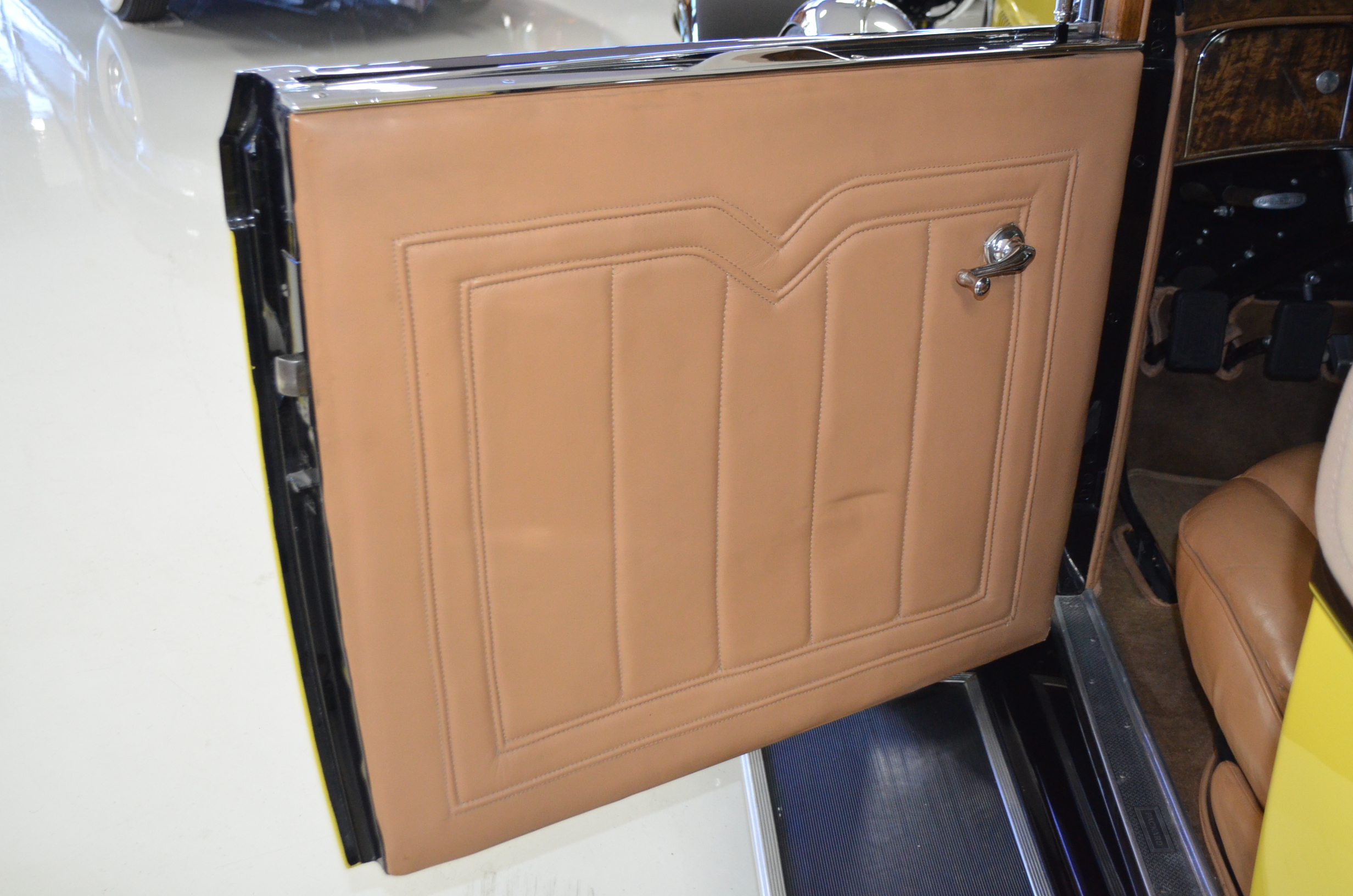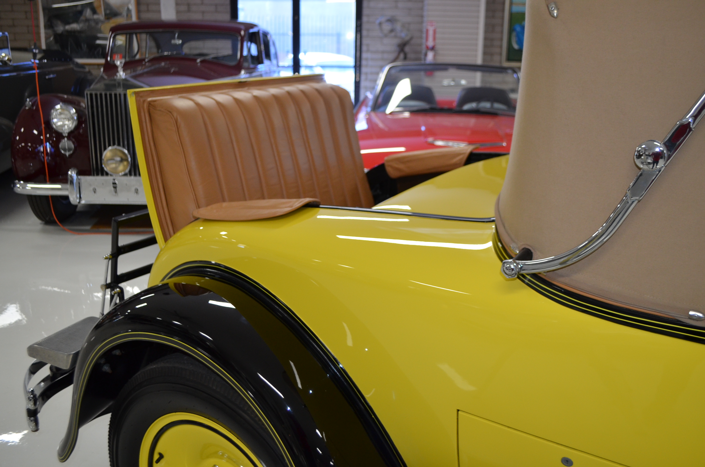 The interior is replete with tan leather that is as-new, being soft and supple. The woodgraining, interior instrumentation and details are also excellent. The rumble seat appears never to have been used and the carpet and trim as well as the tan leather are all excellent. The tan Haartz cloth canvas convertible top is in very good condition and folds down in a few minutes. There are minor scuff marks where the rumble seat folds down, which is very normal even with limited use.