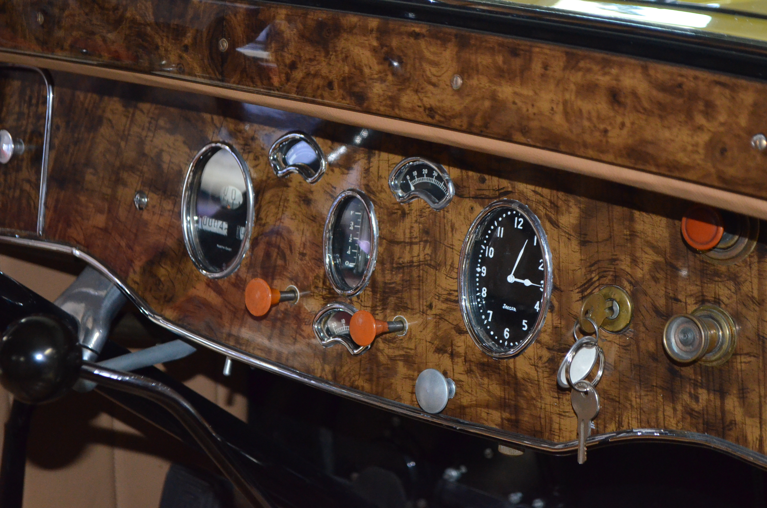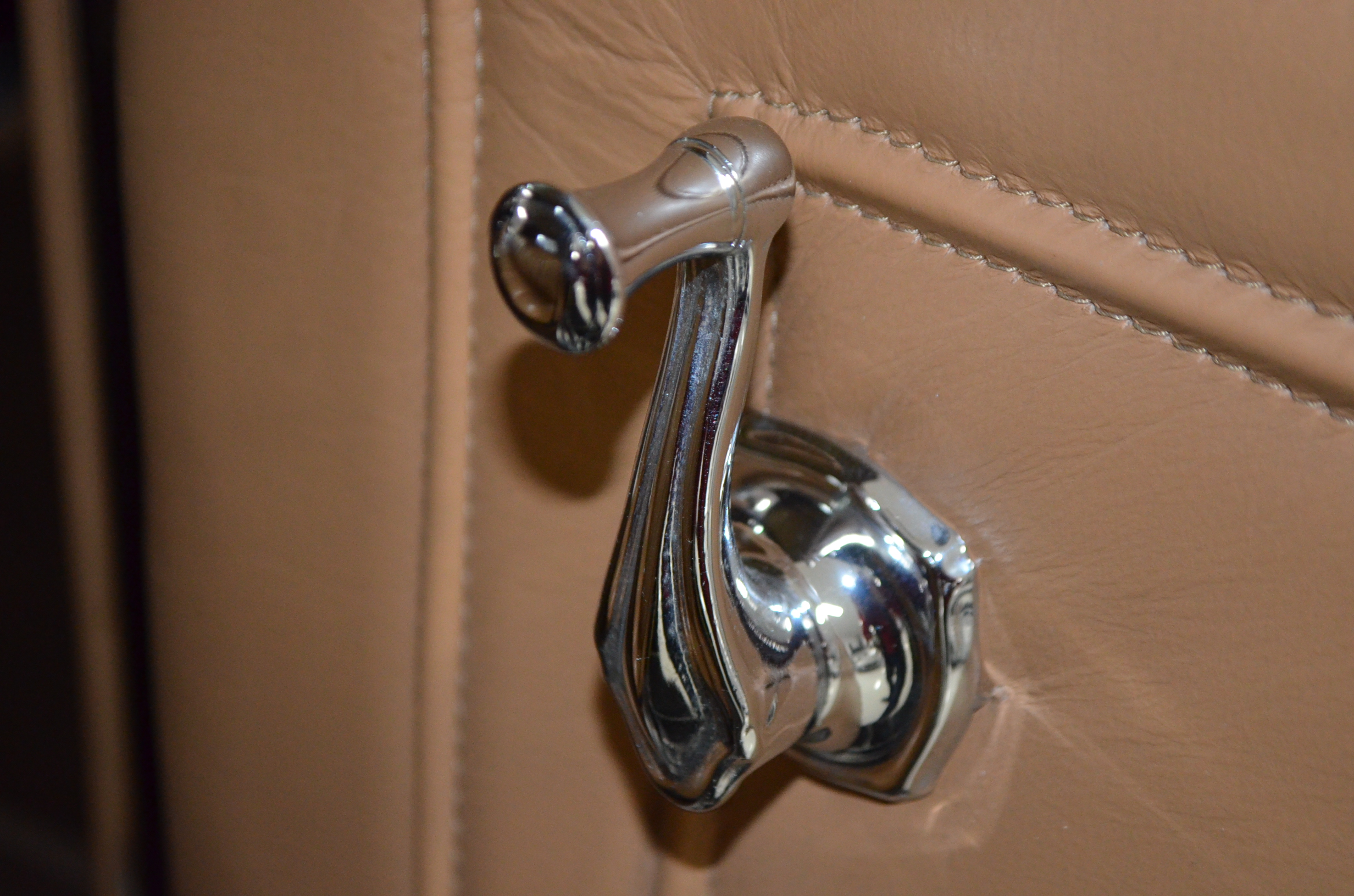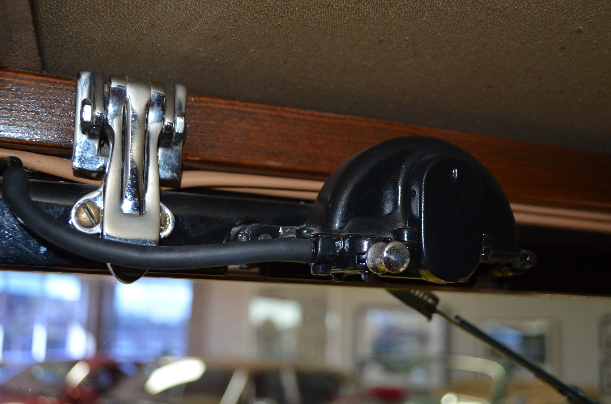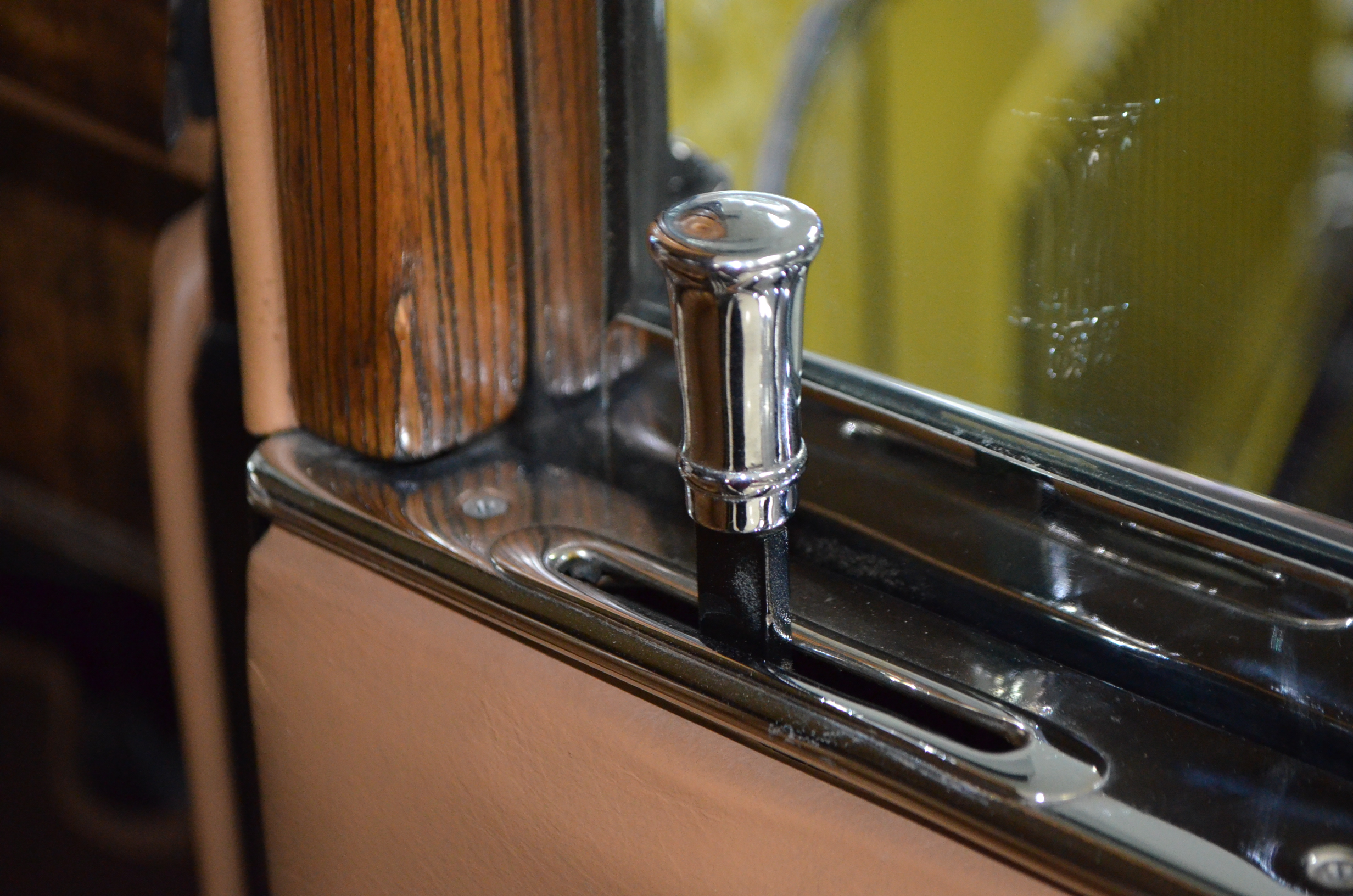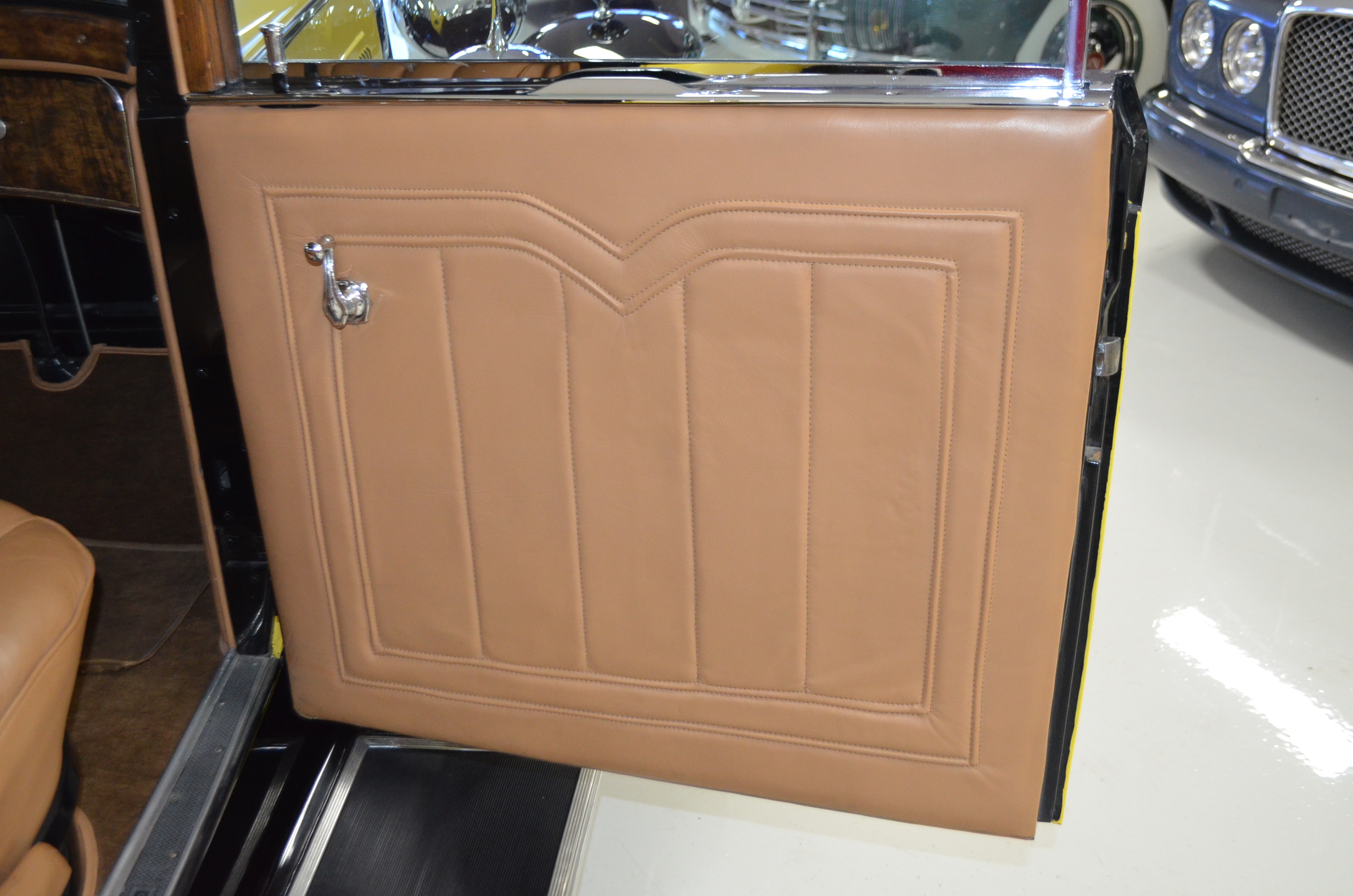The interior is replete with tan leather that is as-new, being soft and supple. The woodgraining, interior instrumentation and details are also excellent. The rumble seat appears never to have been used and the carpet and trim as well as the tan leather are all excellent. The tan Haartz cloth canvas convertible top is in very good condition and folds down in a few minutes. There are minor scuff marks where the rumble seat folds down, which is very normal even with limited use.
