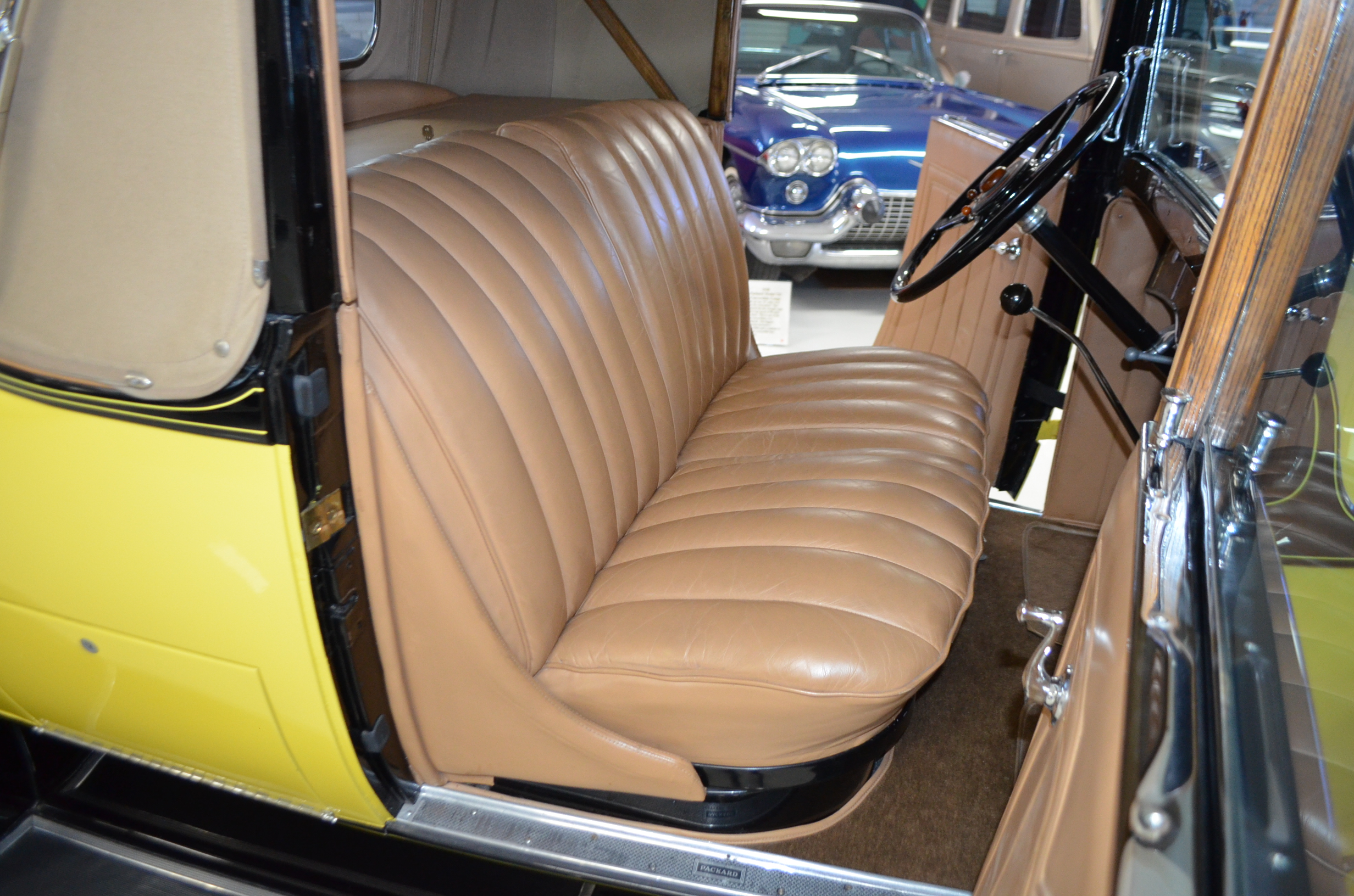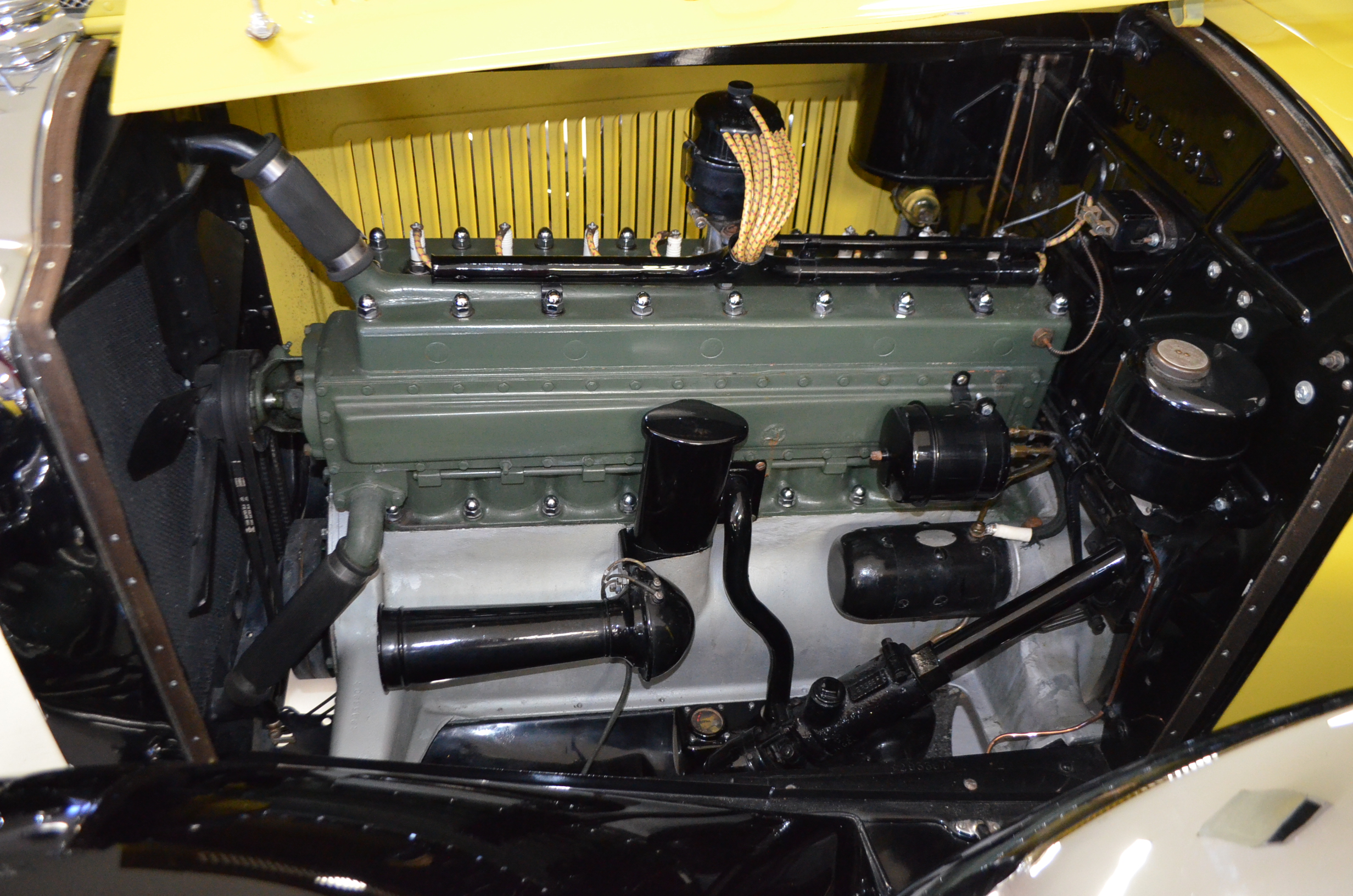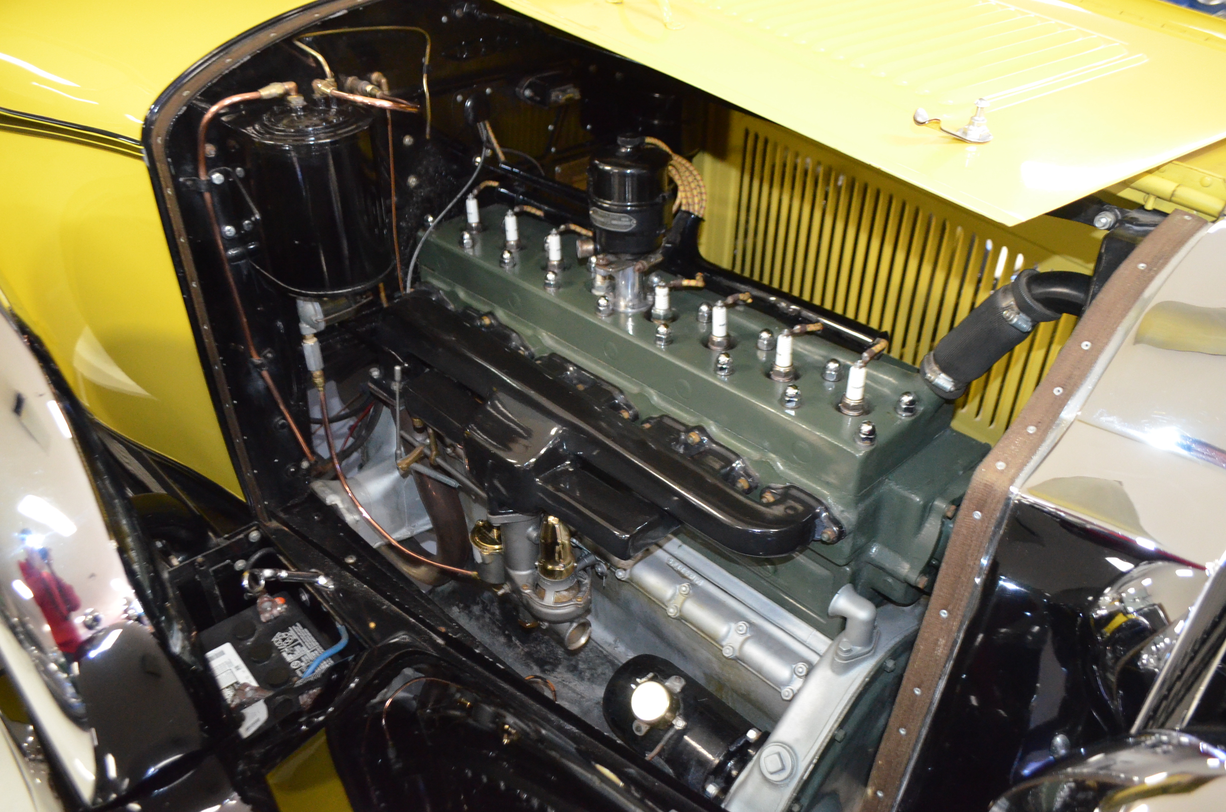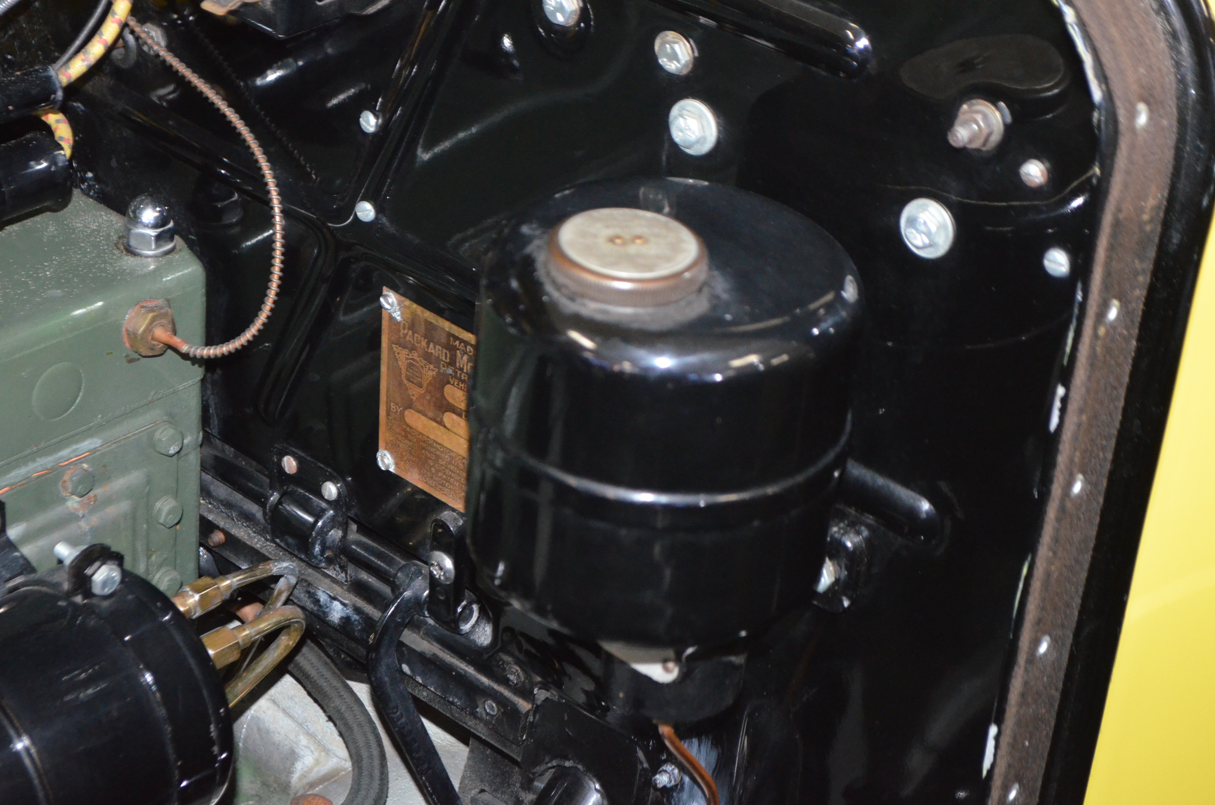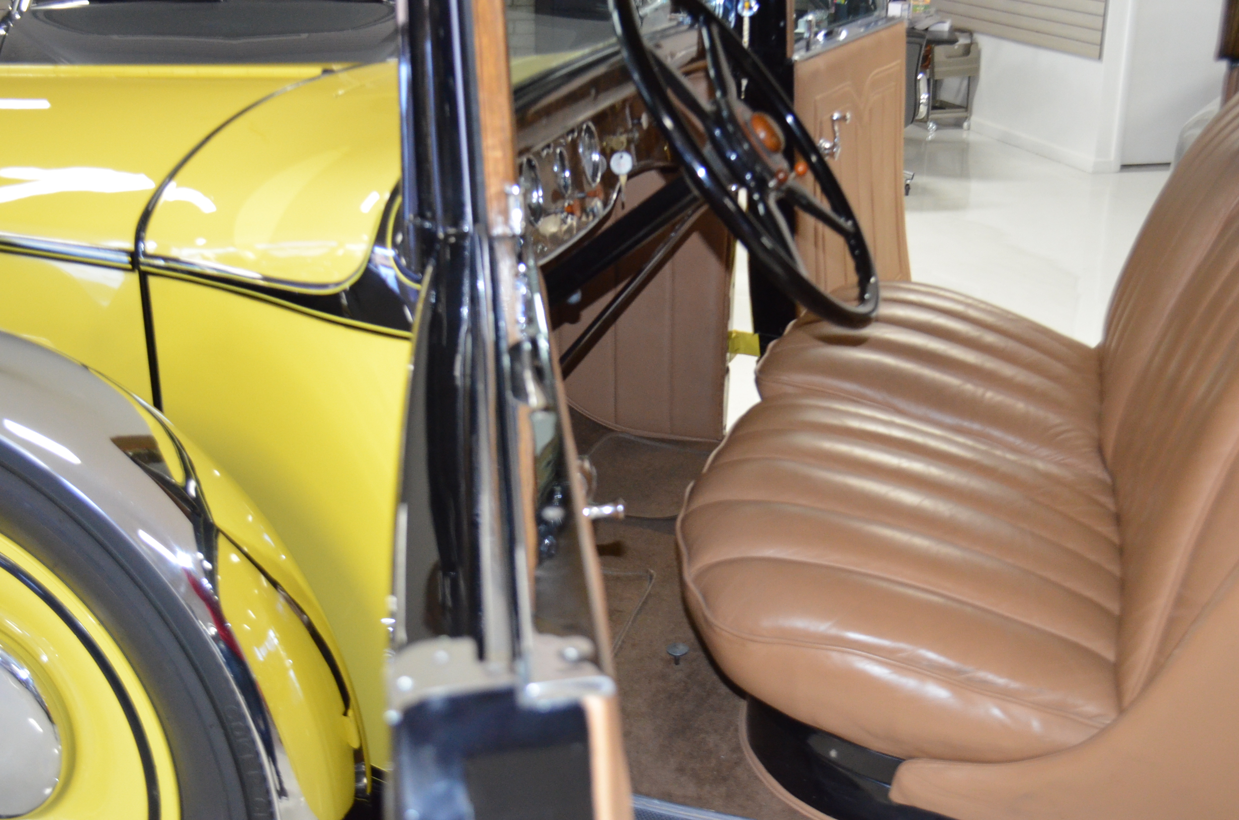 With its 134.5 inch wheelbase, this is far easier to drive than the longer Packards of the era. The yellow and black livery with blackwall tires looks more like a Bugatti than a Packard. It has a European flair to it that you just don’t see often on Packards. The paint and body finish quality are excellent. All the chrome has been replated and is well done. The door closure and other operational functions are all excellent with panel fit that is very good (the bottom of the doors are off about 1/4″ to 1/2″).