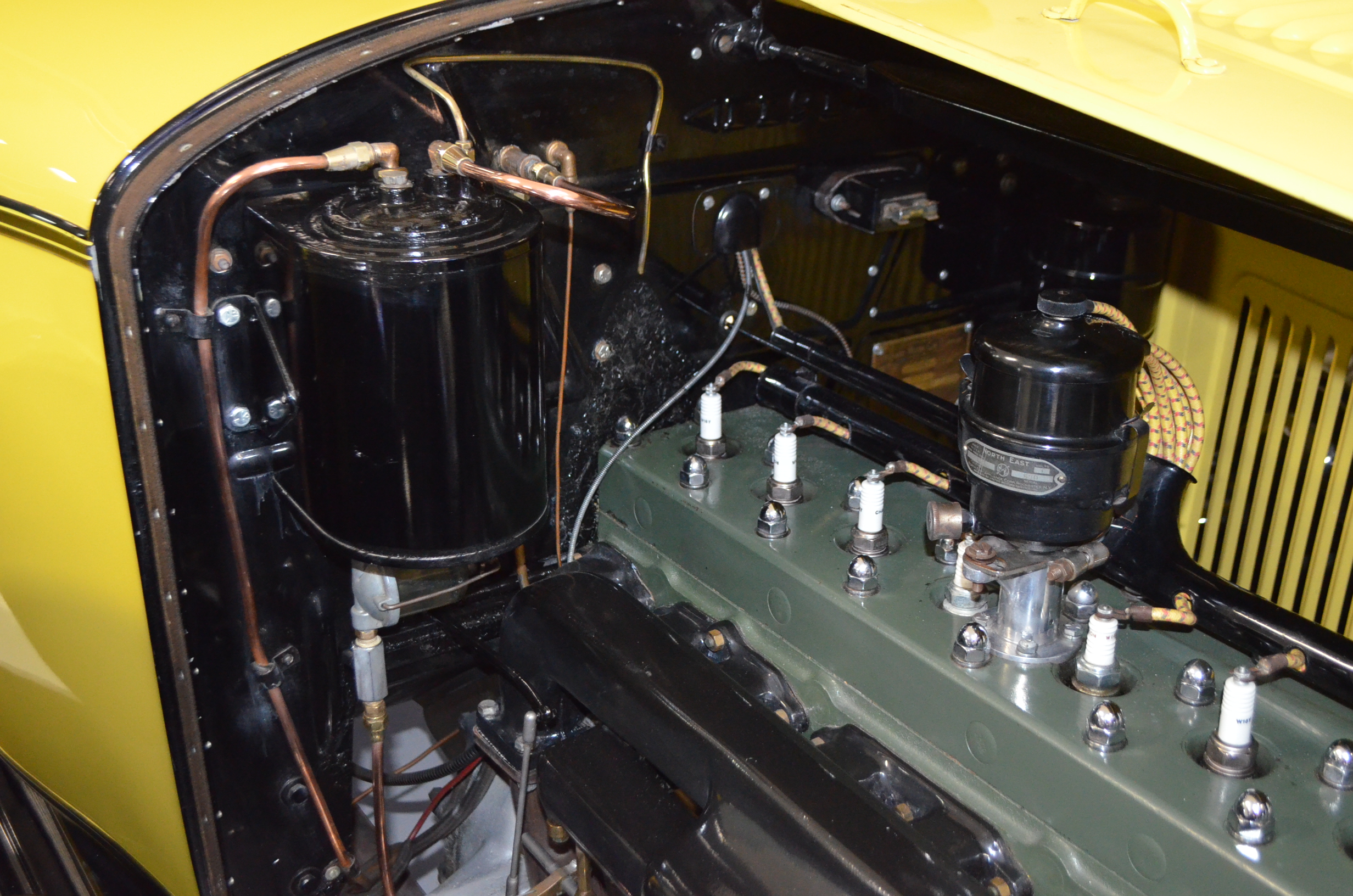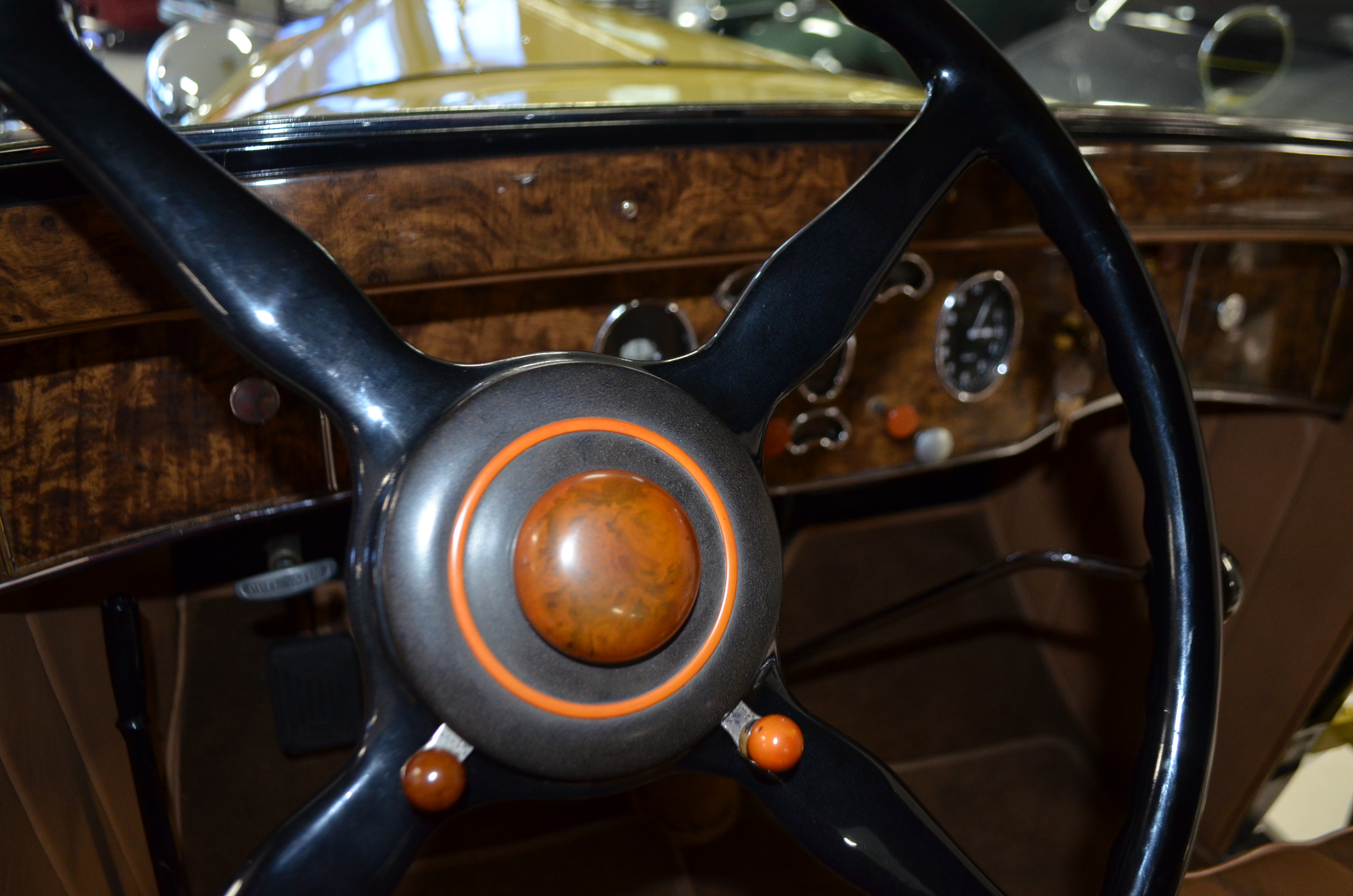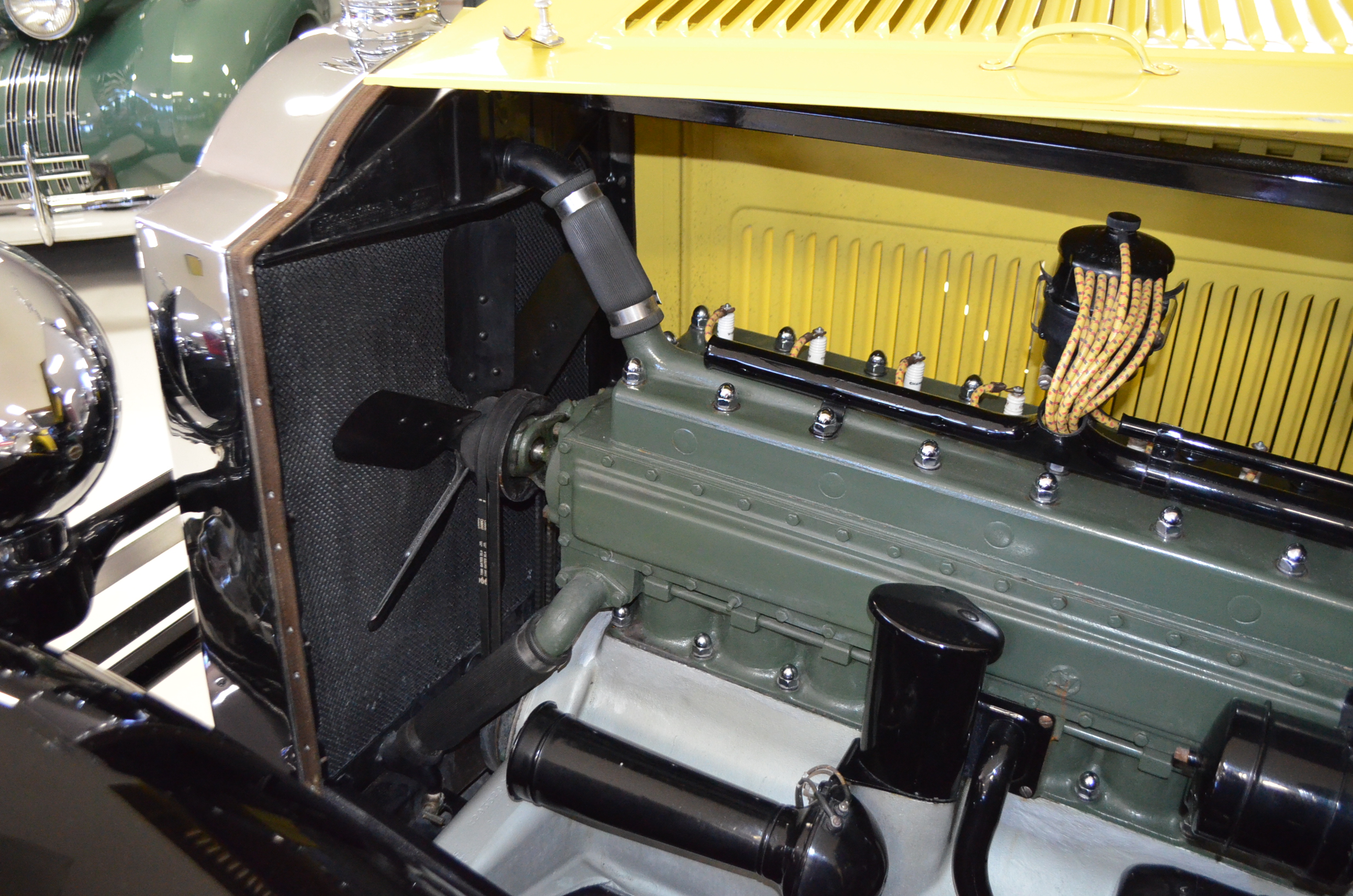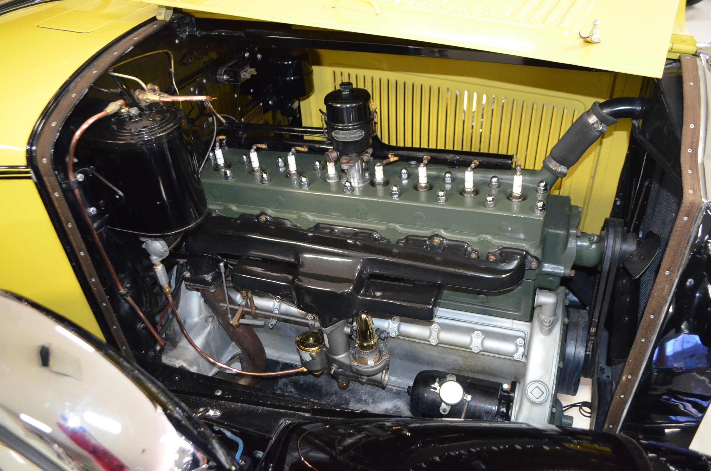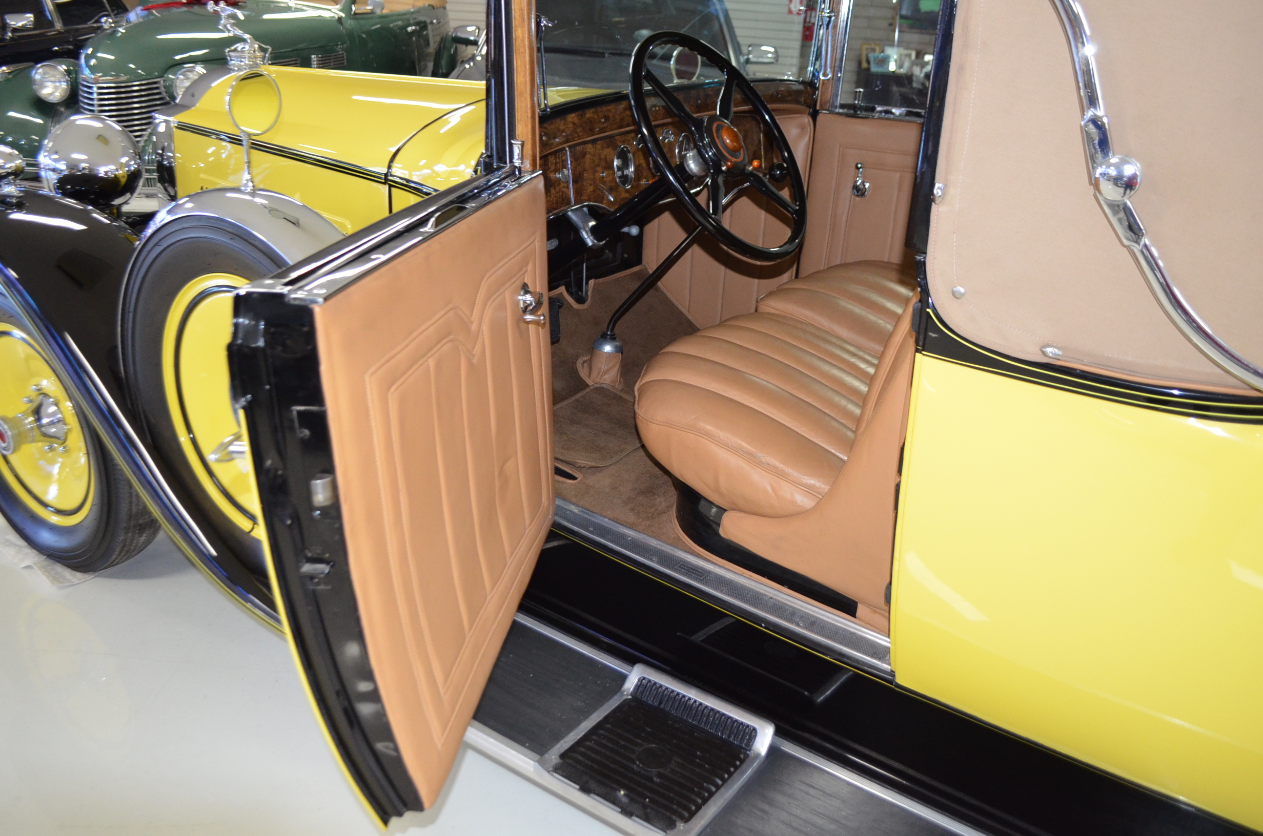With its 134.5 inch wheelbase, this is far easier to drive than the longer Packards of the era. The yellow and black livery with blackwall tires looks more like a Bugatti than a Packard. It has a European flair to it that you just don’t see often on Packards. The paint and body finish quality are excellent. All the chrome has been replated and is well done. The door closure and other operational functions are all excellent with panel fit that is very good (the bottom of the doors are off about 1/4″ to 1/2″).