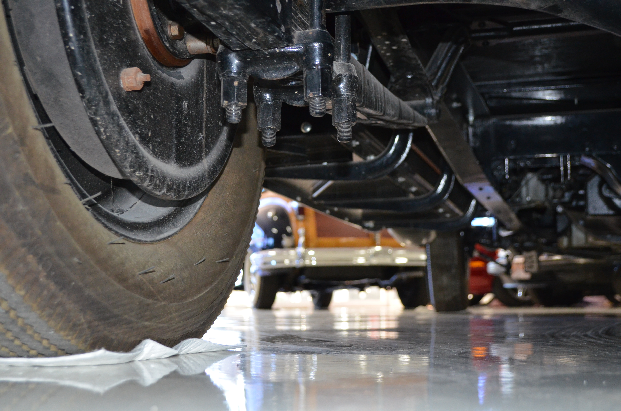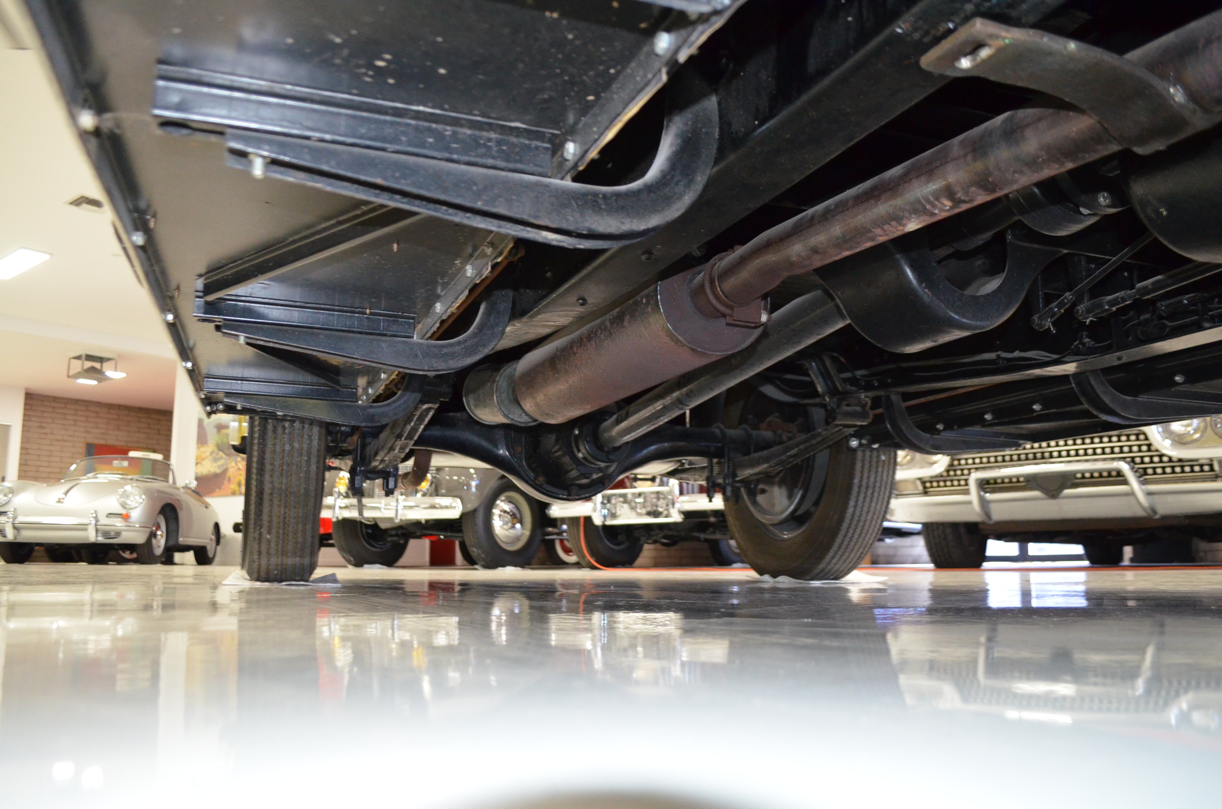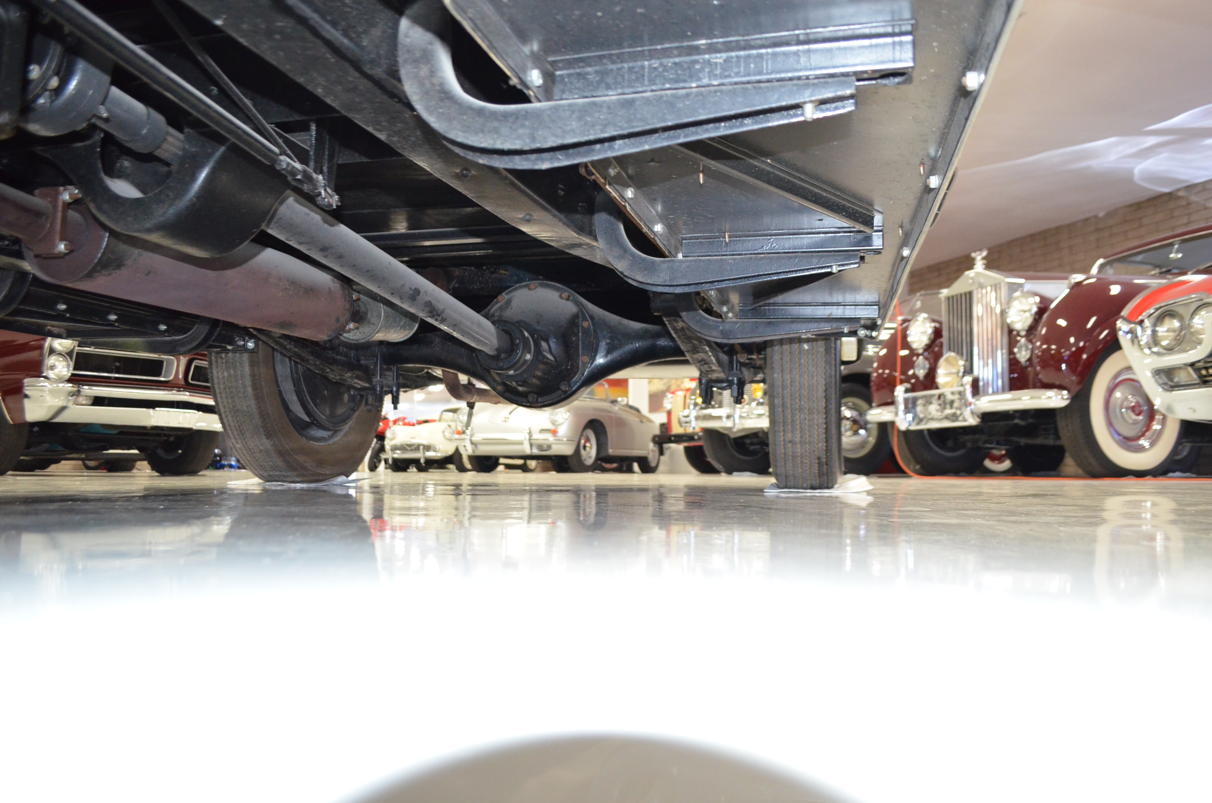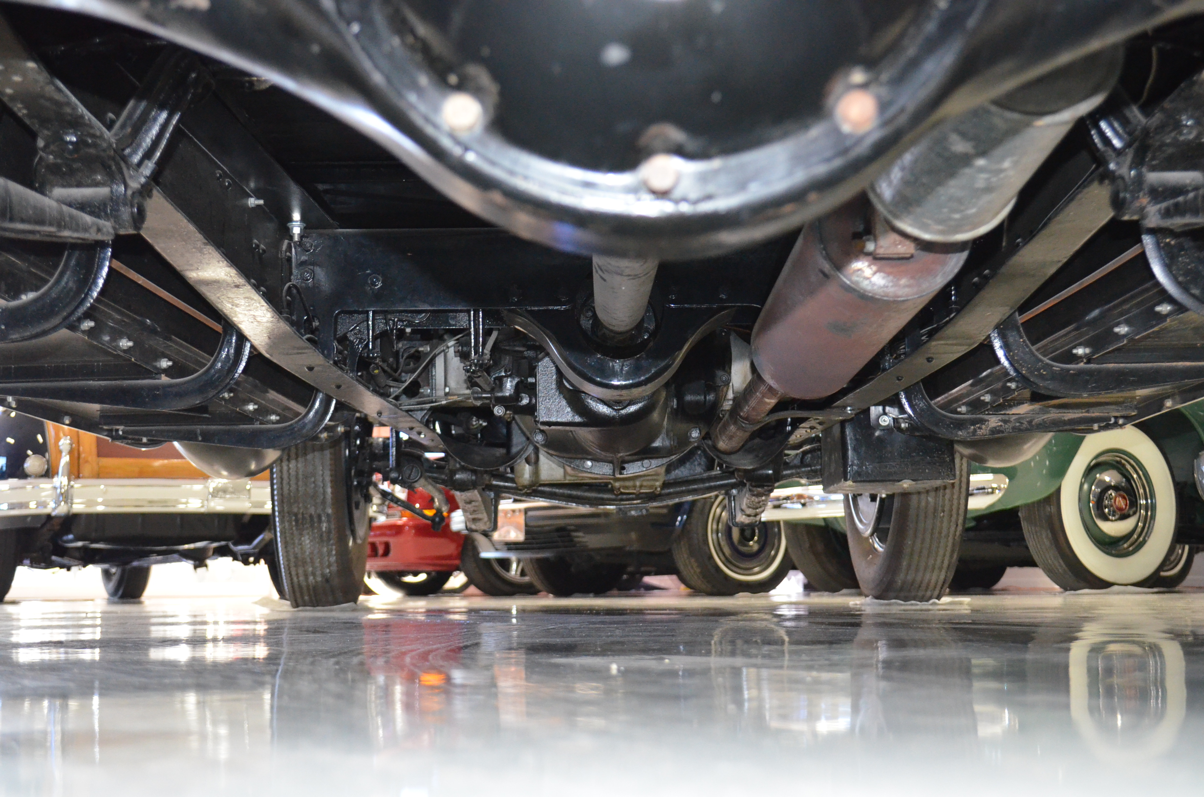 The engine detailing is correct and is showing a slight amount of patina from being held in a museum since restoration. Everything on this car has been rebuilt and restored. The chassis is well done, but would benefit from further cleaning before a concours event. The 320 CID straight eight engine has nine main bearings, performs well, and the carburetor has been recently rebuilt to ensure proper operations. The Packard emits some smoke which is likely from not being used and the valves not yet being seated.