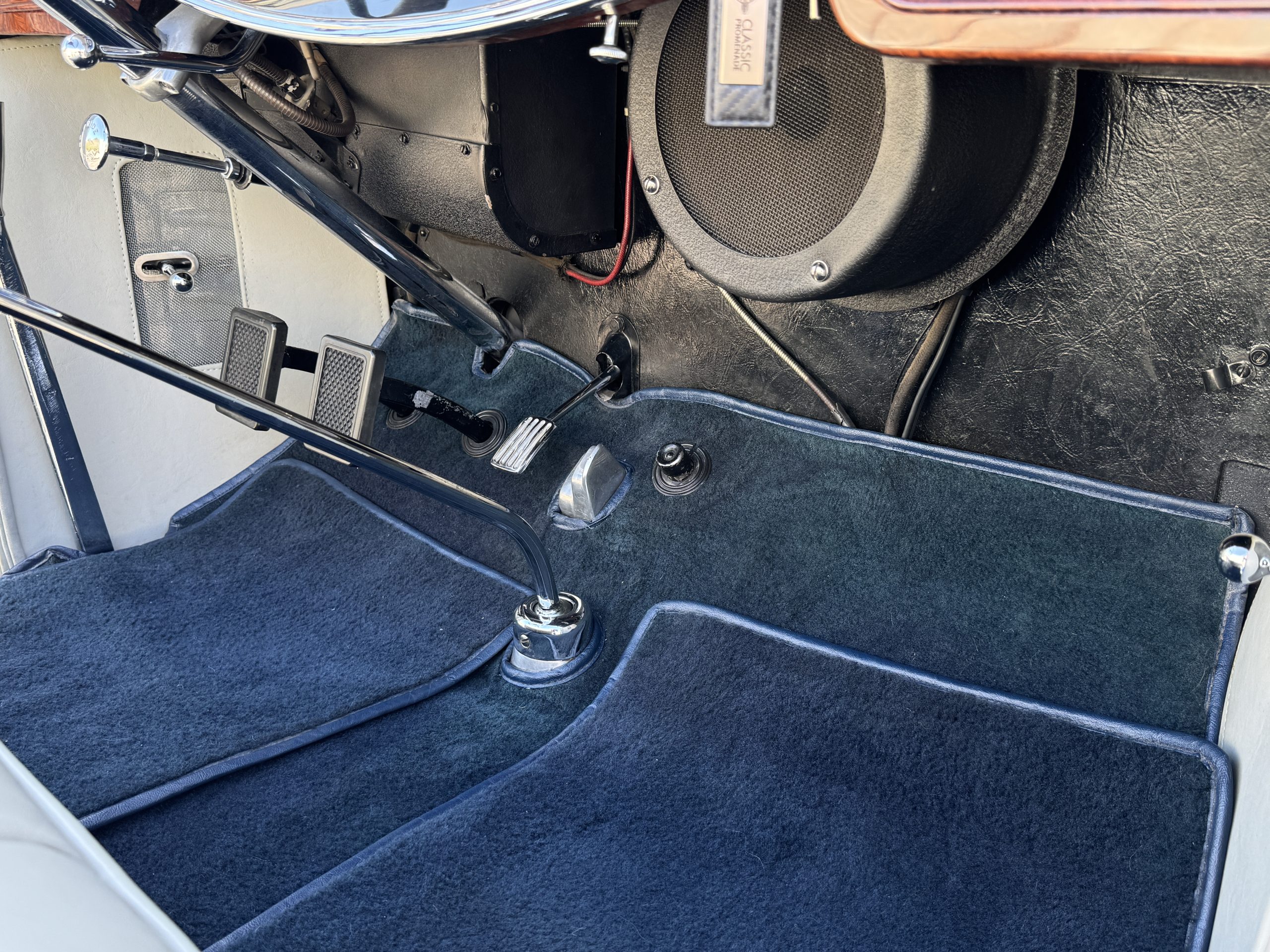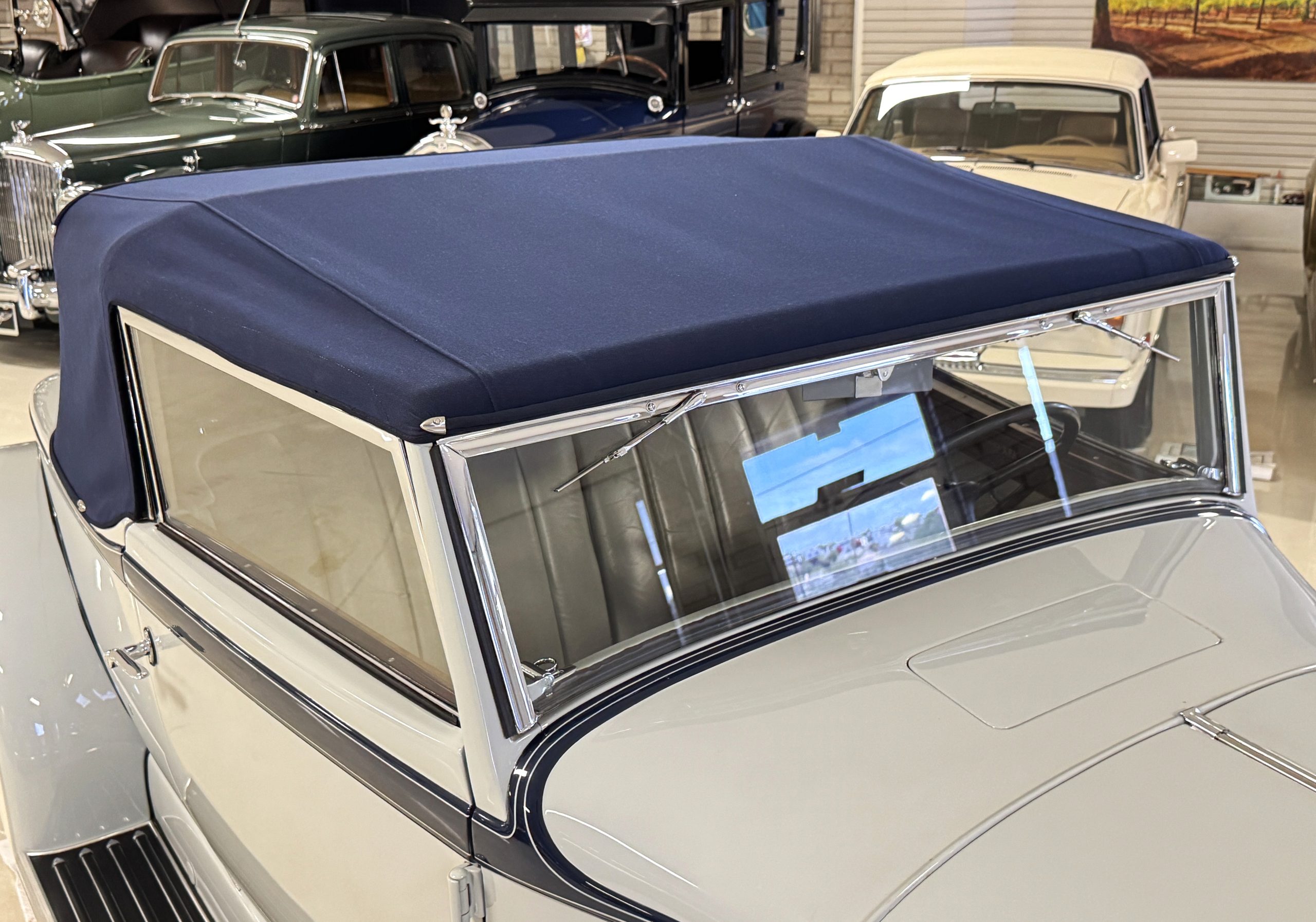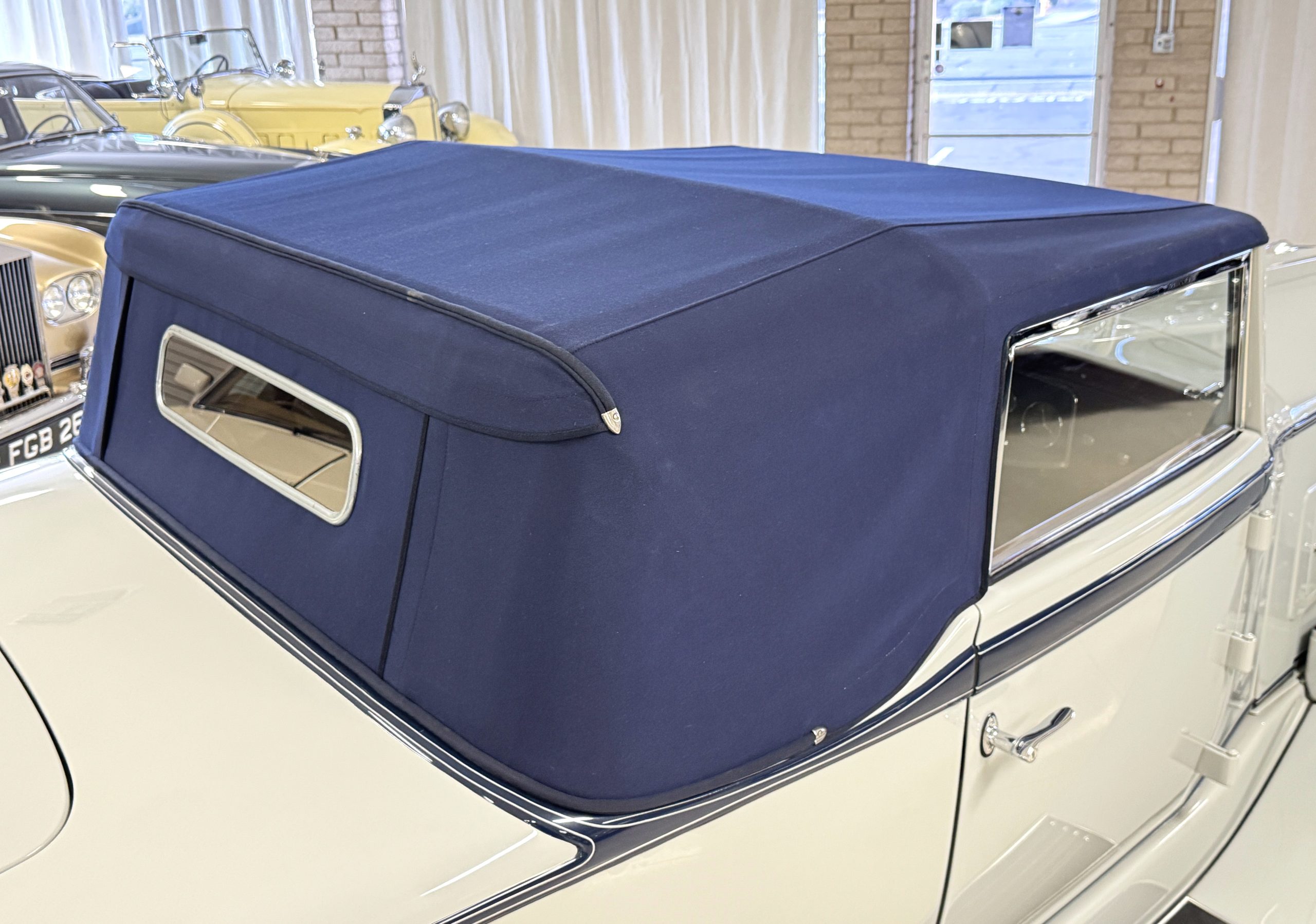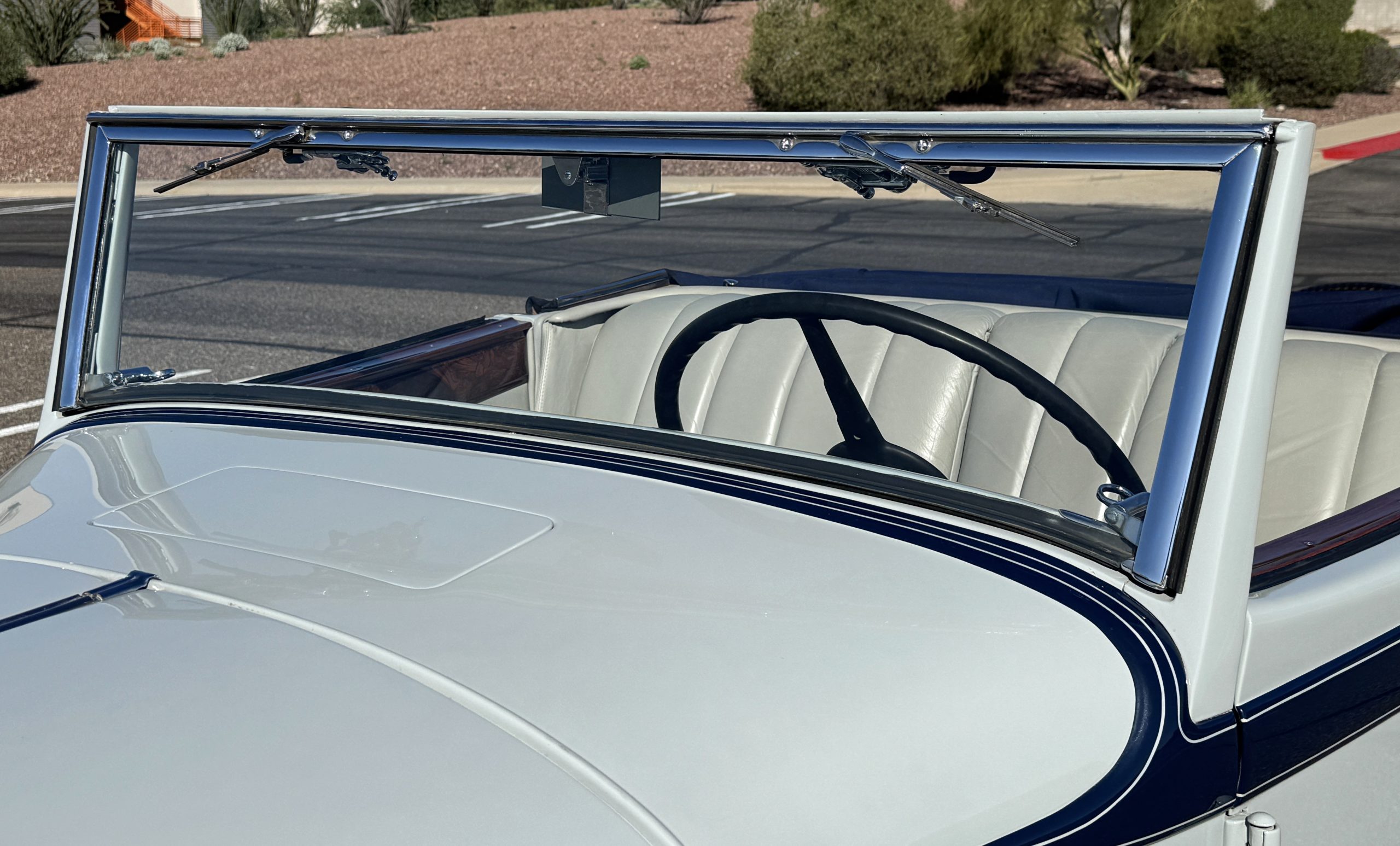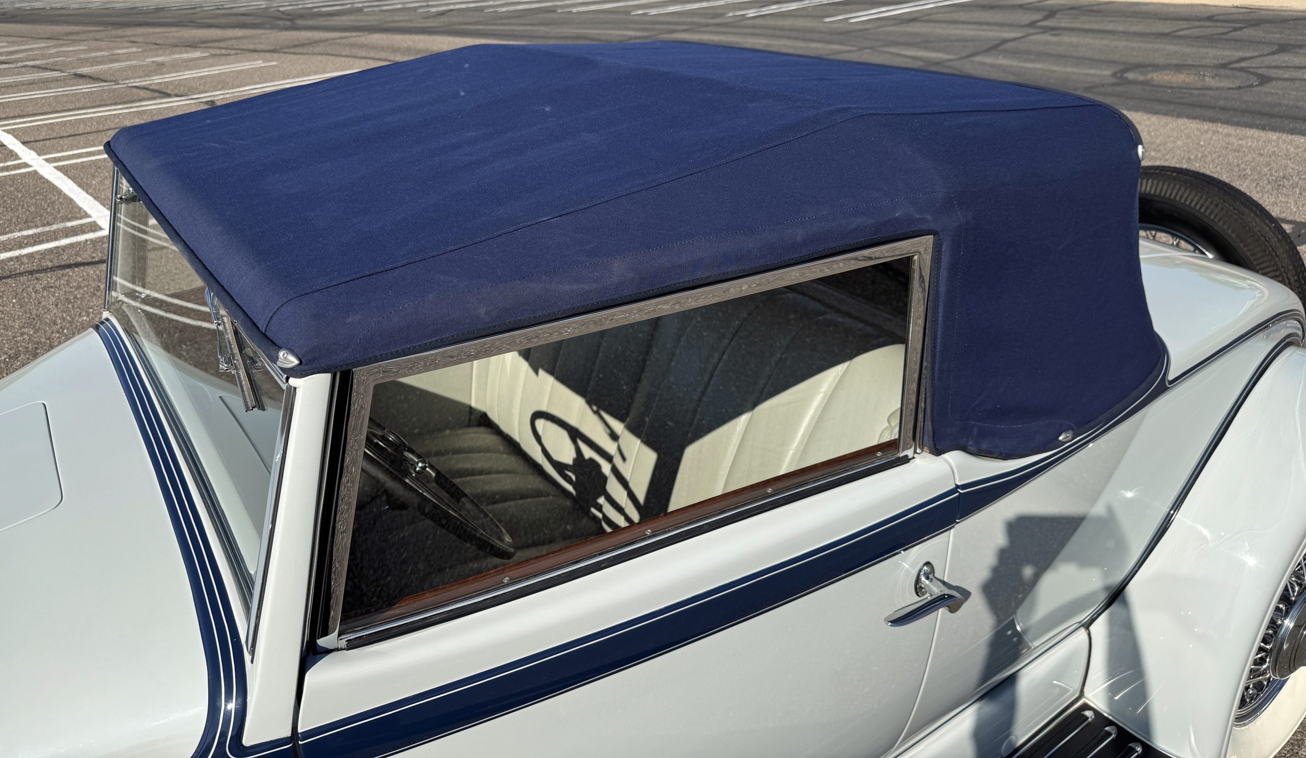 The exterior finish presents beautifully in light blue with royal blue pinstriping, accentuated by a Burbank royal blue convertible top that folds neatly in line with the body. Every element reflects quality craftsmanship, from the brilliant chrome radiator guard and dual trumpet horns to the gleaming “Goddess of Speed” mascot leading the way. The Packard rides on chrome wire wheels with matching whitewall Firestone tires and features a rear-mounted spare wheel that preserves the uninterrupted sweep of the front fenders. The paint and brightwork remain in excellent condition, offering a show-quality presentation with only three small cosmetic imperfections throughout.