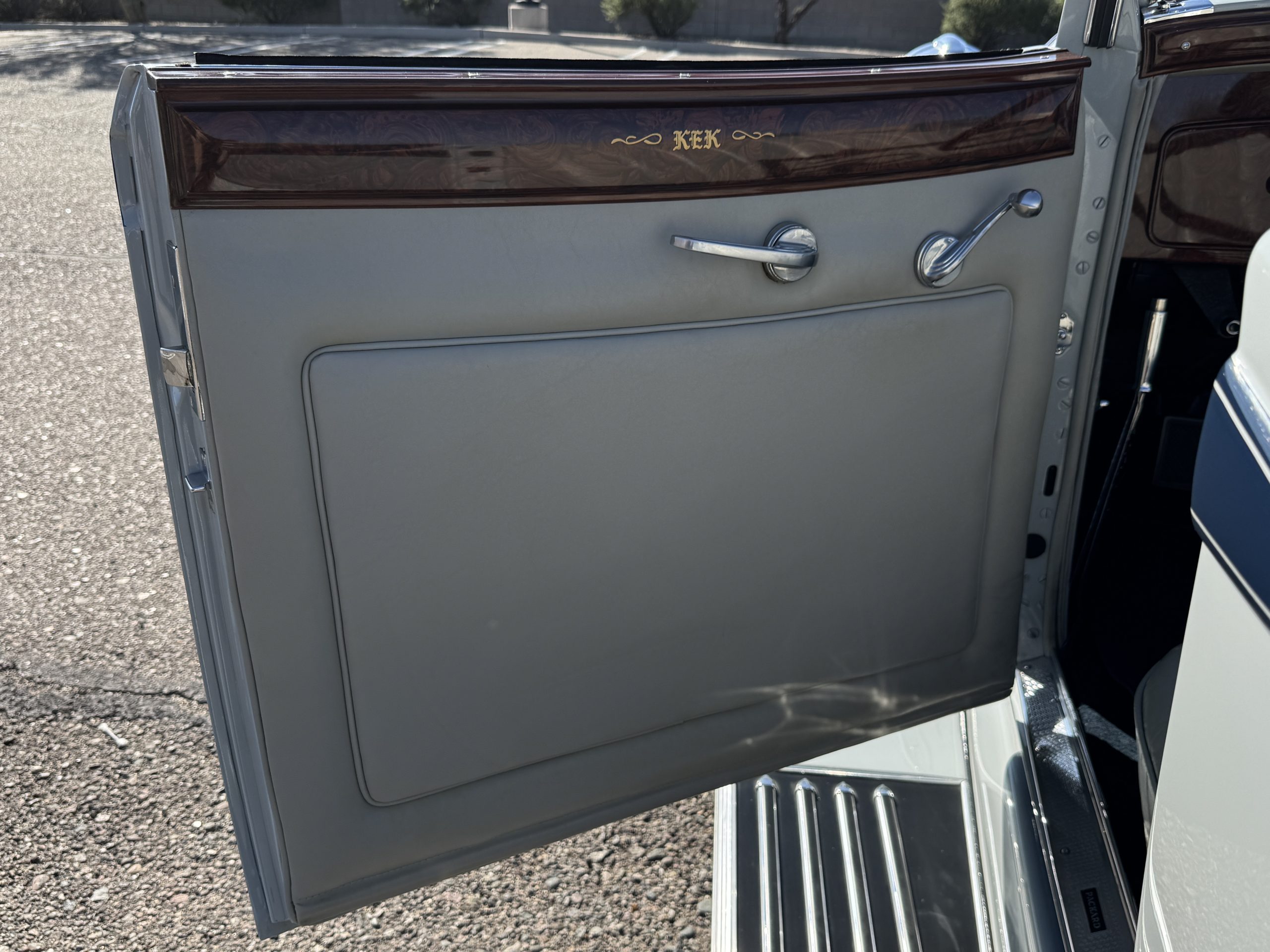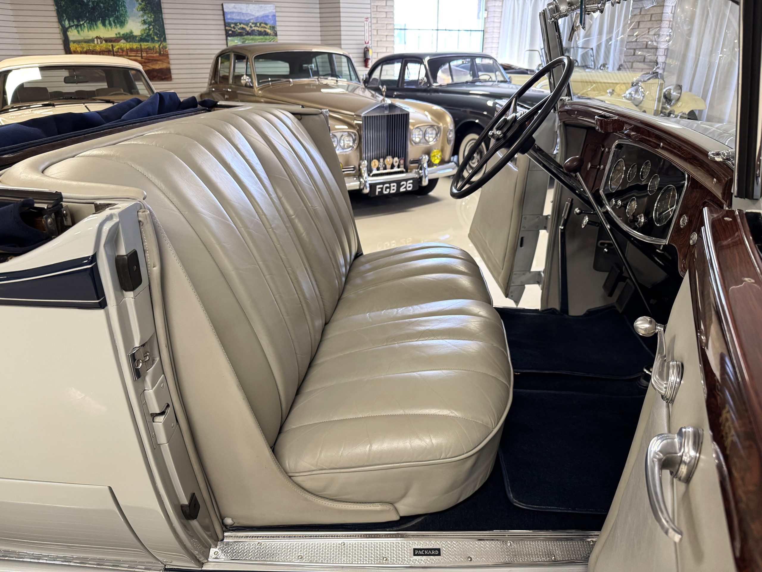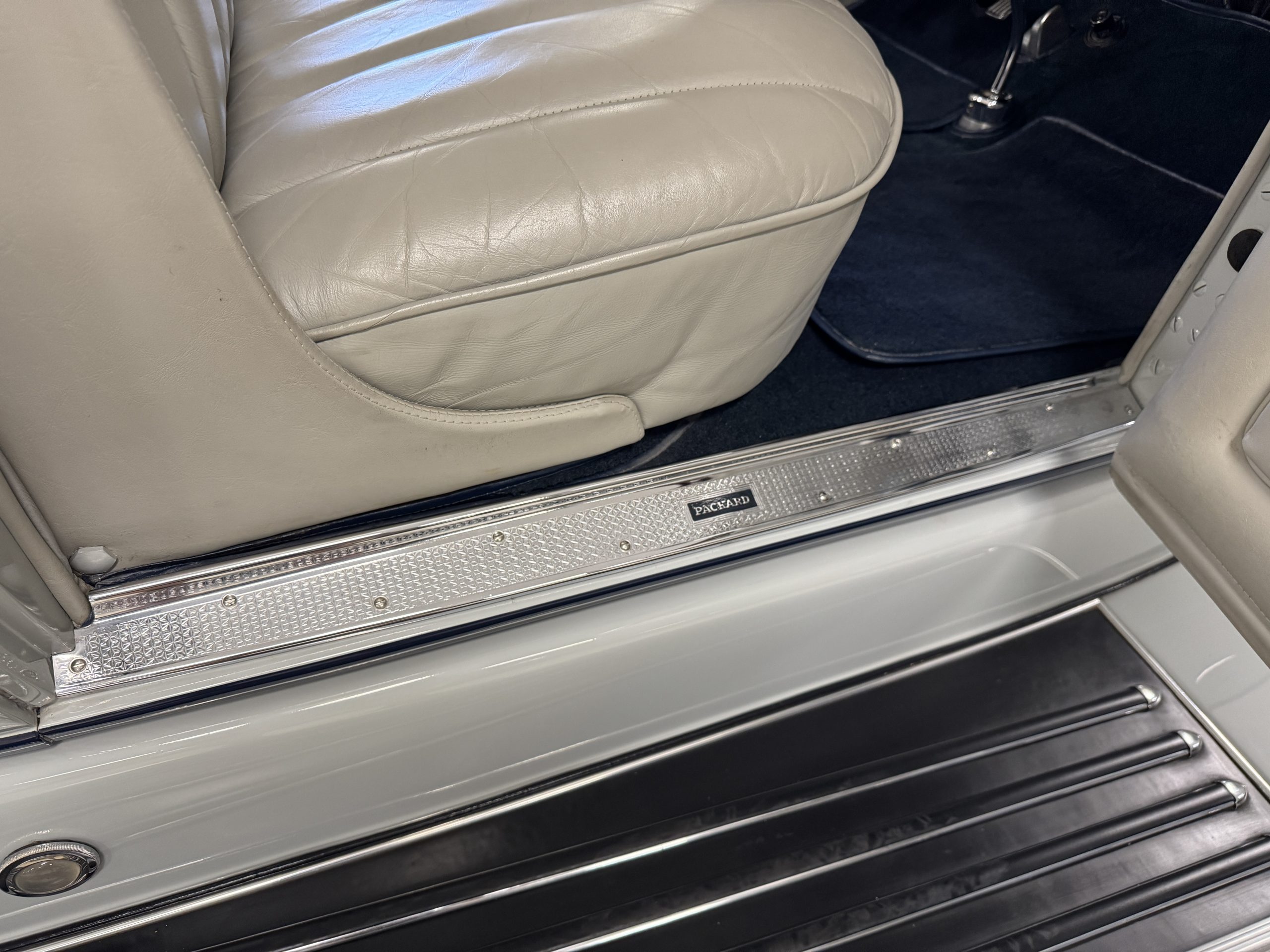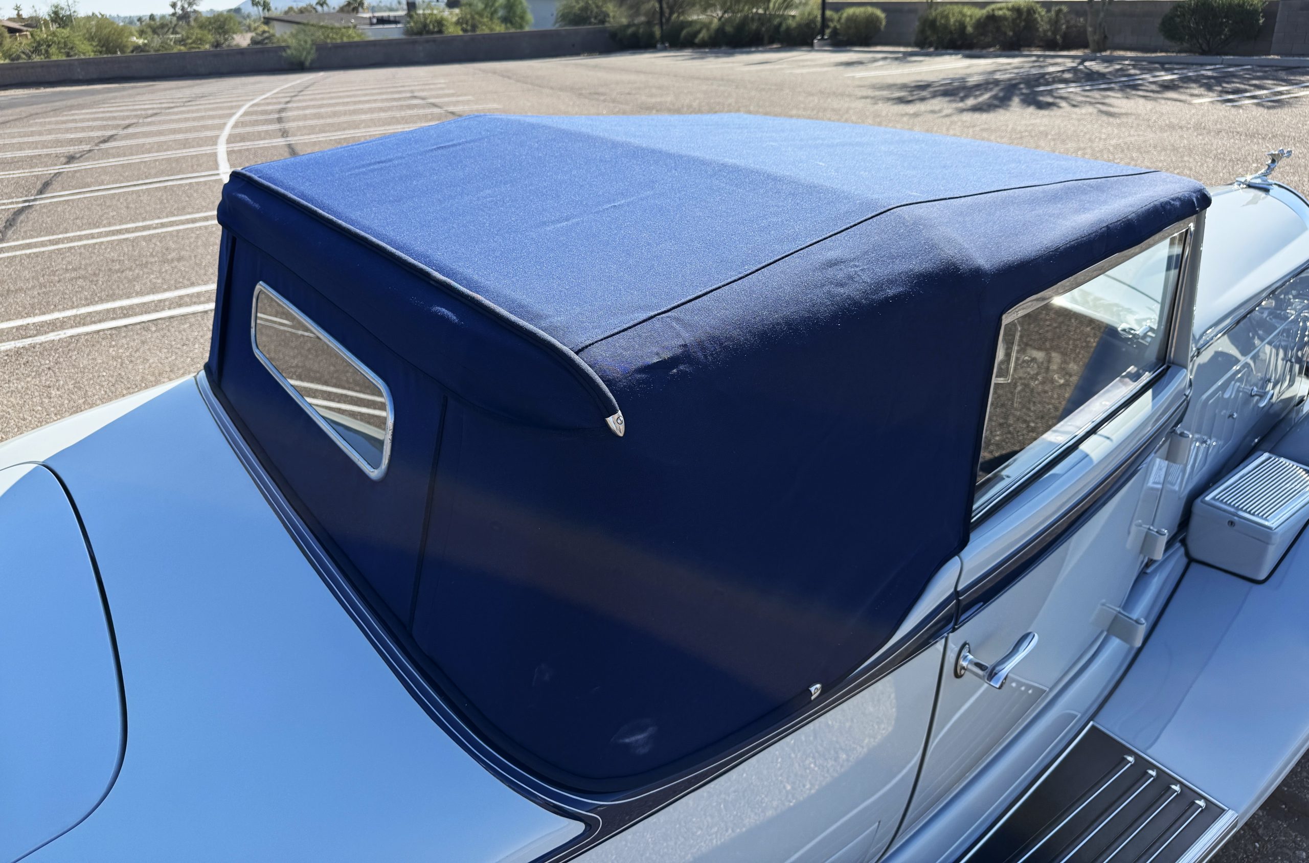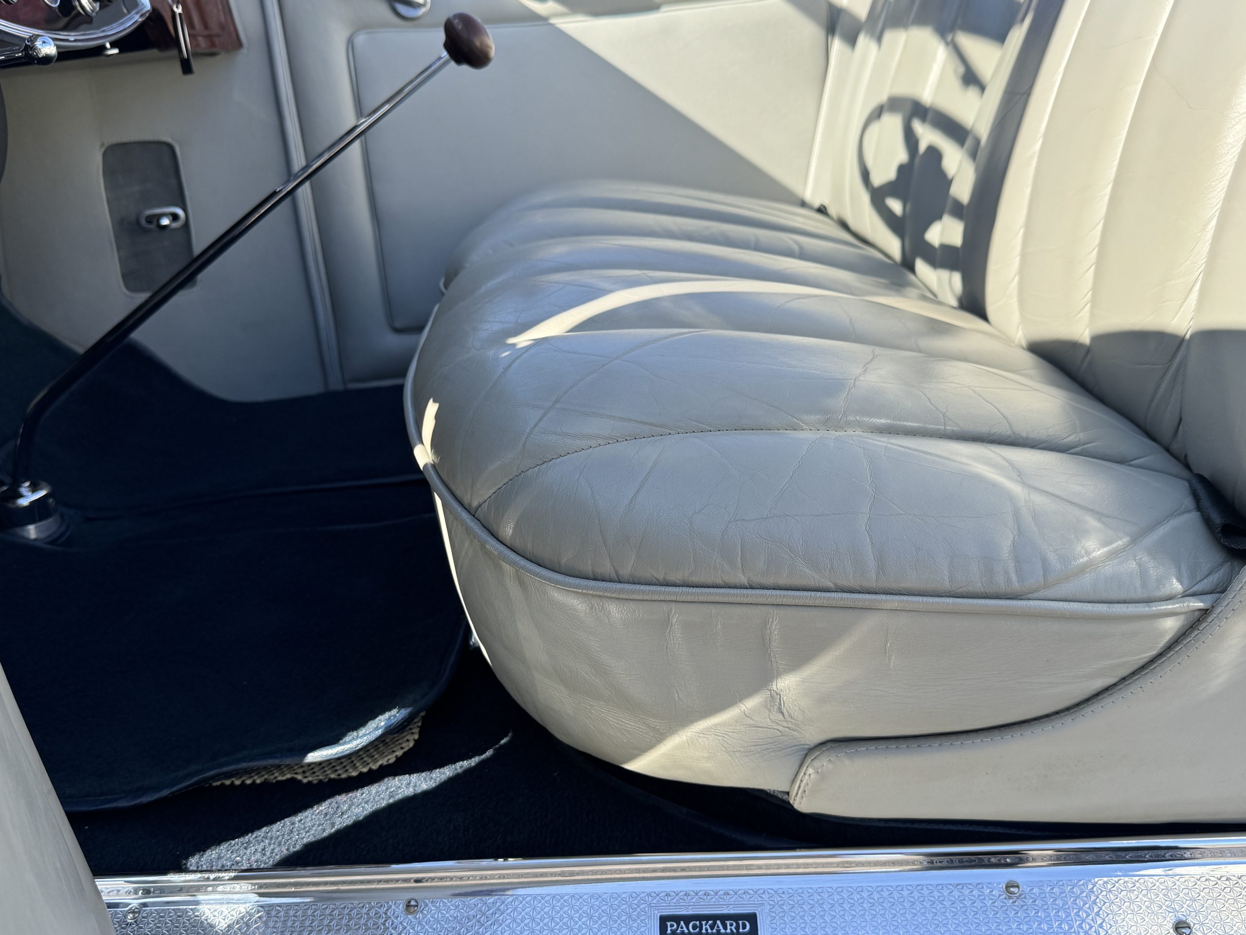 The interior is equally refined, trimmed in light gray leather upholstery that remains supple and clean with only the lightest creasing from use. The dashboard is fully restored and finished in burled wood with chrome-rimmed instruments, including a factory but non-functional Packard/Philco Transitron radio. The fuel gauge is currently non-functional, but all other instrumentation presents well and are in working condition. The rumble seat is designed to accommodate two passengers comfortably, with space for two full golf bags beneath, a signature feature of Packard’s luxury convertibles. Blue carpeting and tasteful detailing complete the period-correct atmosphere of understated opulence.