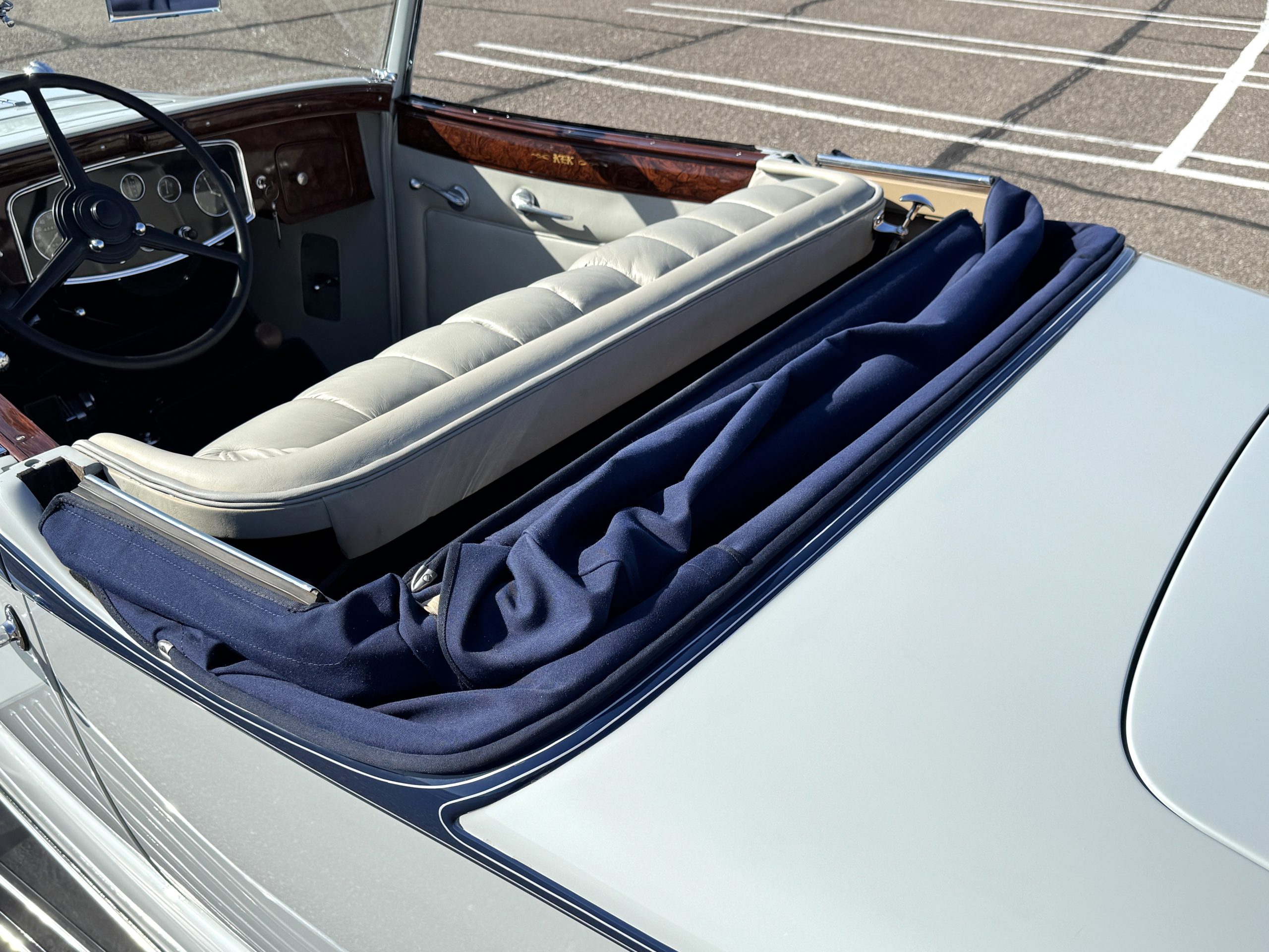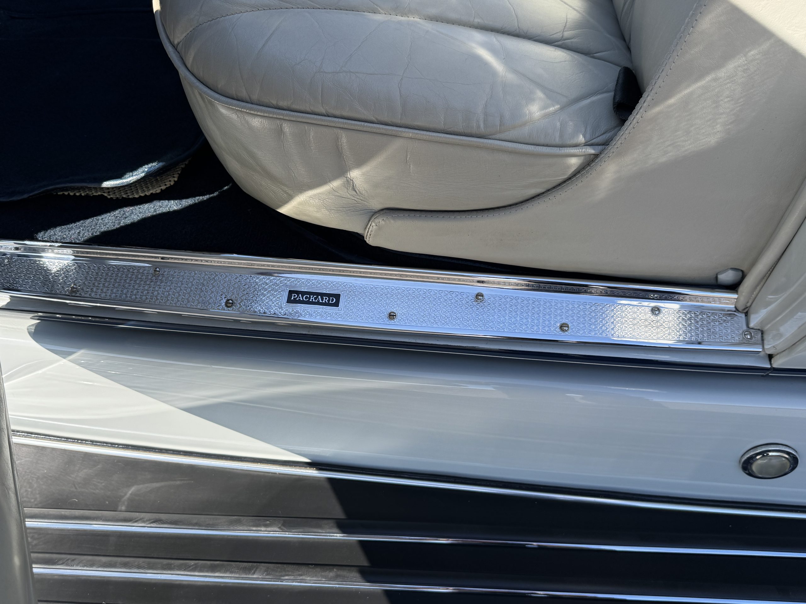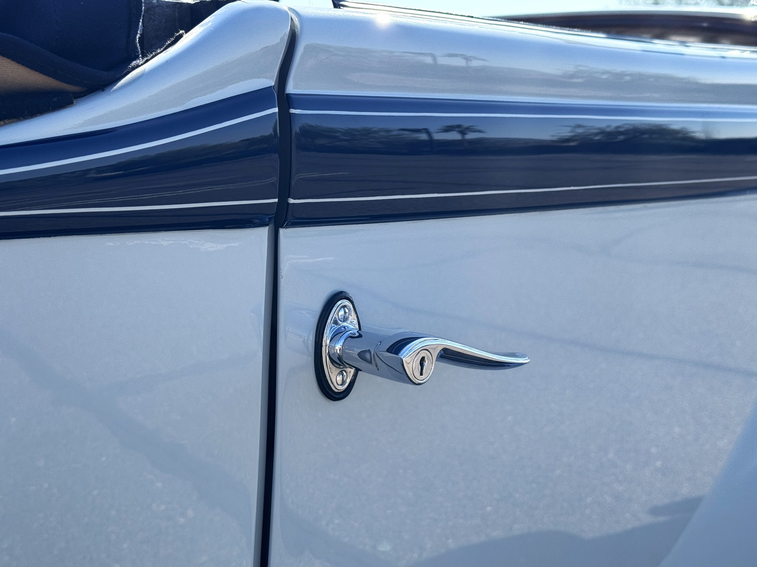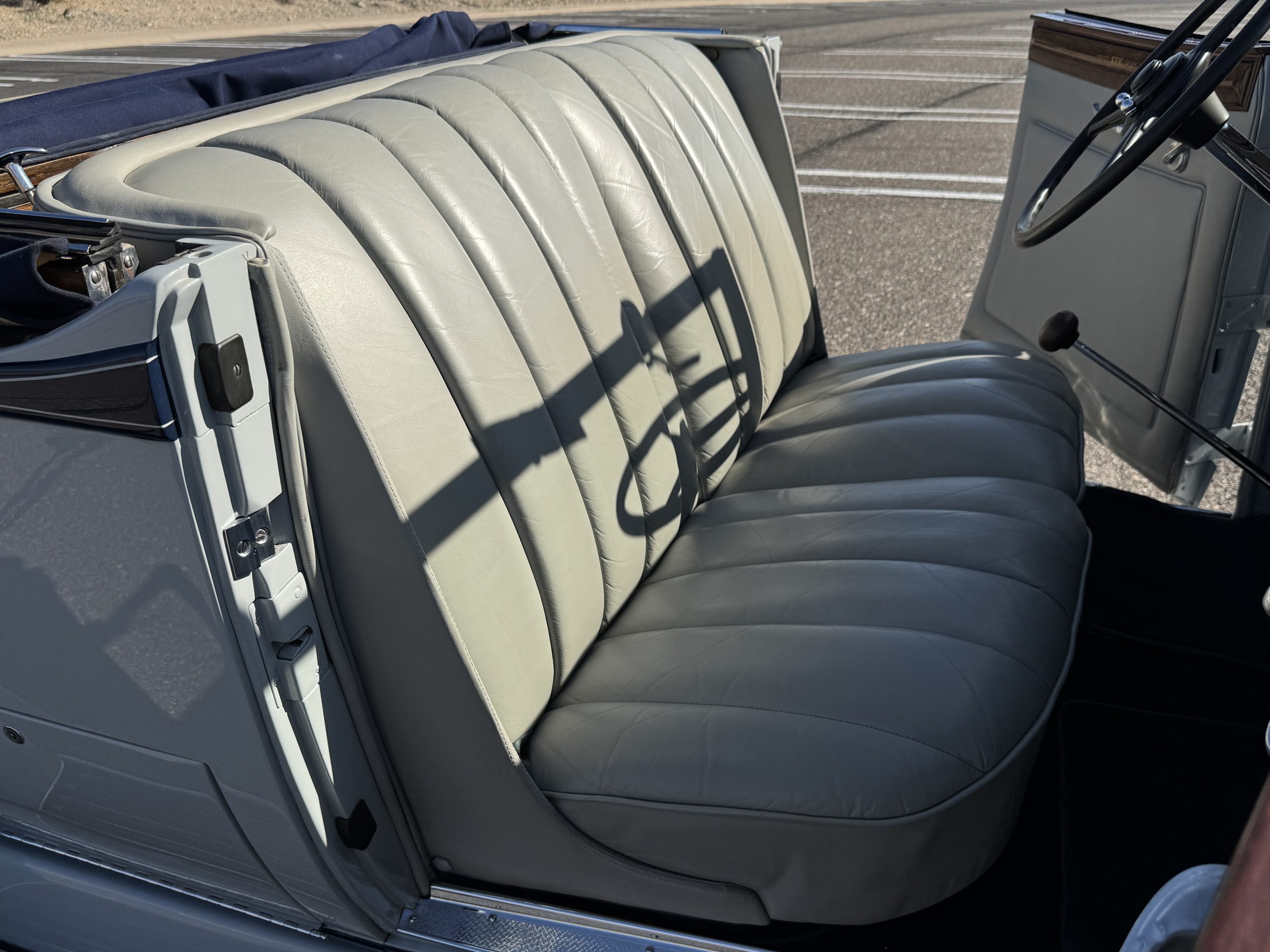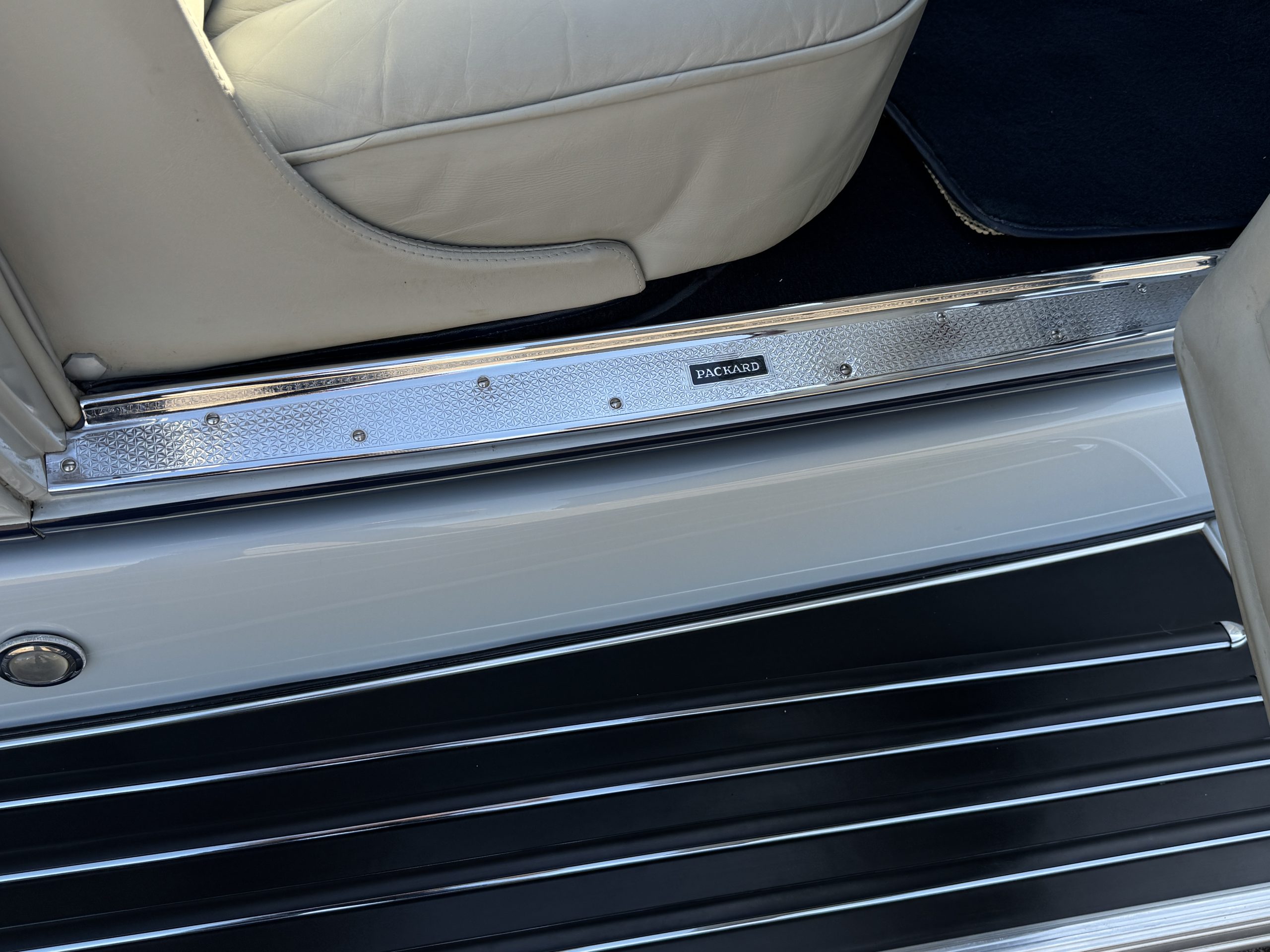 The interior is equally refined, trimmed in light gray leather upholstery that remains supple and clean with only the lightest creasing from use. The dashboard is fully restored and finished in burled wood with chrome-rimmed instruments, including a factory but non-functional Packard/Philco Transitron radio. The fuel gauge is currently non-functional, but all other instrumentation presents well and are in working condition. The rumble seat is designed to accommodate two passengers comfortably, with space for two full golf bags beneath, a signature feature of Packard’s luxury convertibles. Blue carpeting and tasteful detailing complete the period-correct atmosphere of understated opulence.