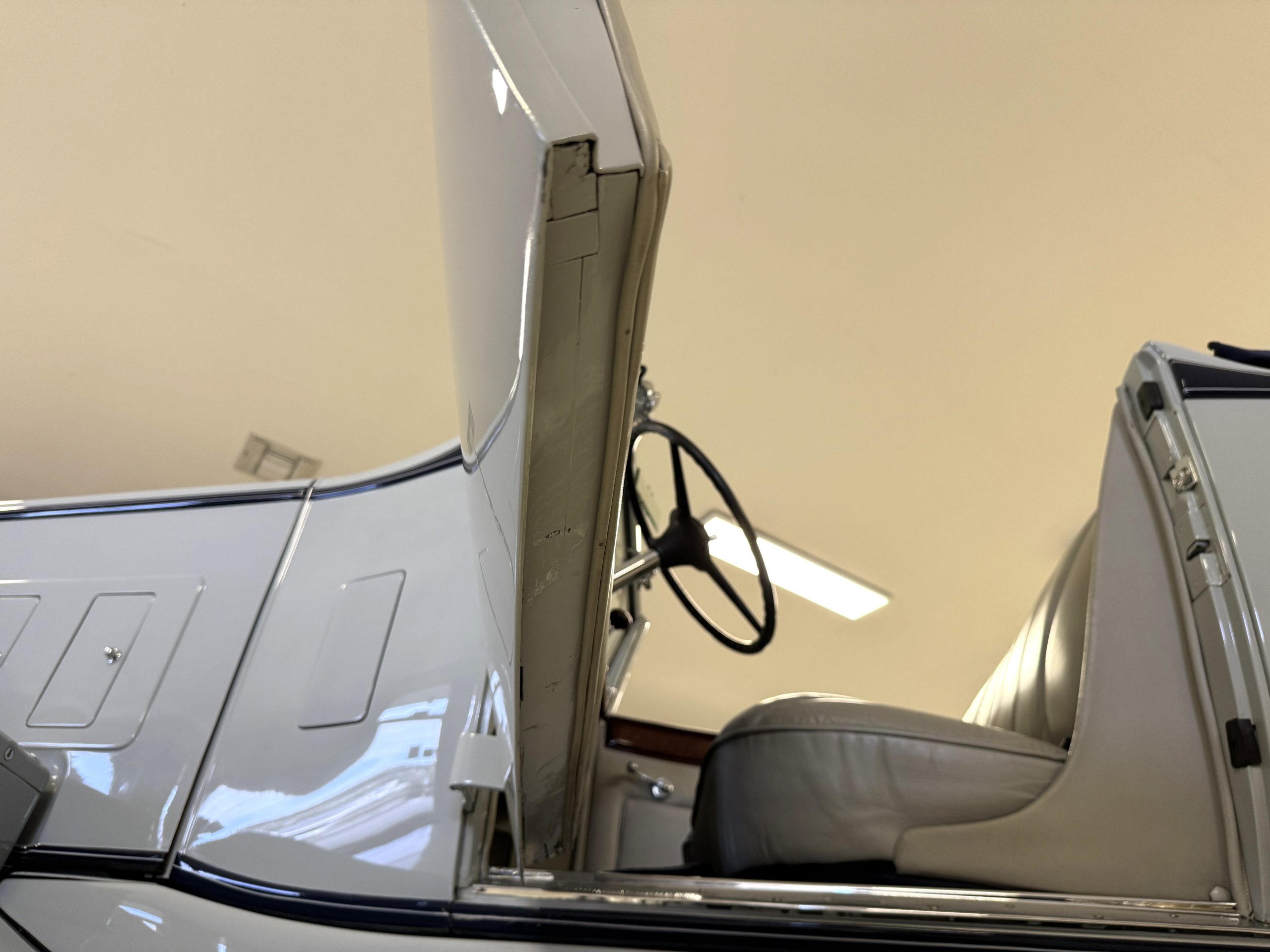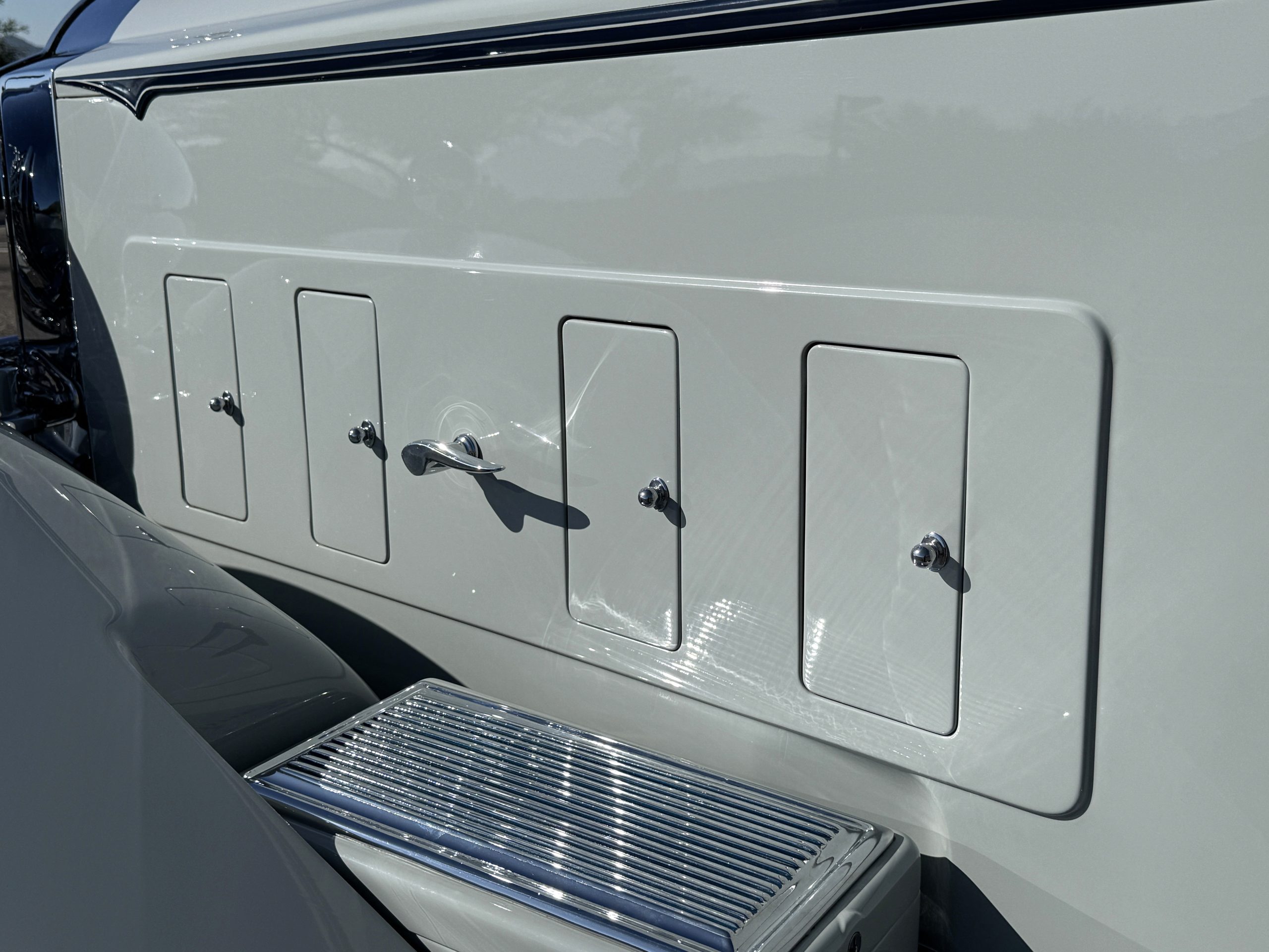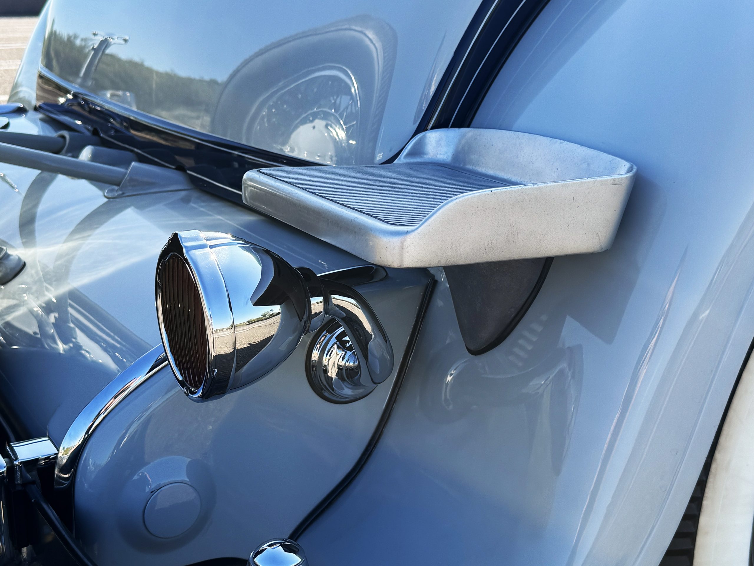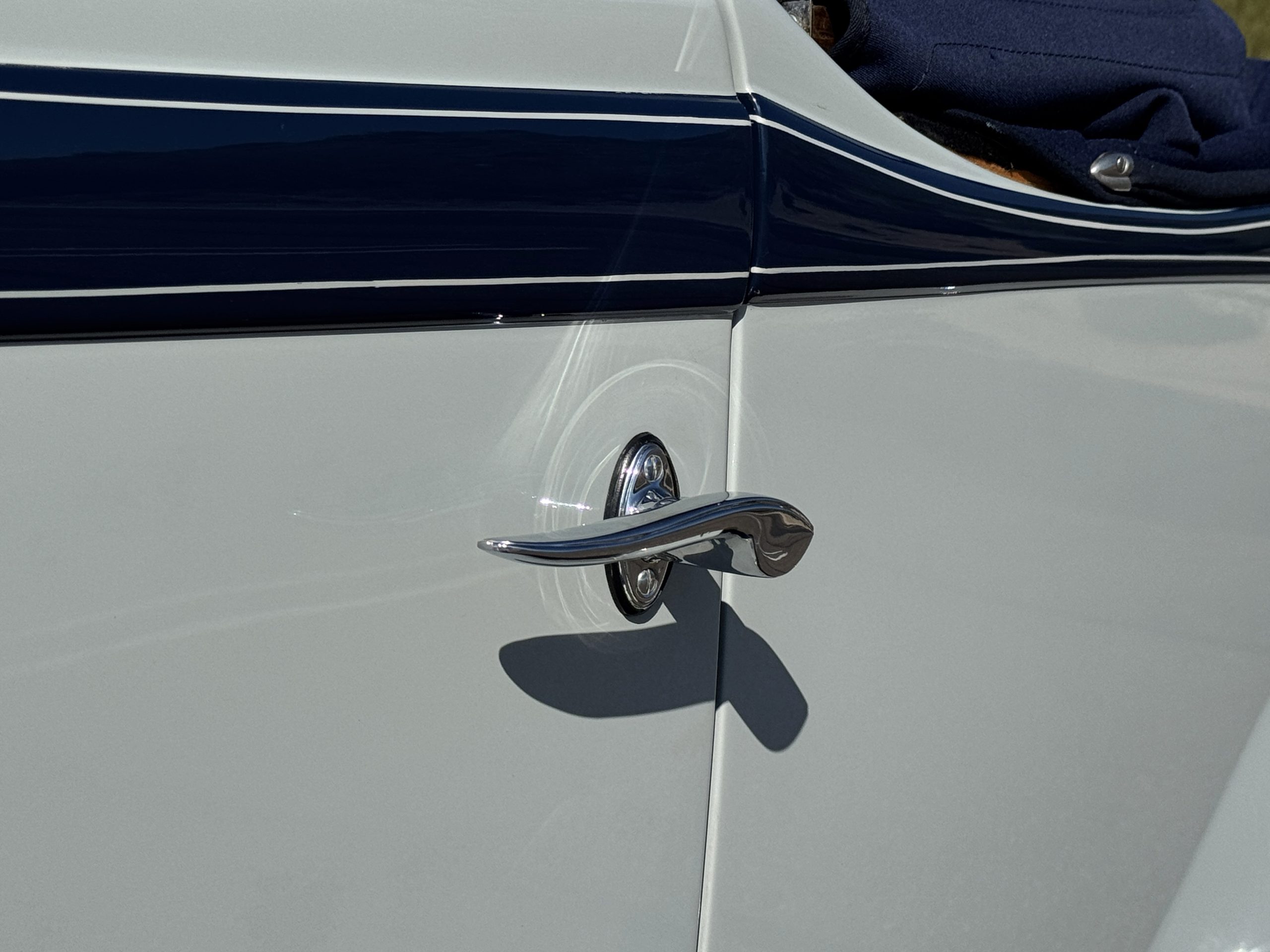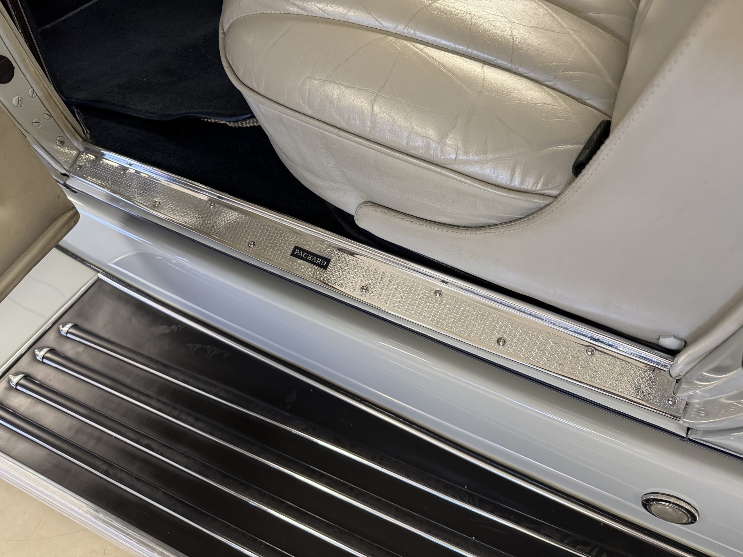 The interior is equally refined, trimmed in light gray leather upholstery that remains supple and clean with only the lightest creasing from use. The dashboard is fully restored and finished in burled wood with chrome-rimmed instruments, including a factory but non-functional Packard/Philco Transitron radio. The fuel gauge is currently non-functional, but all other instrumentation presents well and are in working condition. The rumble seat is designed to accommodate two passengers comfortably, with space for two full golf bags beneath, a signature feature of Packard’s luxury convertibles. Blue carpeting and tasteful detailing complete the period-correct atmosphere of understated opulence.