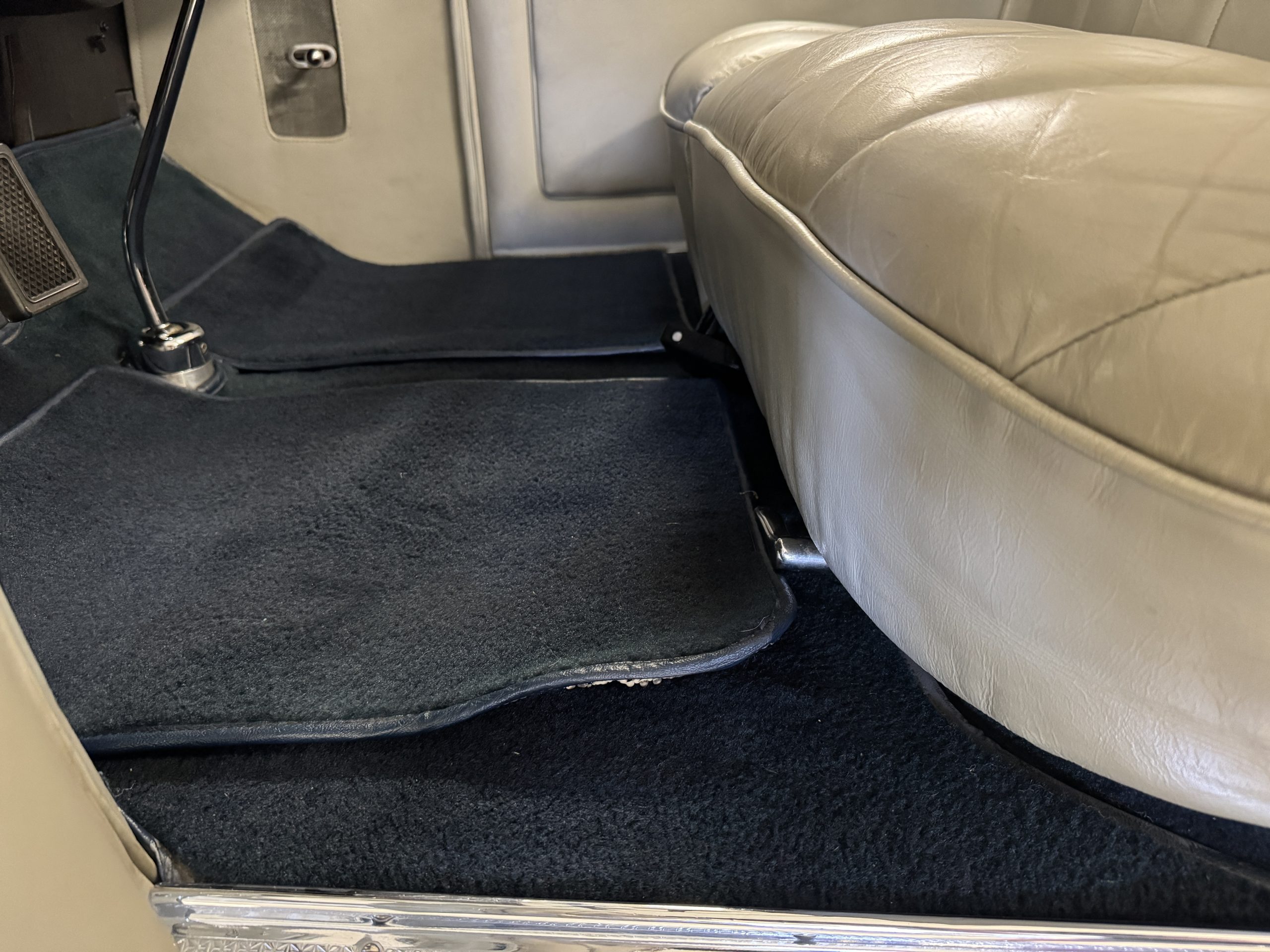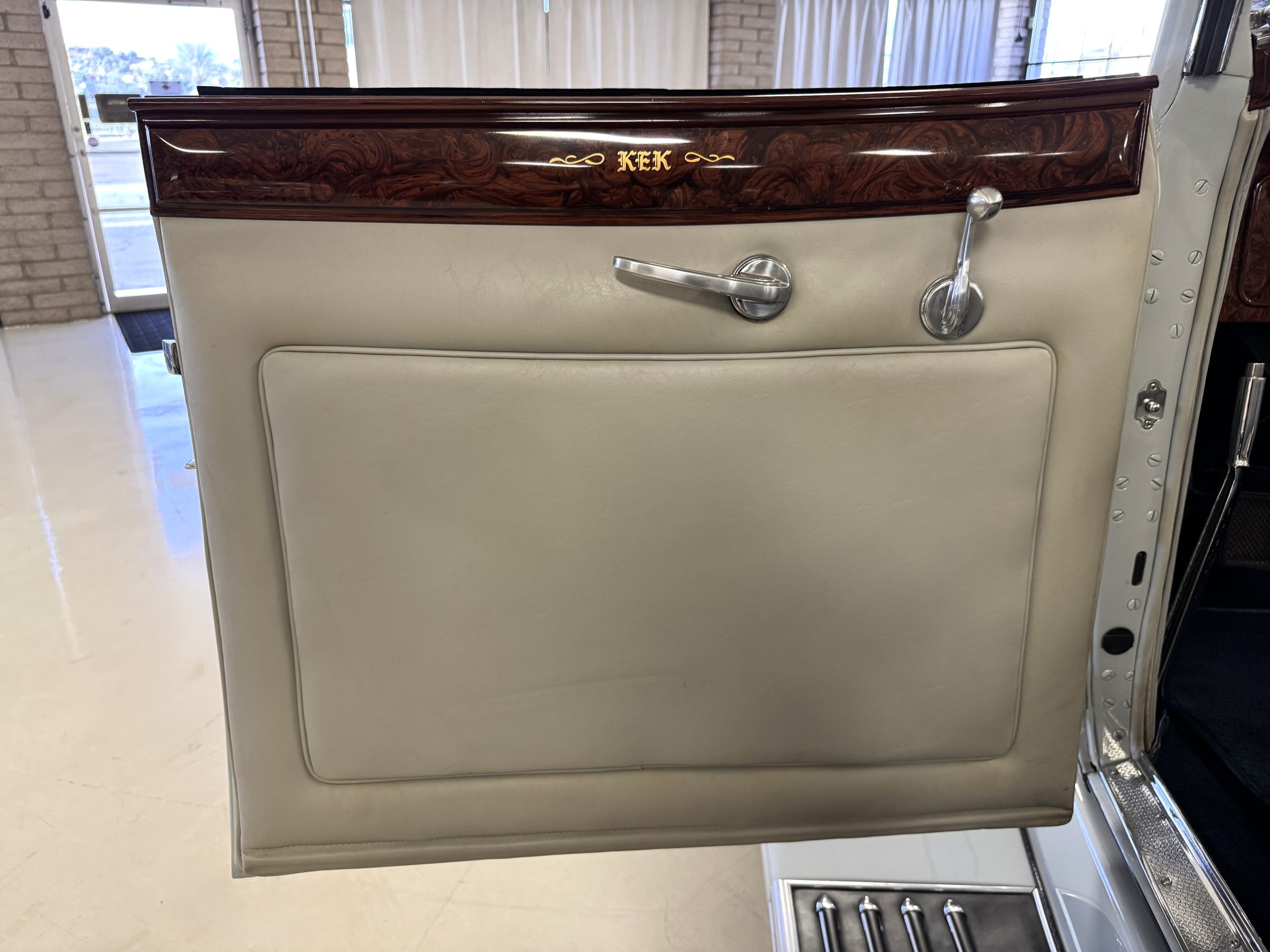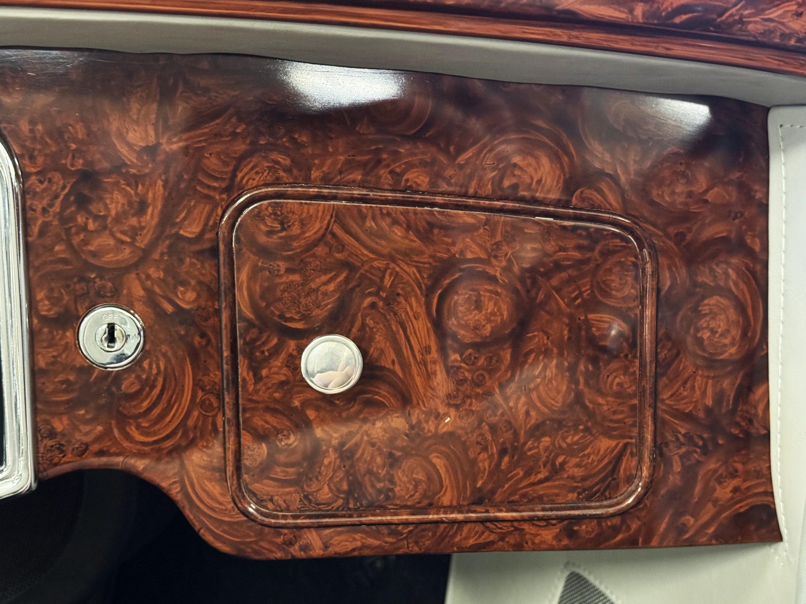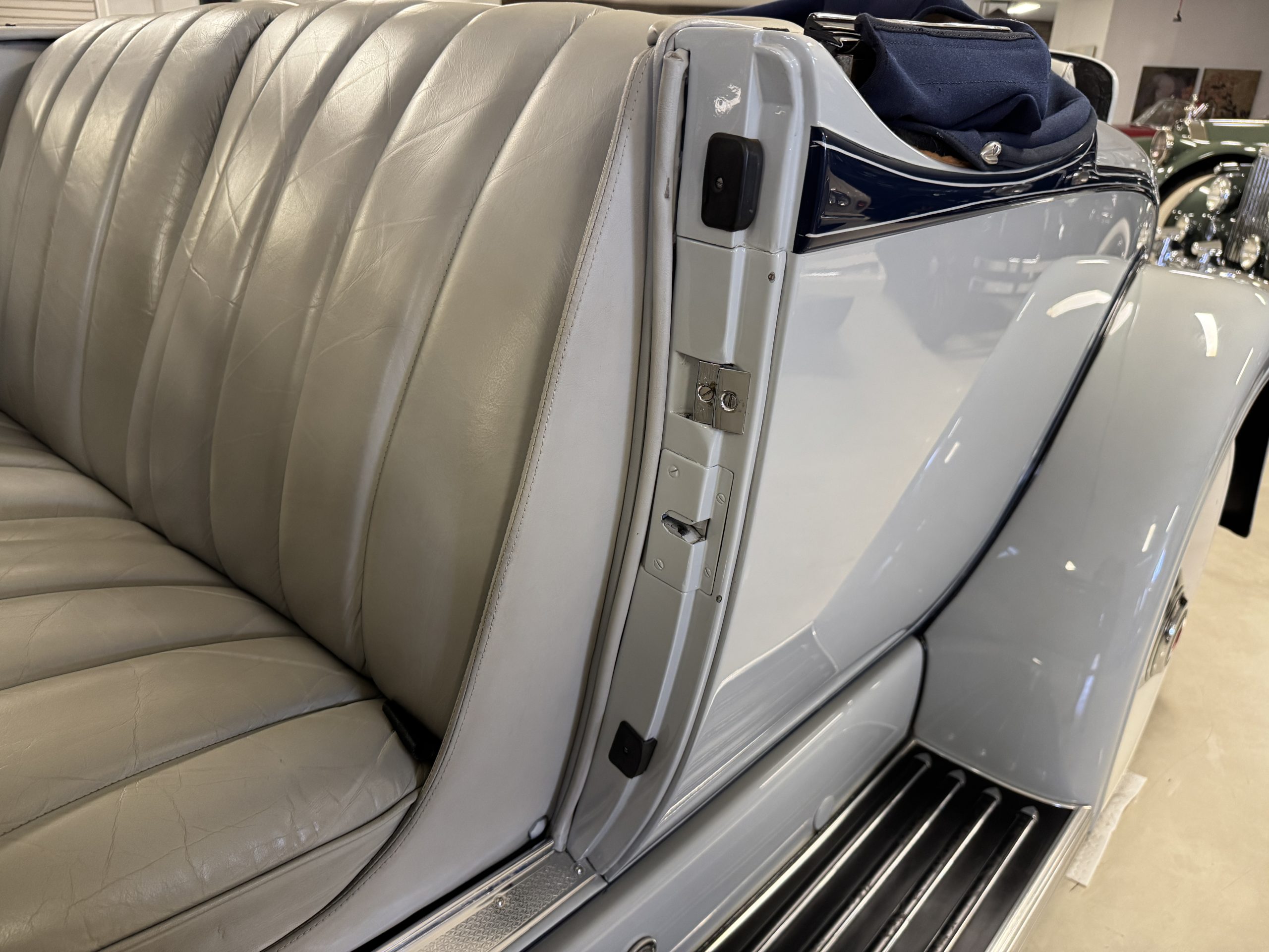 The interior is equally refined, trimmed in light gray leather upholstery that remains supple and clean with only the lightest creasing from use. The dashboard is fully restored and finished in burled wood with chrome-rimmed instruments, including a factory but non-functional Packard/Philco Transitron radio. The fuel gauge is currently non-functional, but all other instrumentation presents well and are in working condition. The rumble seat is designed to accommodate two passengers comfortably, with space for two full golf bags beneath, a signature feature of Packard’s luxury convertibles. Blue carpeting and tasteful detailing complete the period-correct atmosphere of understated opulence.