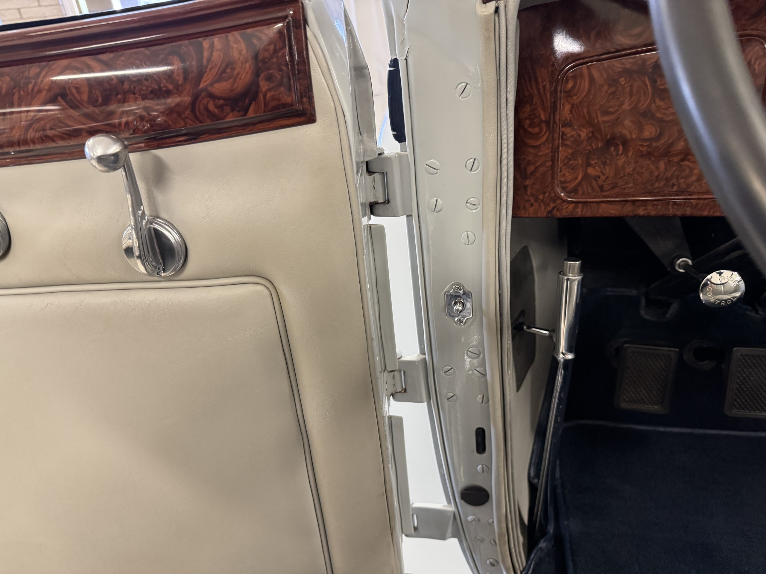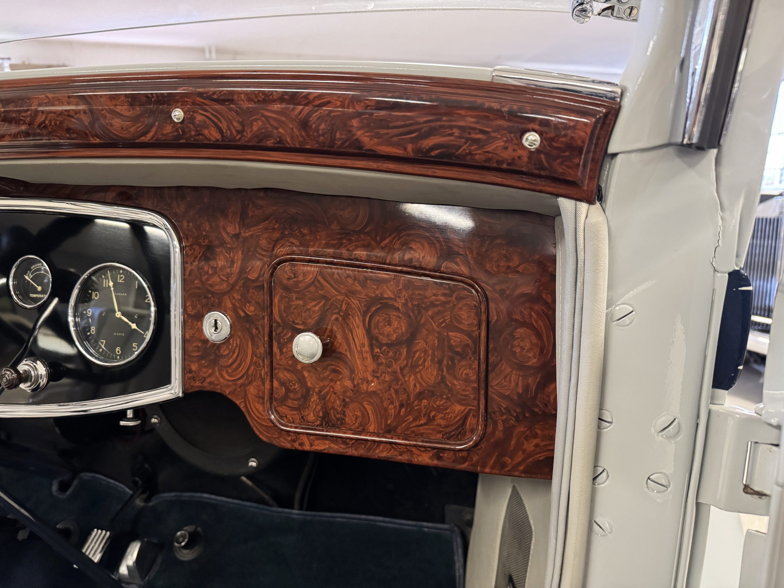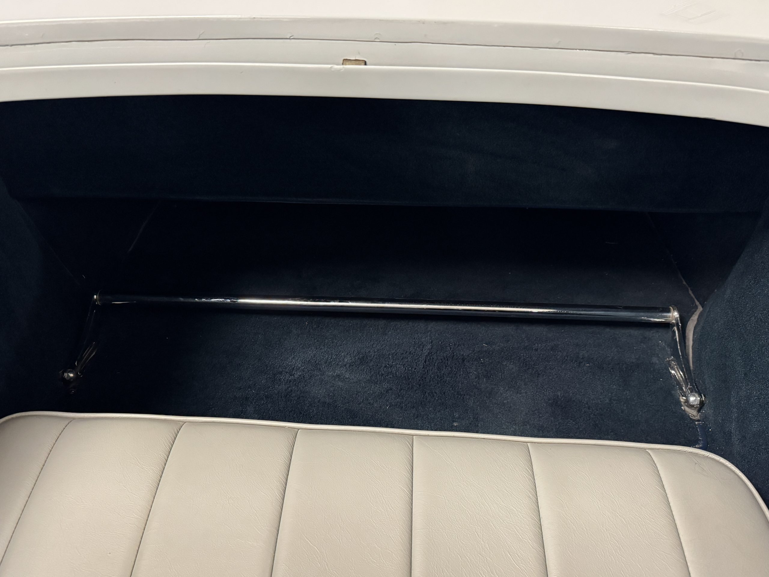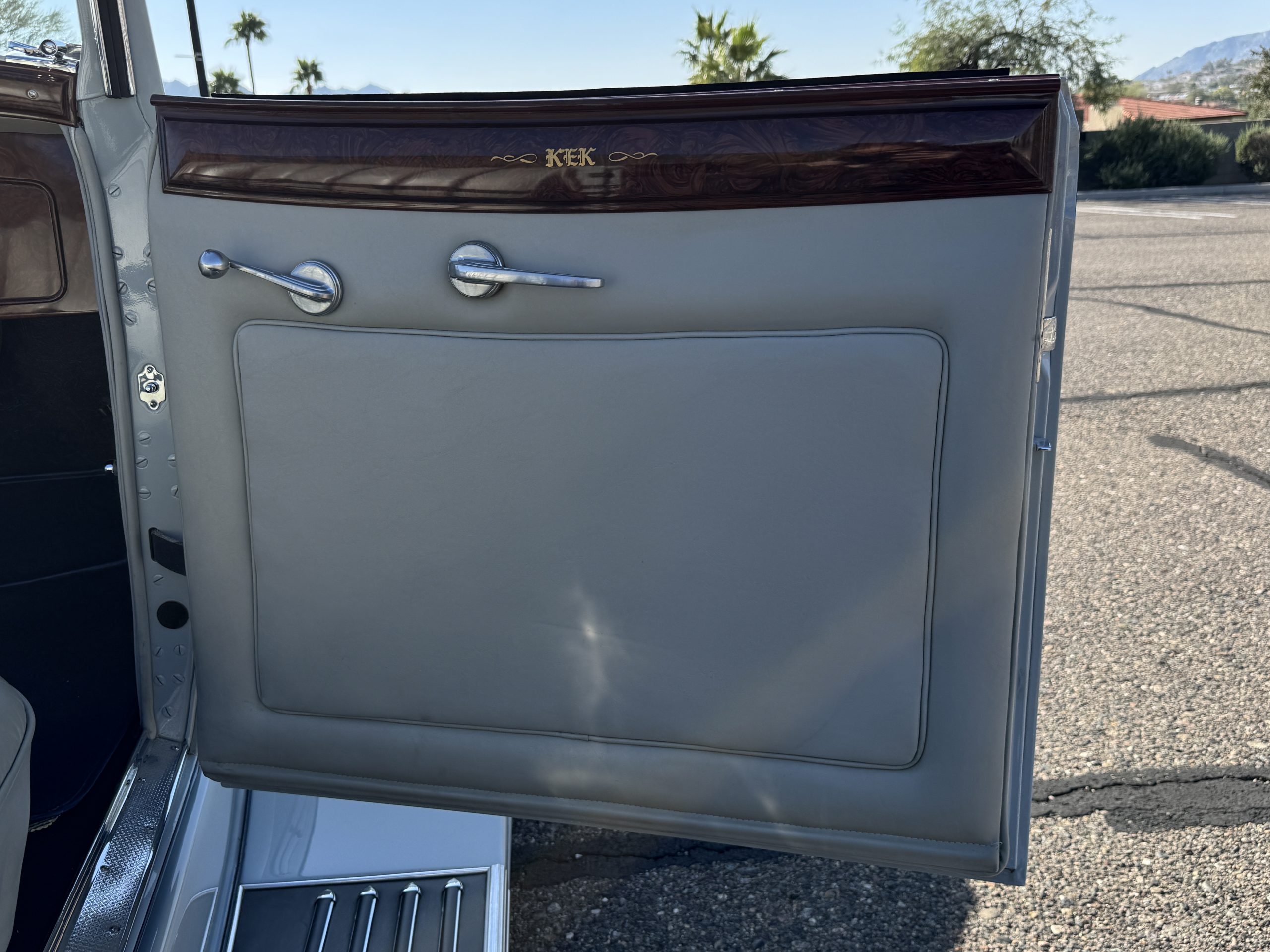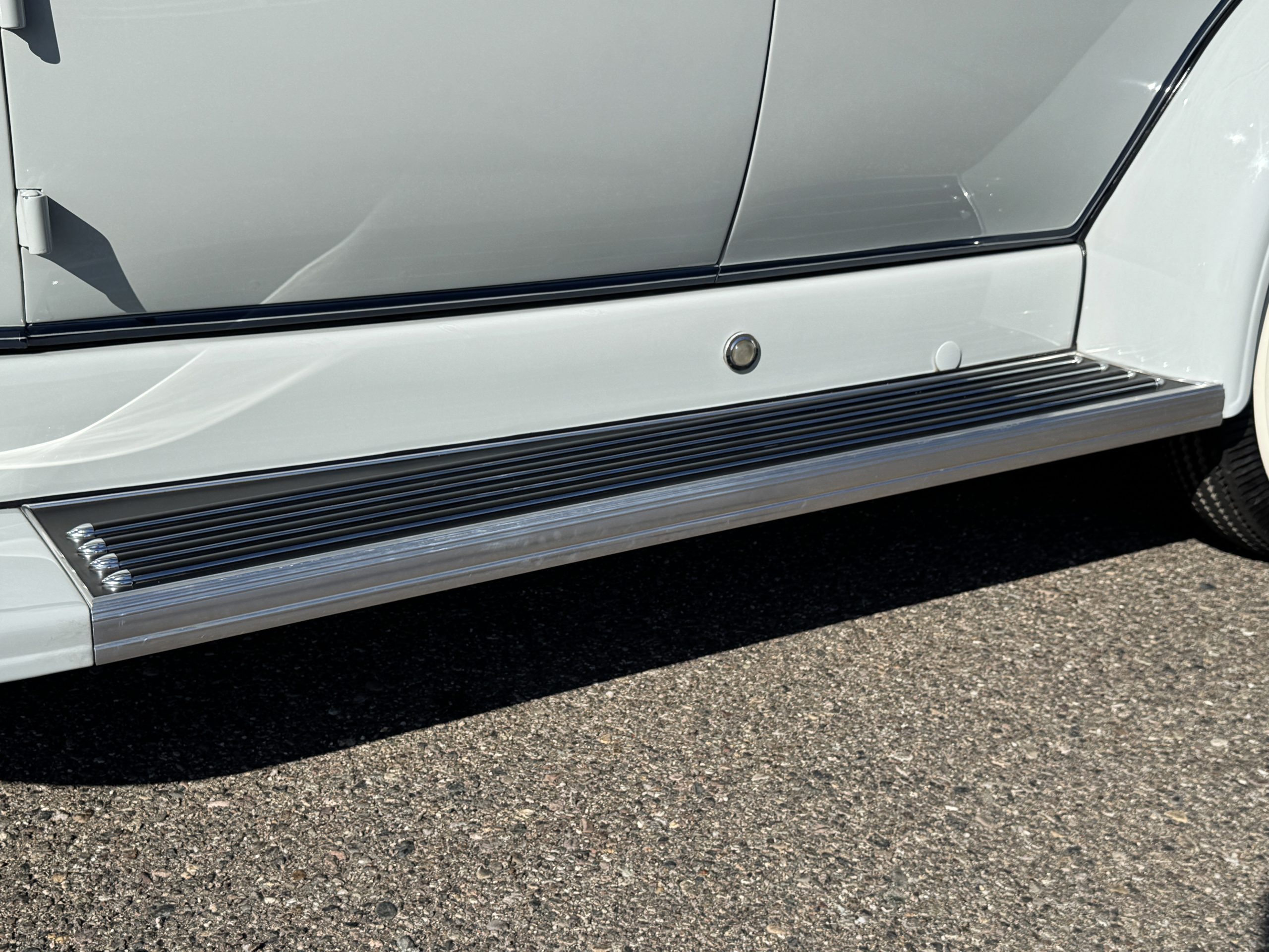 The interior is equally refined, trimmed in light gray leather upholstery that remains supple and clean with only the lightest creasing from use. The dashboard is fully restored and finished in burled wood with chrome-rimmed instruments, including a factory but non-functional Packard/Philco Transitron radio. The fuel gauge is currently non-functional, but all other instrumentation presents well and are in working condition. The rumble seat is designed to accommodate two passengers comfortably, with space for two full golf bags beneath, a signature feature of Packard’s luxury convertibles. Blue carpeting and tasteful detailing complete the period-correct atmosphere of understated opulence.