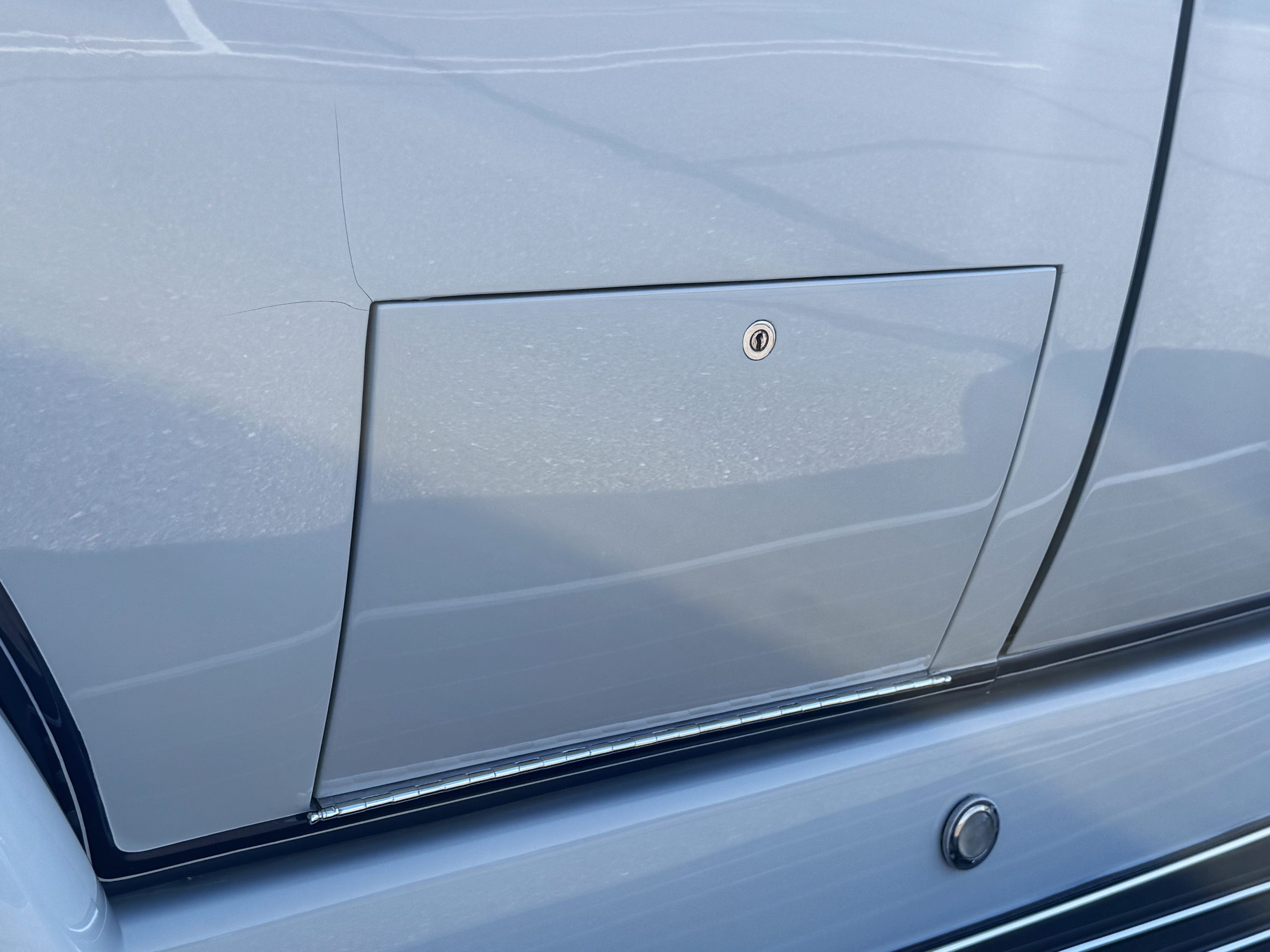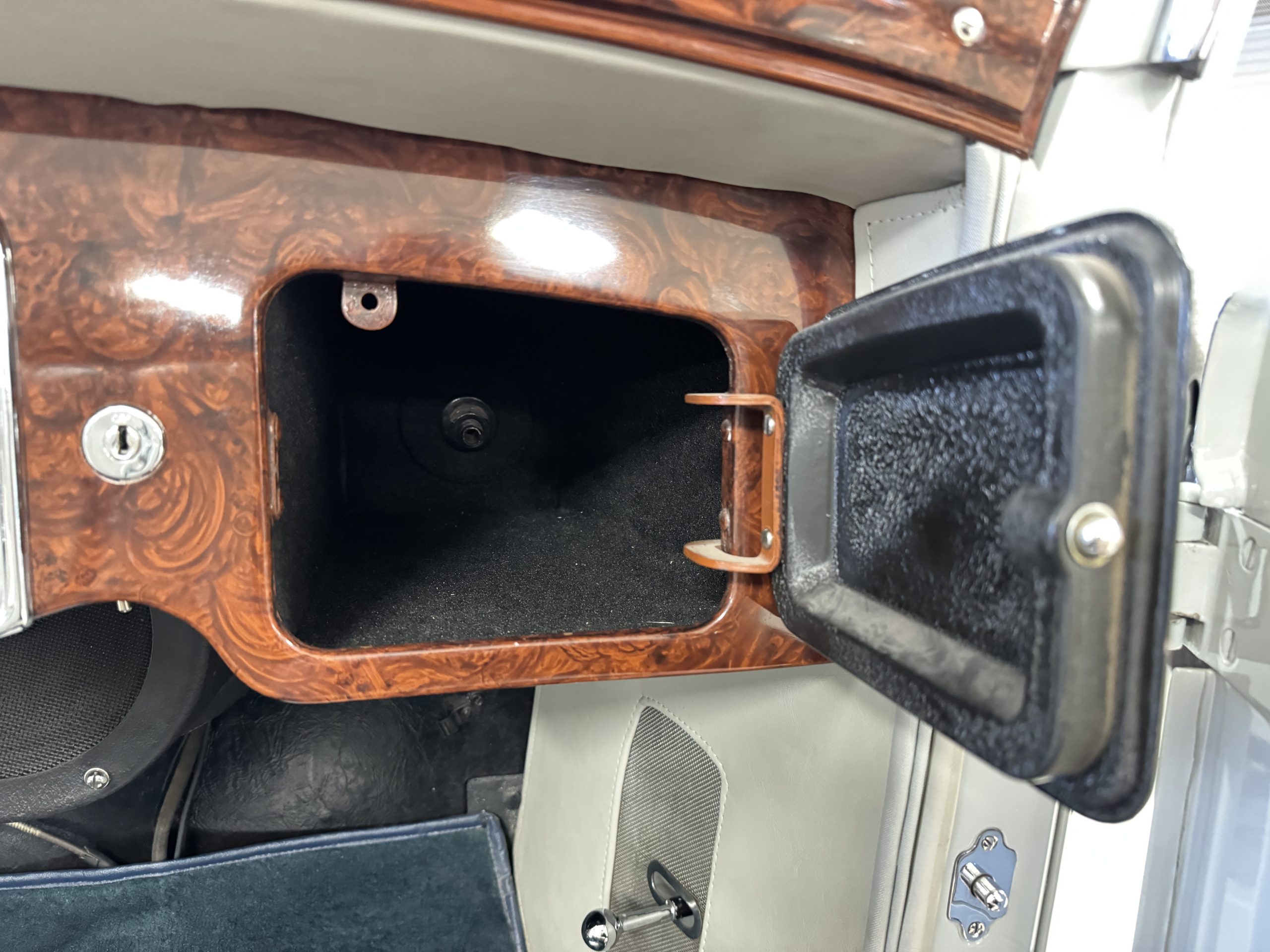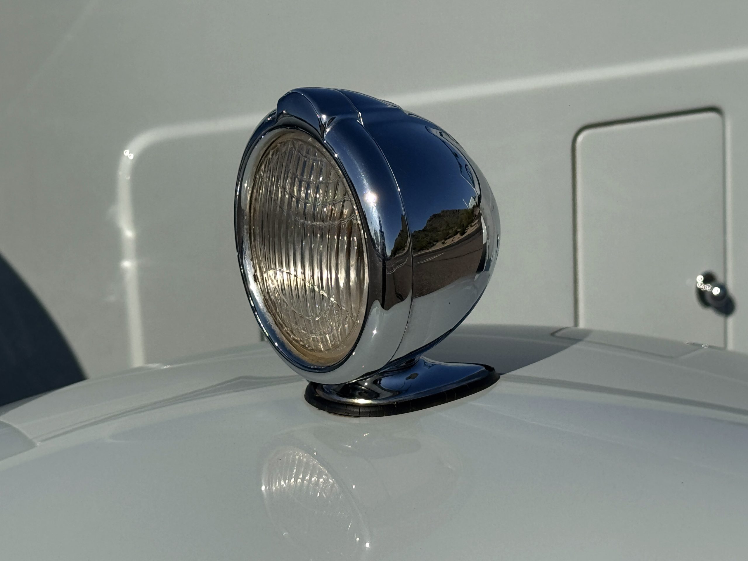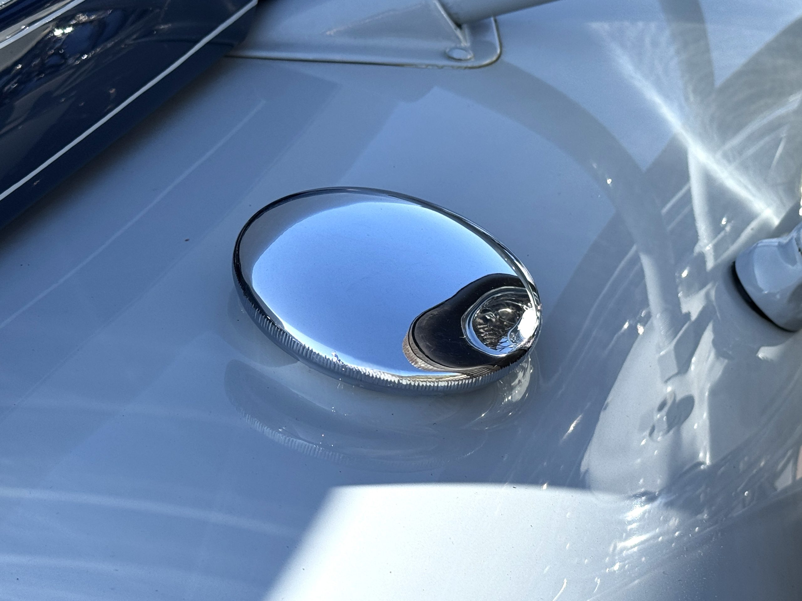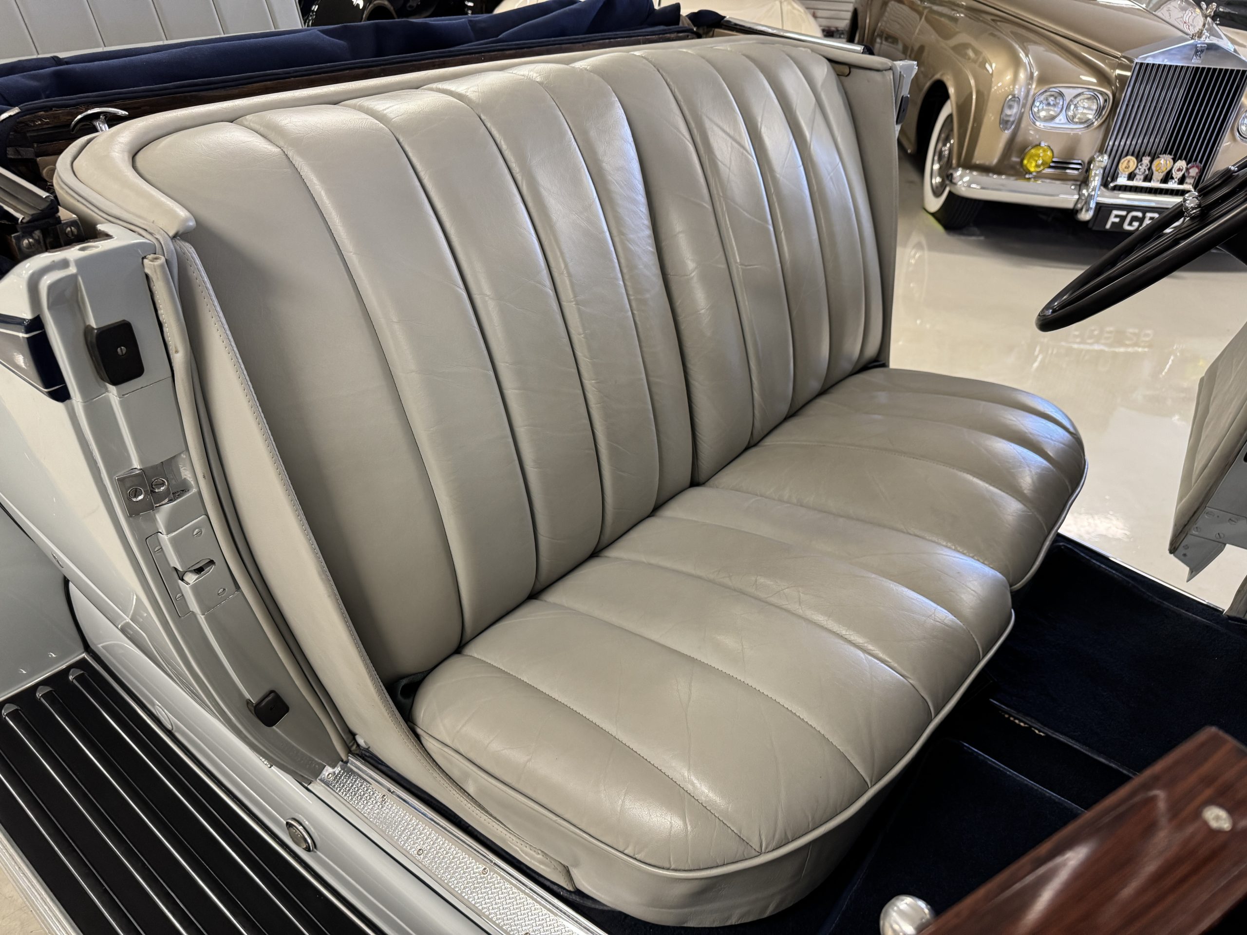 The interior is equally refined, trimmed in light gray leather upholstery that remains supple and clean with only the lightest creasing from use. The dashboard is fully restored and finished in burled wood with chrome-rimmed instruments, including a factory but non-functional Packard/Philco Transitron radio. The fuel gauge is currently non-functional, but all other instrumentation presents well and are in working condition. The rumble seat is designed to accommodate two passengers comfortably, with space for two full golf bags beneath, a signature feature of Packard’s luxury convertibles. Blue carpeting and tasteful detailing complete the period-correct atmosphere of understated opulence.