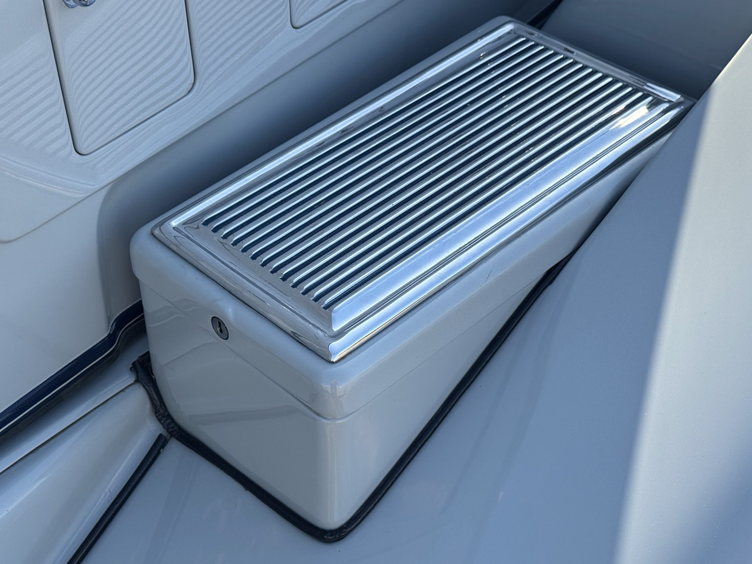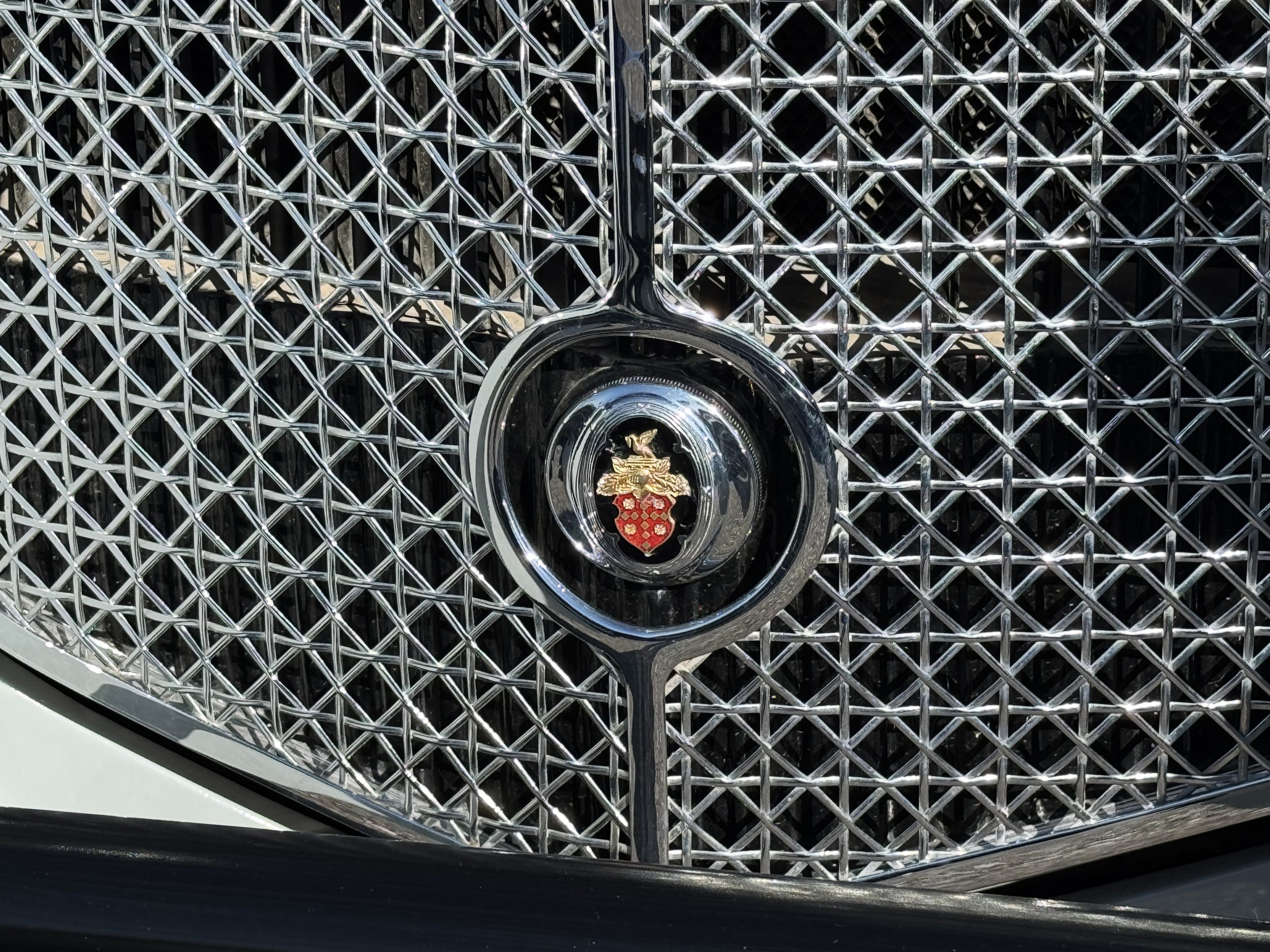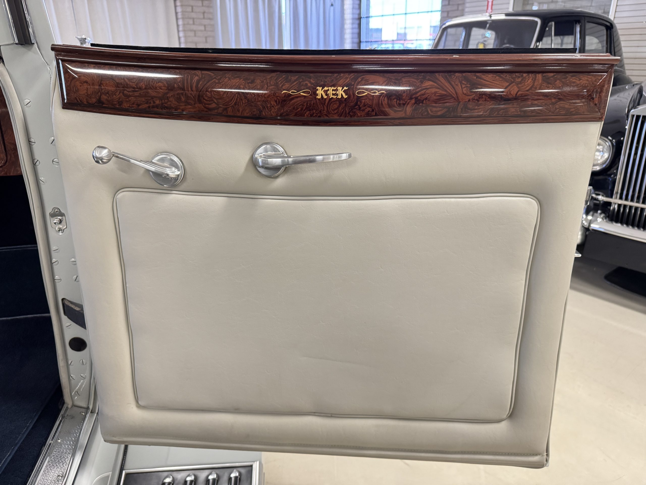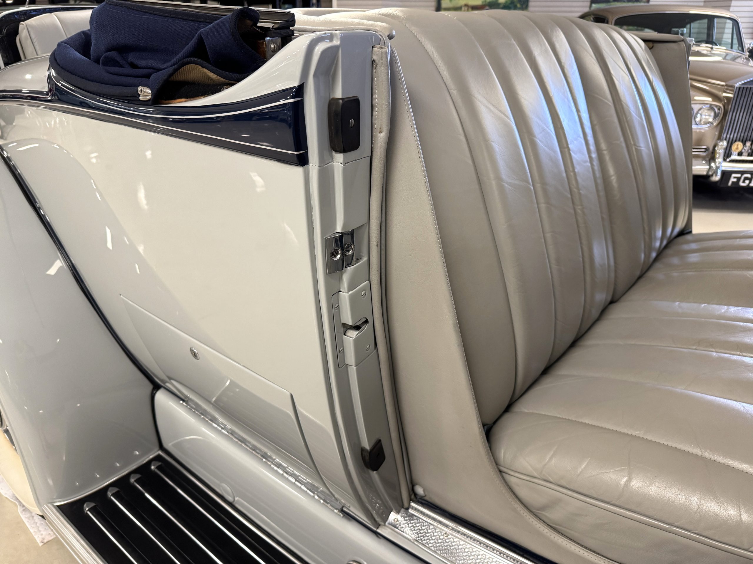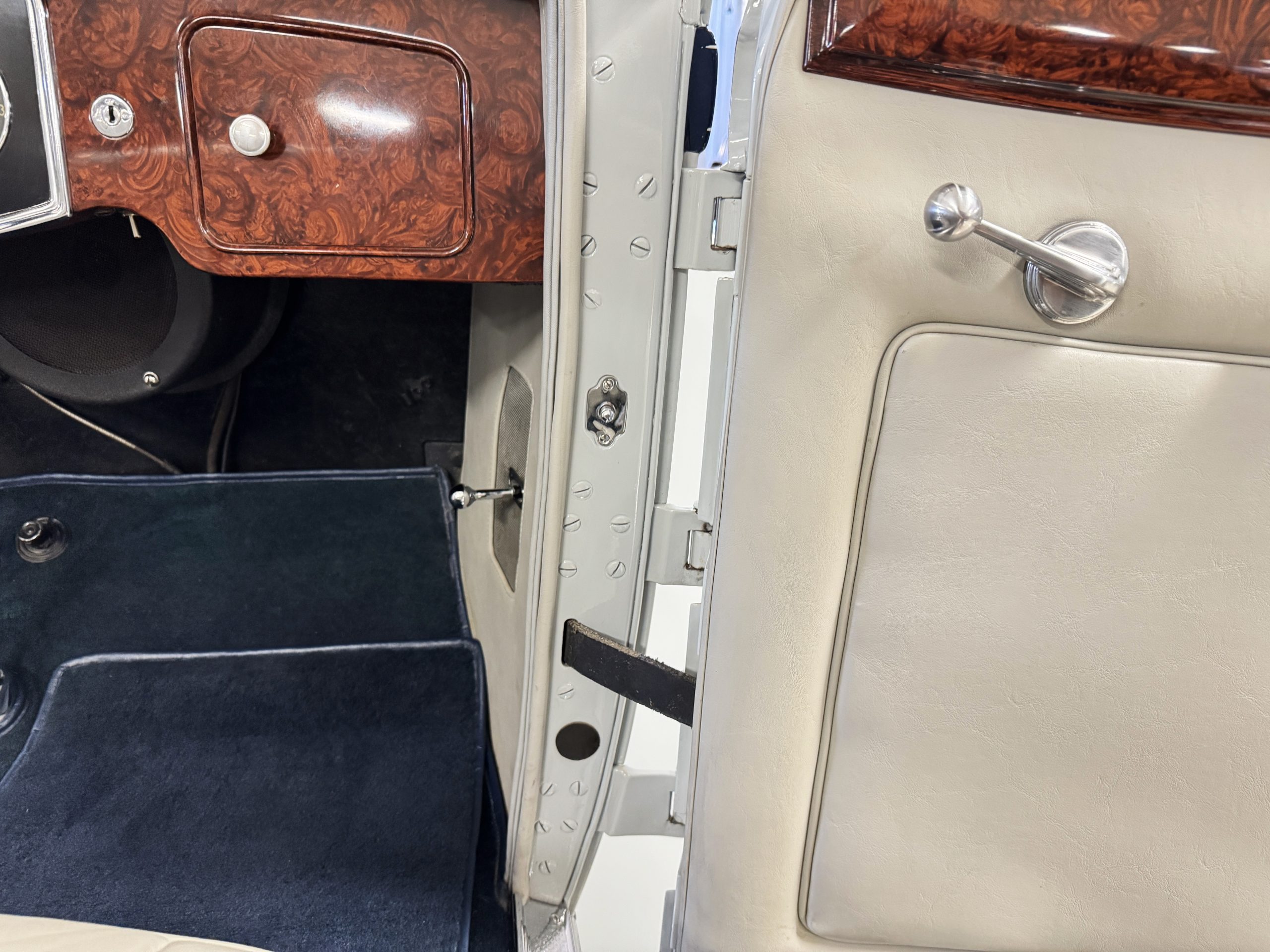 The interior is equally refined, trimmed in light gray leather upholstery that remains supple and clean with only the lightest creasing from use. The dashboard is fully restored and finished in burled wood with chrome-rimmed instruments, including a factory but non-functional Packard/Philco Transitron radio. The fuel gauge is currently non-functional, but all other instrumentation presents well and are in working condition. The rumble seat is designed to accommodate two passengers comfortably, with space for two full golf bags beneath, a signature feature of Packard’s luxury convertibles. Blue carpeting and tasteful detailing complete the period-correct atmosphere of understated opulence.
